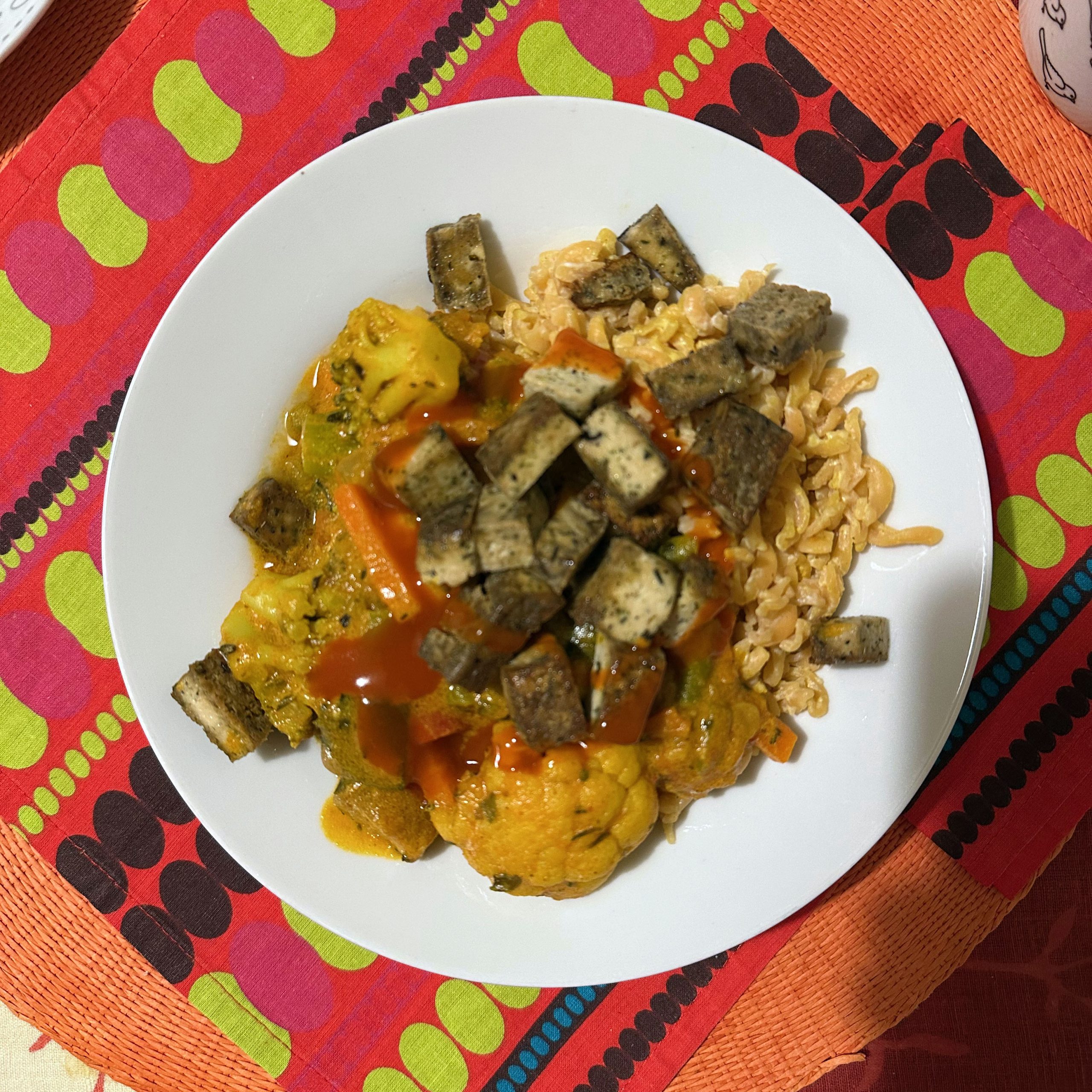 Gemischtes TK-Gemüse mit Sojasahne, dazu Linsennudeln aus roten Linsen und gebratener Räuchertofu