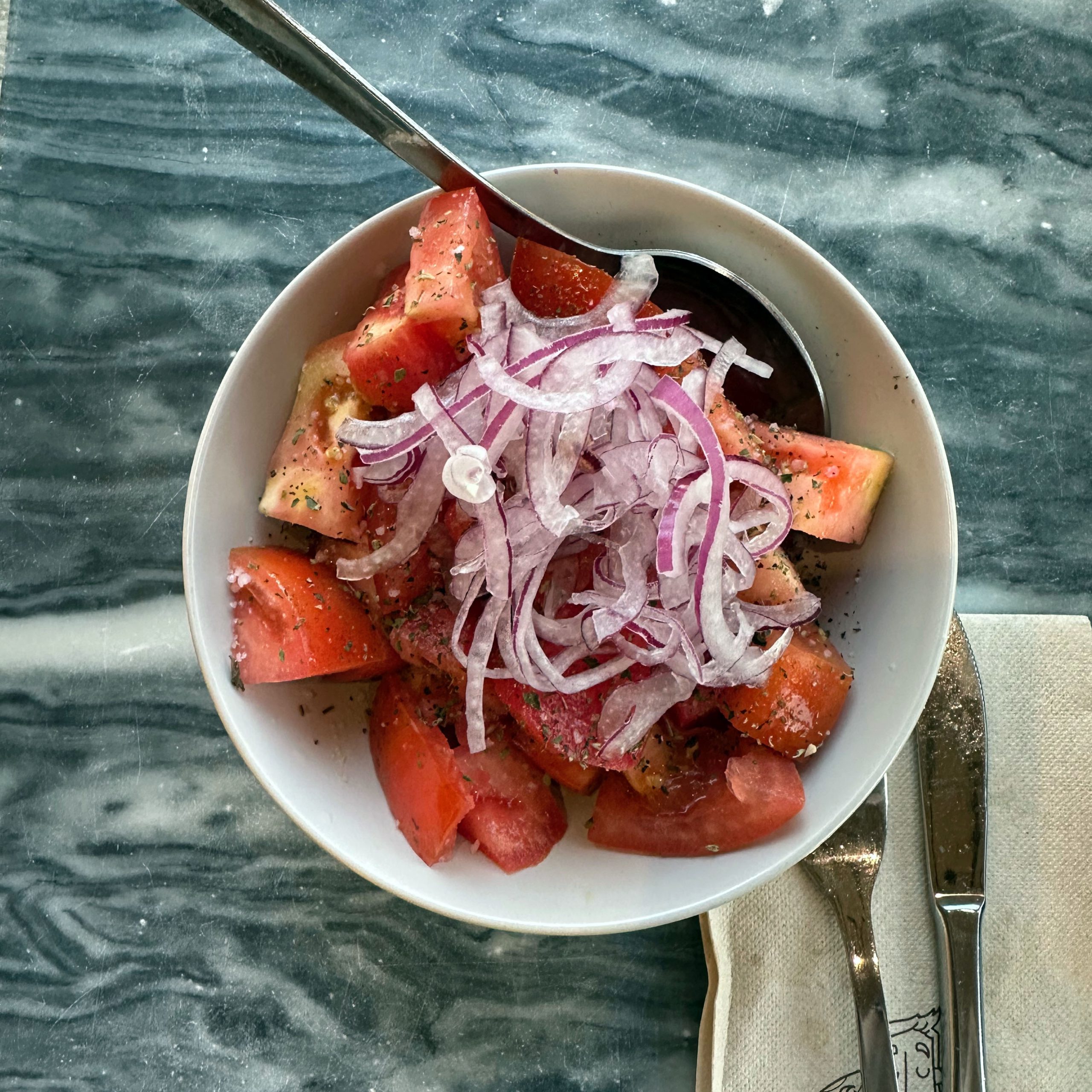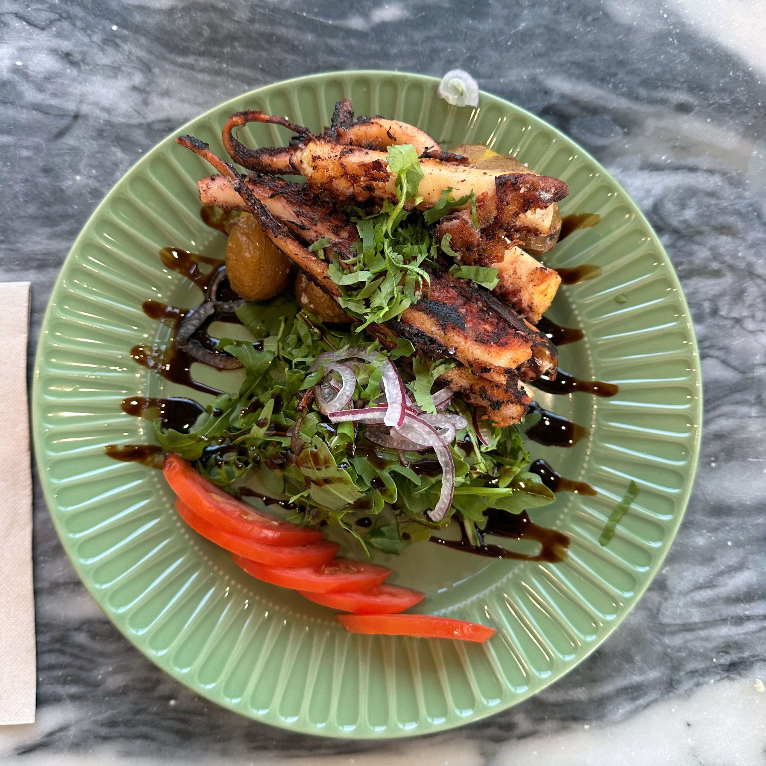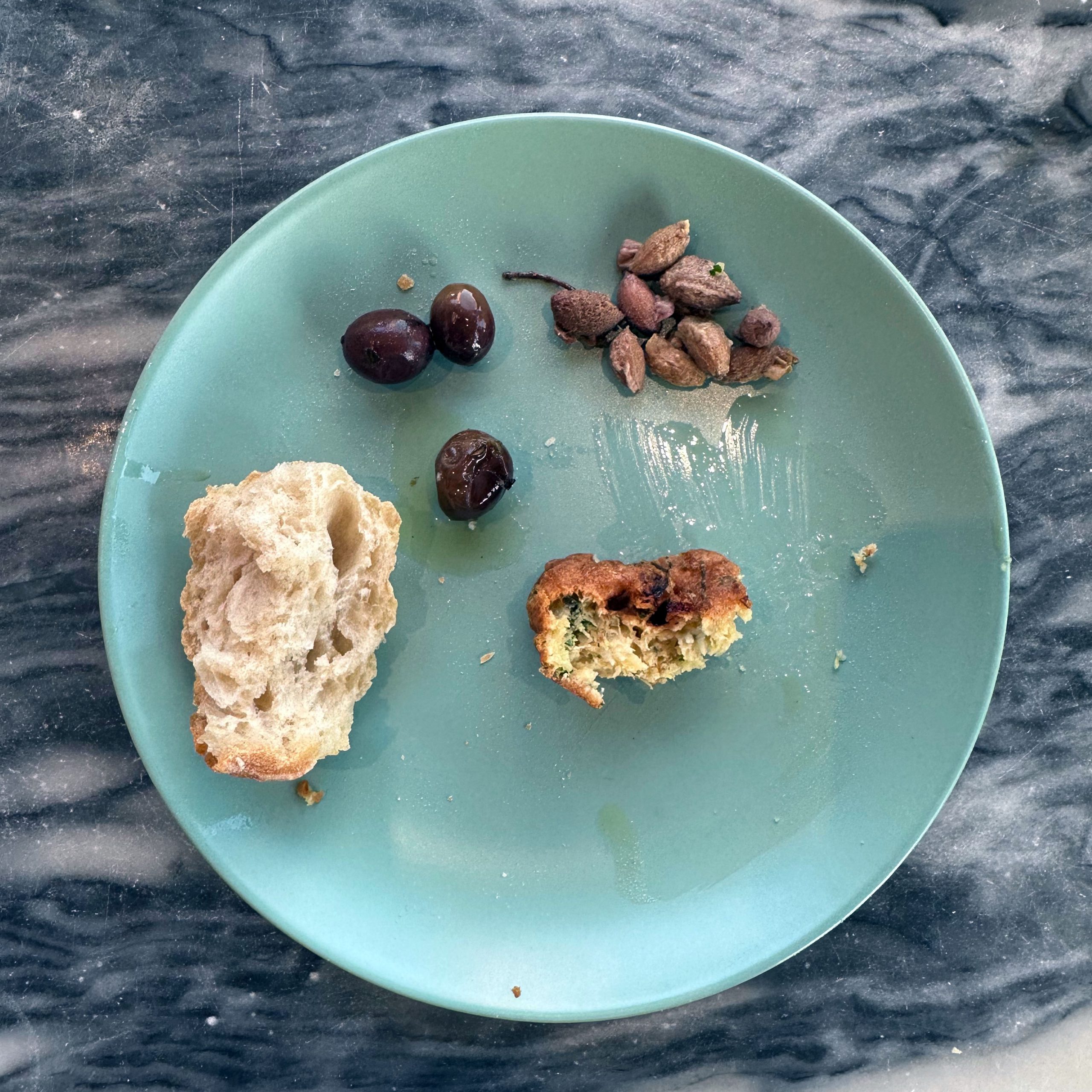 Essengehen mit der Familie in Baleal: Brot und Oliven als Starter, geschmorter und gebratener Tintenfisch mit Bratkartoffeln und Tomatensalat als Hauptgang und zum Dessert Pekanuss-Kuchen.