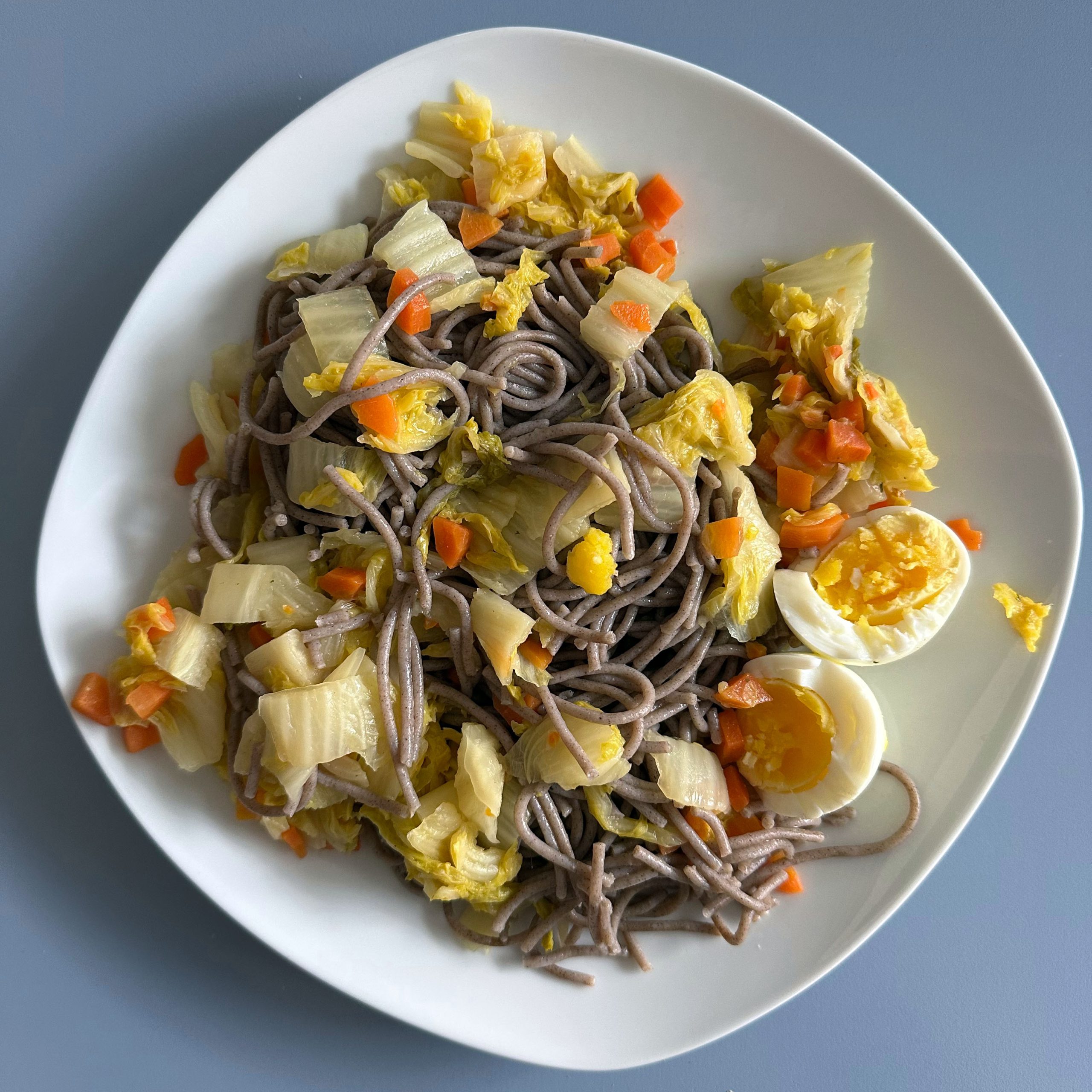 Karine kocht: 1 Chinakohl halbieren, den Strunk entfernen und in feine Streifen schneiden. 3 Möhren schälen und in feine Stifte oder Halbmonde schneiden. 2 gewürfelte Zwiebeln in etwas Öl anbraten, Möhren dazugeben und 5min mitbraten, Chinakohlstreifen hinzufügen und weiterbraten, bis er zusammenfällt. Mit 200ml Brühe ablöschen und 10min köcheln lassen. Buchweizen-Spaghetti in Salzwasser 12min kochen. 4 Eier in kaltem Wasser aufsetzen, aufkochen und 9min kochen, kalt abschrecken, pellen und halbieren. Buchweizen-Spaghetti abgießen, mit der Chinakohl-Möhren-Soße in Schüsseln servieren und je ein halbiertes Ei darauflegen.