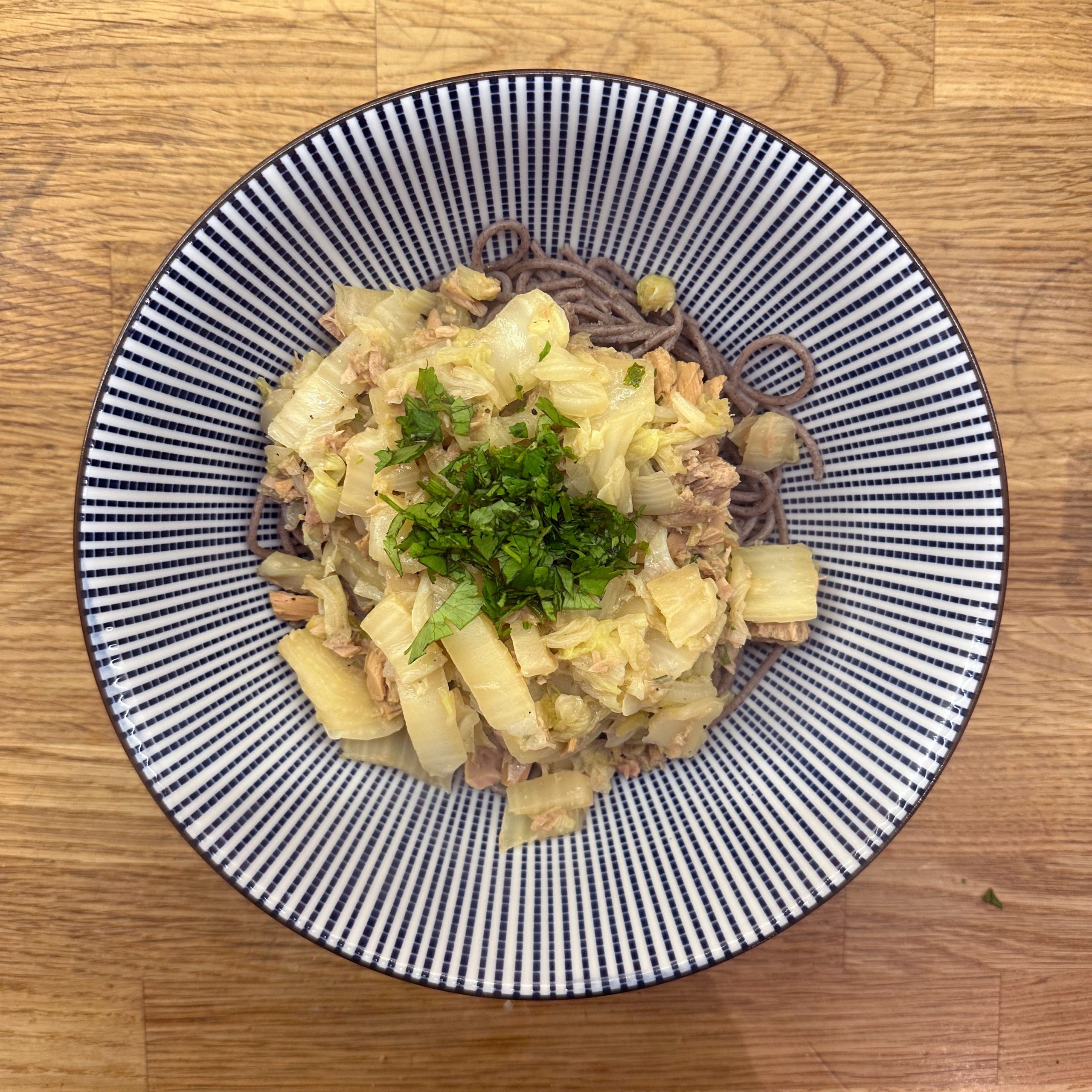400g Buchweizen-Spaghetti 12min in Salzwasser kochen. 1 Chinakohl halbieren, den Strunk entfernen und in feine Streifen schneiden. 2 gewürfelte Zwiebeln in etwas Öl glasig braten, Chinakohlstreifen dazugeben und 5min mitbraten, bis er zusammenfällt. Mit 200ml Gemüsebrühe ablöschen, 1TL Salz und 0,5TL Pfeffer hinzufügen. 10min köcheln lassen. 2EL Zitronensaft einrühren, mit Salz und Pfeffer abschmecken. 2 Dosen Thunfisch abtropfen lassen, unterrühren und nur erwärmen. Buchweizen-Spaghetti mit der Thunfisch-Chinakohl-Soße auf Tellern anrichten und mit Koriander bestreuen.