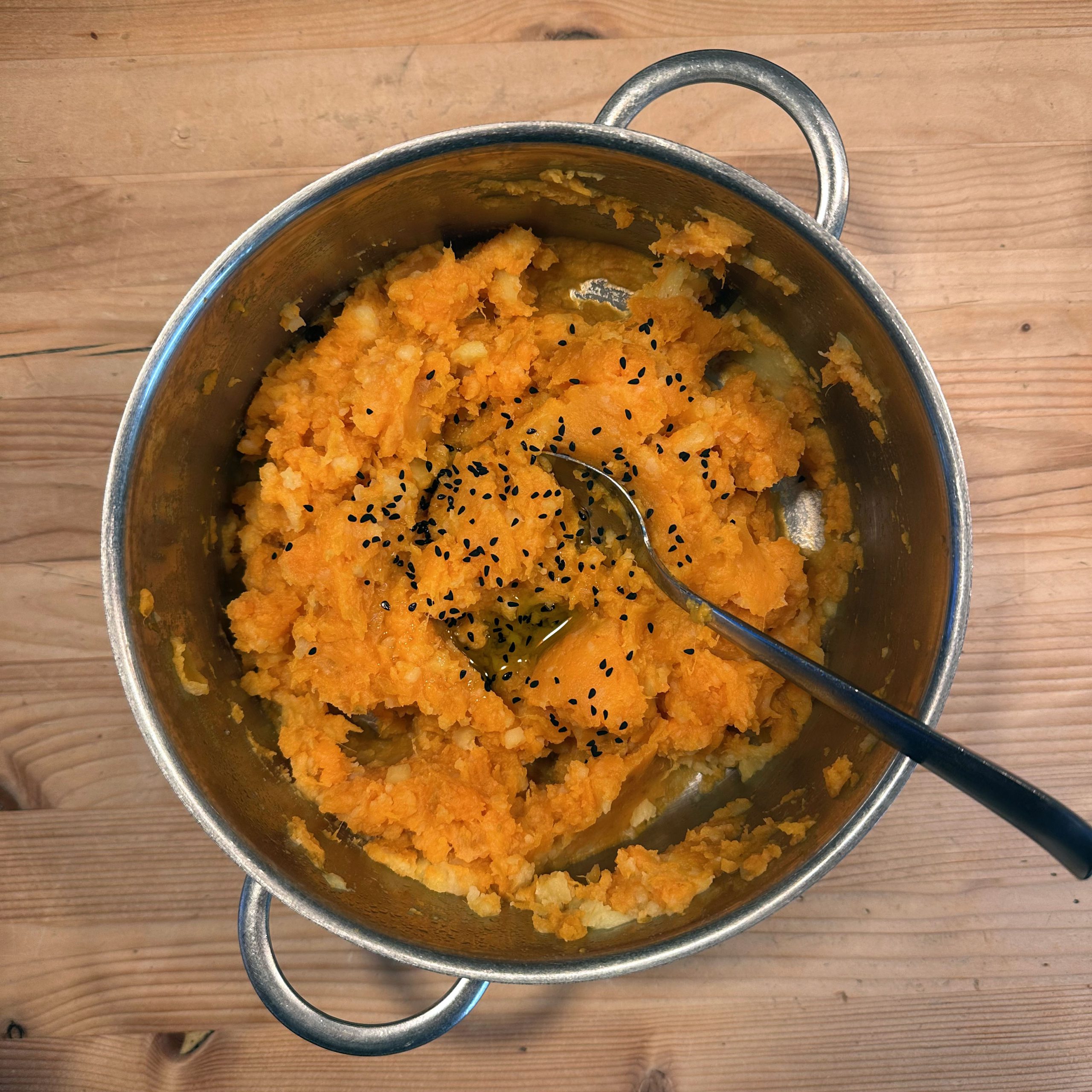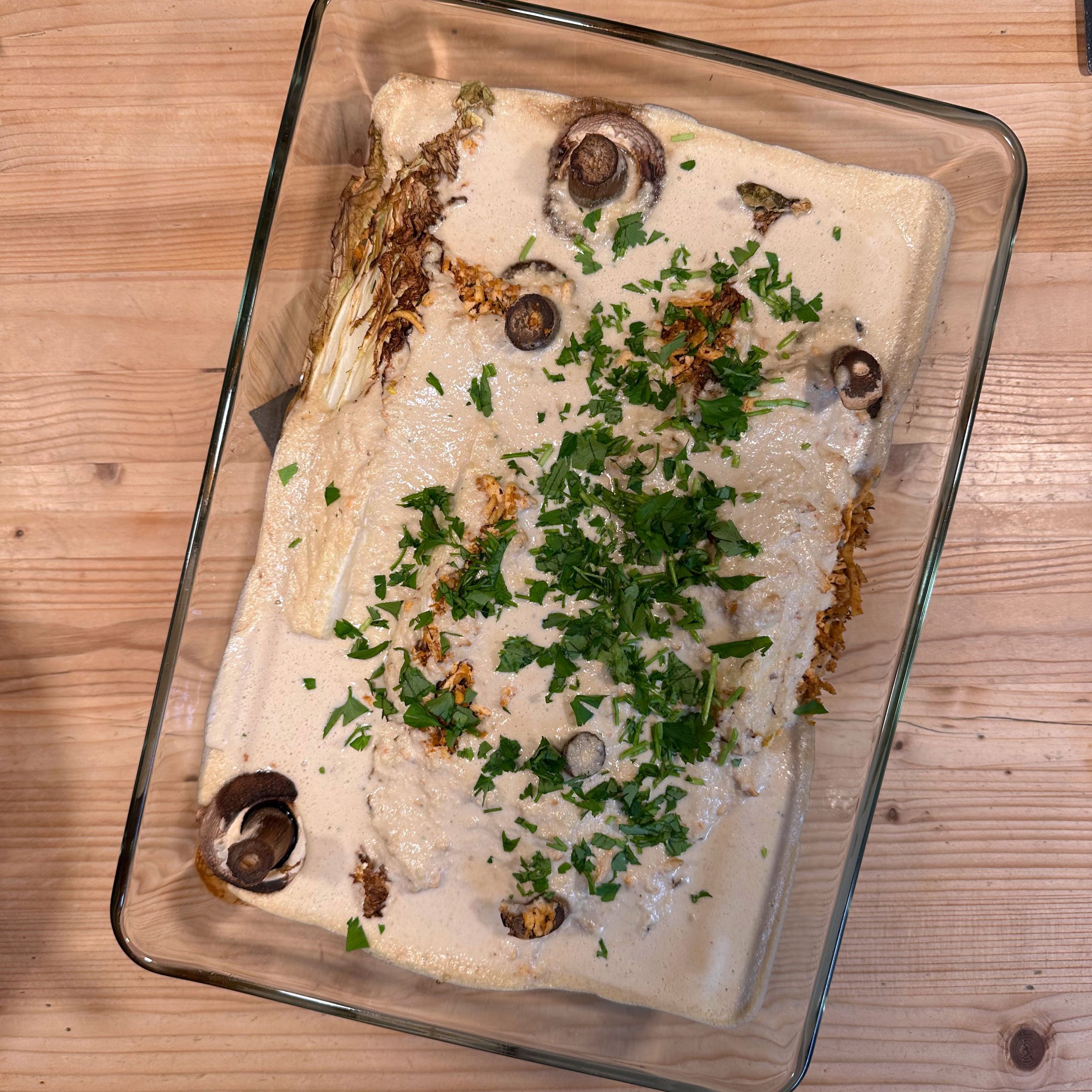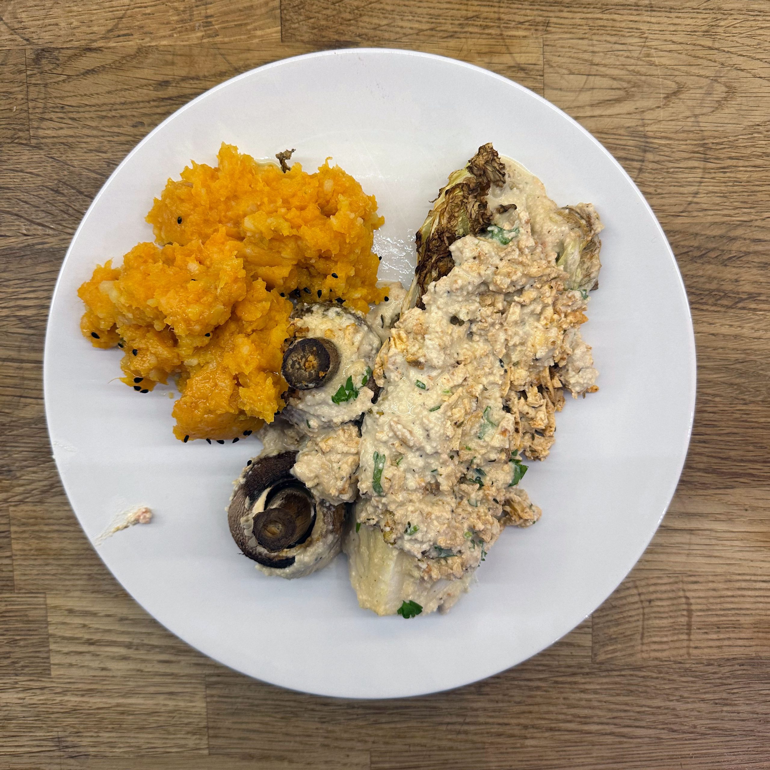 Karine kocht: 200gr Cashewkerne über Nacht in Wasser einweichen. 2 Süßkartoffeln schälen, in Stücke schneiden und in Salzwasser 15-20min weich kochen, abgießen und mit etwas Butter zu einem cremigen Püree stampfen, mit Salz und Pfeffer abschmecken. 300gr Champignons ganz mit dem Kopf nach unten auf ein Blech setzen, mit etwas Öl beträufeln und salzen, bei 200° Umluft 30min backen, etwas abkühlen lassen und in Scheiben schneiden. 1 Chinakohl der Länge nach vierteln, waschen und im Dampfeinsatz 10min dämpfen, dann mit etwas Öl auf ein Blech legen und bei 180° Umluft 20min backen, bis die Blätter etwas braun werden. Eingeweichte Cashewkerne abgießen und mit 300ml frischem Wasser, Salz und Zitronensaft sehr fein pürieren. 1 Räuchertofu grob raspeln und in etwas Öl im Wok knusprig braten. Gedämpften und gebackenen Chinakohl in eine Auflaufform geben, Champignonscheiben darauf verteilen, Cashewsoße darübergießen und geraspelten Tofu darüberstreuen. Bei 200° Umluft 15min überbacken. Mit Süßkartoffelpüree servieren.
