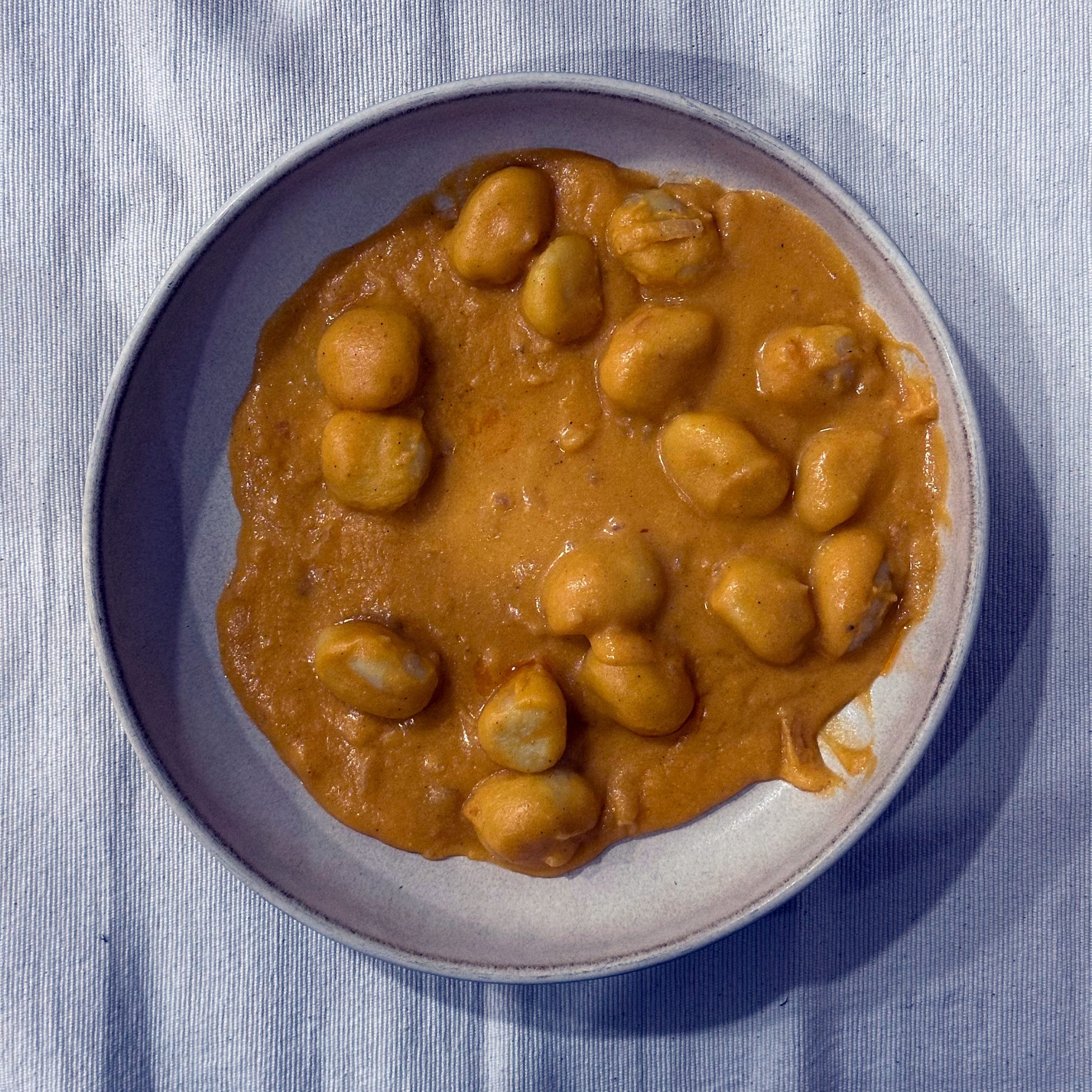 Kürbis wird gegart, püriert, mit etwas Brühe verdünnt. Die Gnocchi werden in der Soße gegart.