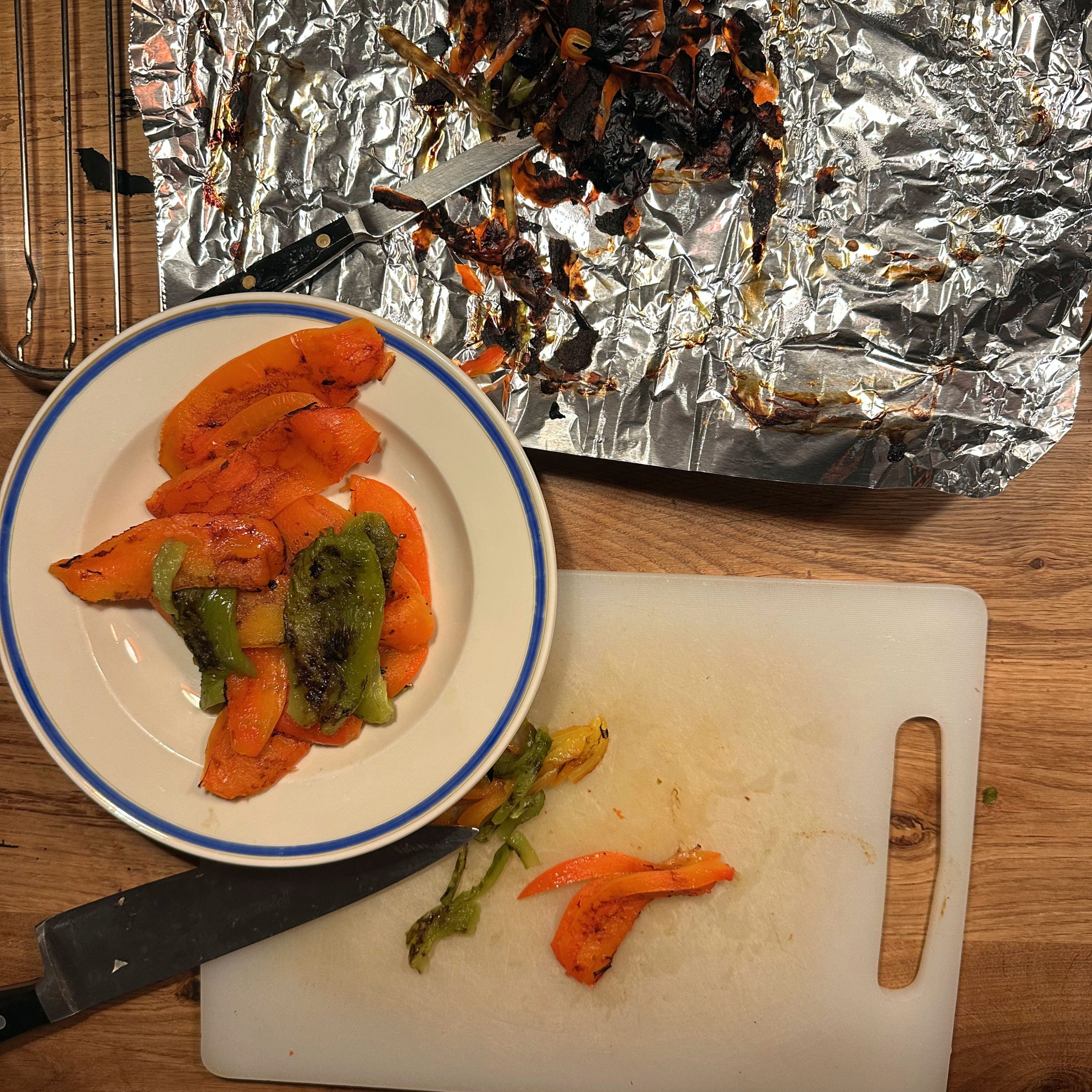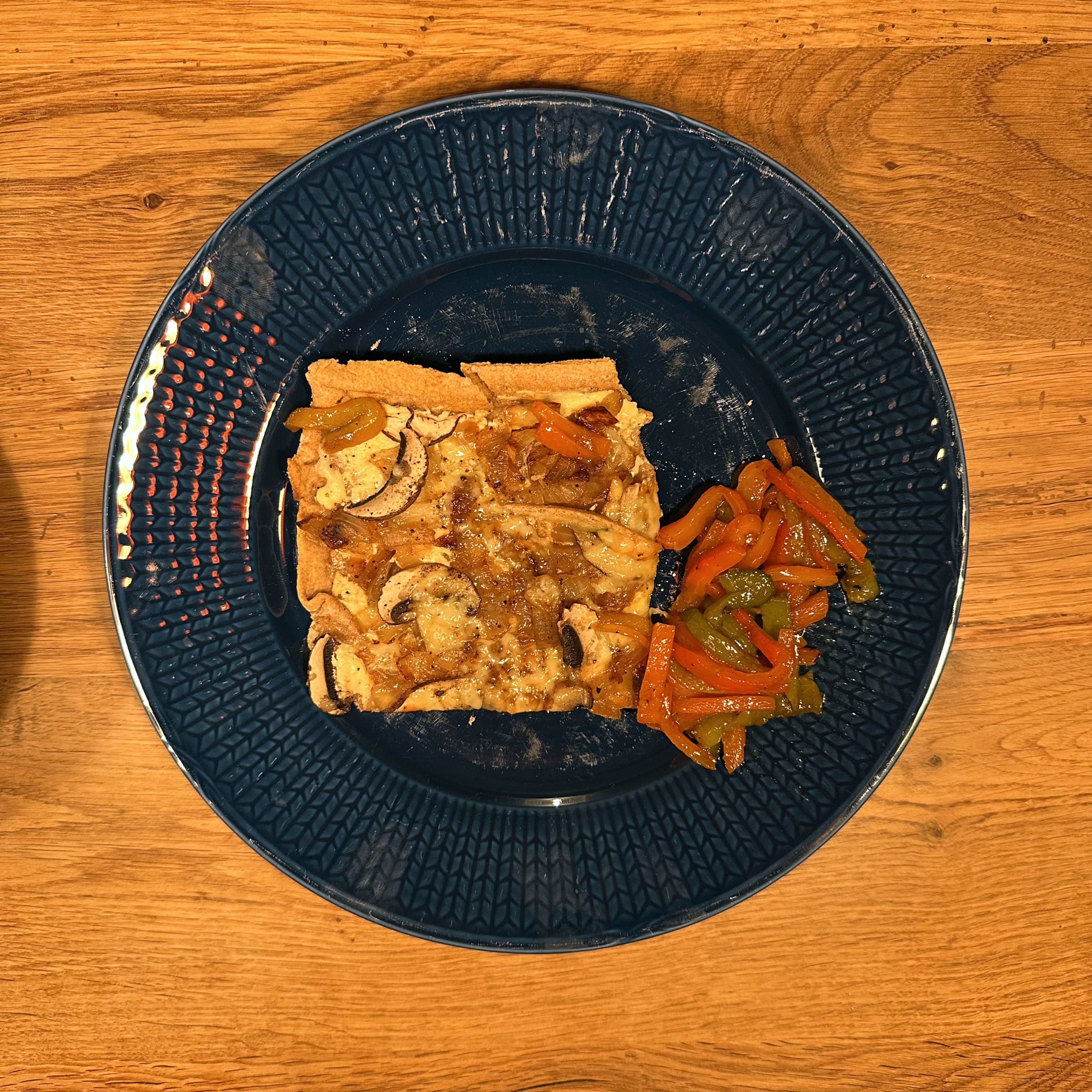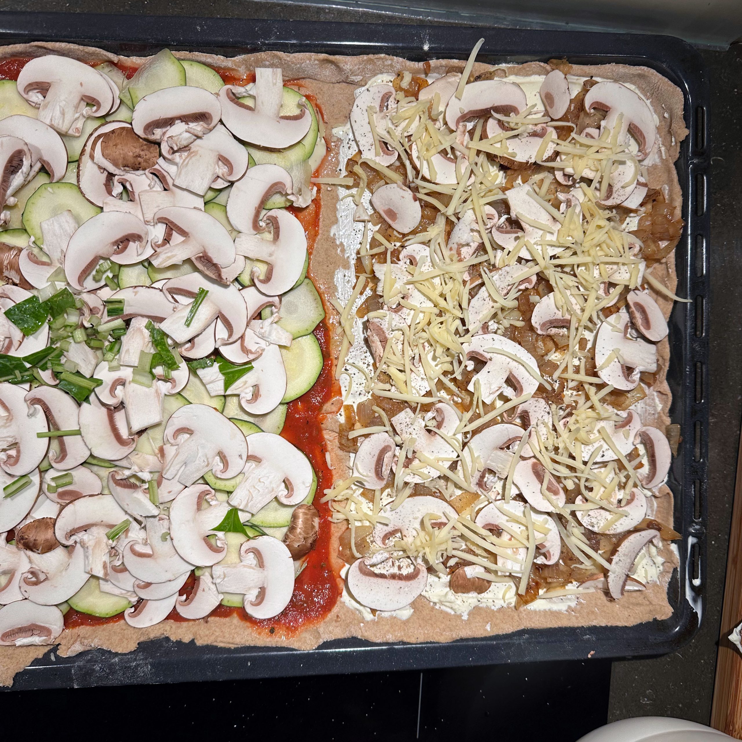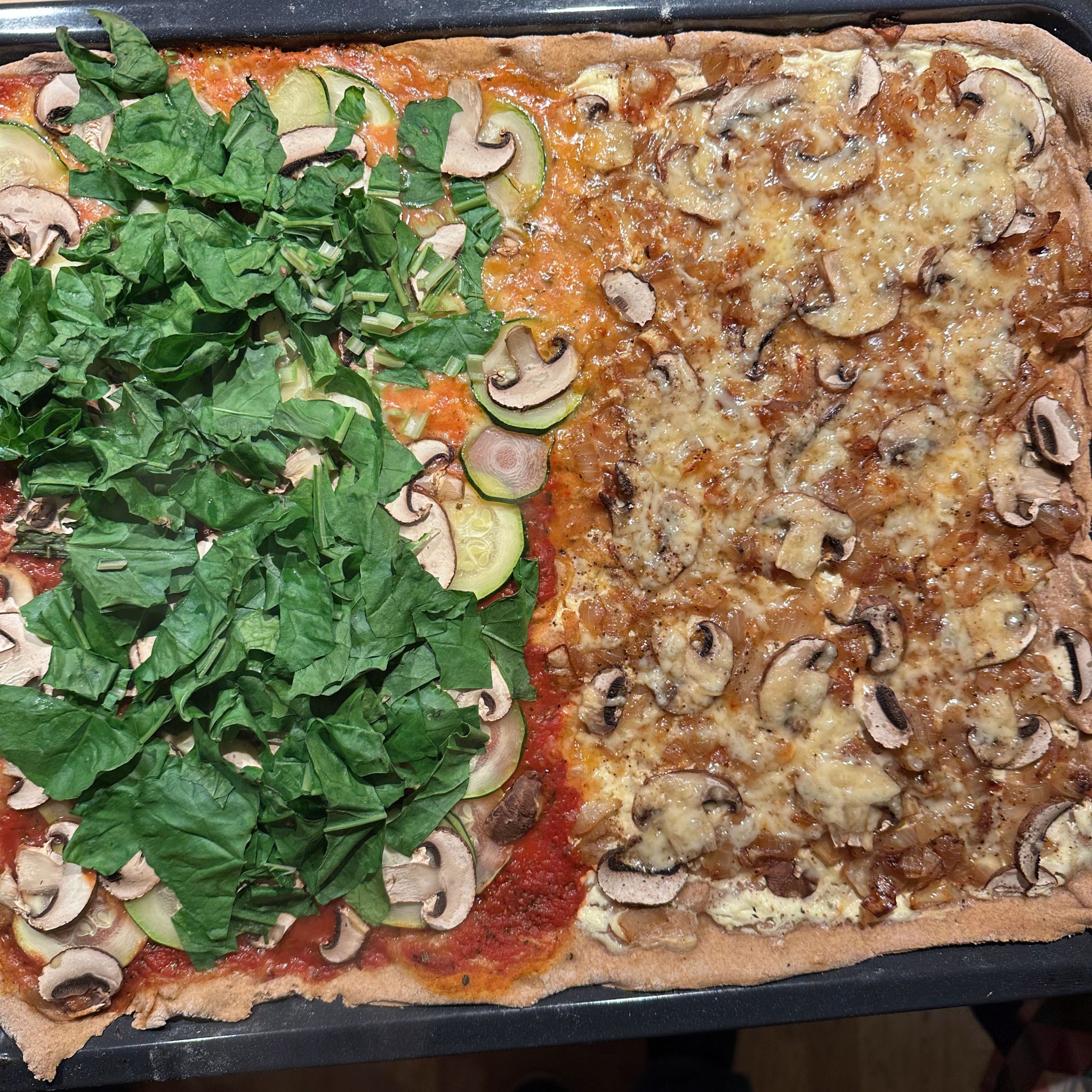 Der Rest Vollkornteig wird aufgebraucht: Eine Pizza belegt mit Crème fraîche und lang geschmorten Zwiebeln, die andere mit Gemüse. Dazu ein Paprikasalat aus gebrannten Paprika aus dem Ofen.