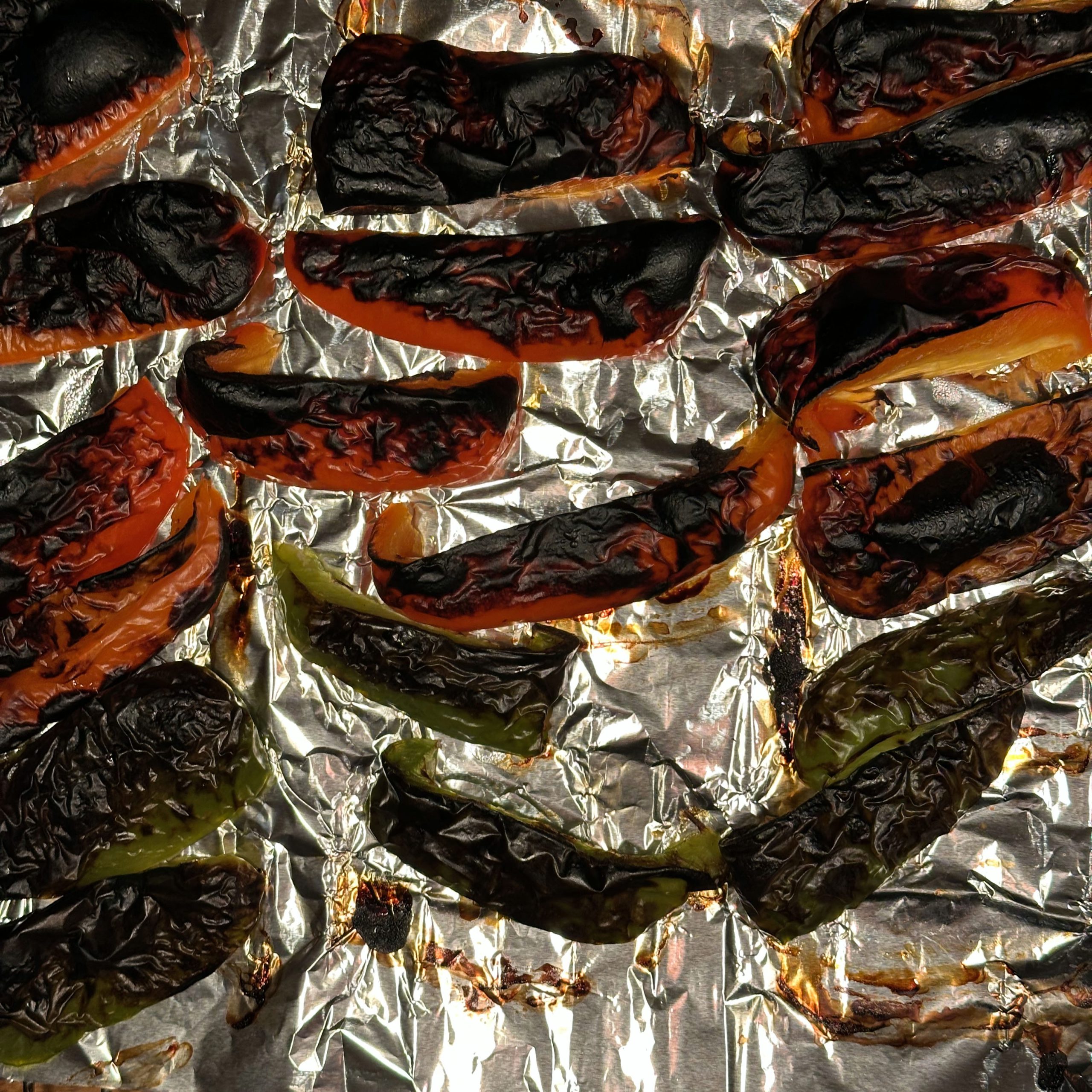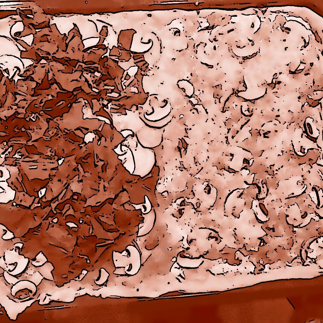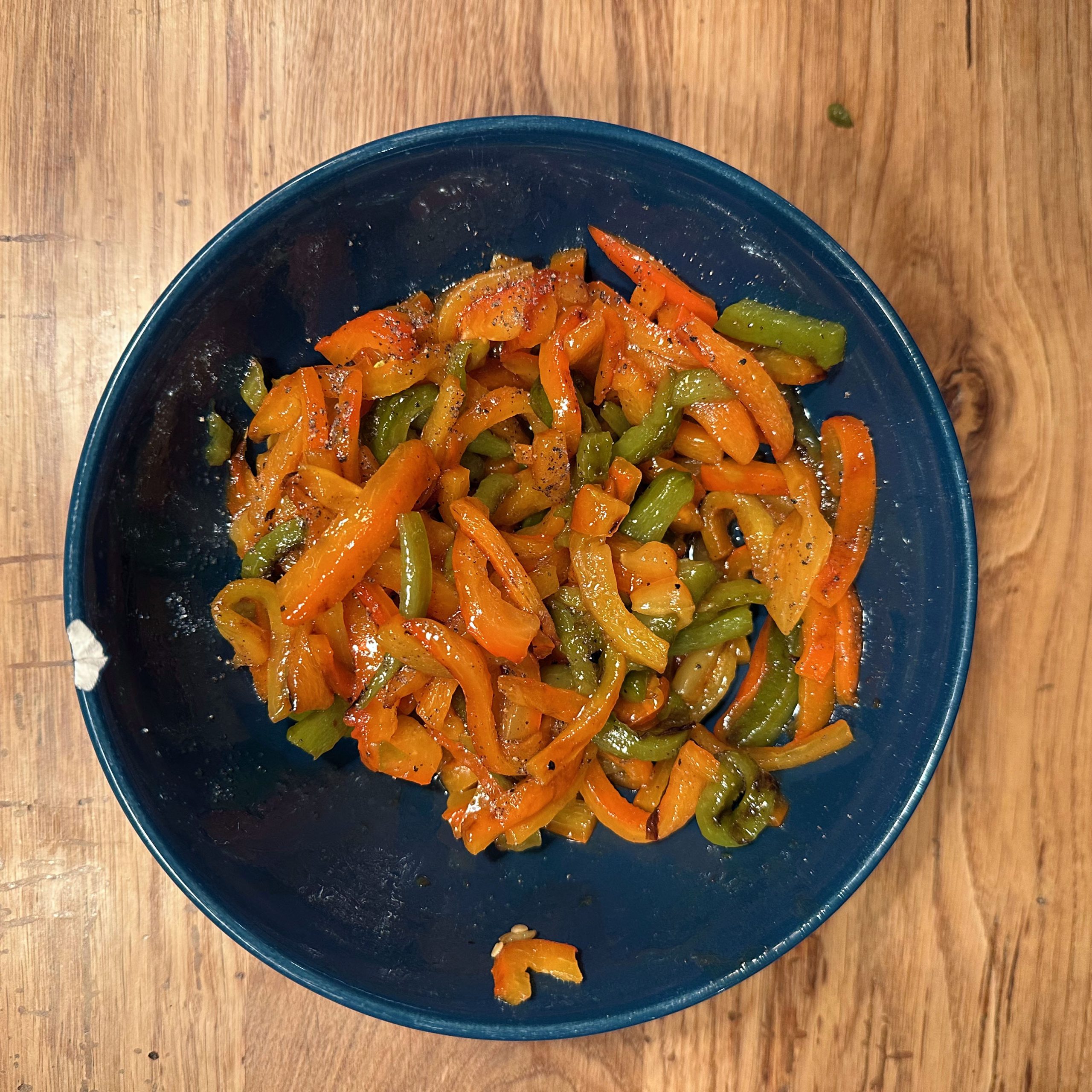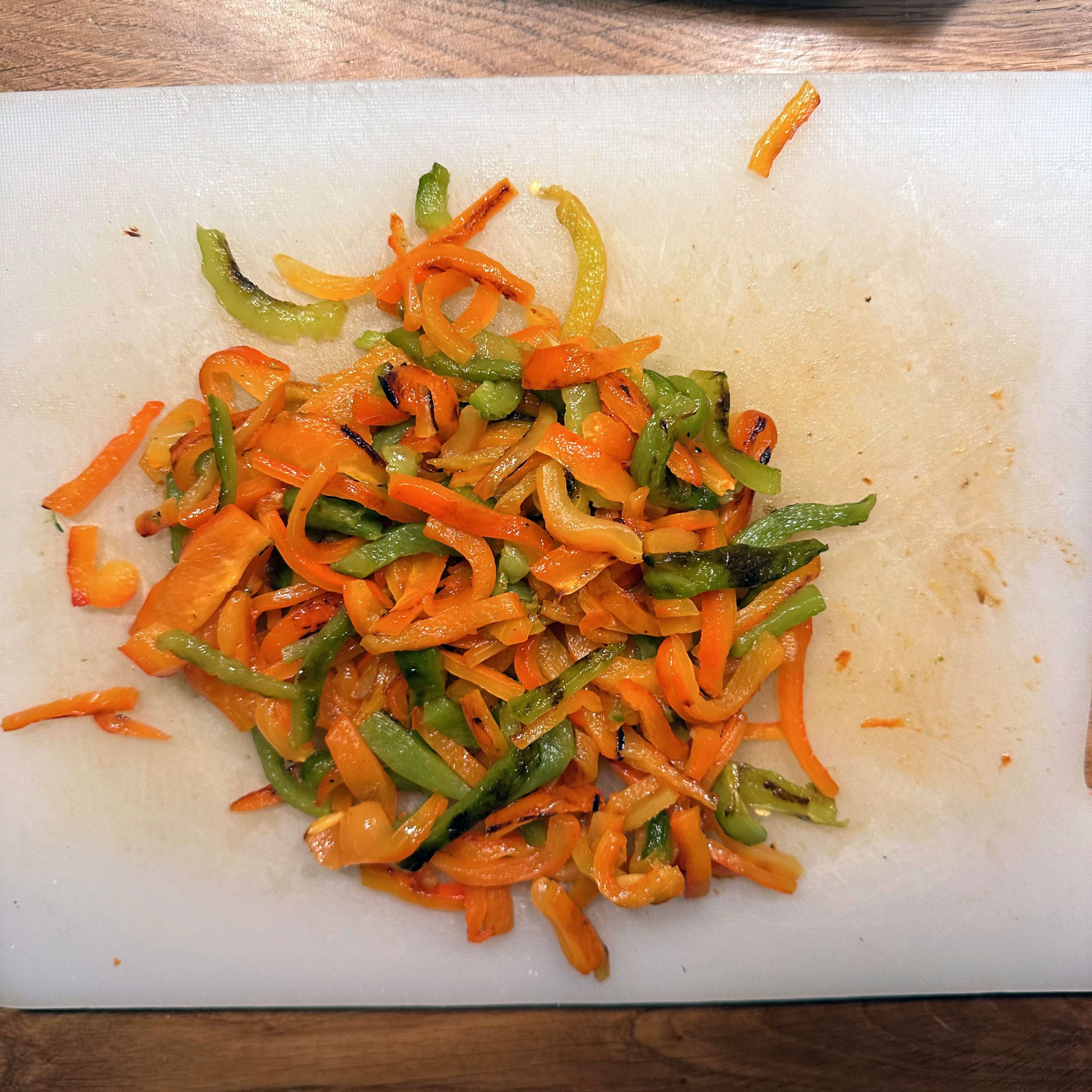 Der Rest Vollkornteig wird aufgebraucht: Eine Pizza belegt mit Crème fraîche und lang geschmorten Zwiebeln, die andere mit Gemüse. Dazu ein Paprikasalat aus gebrannten Paprika aus dem Ofen.