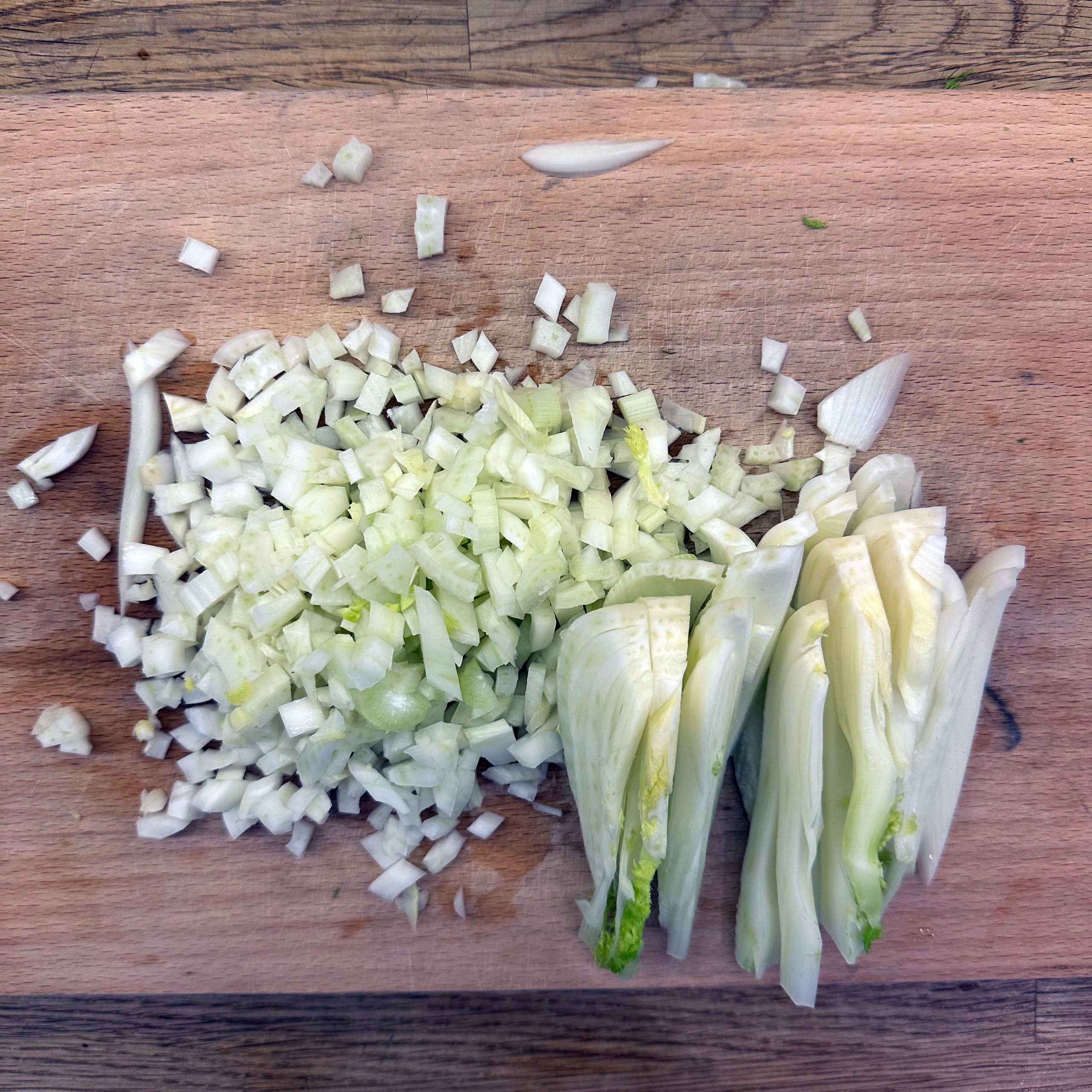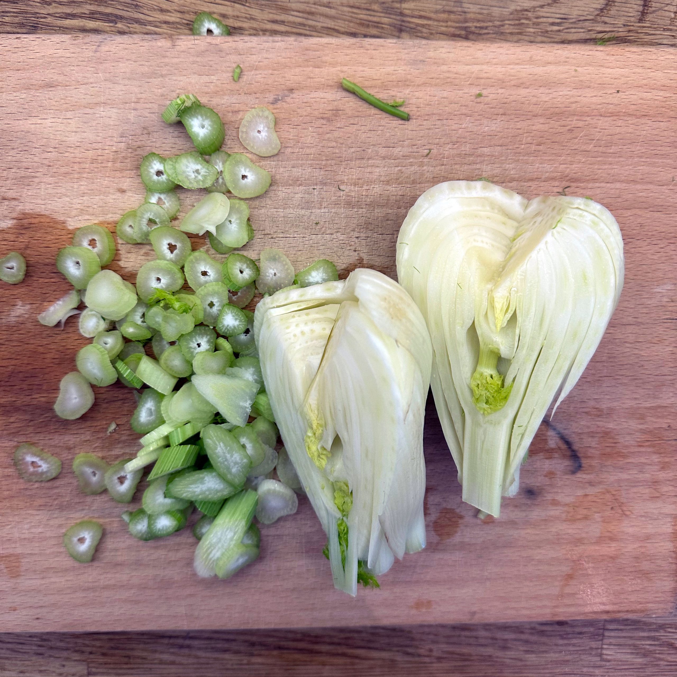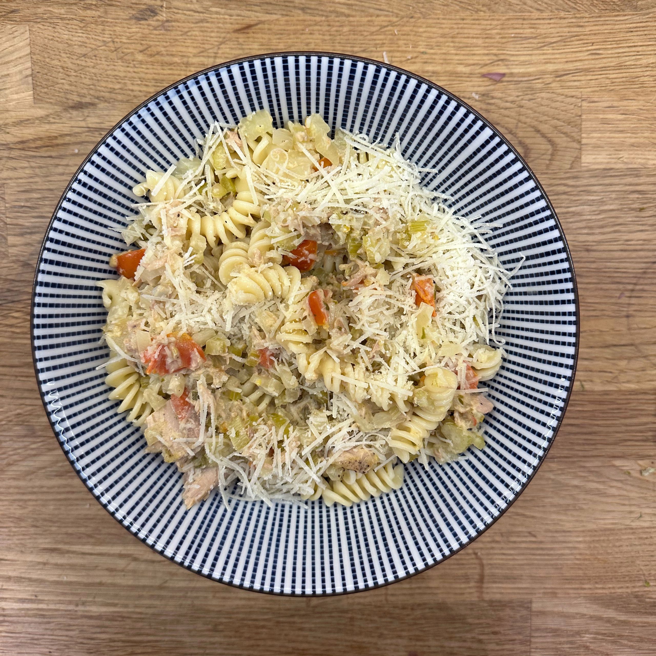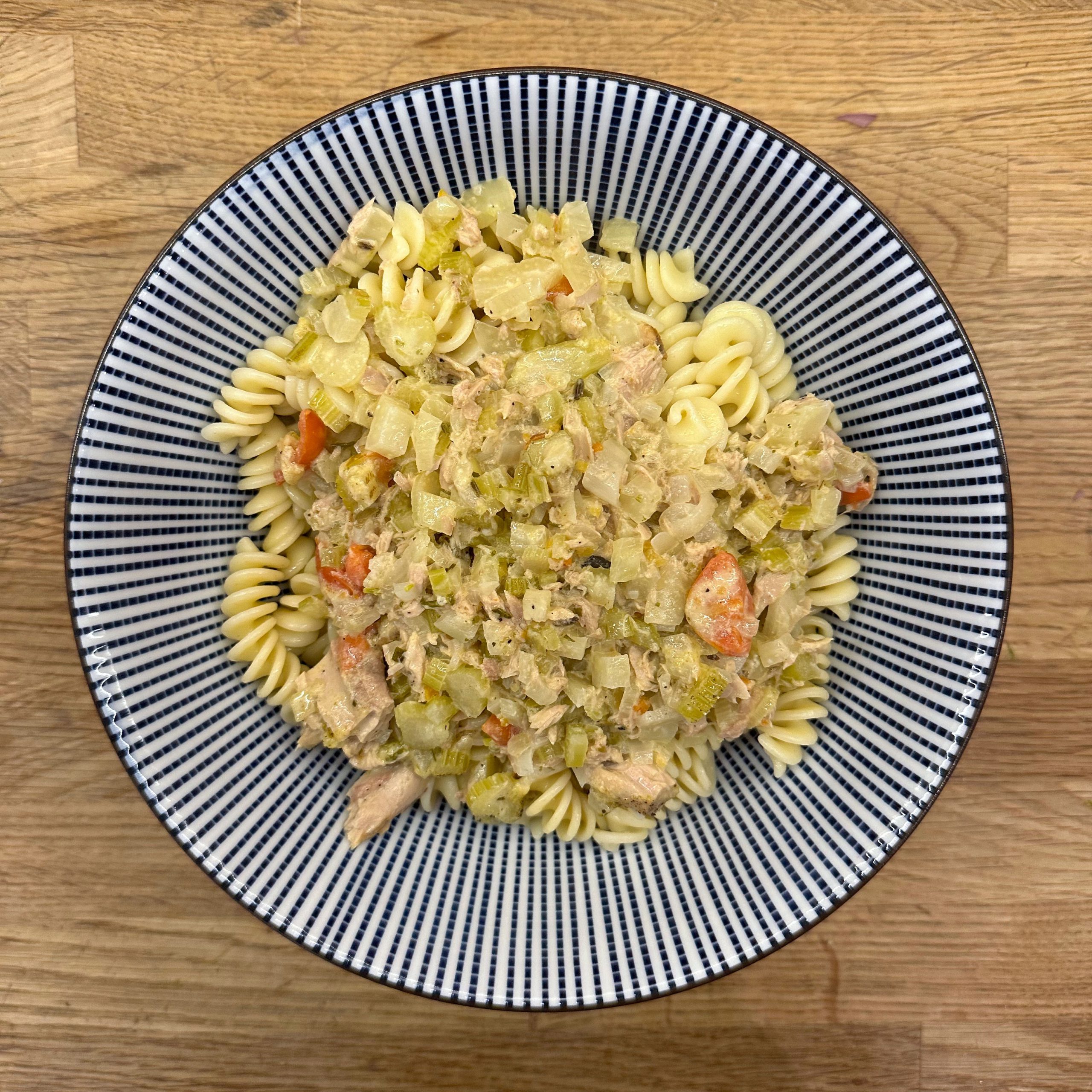 400g Spirelli in reichlich Salzwasser al dente kochen. 2 Fenchelknollen putzen, das Grün entfernen, halbieren und in feine Streifen schneiden. 3 Stangen Sellerie putzen und in kleine Würfel schneiden. In einer großen Pfanne 2 EL Olivenöl erhitzen, 1 fein gewürfelte Zwiebel darin glasig dünsten, dann den Fenchel und Sellerie hinzufügen und etwa 8-10 Minuten bei mittlerer Hitze anbraten, bis das Gemüse weich ist. Mi Gemüsebrühe ablöschen und kurz einkochen lassen. 200ml Sahne hinzufügen und die Soße etwa 5 Minuten köcheln lassen. 1 Dose Tunfisch im eigenen Saft in groben Stücken zur Soße geben, nur kurz erwärmen. Mit Salz, weißem Pfeffer, 1 TL Fenchelsamen und 1 EL Zitronensaft abschmecken. Die abgegossenen Spirelli unter die Soße heben oder auf Tellern anrichten und die Soße darüber geben. Mit frisch geriebenem Parmesan bestreuen und servieren.