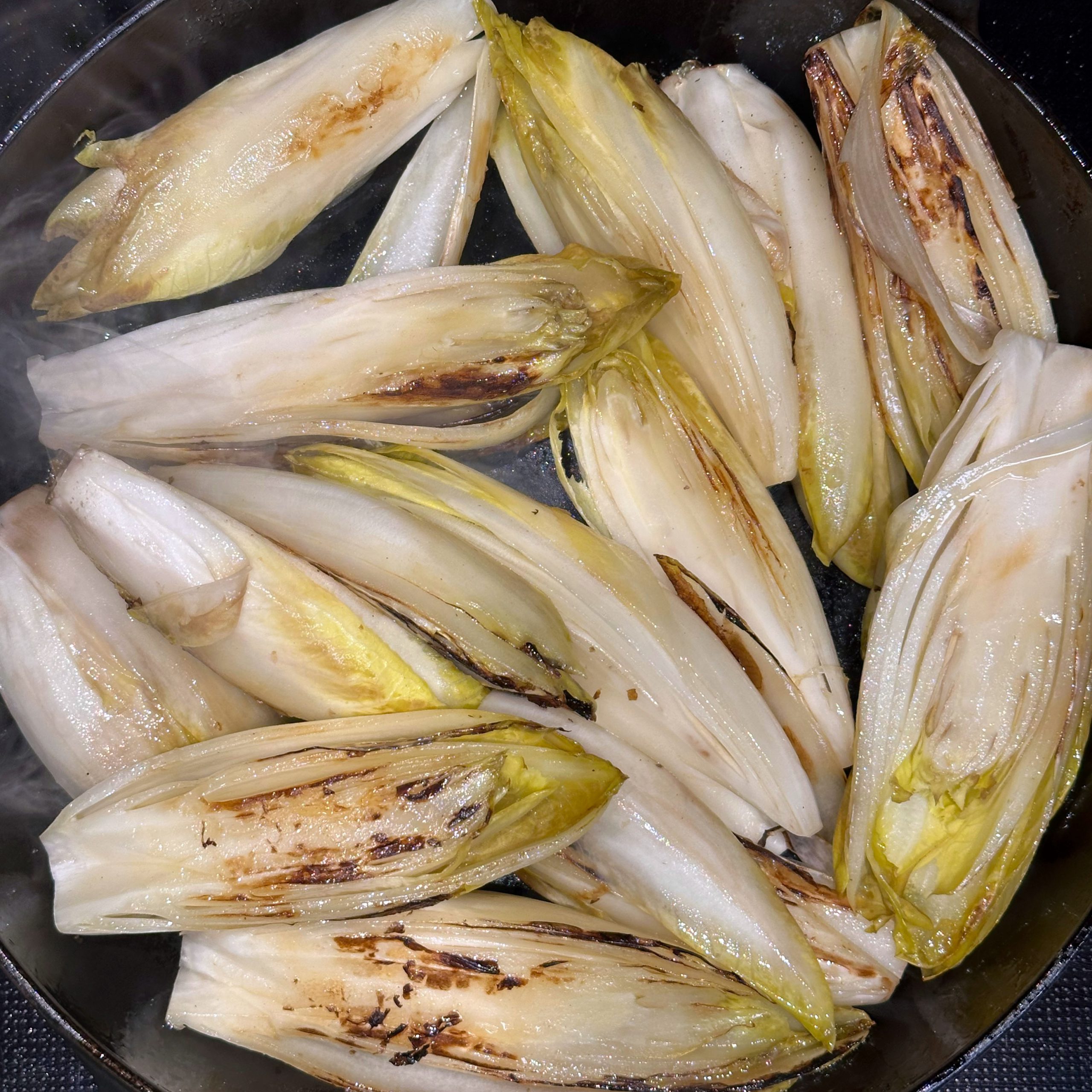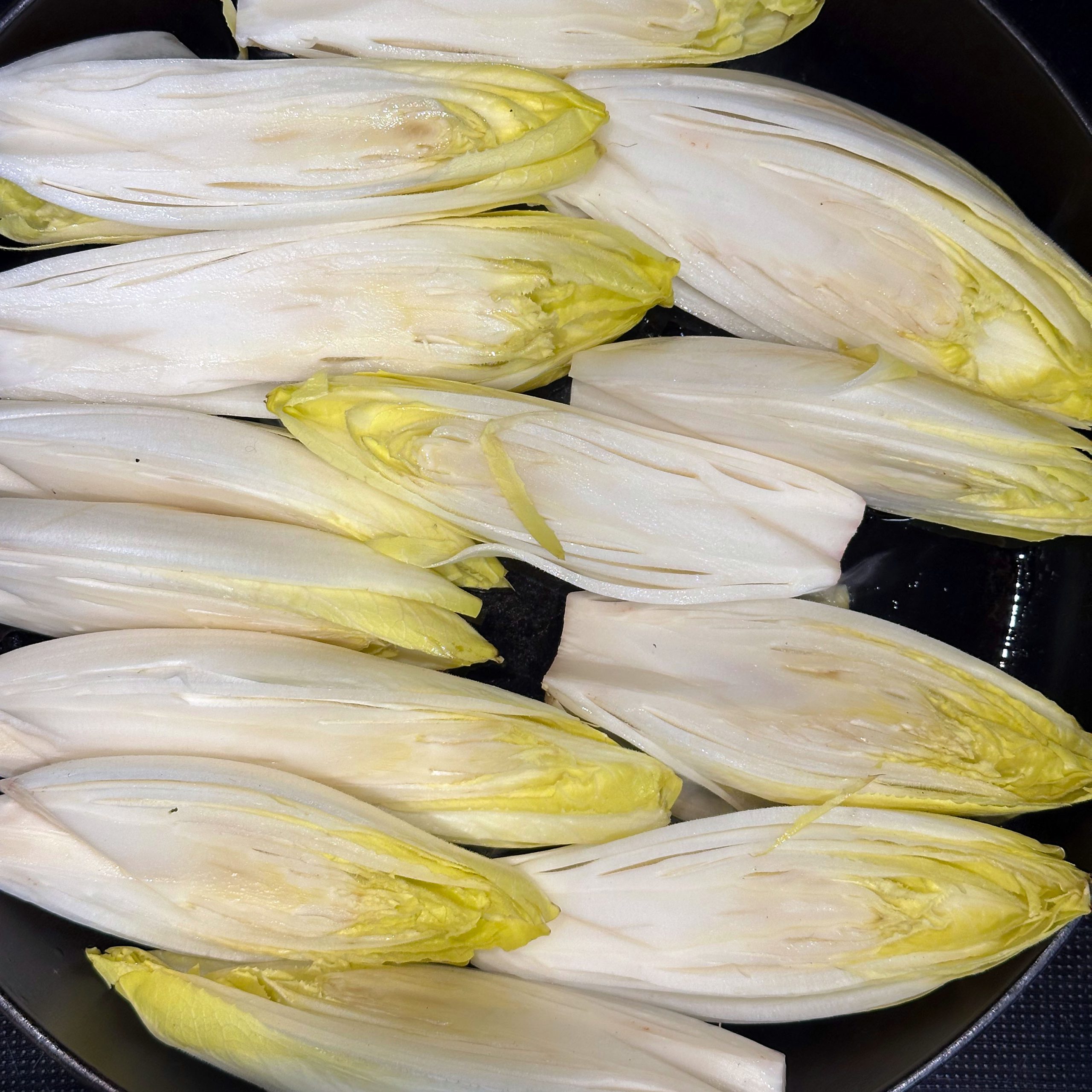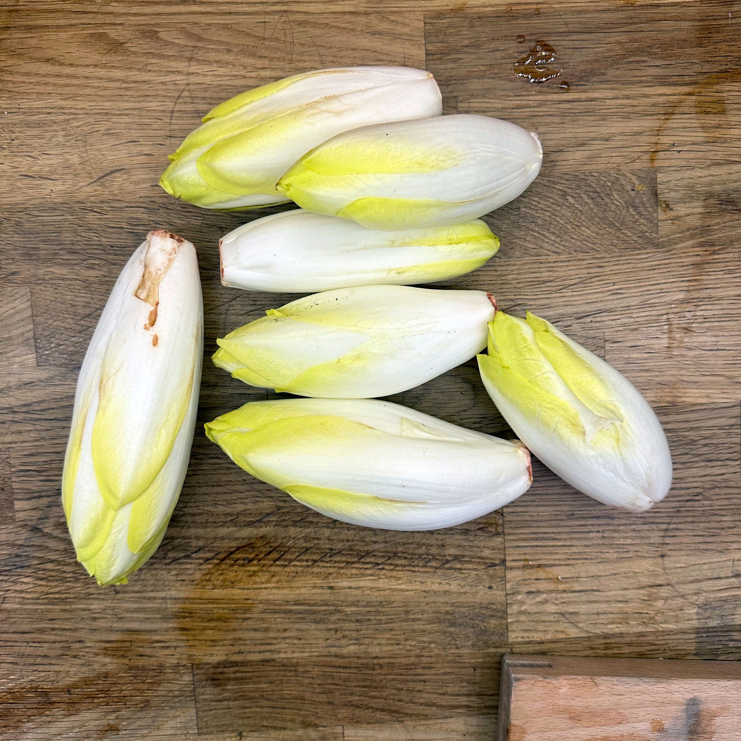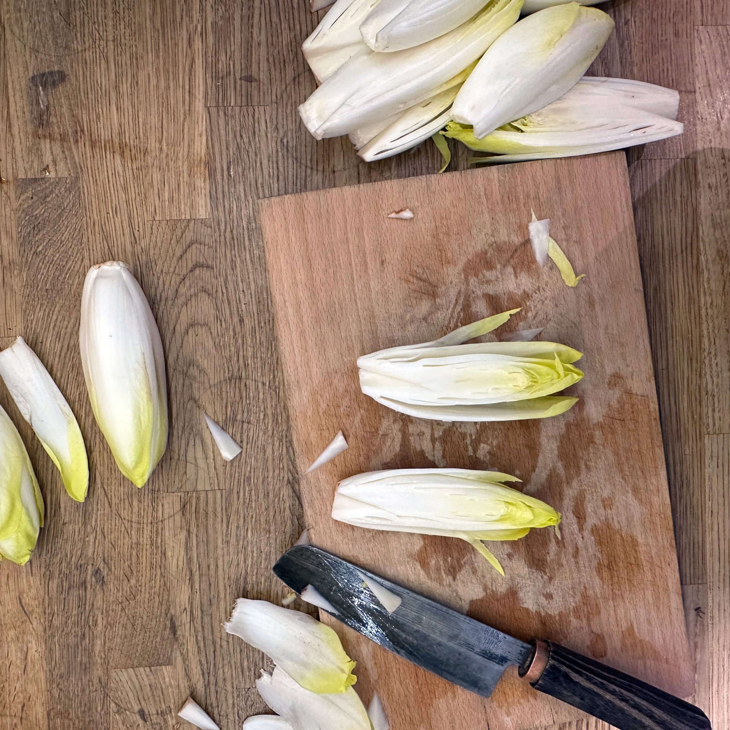800 g Kartoffeln und 400 g Möhren mit der Mandoline in dünne Scheiben hobeln. Eine gefettete Auflaufform vorbereiten und Kartoffel- und Möhrenscheiben abwechselnd in Fischschuppenform einschichten, dabei immer wieder etwas Brühe zwischen die Schichten geben, bis insgesamt ca. 300 ml Brühe verbraucht sind. Die Form abdecken und bei 180 °C Umluft 1 Stunde backen, dann den Deckel abnehmen und weitere 15 Minuten offen backen. 6 Chicorée halbieren, den bitteren Strunk keilförmig herausschneiden und die Hälften in einer großen Pfanne in 2 EL Butter und 1 EL Olivenöl von allen Seiten goldbraun braten, mit 200 ml Brühe ablöschen, 2 EL Ahornsirup einrühren und mit geschlossenem Deckel 20 Minuten bei niedriger Hitze dünsten, dabei gelegentlich wenden, bis der Chicorée weich ist. Zum Schluss mit Salz, Pfeffer und einem Spritzer Zitronensaft abschmecken. Chicorée mit dem Kartoffel-Möhren-Gratin auf Tellern anrichten.