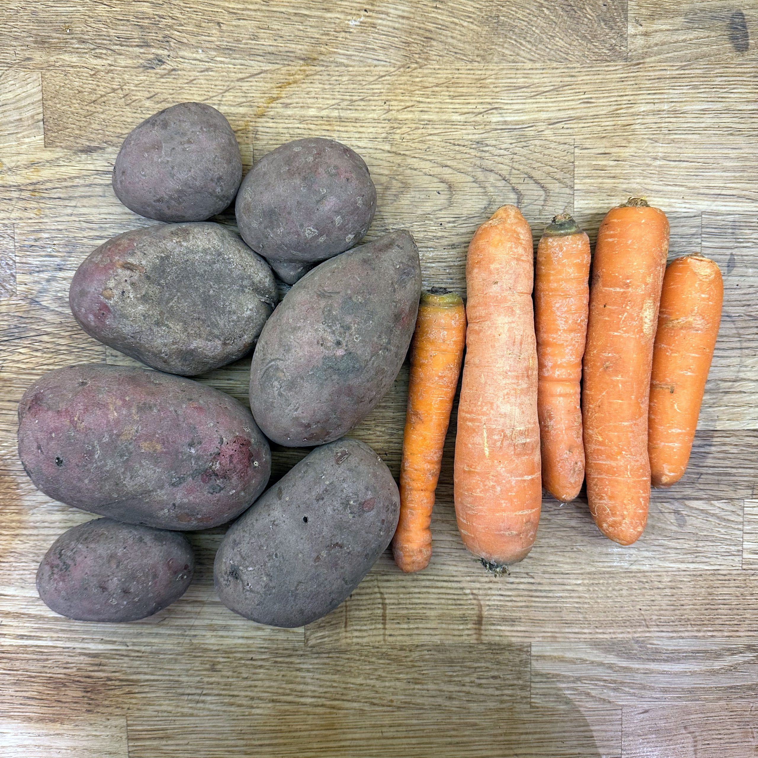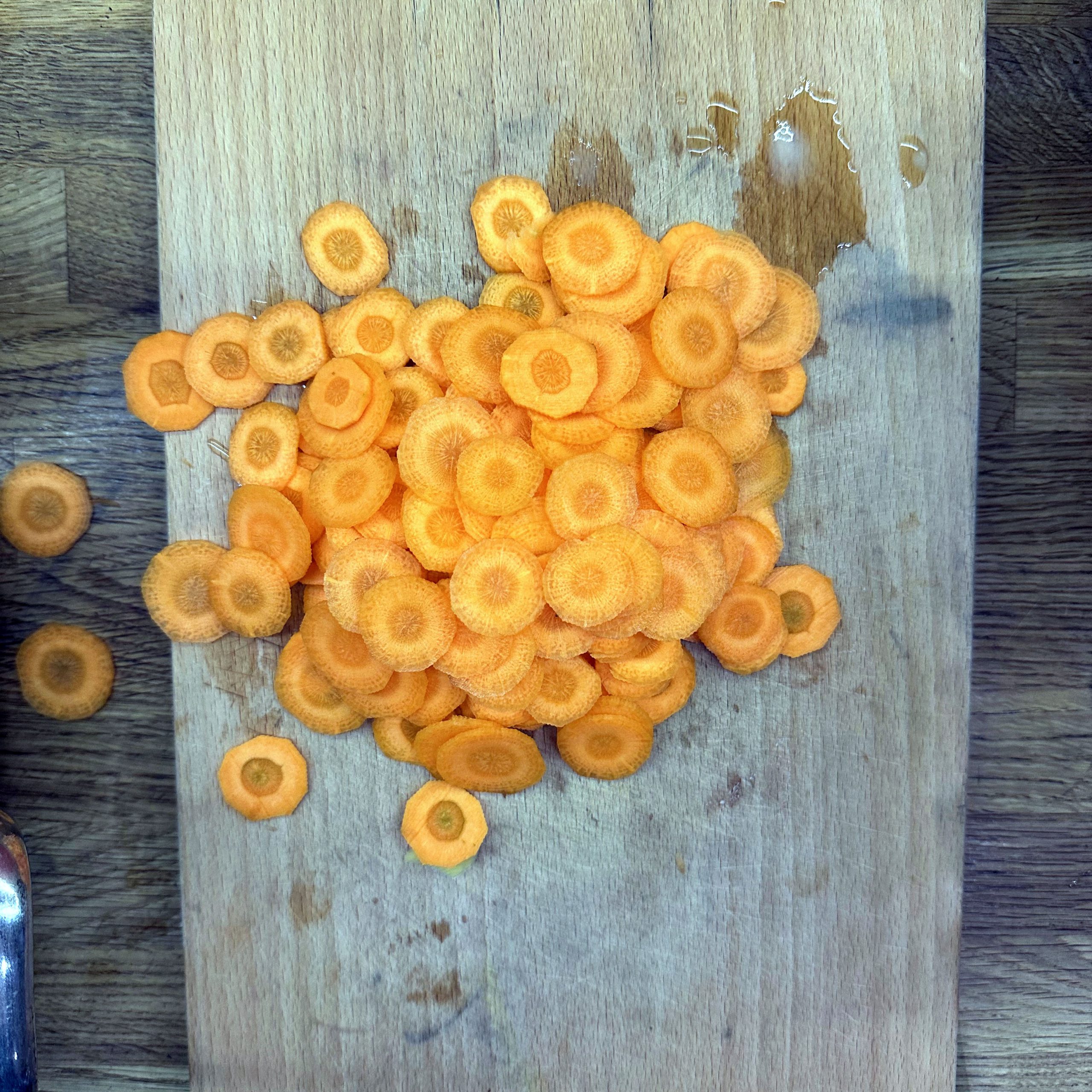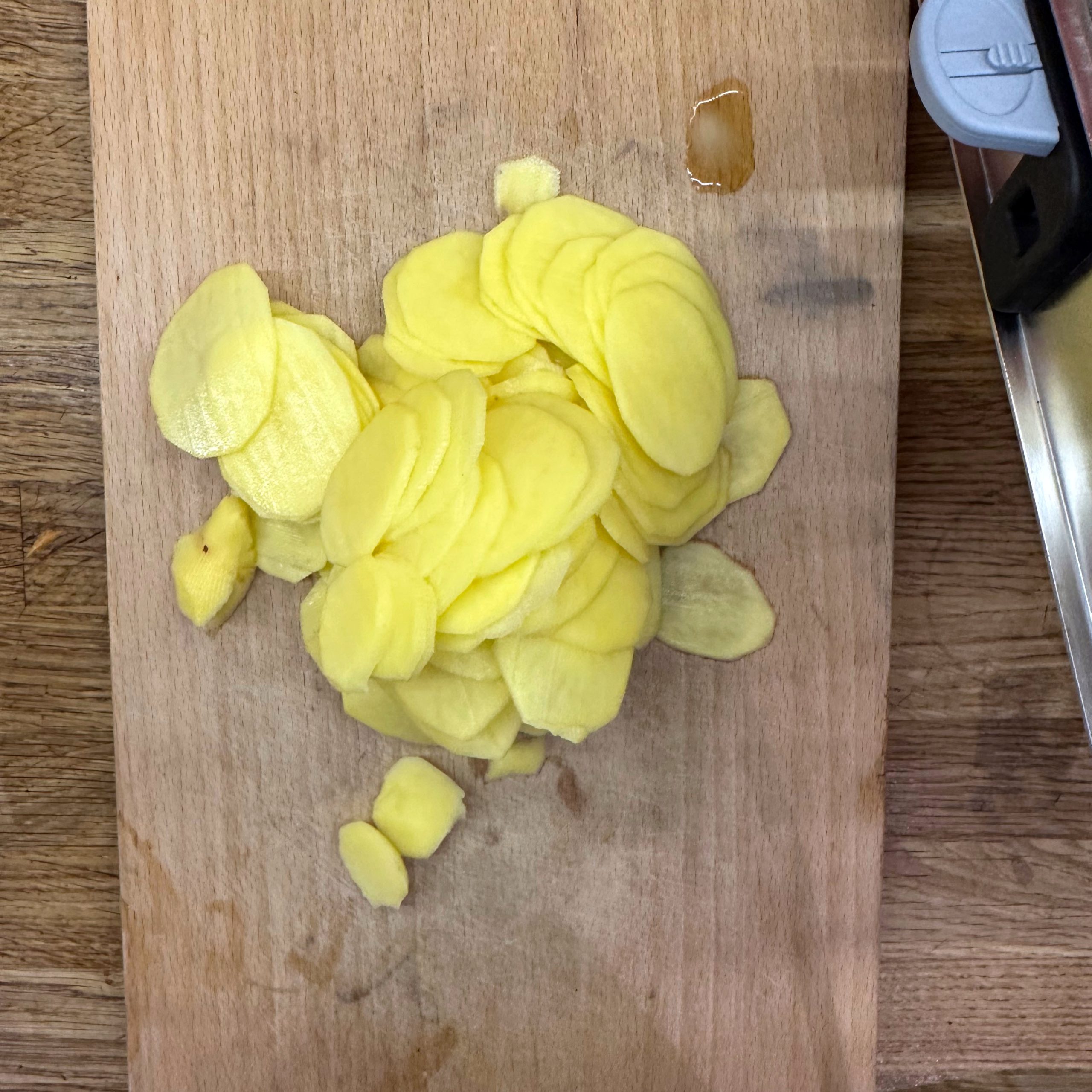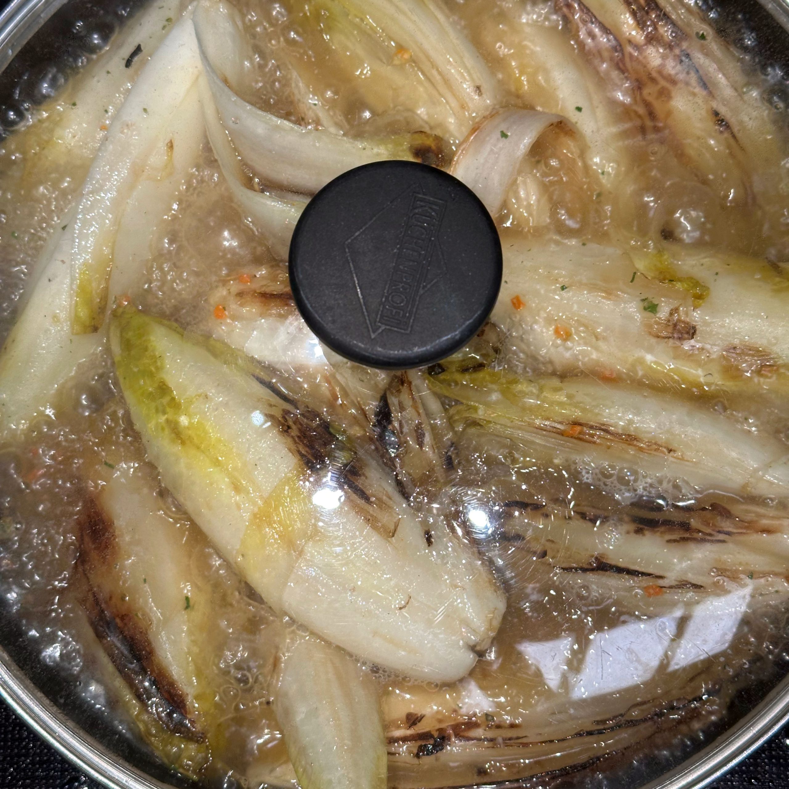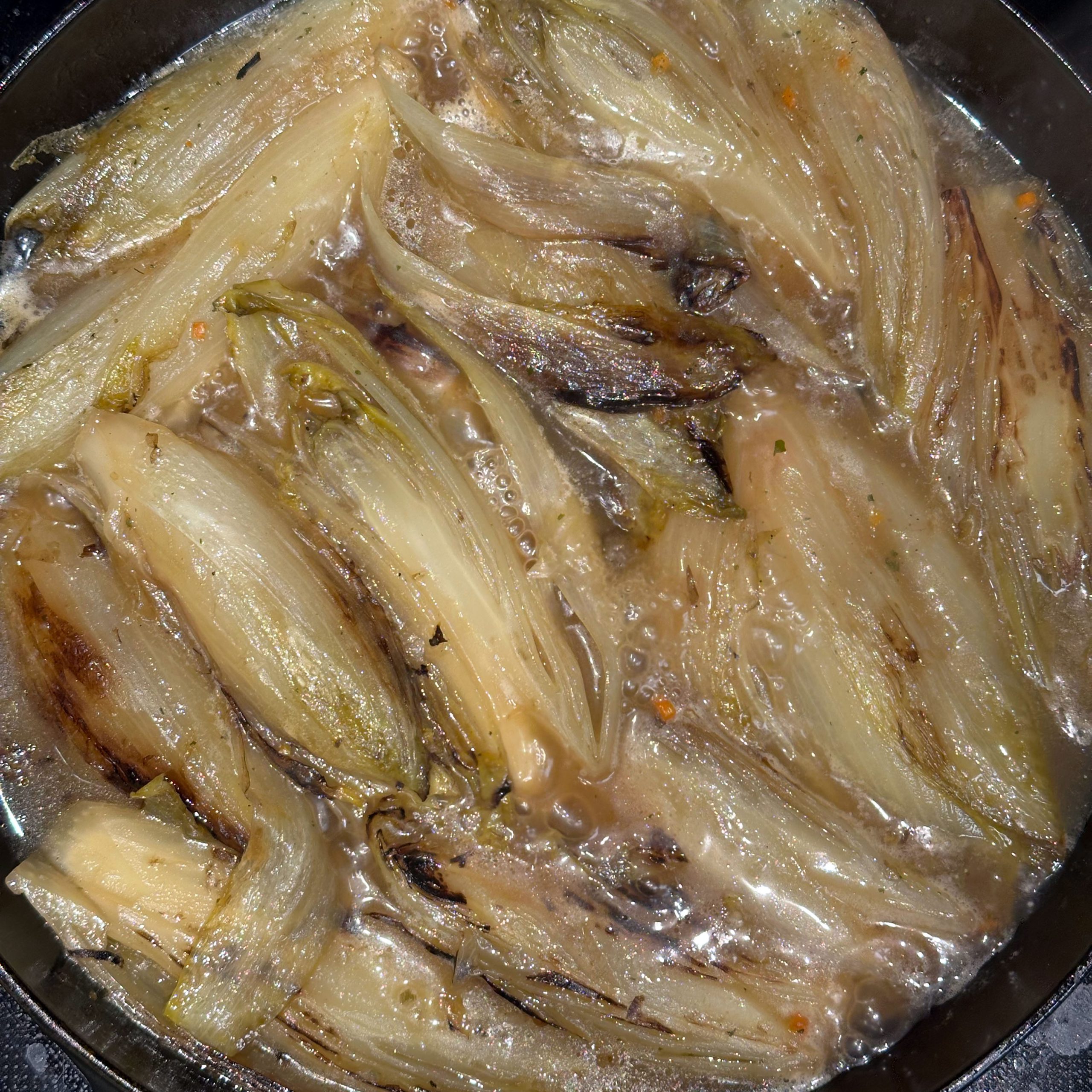 800 g Kartoffeln und 400 g Möhren mit der Mandoline in dünne Scheiben hobeln. Eine gefettete Auflaufform vorbereiten und Kartoffel- und Möhrenscheiben abwechselnd in Fischschuppenform einschichten, dabei immer wieder etwas Brühe zwischen die Schichten geben, bis insgesamt ca. 300 ml Brühe verbraucht sind. Die Form abdecken und bei 180 °C Umluft 1 Stunde backen, dann den Deckel abnehmen und weitere 15 Minuten offen backen. 6 Chicorée halbieren, den bitteren Strunk keilförmig herausschneiden und die Hälften in einer großen Pfanne in 2 EL Butter und 1 EL Olivenöl von allen Seiten goldbraun braten, mit 200 ml Brühe ablöschen, 2 EL Ahornsirup einrühren und mit geschlossenem Deckel 20 Minuten bei niedriger Hitze dünsten, dabei gelegentlich wenden, bis der Chicorée weich ist. Zum Schluss mit Salz, Pfeffer und einem Spritzer Zitronensaft abschmecken. Chicorée mit dem Kartoffel-Möhren-Gratin auf Tellern anrichten.
