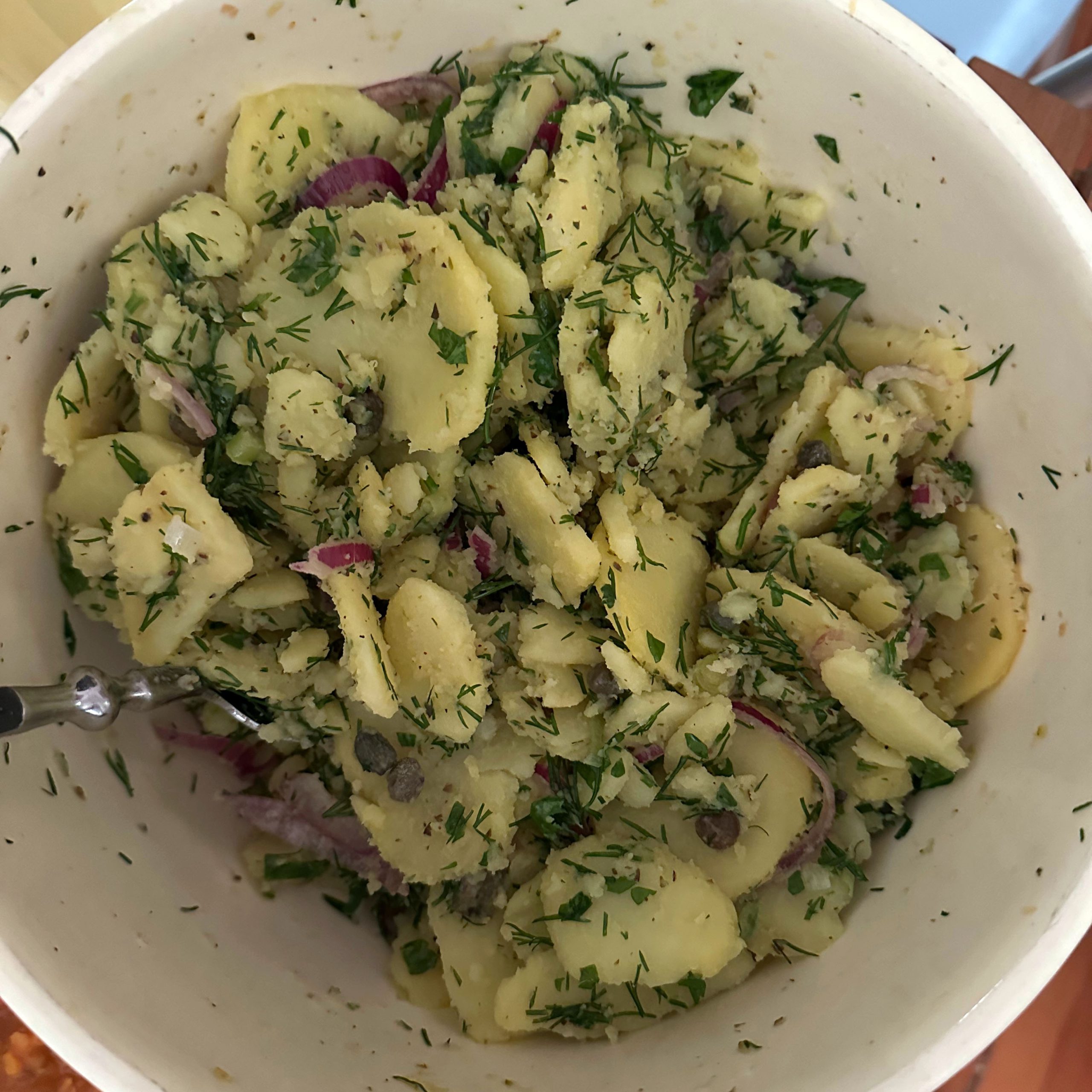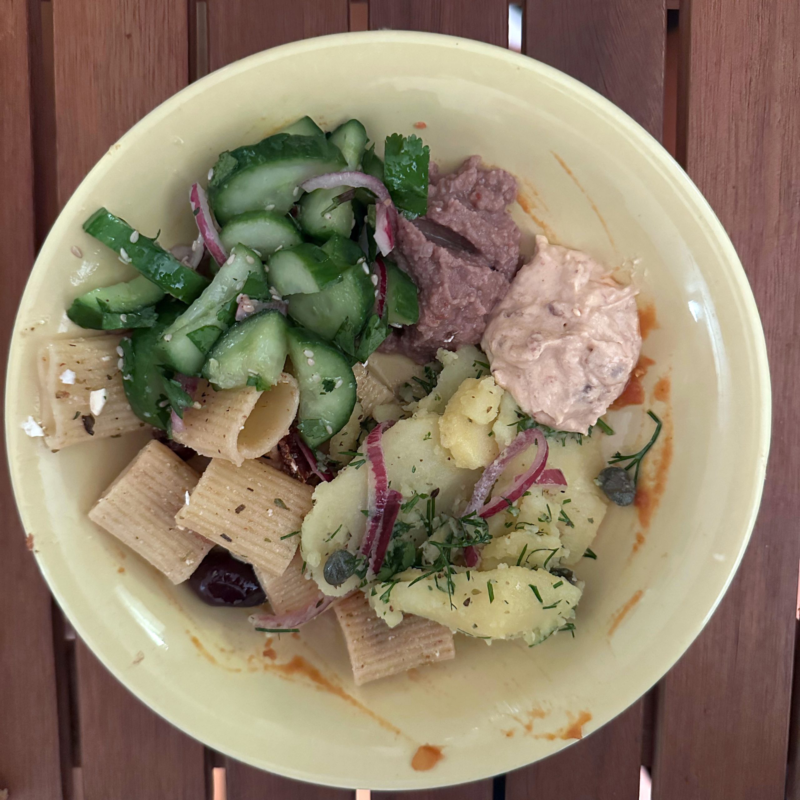Hans hat zum Geburtstag eingeladen mit sehr guter Kuchenauswahl: Käsekuchen, Linzertorte, Zitronenkuchen und Apfelkuchen mit Streuseln. Zum Abend wurde Salziges im Buffet angeboten: Linsensuppe, Kartoffel-, Gurken- und Nudelsalat, verschiedene Dips. Alles sehr lecker.