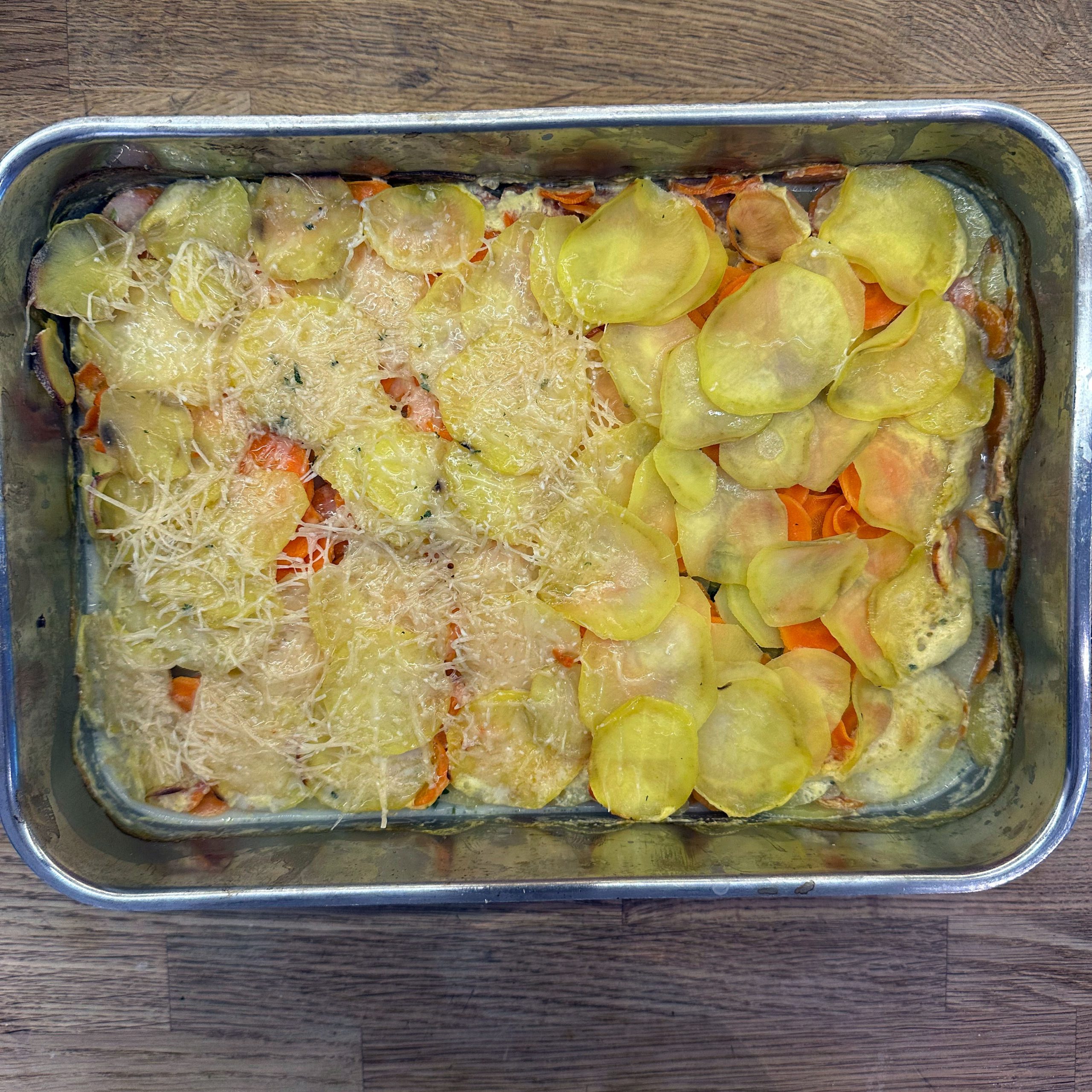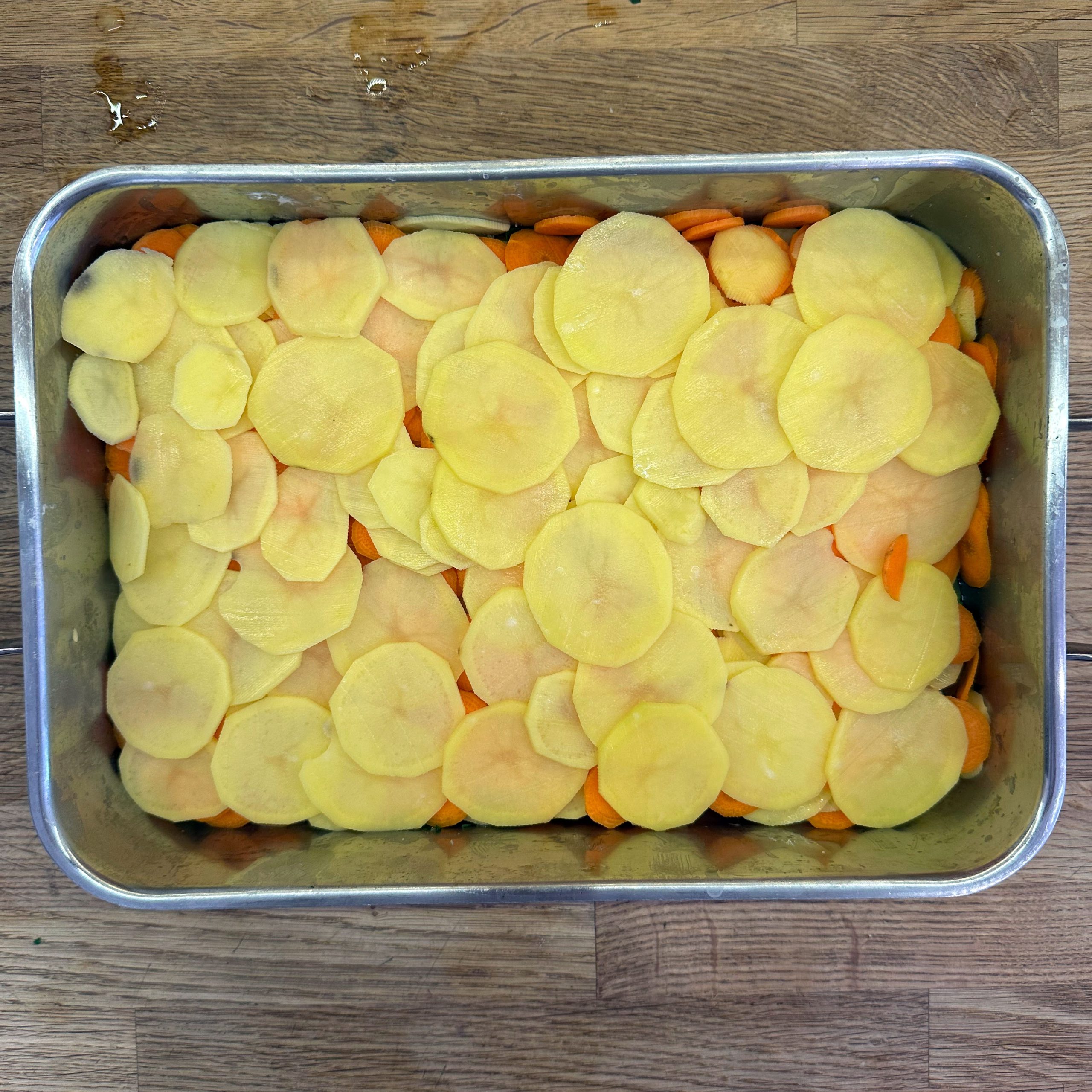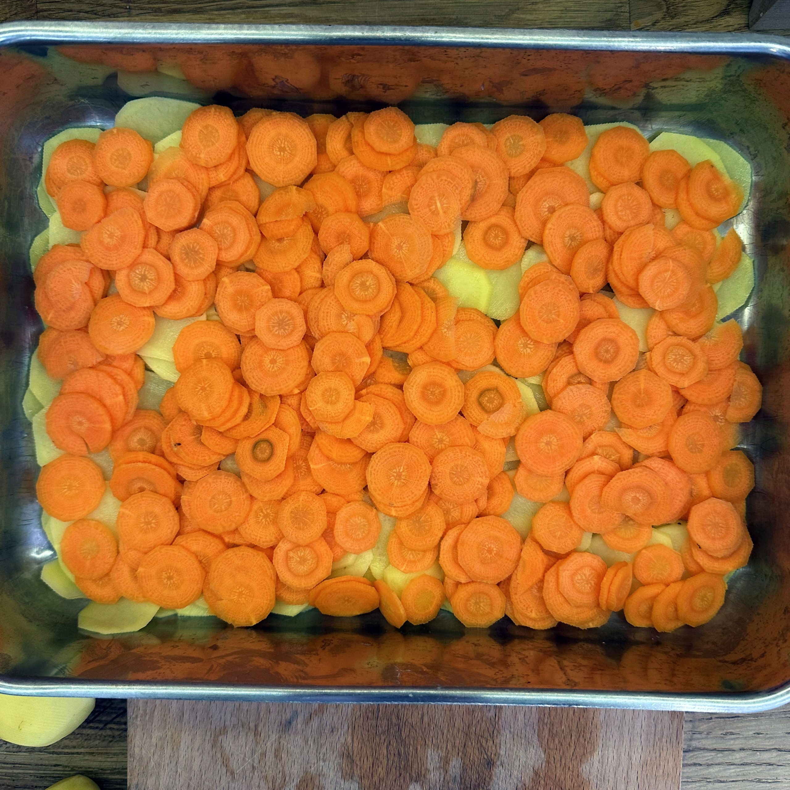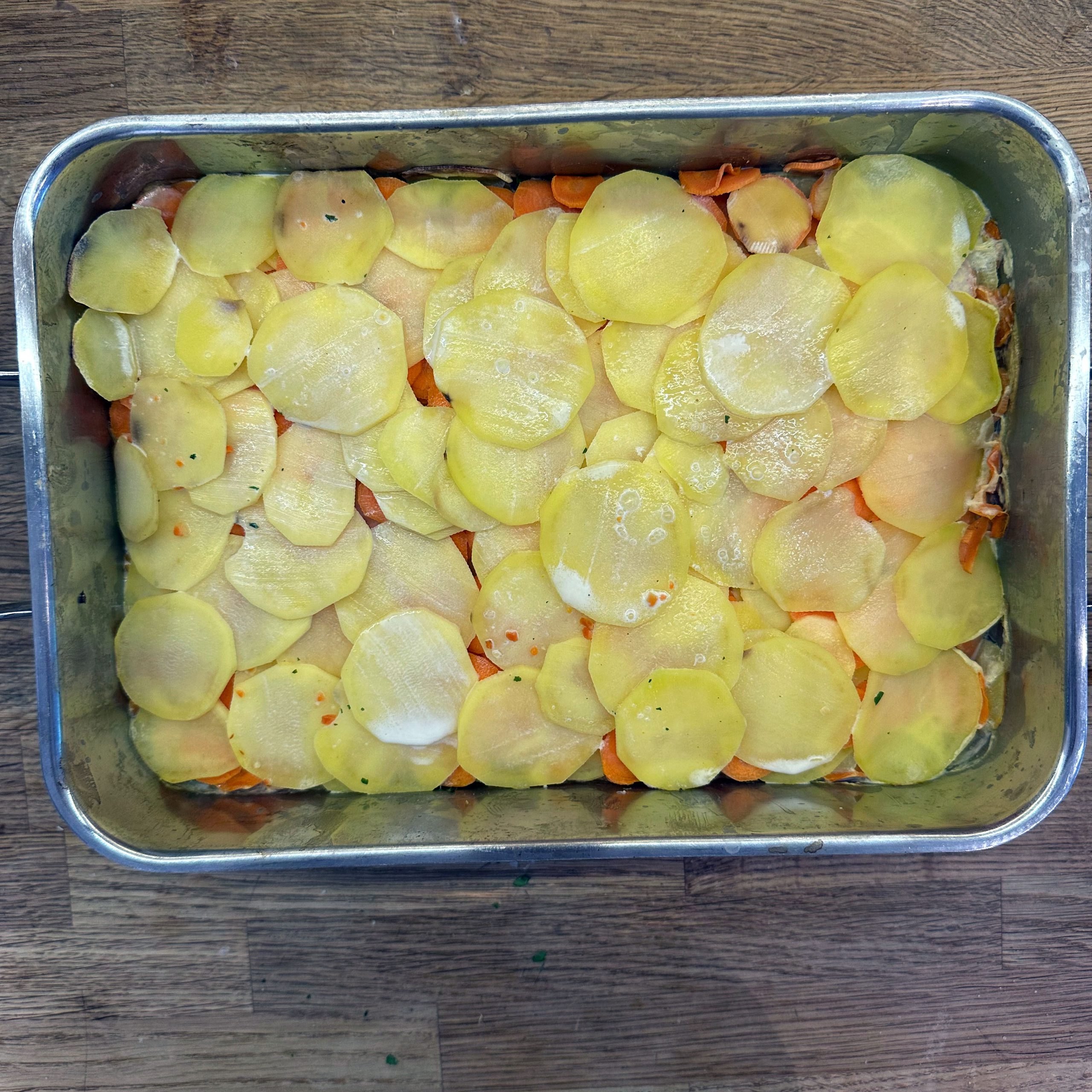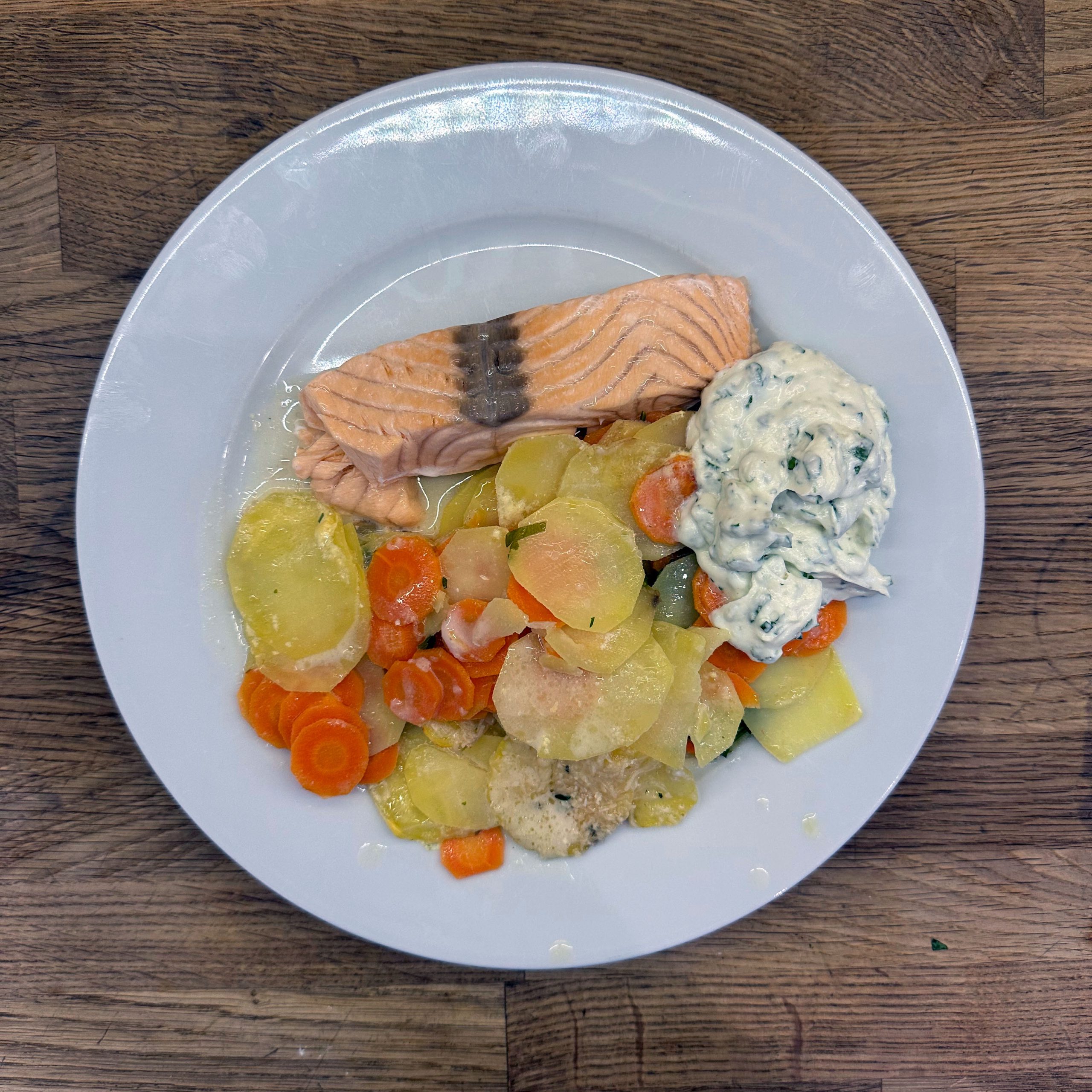 800 g Kartoffeln und 400 g Möhren mit der Mandoline in dünne Scheiben hobeln. 100 ml Brühe mit 200 ml Mandelsahne verrühren und mit Salz und Pfeffer würzen. Eine gefettete Auflaufform vorbereiten und Kartoffel- und Möhrenscheiben abwechselnd in Fischschuppenform einschichten, dazwischen eine Schicht gehackte Petersilie verteilen und alles immer wieder mit der Brühe-Mandelsahne-Mischung übergießen. Form abdecken und bei 180 °C Umluft 1 h backen, dann den Deckel abnehmen und weitere 15 min offen backen. Für den Dip Quark mit Joghurt, gehacktem Koriander, Salz, Pfeffer und dem Saft von 0,5 Zitrone verrühren. 4 Lachsfilets salzen und pfeffern, in einen Dampfeinsatz legen und über leicht kochendem Wasser 13 min dämpfen. Gedämpften Lachs mit dem Kartoffel-Karotten-Gratin und dem Quark-Koriander-Dip auf Tellern anrichten.