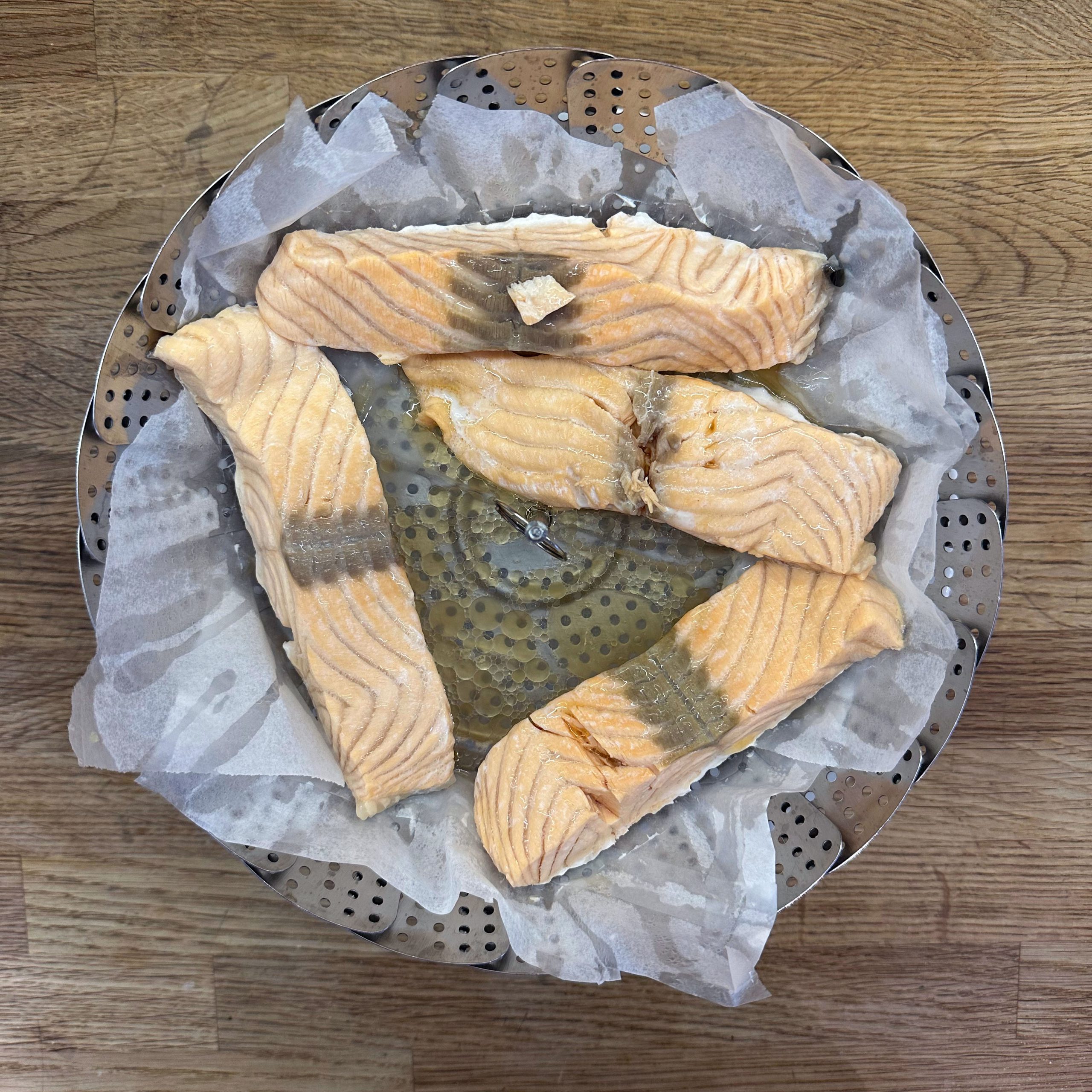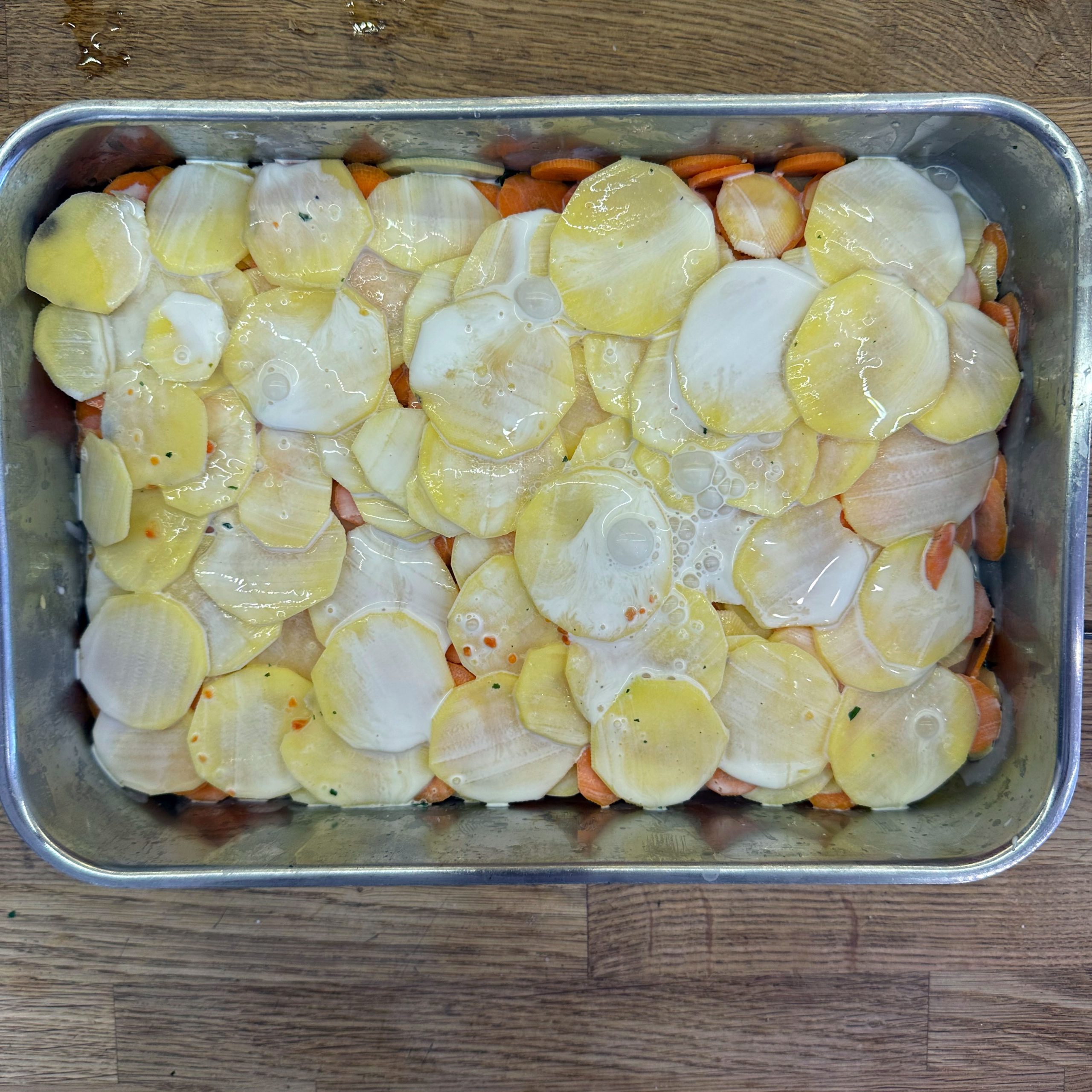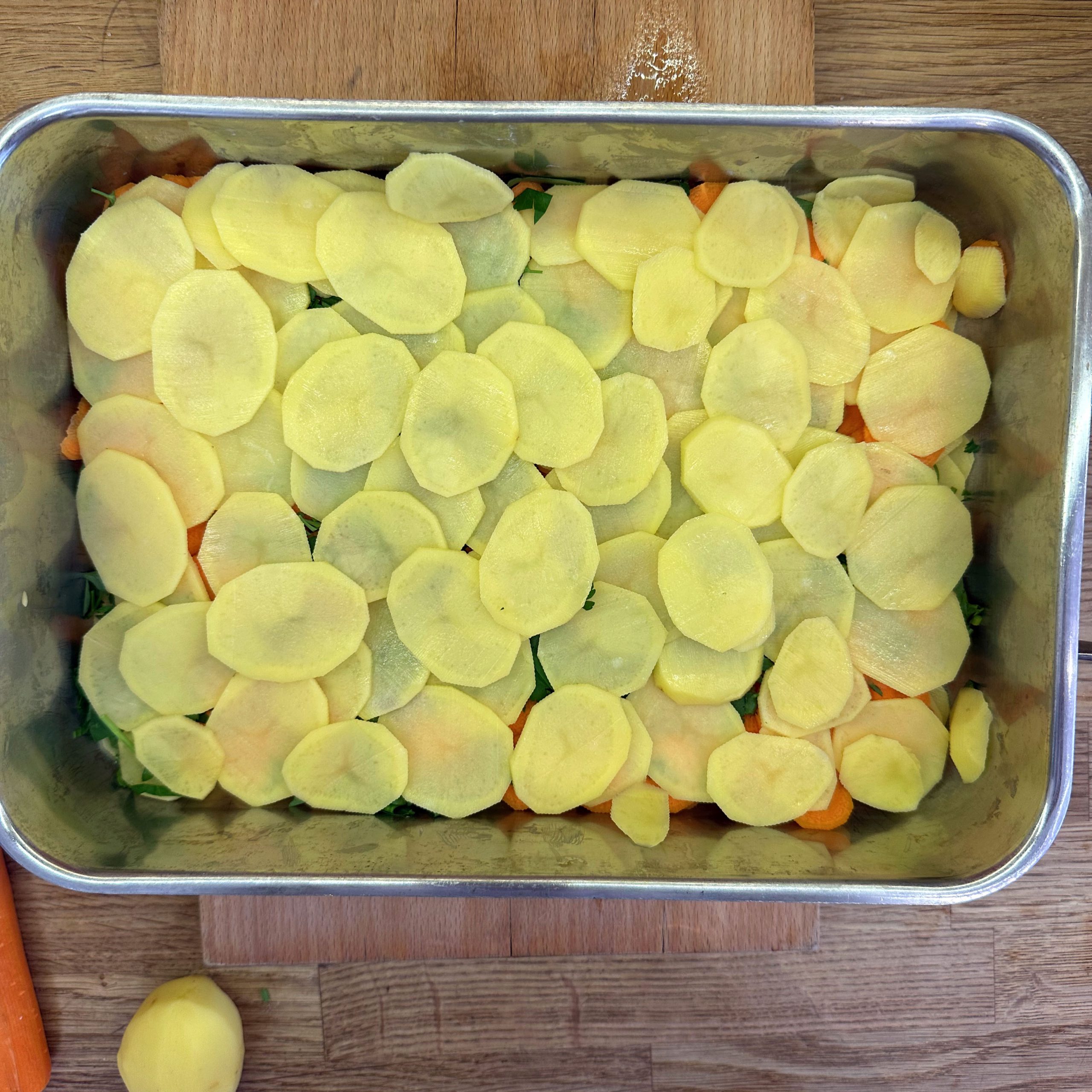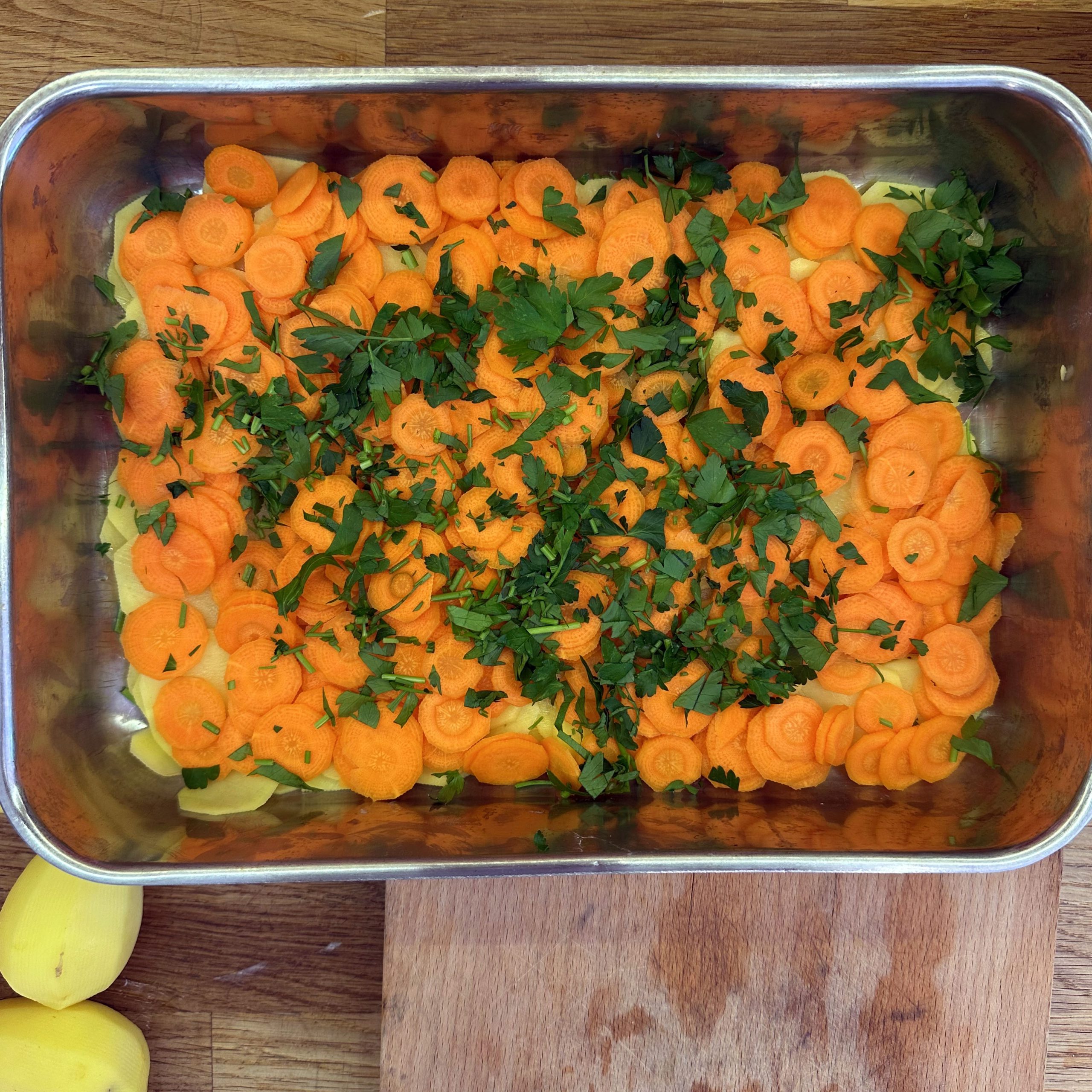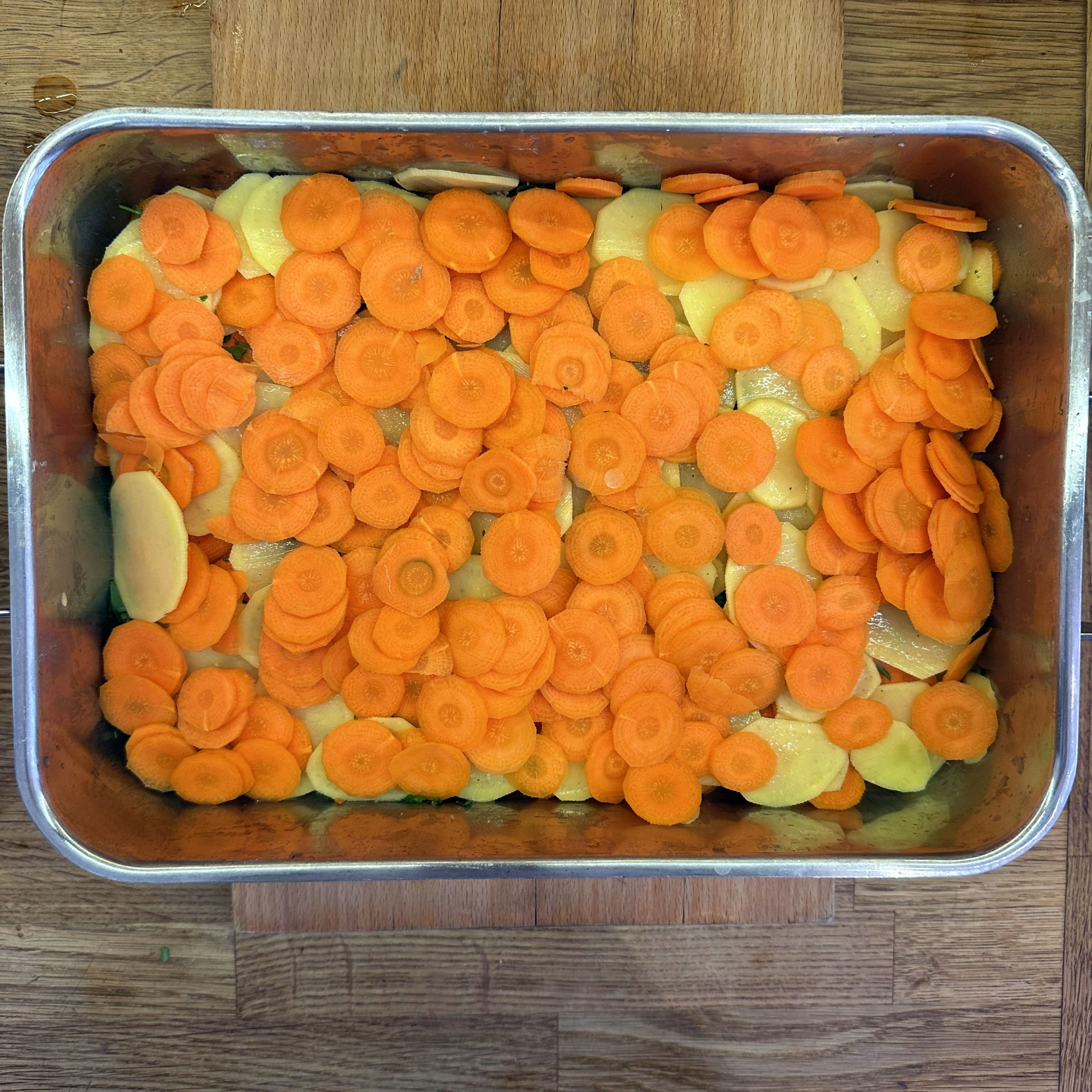 800 g Kartoffeln und 400 g Möhren mit der Mandoline in dünne Scheiben hobeln. 100 ml Brühe mit 200 ml Mandelsahne verrühren und mit Salz und Pfeffer würzen. Eine gefettete Auflaufform vorbereiten und Kartoffel- und Möhrenscheiben abwechselnd in Fischschuppenform einschichten, dazwischen eine Schicht gehackte Petersilie verteilen und alles immer wieder mit der Brühe-Mandelsahne-Mischung übergießen. Form abdecken und bei 180 °C Umluft 1 h backen, dann den Deckel abnehmen und weitere 15 min offen backen. Für den Dip Quark mit Joghurt, gehacktem Koriander, Salz, Pfeffer und dem Saft von 0,5 Zitrone verrühren. 4 Lachsfilets salzen und pfeffern, in einen Dampfeinsatz legen und über leicht kochendem Wasser 13 min dämpfen. Gedämpften Lachs mit dem Kartoffel-Karotten-Gratin und dem Quark-Koriander-Dip auf Tellern anrichten.