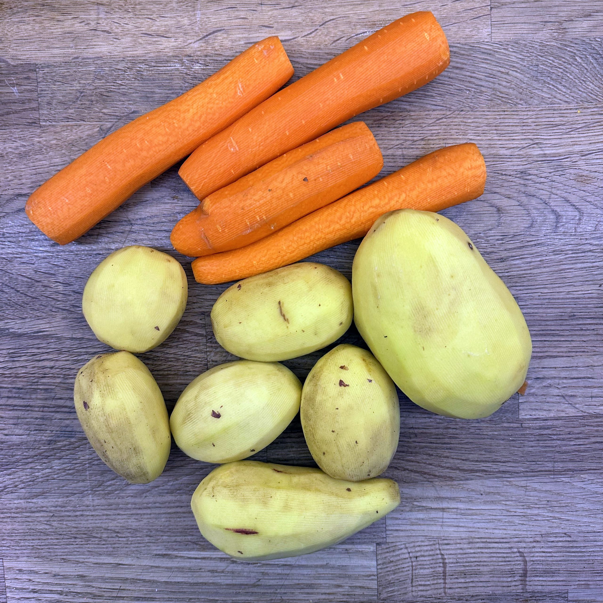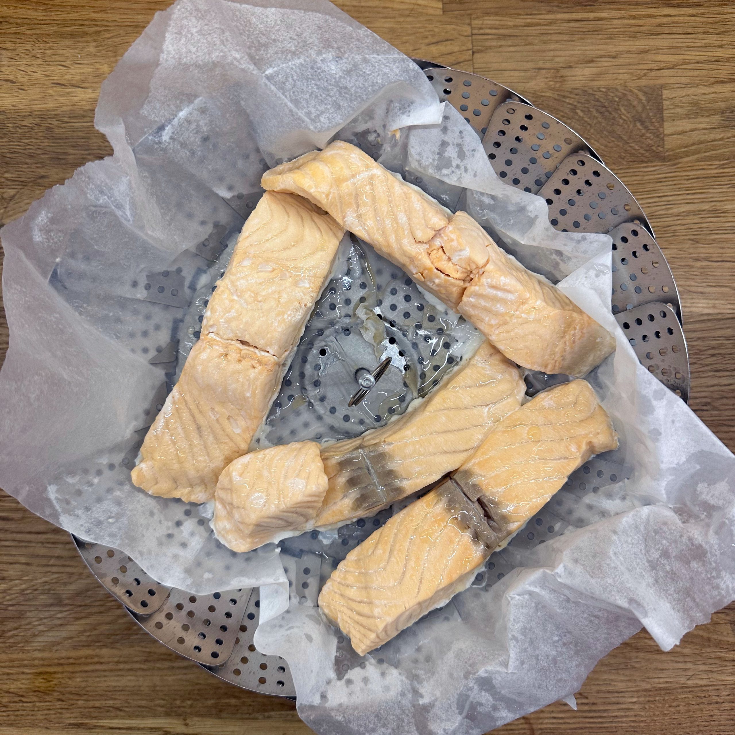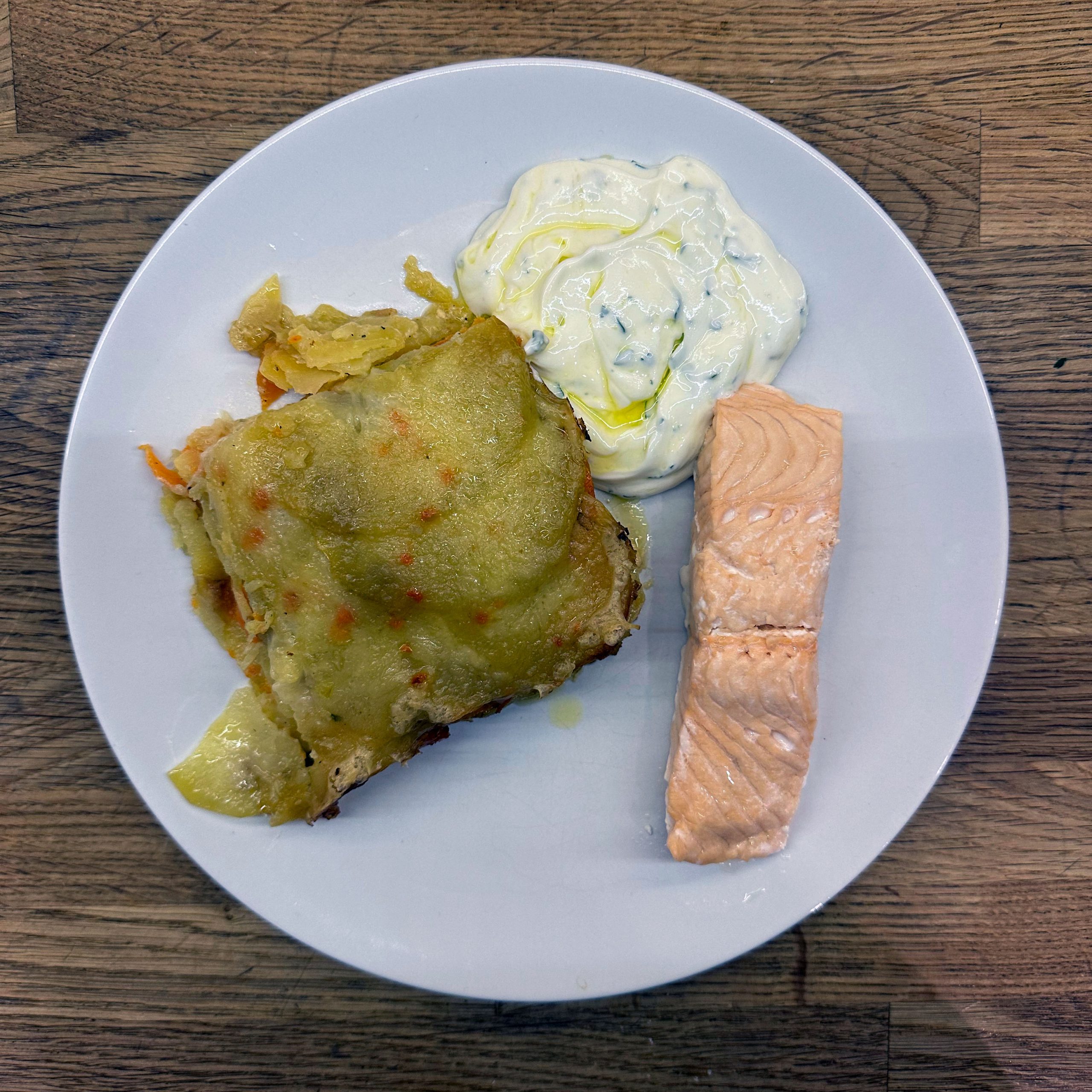 800 g festkochende Kartoffeln und 400 g Möhren mit der Mandoline in dünne Scheiben hobeln. Eine gefettete Auflaufform vorbereiten und Kartoffel- und Möhrenscheiben abwechselnd in Fischschuppenform darin auslegen. 100 ml Brühe mit 200 ml Sahne verrühren, mit Salz und Pfeffer abschmecken und gleichmäßig über die Gemüseschichten gießen. Die Form abdecken und bei 180° Umluft 1 Stunde backen, dann den Deckel abnehmen, mit geriebenem Bergkäse bestreuen und weitere 15 Minuten offen backen, bis der Käse goldbraun ist. 4 Lachsfilets salzen und pfeffern, in einen Dämpfeinsatz oder auf ein gelochtes Einsatzblech legen und über leicht kochendem Wasser 8–12 Minuten dämpfen, je nach Dicke, bis der Lachs gerade eben durch ist. Für den Dip Quark und Joghurt zu gleichen Teilen mischen, gehackte Petersilie, Salz und Zitronensaft einrühren und abschmecken. Gedünsteten Lachs mit Kartoffel-Möhren-Gratin und dem Petersilien-Quark-Joghurt-Dip auf Tellern anrichten.