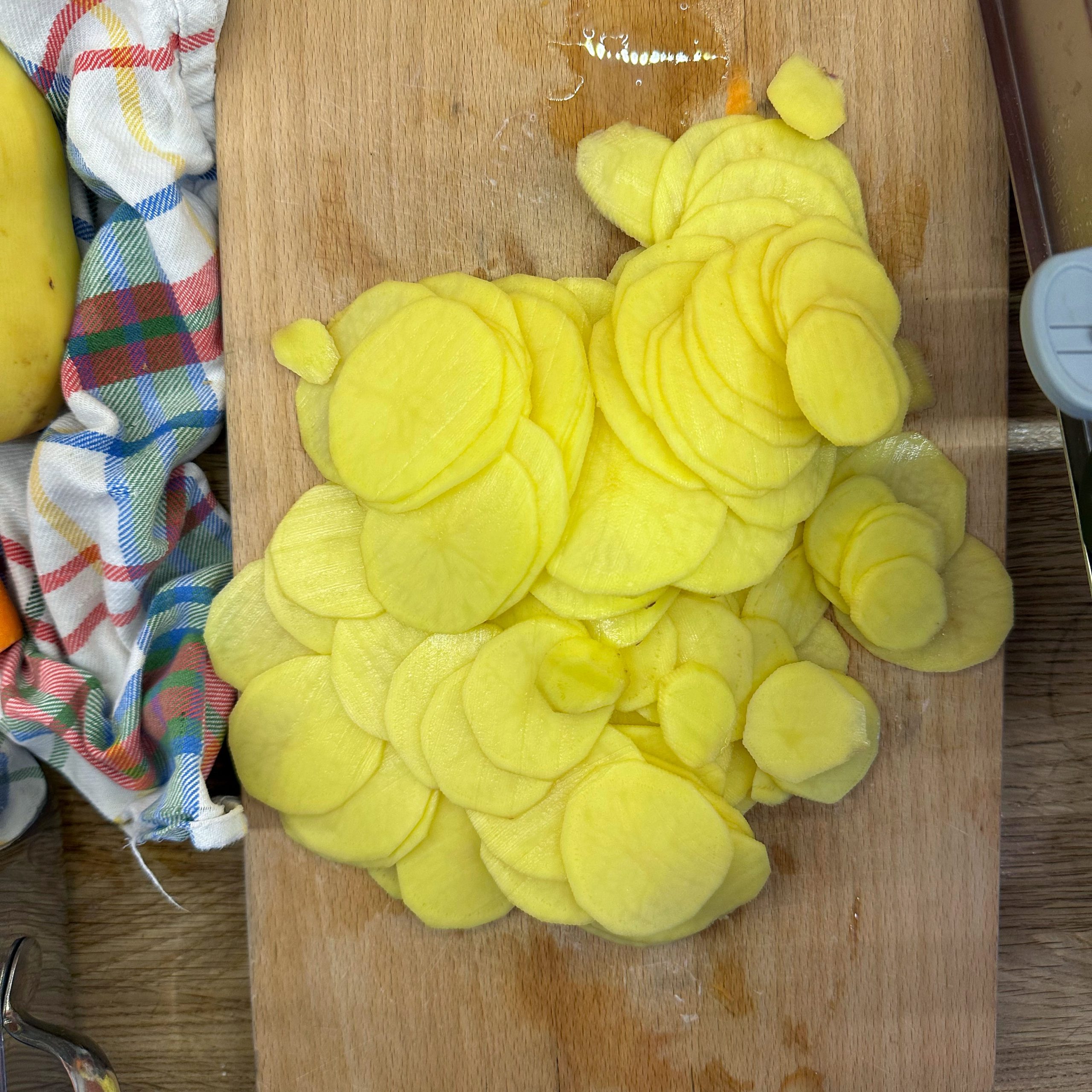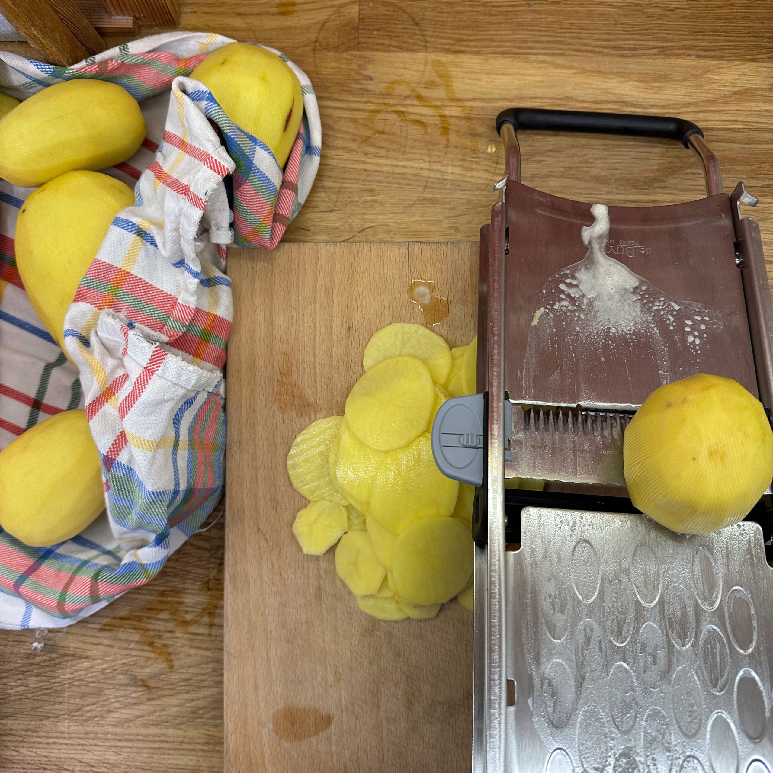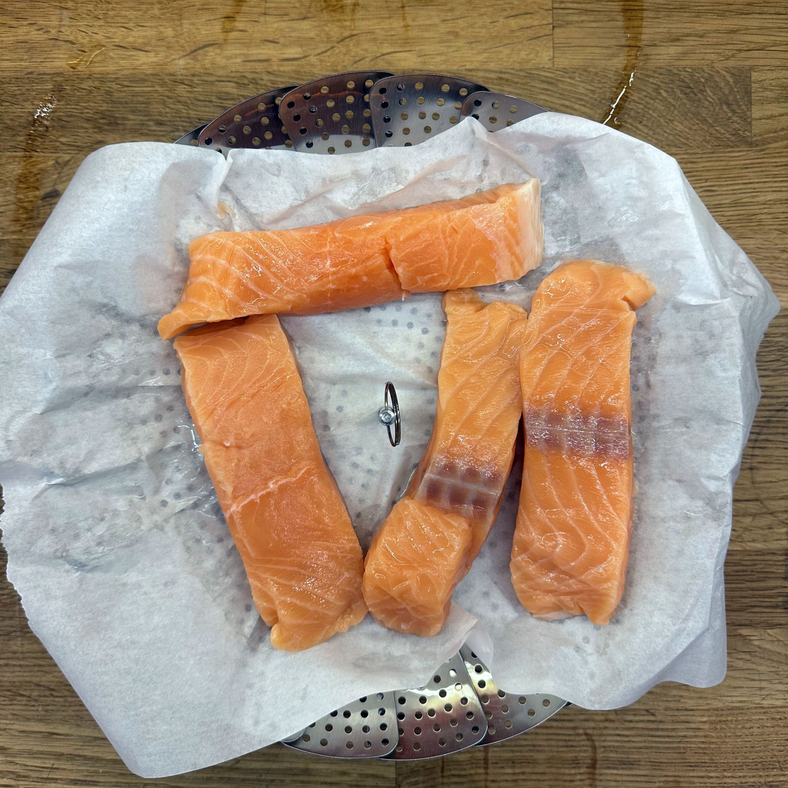 800 g festkochende Kartoffeln und 400 g Möhren mit der Mandoline in dünne Scheiben hobeln. Eine gefettete Auflaufform vorbereiten und Kartoffel- und Möhrenscheiben abwechselnd in Fischschuppenform darin auslegen. 100 ml Brühe mit 200 ml Sahne verrühren, mit Salz und Pfeffer abschmecken und gleichmäßig über die Gemüseschichten gießen. Die Form abdecken und bei 180° Umluft 1 Stunde backen, dann den Deckel abnehmen, mit geriebenem Bergkäse bestreuen und weitere 15 Minuten offen backen, bis der Käse goldbraun ist. 4 Lachsfilets salzen und pfeffern, in einen Dämpfeinsatz oder auf ein gelochtes Einsatzblech legen und über leicht kochendem Wasser 8–12 Minuten dämpfen, je nach Dicke, bis der Lachs gerade eben durch ist. Für den Dip Quark und Joghurt zu gleichen Teilen mischen, gehackte Petersilie, Salz und Zitronensaft einrühren und abschmecken. Gedünsteten Lachs mit Kartoffel-Möhren-Gratin und dem Petersilien-Quark-Joghurt-Dip auf Tellern anrichten.