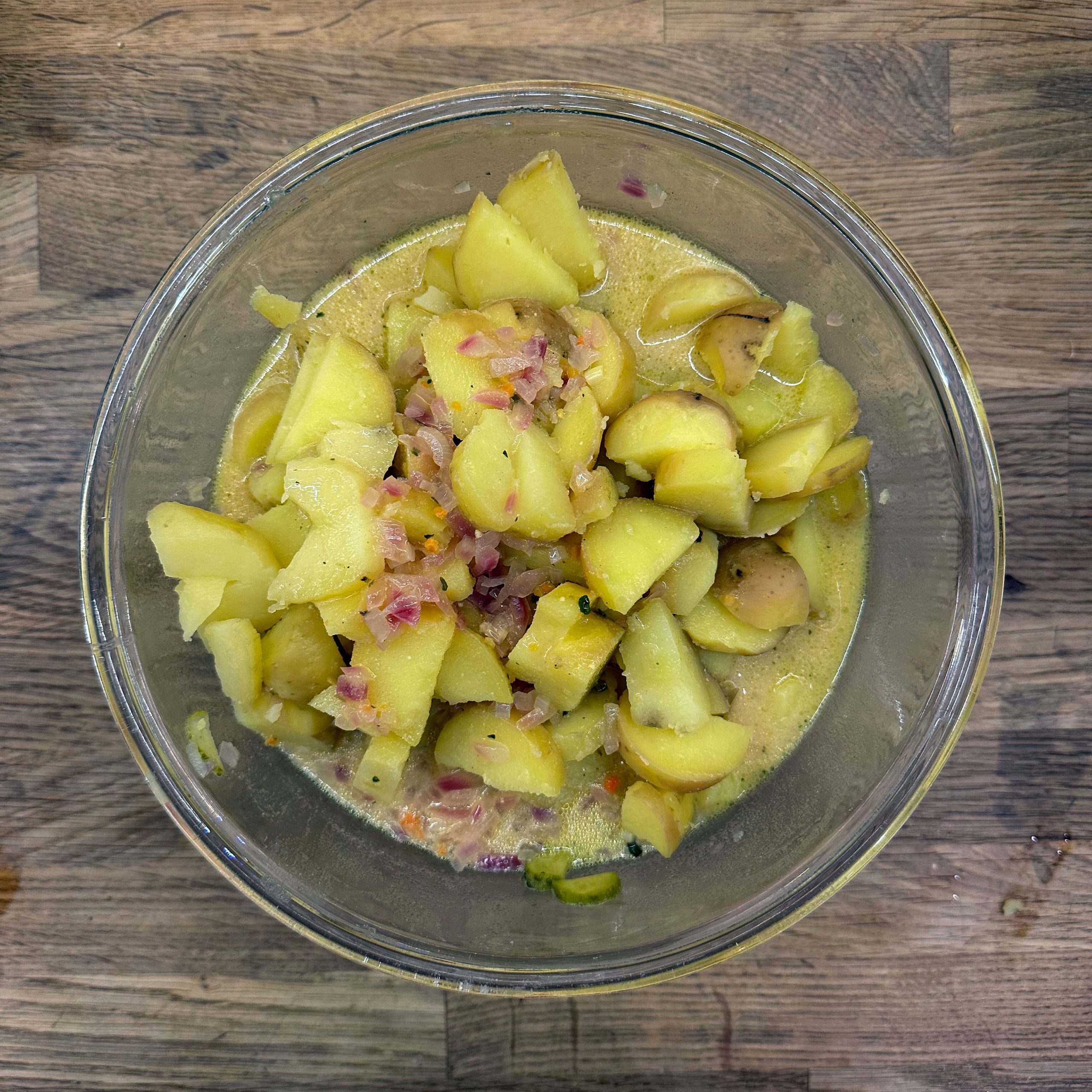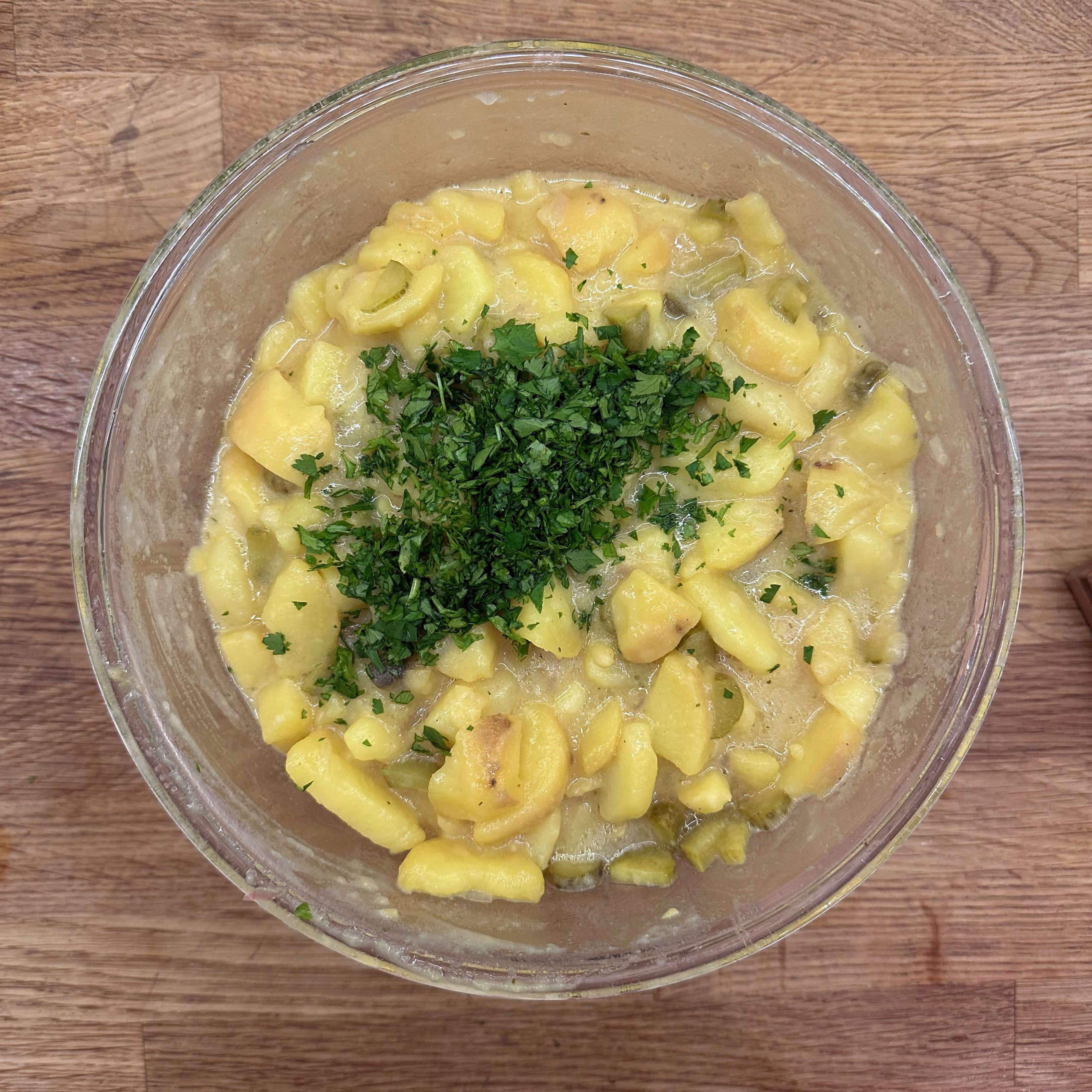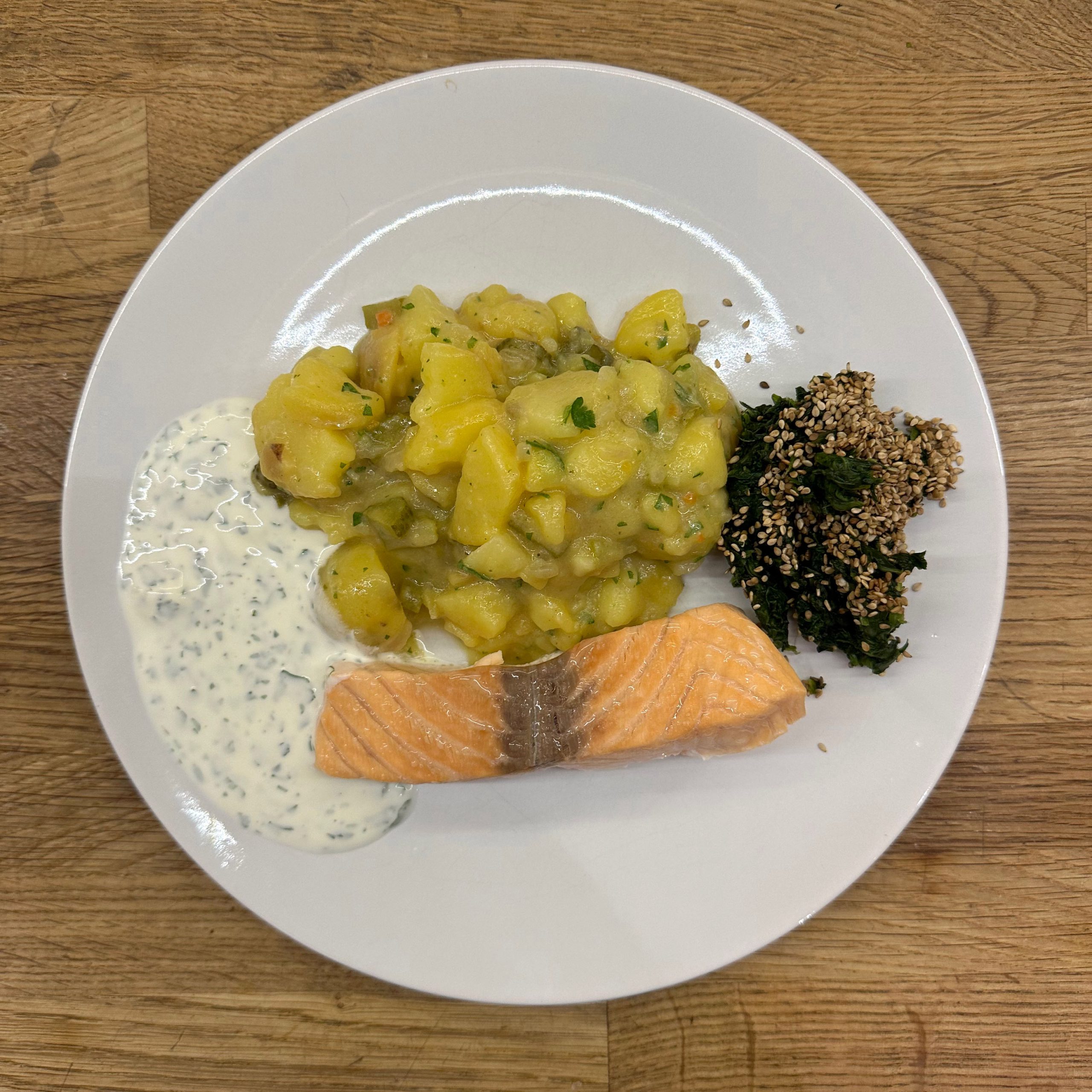 1 kg Kartoffeln in Salzwasser weich kochen, abgießen, kurz ausdampfen lassen, pellen und in Scheiben schneiden. 1 gewürfelte Zwiebel in etwas Öl anbraten, mit 250 ml Brühe ablöschen und kurz köcheln lassen, dann 1 EL Senf, 4 EL Essig, 1 TL Salz und 1 TL Zucker unterrühren. 10 saure Gürkchen in Stücke schneiden, zu den Kartoffeln geben, alles mit dem warmen Dressing übergießen und mindestens 2 h ziehen lassen, dann 4 EL Öl und 1 Bund gehackte Petersilie unterrühren. TK-Spinat aufkochen, gut ausdrücken, in eine Schale geben, mit geröstetem Sesam bedecken und 1 EL Walnussöl darübergeben. Für den Dip Joghurt, Mayonnaise, gehackten Koriander, Salz und Zitronensaft verrühren. Lachsfilets salzen, in einen Dampfeinsatz legen und 13 min über leicht kochendem Wasser dämpfen, dann mit Kartoffelsalat, Spinat und Dip servieren.