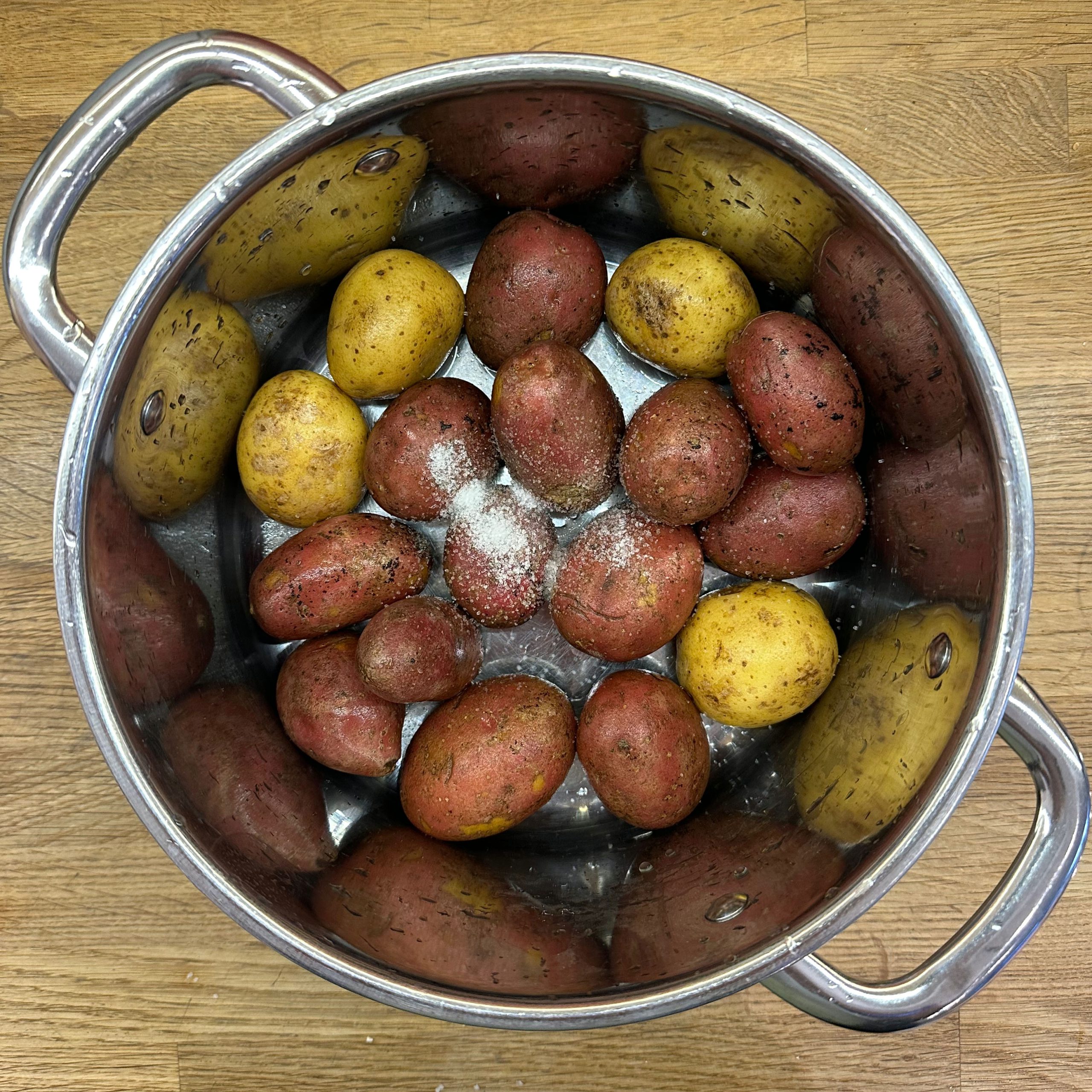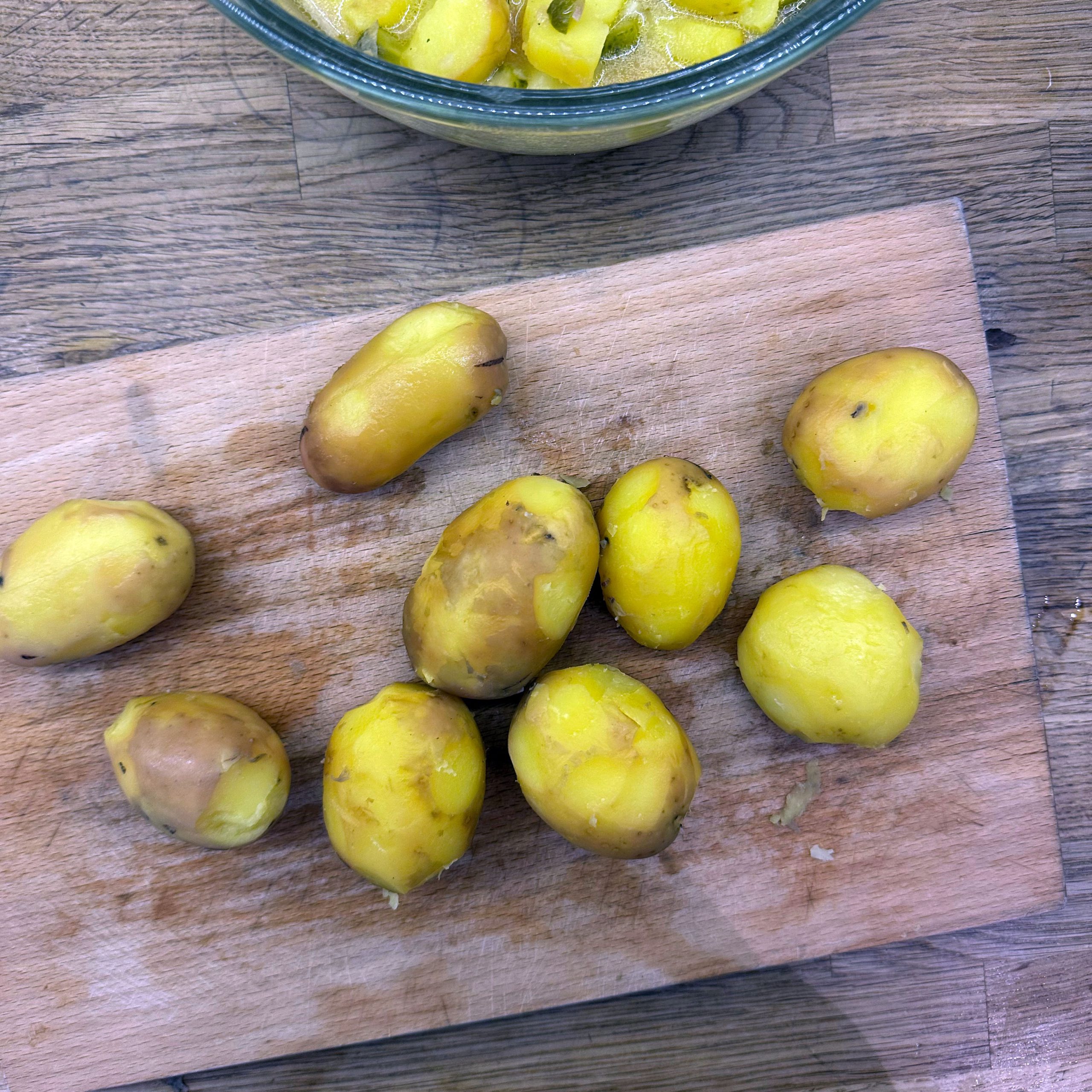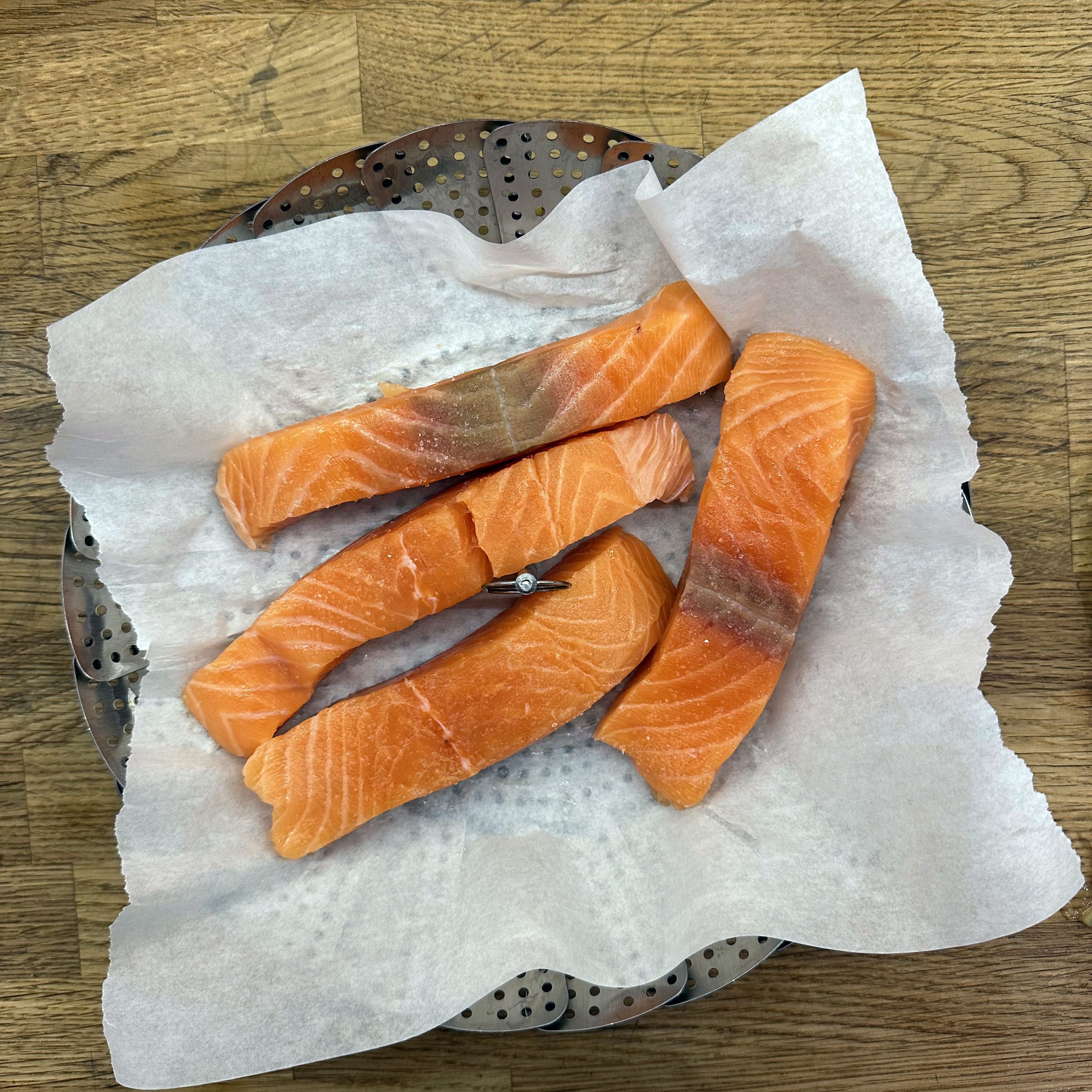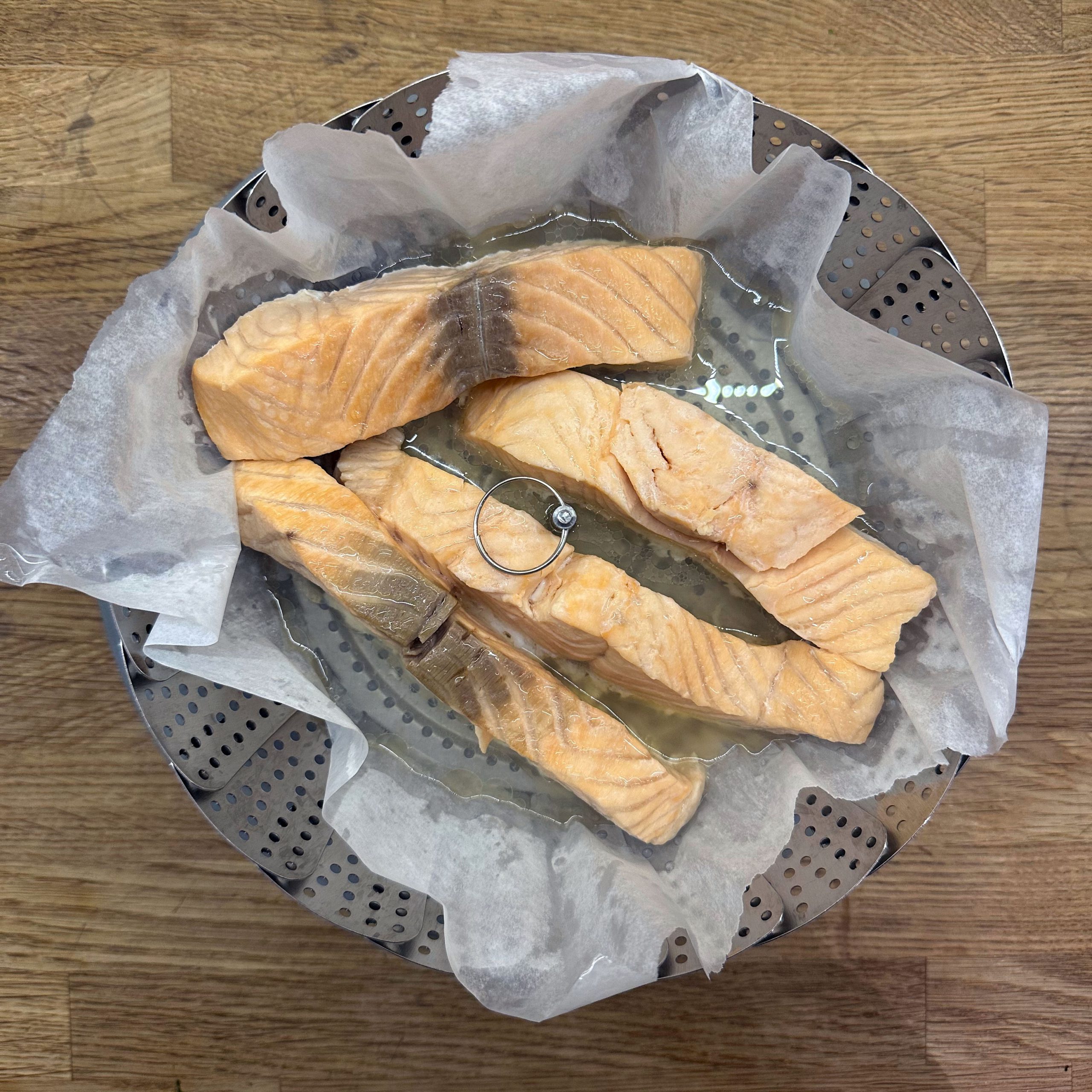1 kg Kartoffeln in Salzwasser weich kochen, abgießen, kurz ausdampfen lassen, pellen und in Scheiben schneiden. 1 gewürfelte Zwiebel in etwas Öl anbraten, mit 250 ml Brühe ablöschen und kurz köcheln lassen, dann 1 EL Senf, 4 EL Essig, 1 TL Salz und 1 TL Zucker unterrühren. 10 saure Gürkchen in Stücke schneiden, zu den Kartoffeln geben, alles mit dem warmen Dressing übergießen und mindestens 2 h ziehen lassen, dann 4 EL Öl und 1 Bund gehackte Petersilie unterrühren. TK-Spinat aufkochen, gut ausdrücken, in eine Schale geben, mit geröstetem Sesam bedecken und 1 EL Walnussöl darübergeben. Für den Dip Joghurt, Mayonnaise, gehackten Koriander, Salz und Zitronensaft verrühren. Lachsfilets salzen, in einen Dampfeinsatz legen und 13 min über leicht kochendem Wasser dämpfen, dann mit Kartoffelsalat, Spinat und Dip servieren.