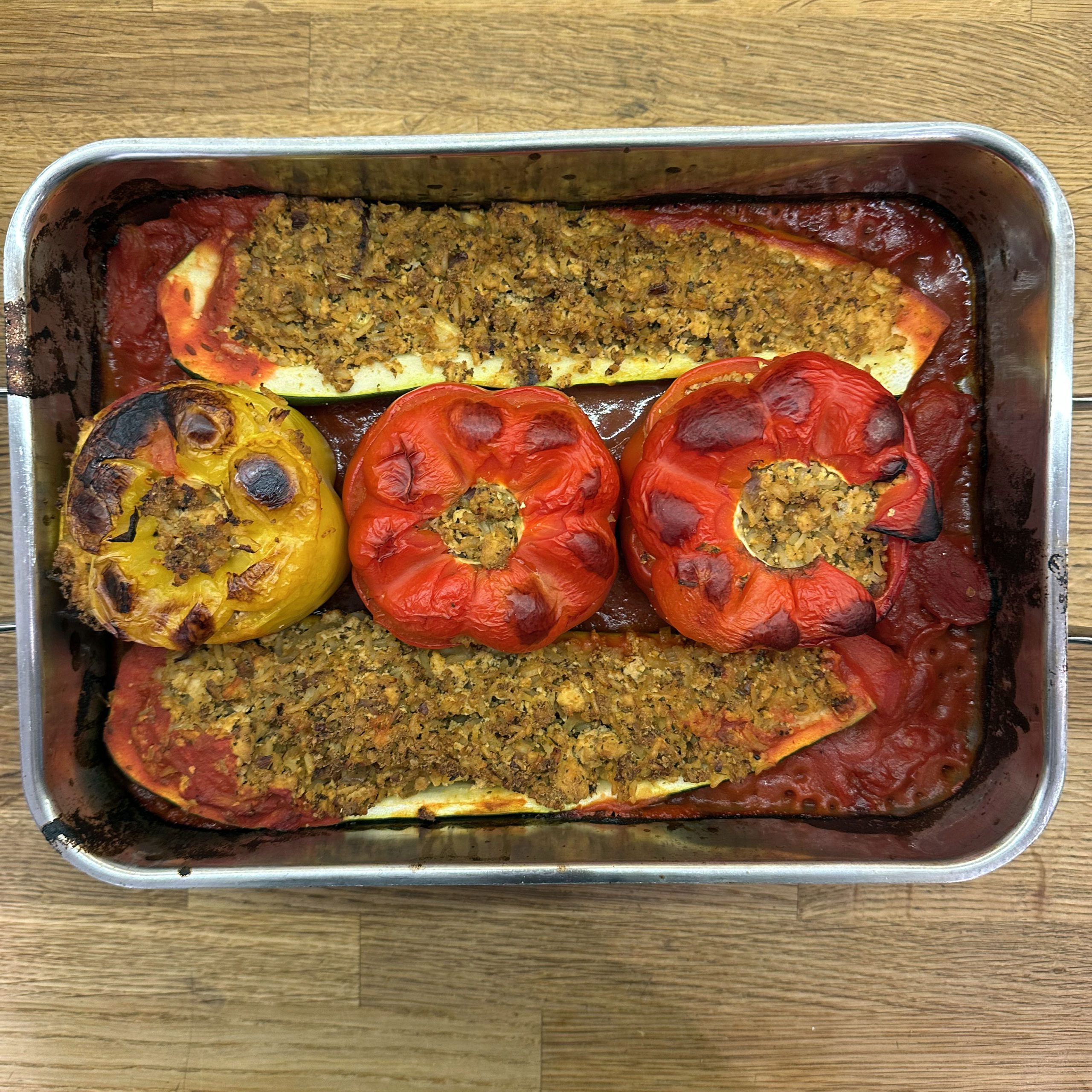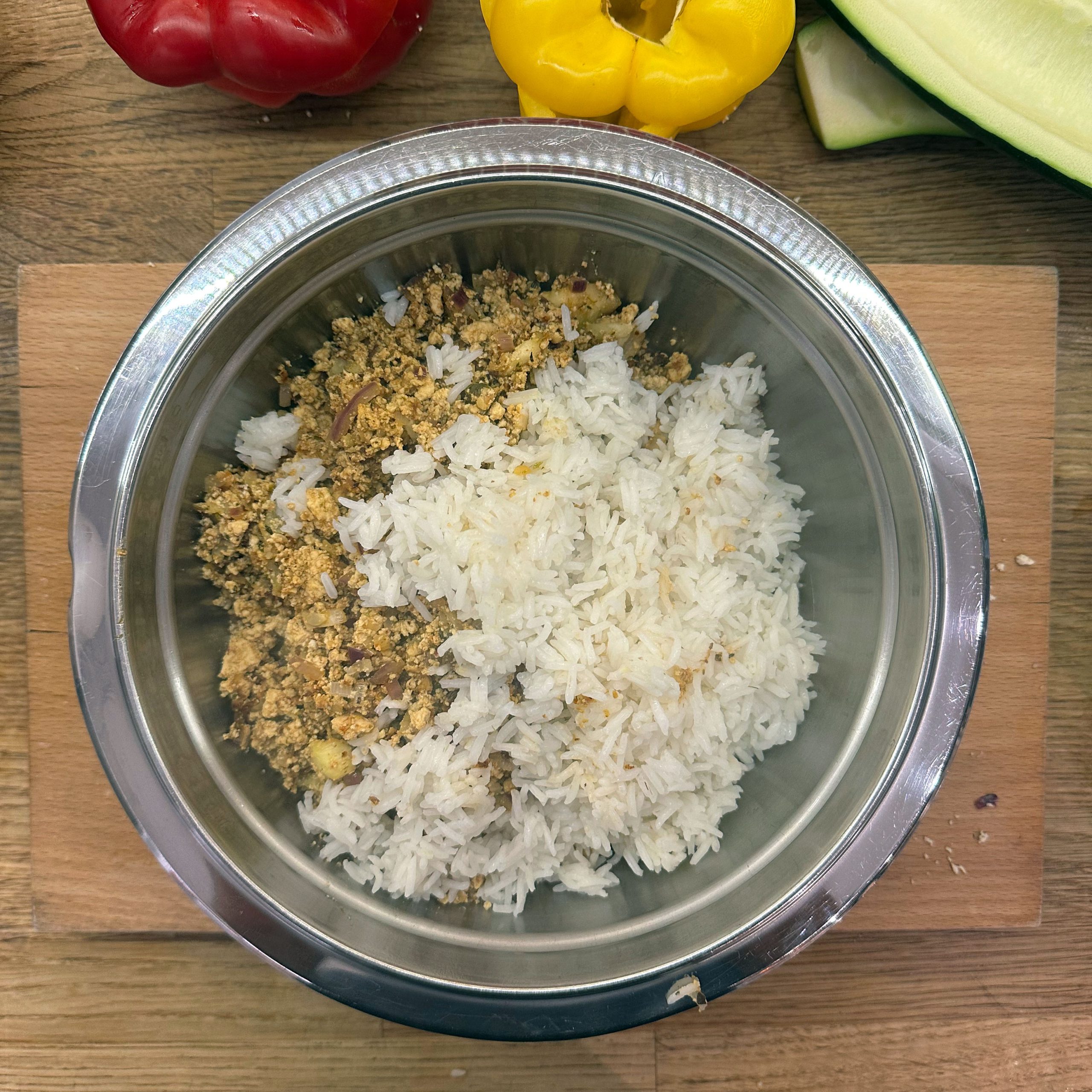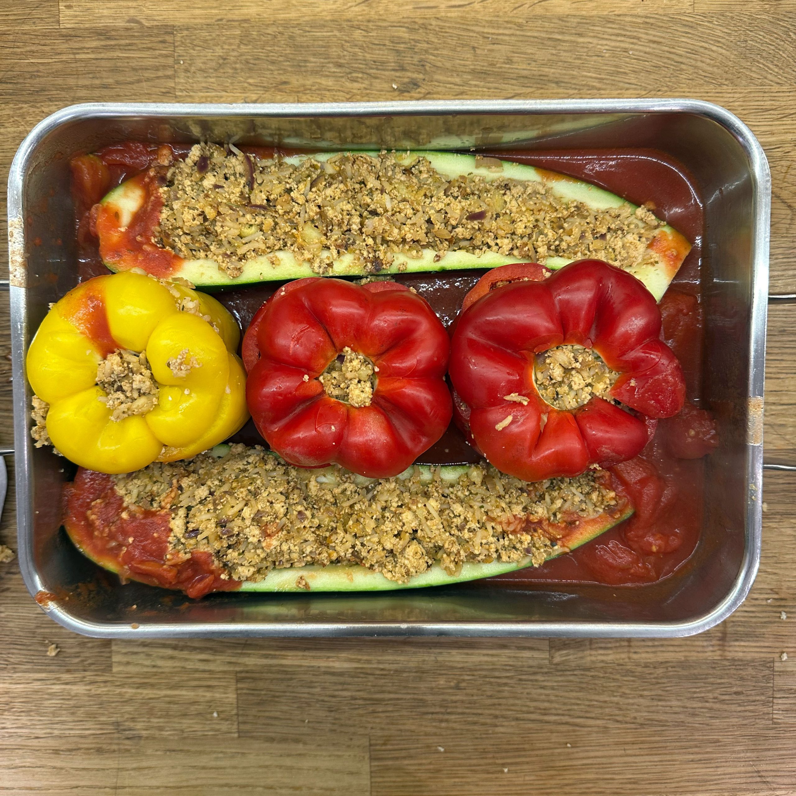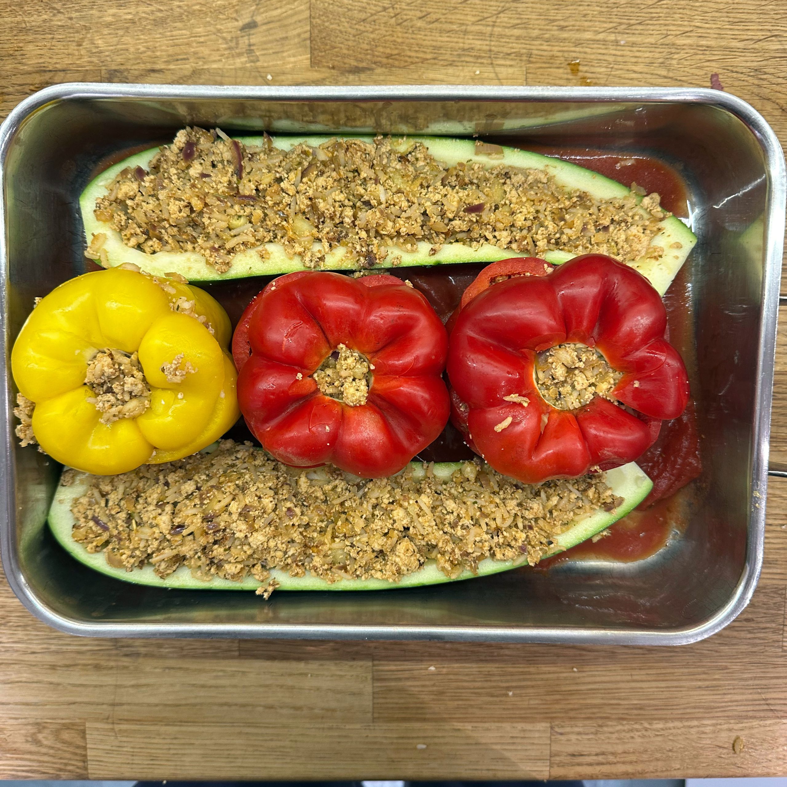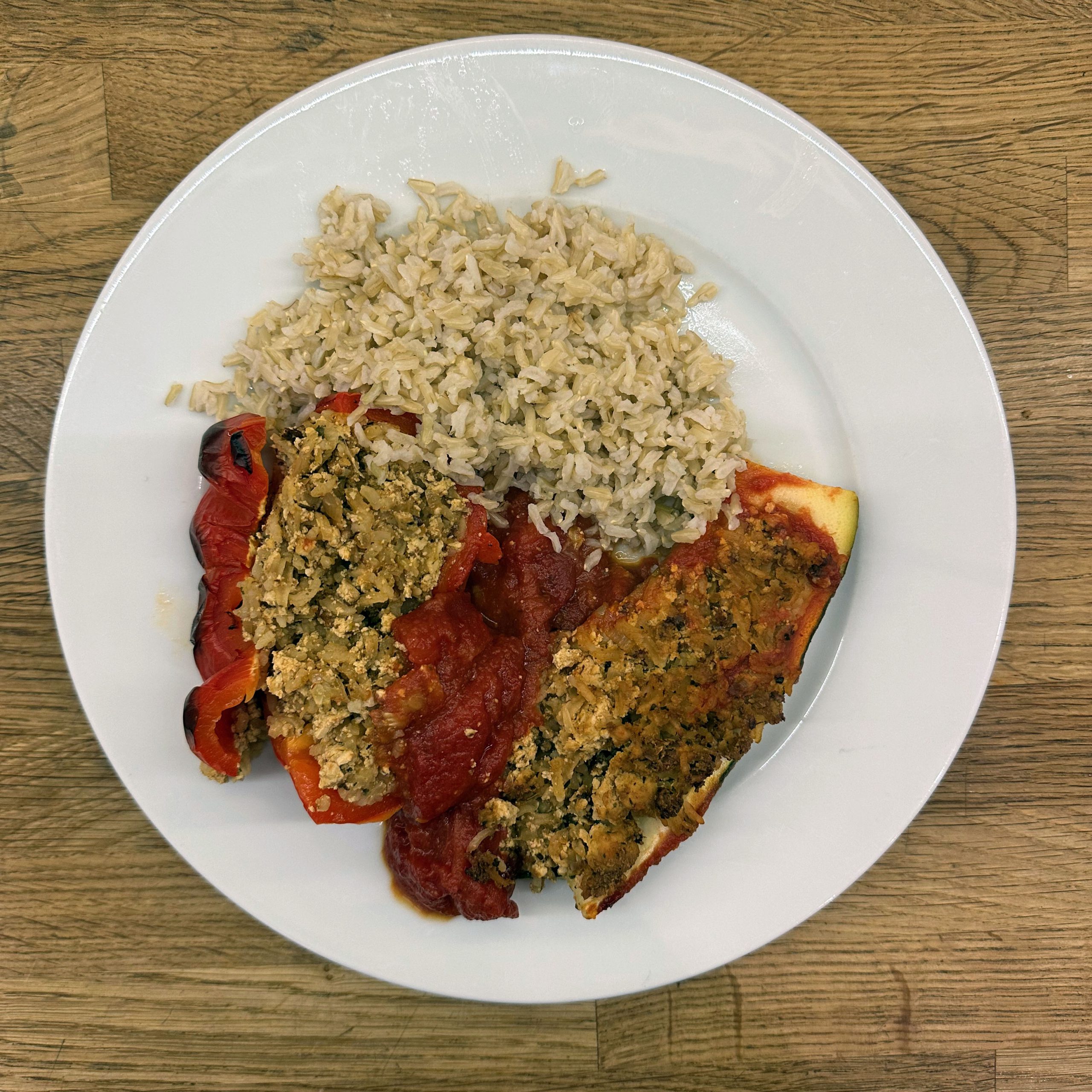 3 Paprikaschoten waschen, die Deckel abschneiden und das Kerngehäuse entfernen. 1 große Zucchini längs halbieren, das Fruchtfleisch mit einem Löffel aushöhlen und beiseite stellen. Für die Füllung 400g Tofu zerkrümeln und in einer Pfanne mit 2 EL Olivenöl scharf anbraten, 1 gewürfelte Zwiebel hinzufügen und glasig dünsten, das gehackte Zucchinifruchtfleisch, 2 EL Tomatenmark, 100g gekochten Basmatireis, 1 TL Oregano, 1 TL Paprikapulver, Salz und Pfeffer unterrühren und etwa 5 Minuten köcheln lassen. Für die Tomatensoße 2 EL Tomatenmark, 300ml Wasser, 3 EL Olivenöl, 1 TL Kreuzkümmel, 1 TL Zucker und 400g gehackte Tomaten verrühren und mit Salz würzen. Den Boden einer Auflaufform mit der Tomatensoße ausgießen, die Paprika und Zucchinihälften mit der Tofuhack-Reis-Mischung füllen und aufrecht in die Form stellen. Bei 180°C etwa 35-40 Minuten backen, bis das Gemüse weich ist. Währenddessen 250g Vollkornreis mit der 1,5-fachen Menge Wasser (375ml) aufkochen und bei geringer Hitze 40 Minuten köcheln lassen. Die gefüllten Paprika und Zucchini mit dem Vollkornreis servieren.