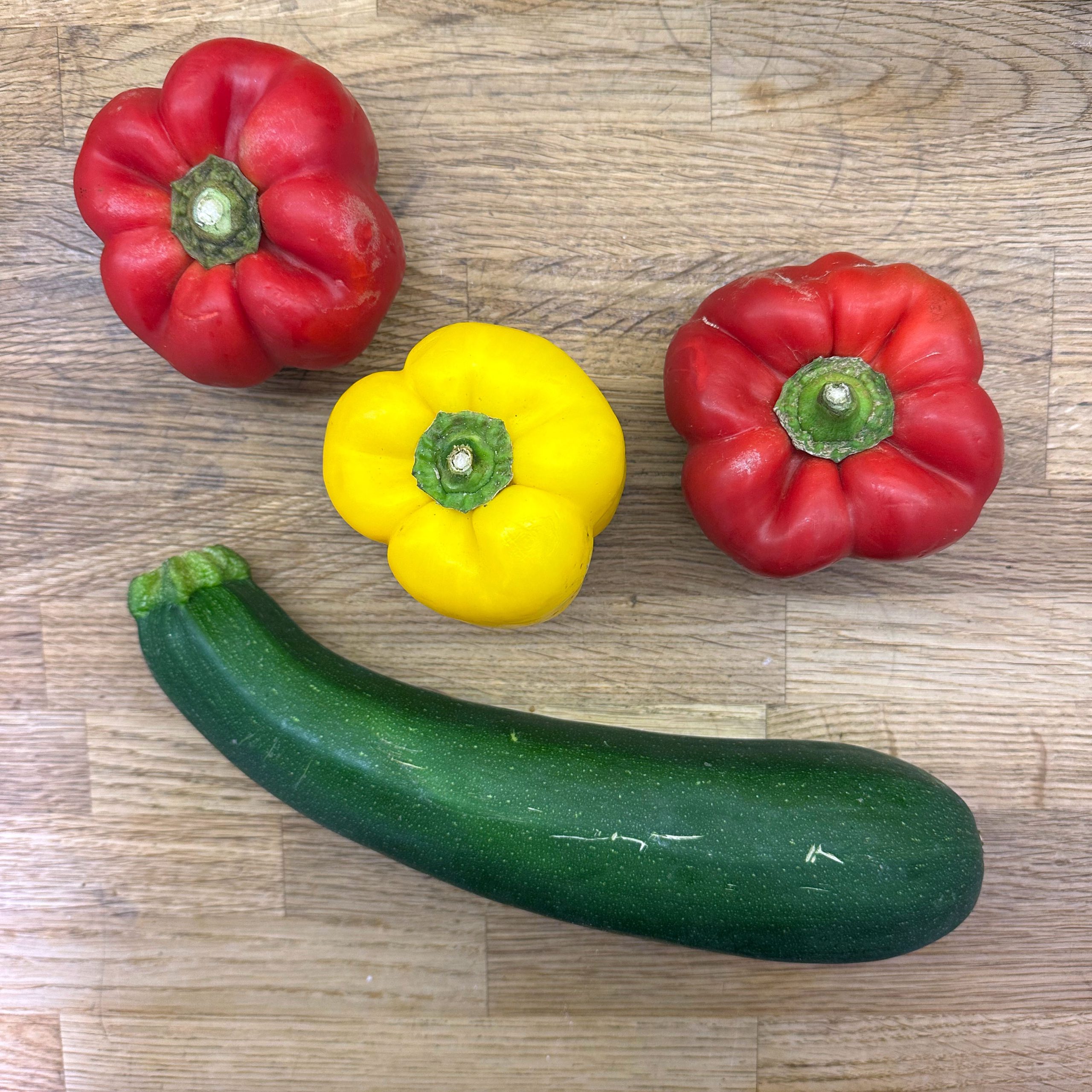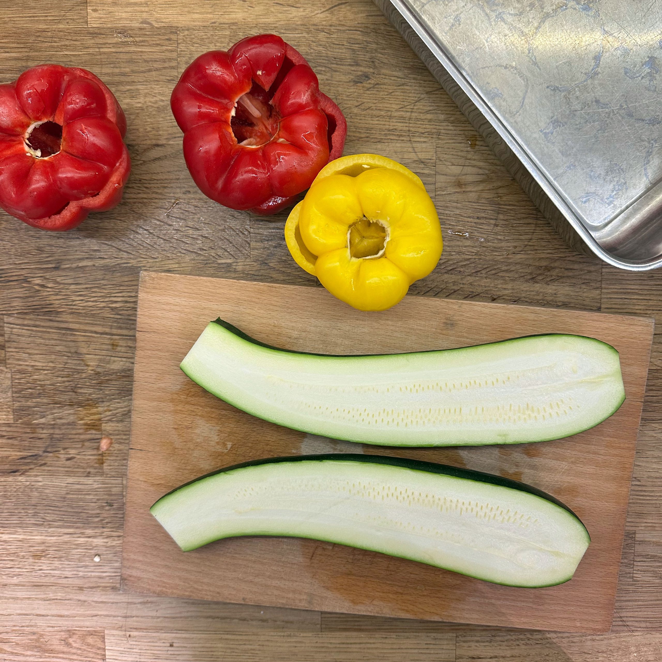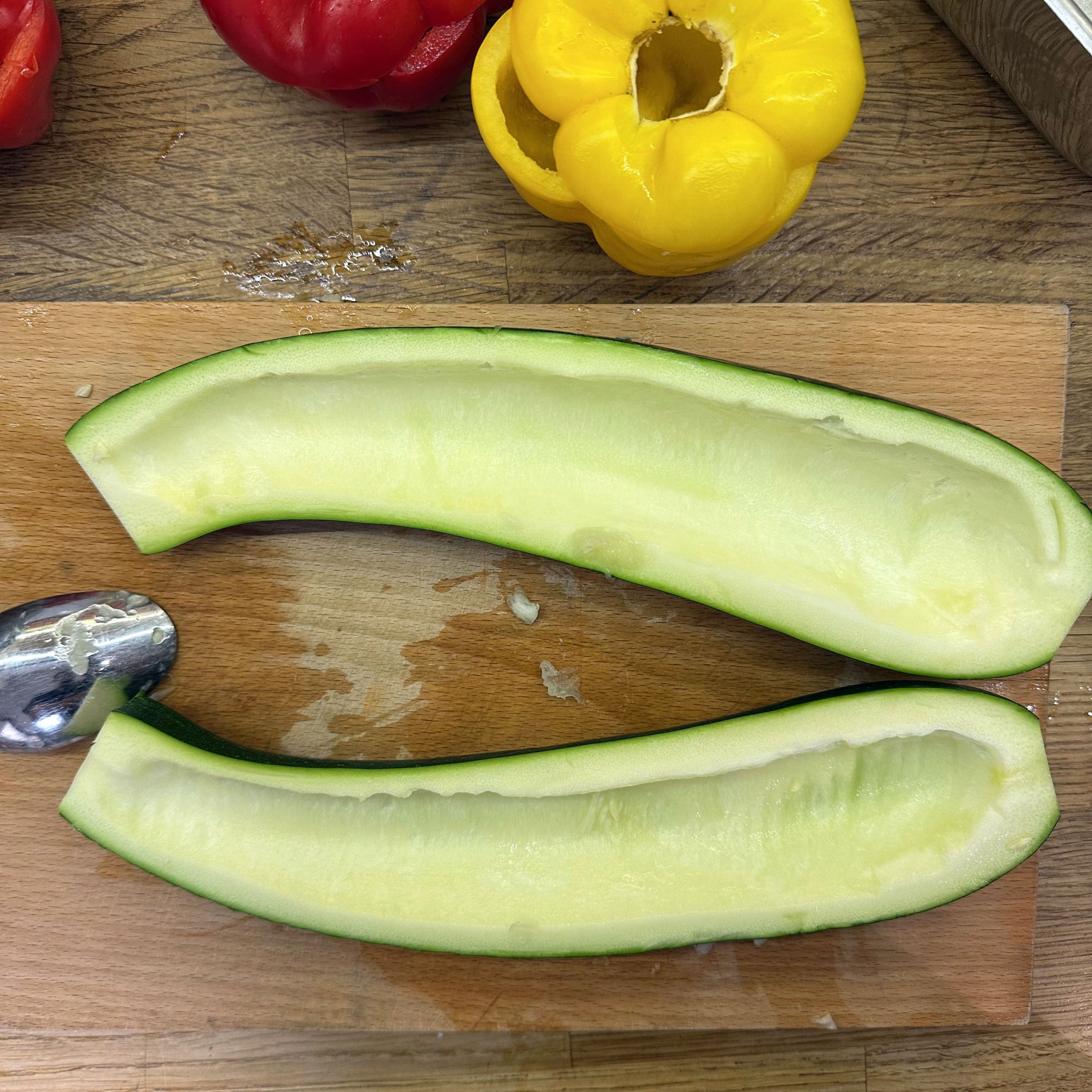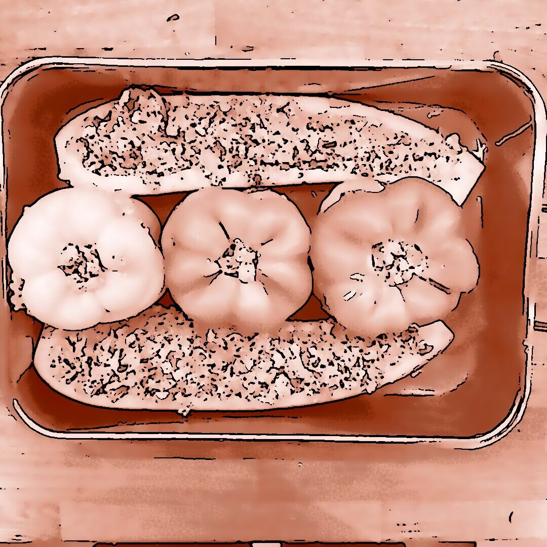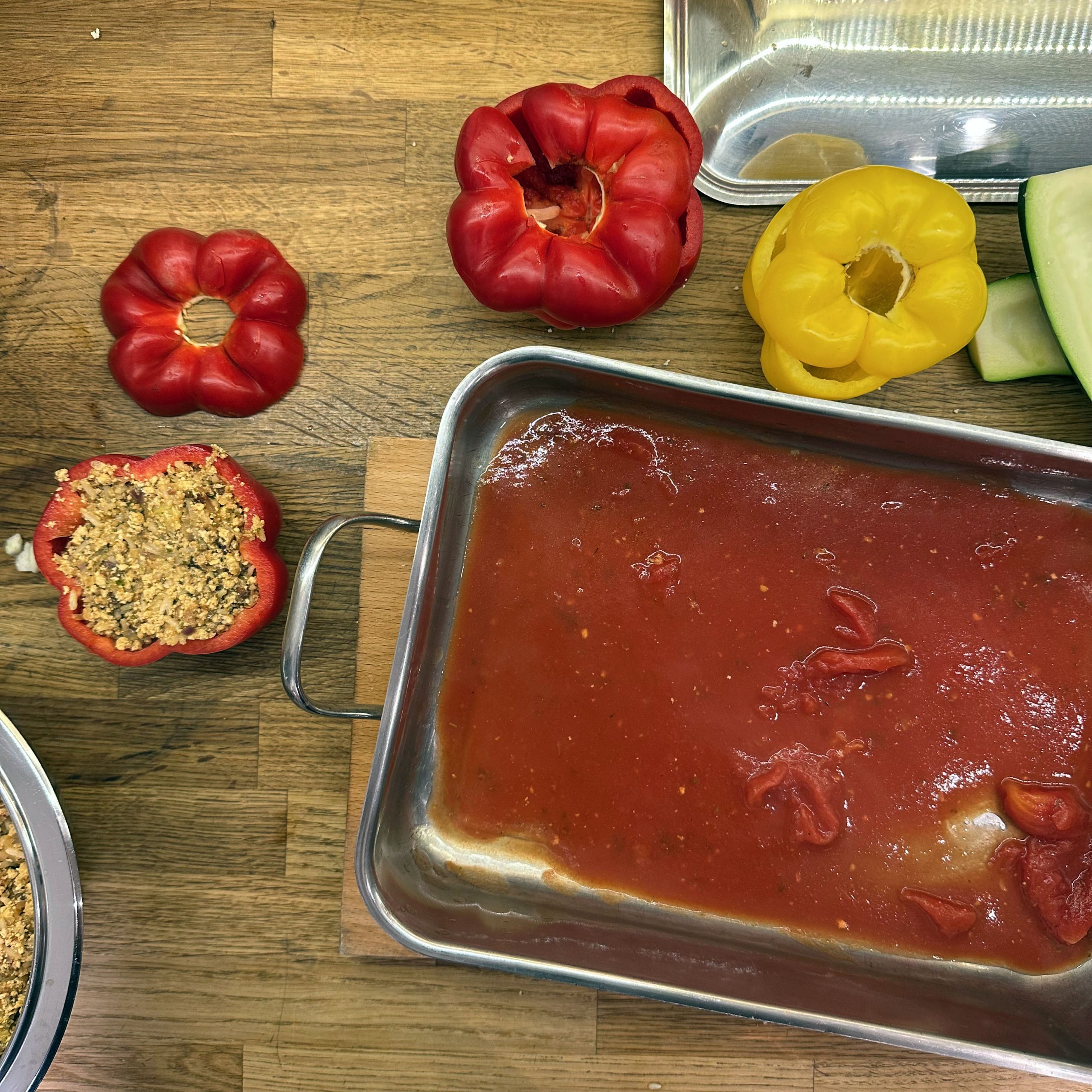 3 Paprikaschoten waschen, die Deckel abschneiden und das Kerngehäuse entfernen. 1 große Zucchini längs halbieren, das Fruchtfleisch mit einem Löffel aushöhlen und beiseite stellen. Für die Füllung 400g Tofu zerkrümeln und in einer Pfanne mit 2 EL Olivenöl scharf anbraten, 1 gewürfelte Zwiebel hinzufügen und glasig dünsten, das gehackte Zucchinifruchtfleisch, 2 EL Tomatenmark, 100g gekochten Basmatireis, 1 TL Oregano, 1 TL Paprikapulver, Salz und Pfeffer unterrühren und etwa 5 Minuten köcheln lassen. Für die Tomatensoße 2 EL Tomatenmark, 300ml Wasser, 3 EL Olivenöl, 1 TL Kreuzkümmel, 1 TL Zucker und 400g gehackte Tomaten verrühren und mit Salz würzen. Den Boden einer Auflaufform mit der Tomatensoße ausgießen, die Paprika und Zucchinihälften mit der Tofuhack-Reis-Mischung füllen und aufrecht in die Form stellen. Bei 180°C etwa 35-40 Minuten backen, bis das Gemüse weich ist. Währenddessen 250g Vollkornreis mit der 1,5-fachen Menge Wasser (375ml) aufkochen und bei geringer Hitze 40 Minuten köcheln lassen. Die gefüllten Paprika und Zucchini mit dem Vollkornreis servieren.