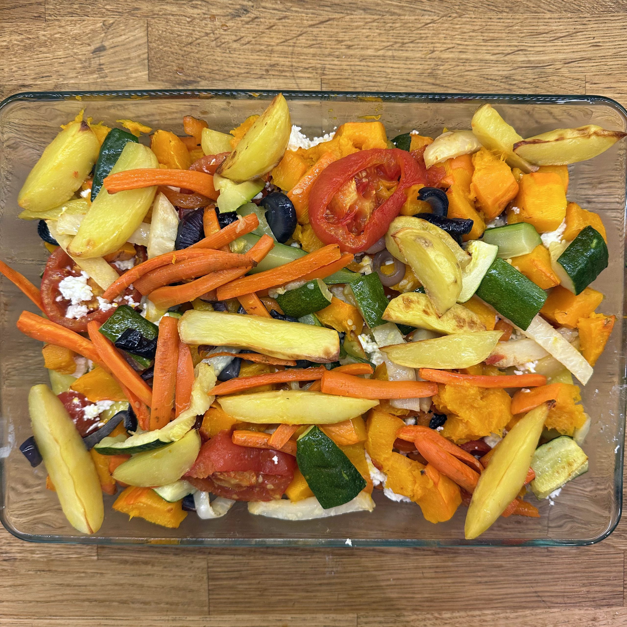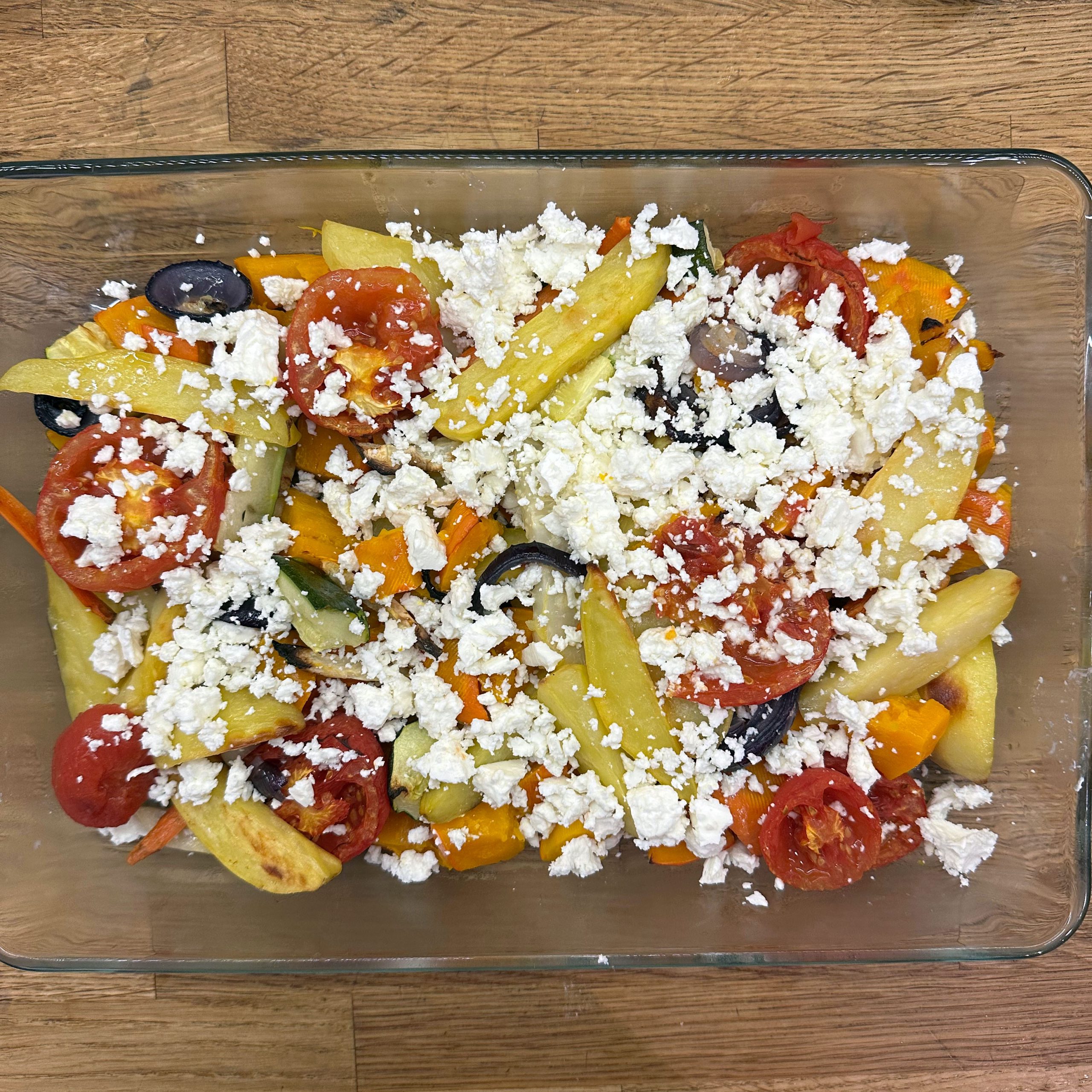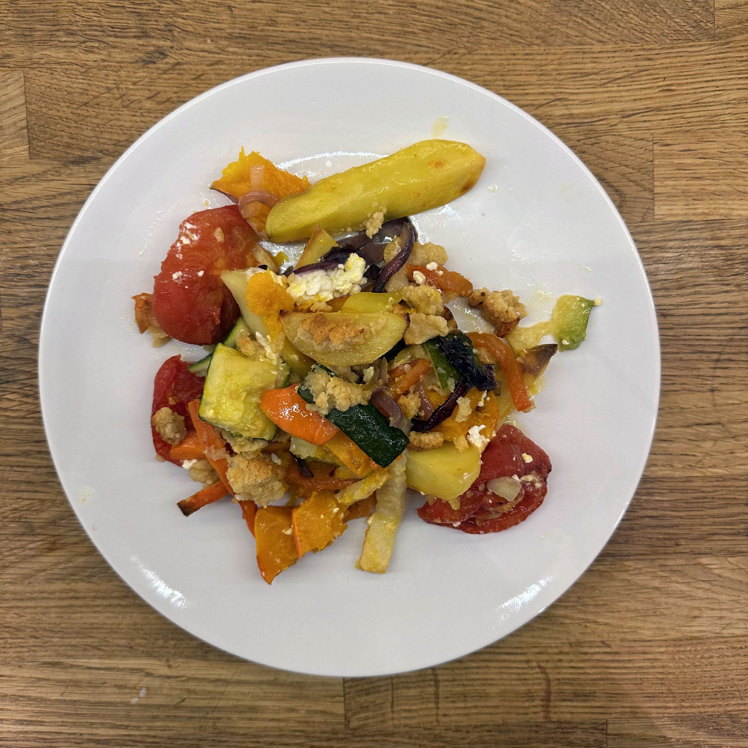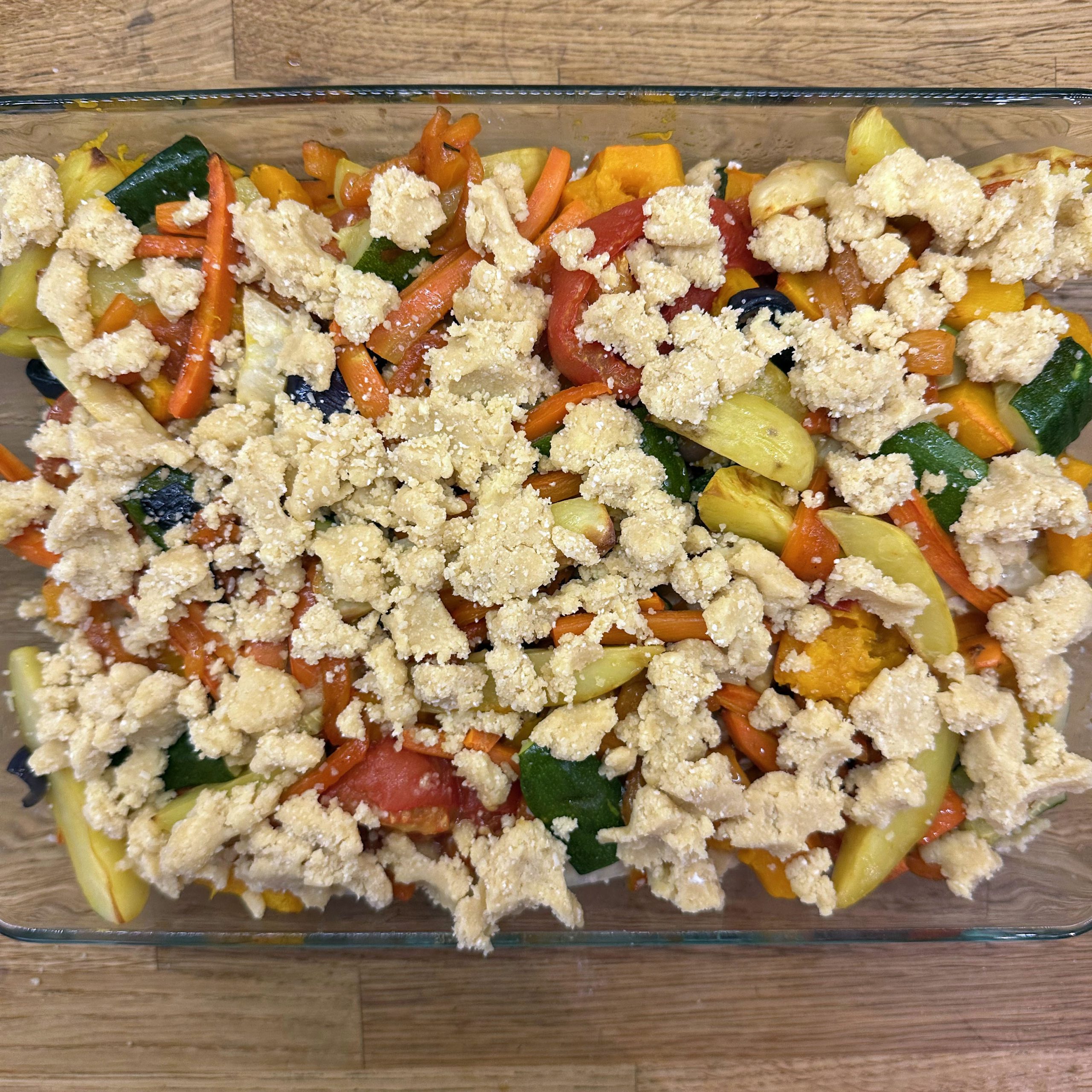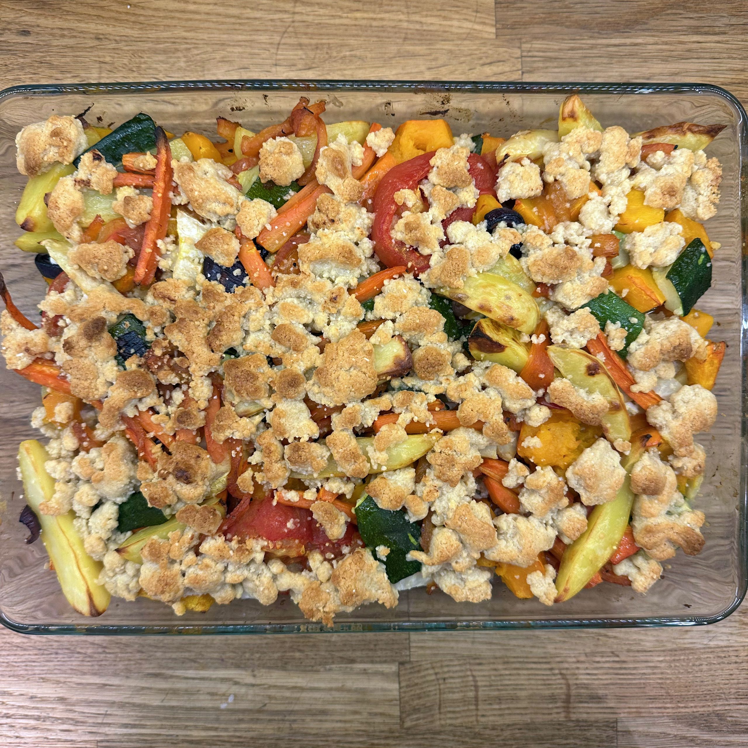 6 Kartoffeln, 5 Möhren, 0,5 Sellerieknolle, 1 Kürbis, 1 Zucchini und 3 Zwiebeln schälen bzw. putzen und in mundgerechte Stücke schneiden, 5 Tomaten mit kochendem Wasser übergießen, häuten und grob schneiden, alles mit etwas Öl, Salz und Pfeffer mischen und auf 3 Bleche verteilen. Bei 210° Umluft garen und dabei die Blechpositionen zwischendurch wechseln, bis das Gemüse weich und gut gebräunt ist. 1 Paprika halbieren, entkernen und unter dem Grill rösten, Haut abziehen, in Streifen schneiden, salzen und in Öl und Balsamico marinieren. Ofengemüse gemischt in eine große Auflaufform schichten, auf die Hälfte 150gr Schafskäse zerbröseln, den Rest Gemüse daraufgeben und die marinierten Paprikastreifen darauf verteilen. 140gr Butter, 50gr Paniermehl, 120gr Dinkelmehl und 100gr geriebenen Parmesan zu Streuseln verkneten und als Crumble-Topping auf der Form verteilen. Gemüsecrumble bei 200° Umluft 18min backen, bis die Streusel goldbraun sind. In Schalen servieren.