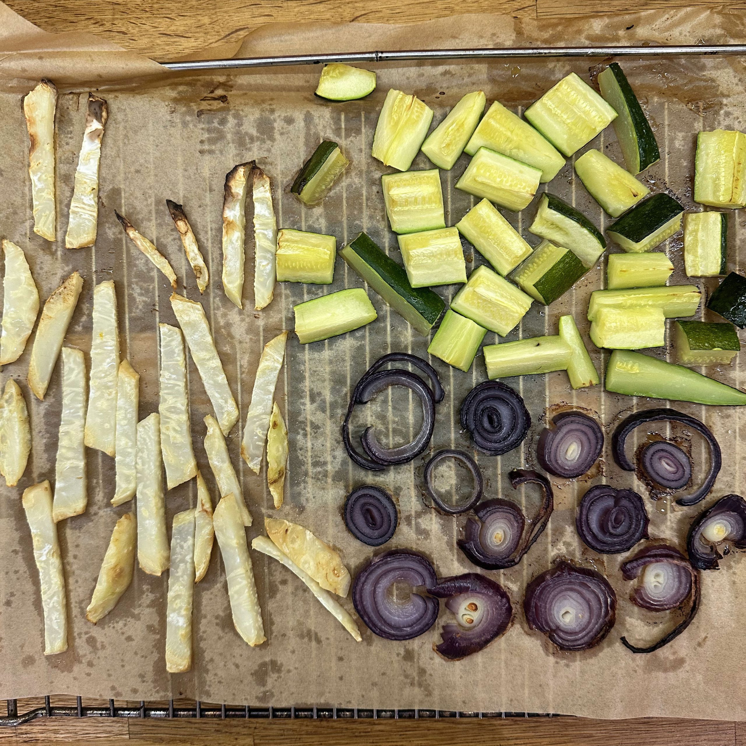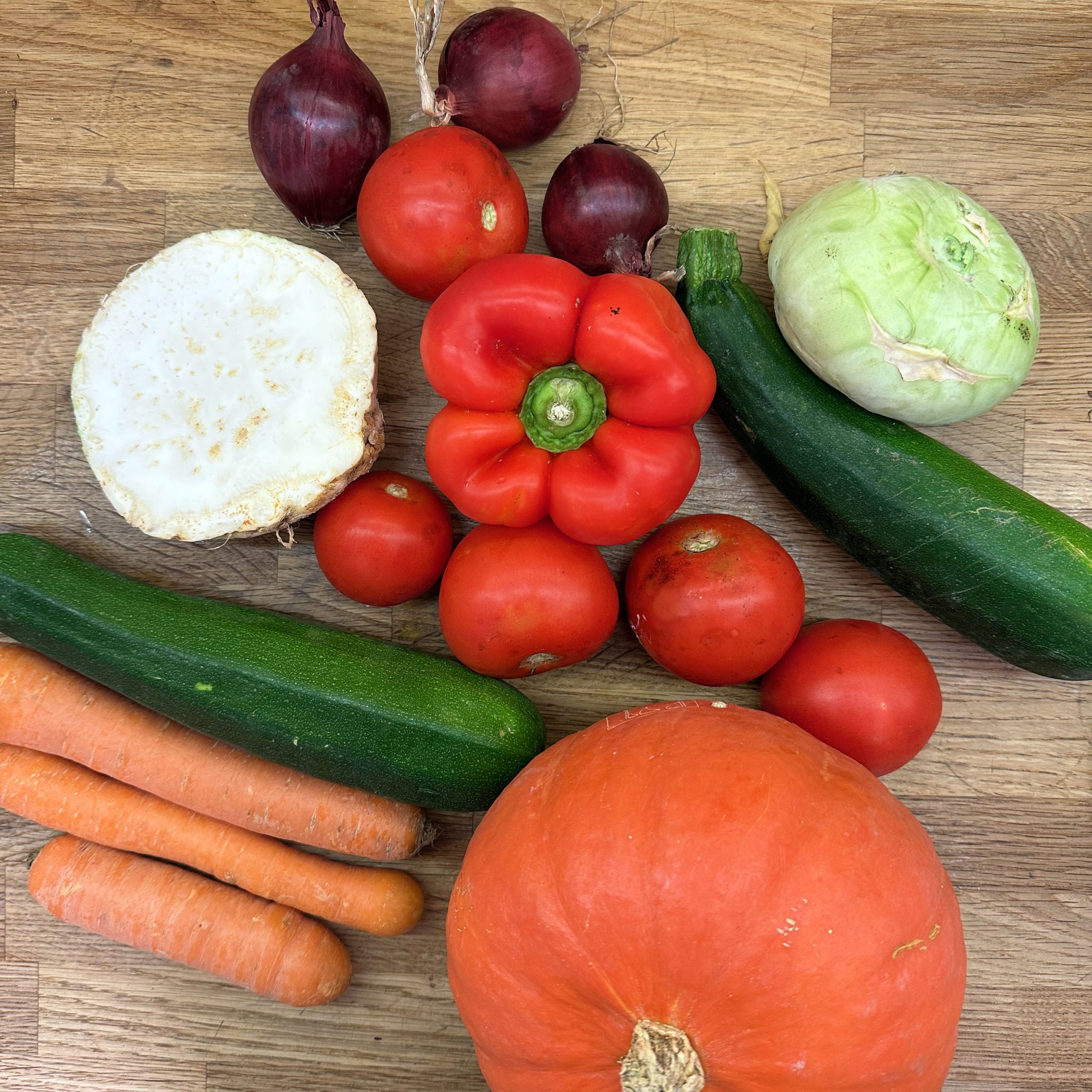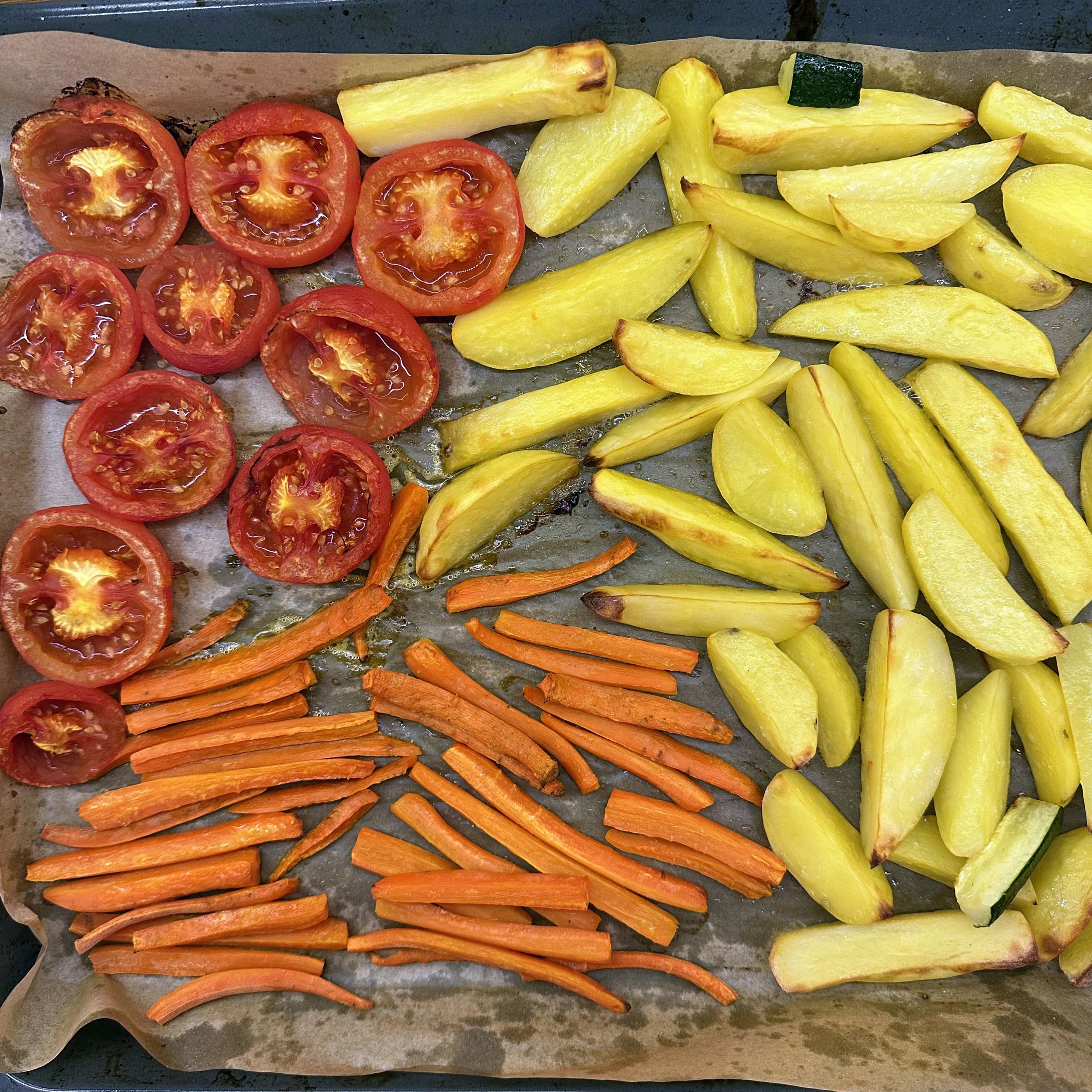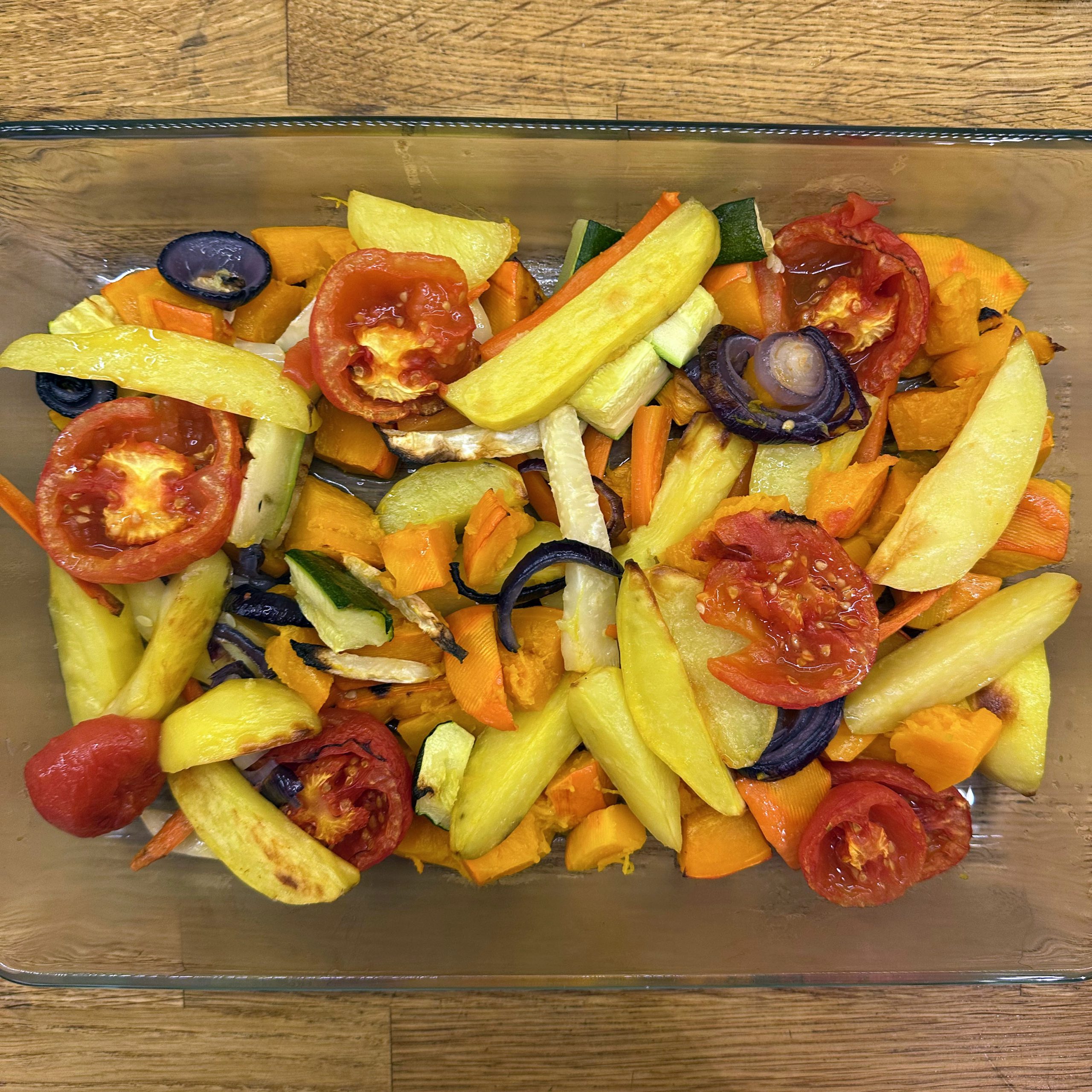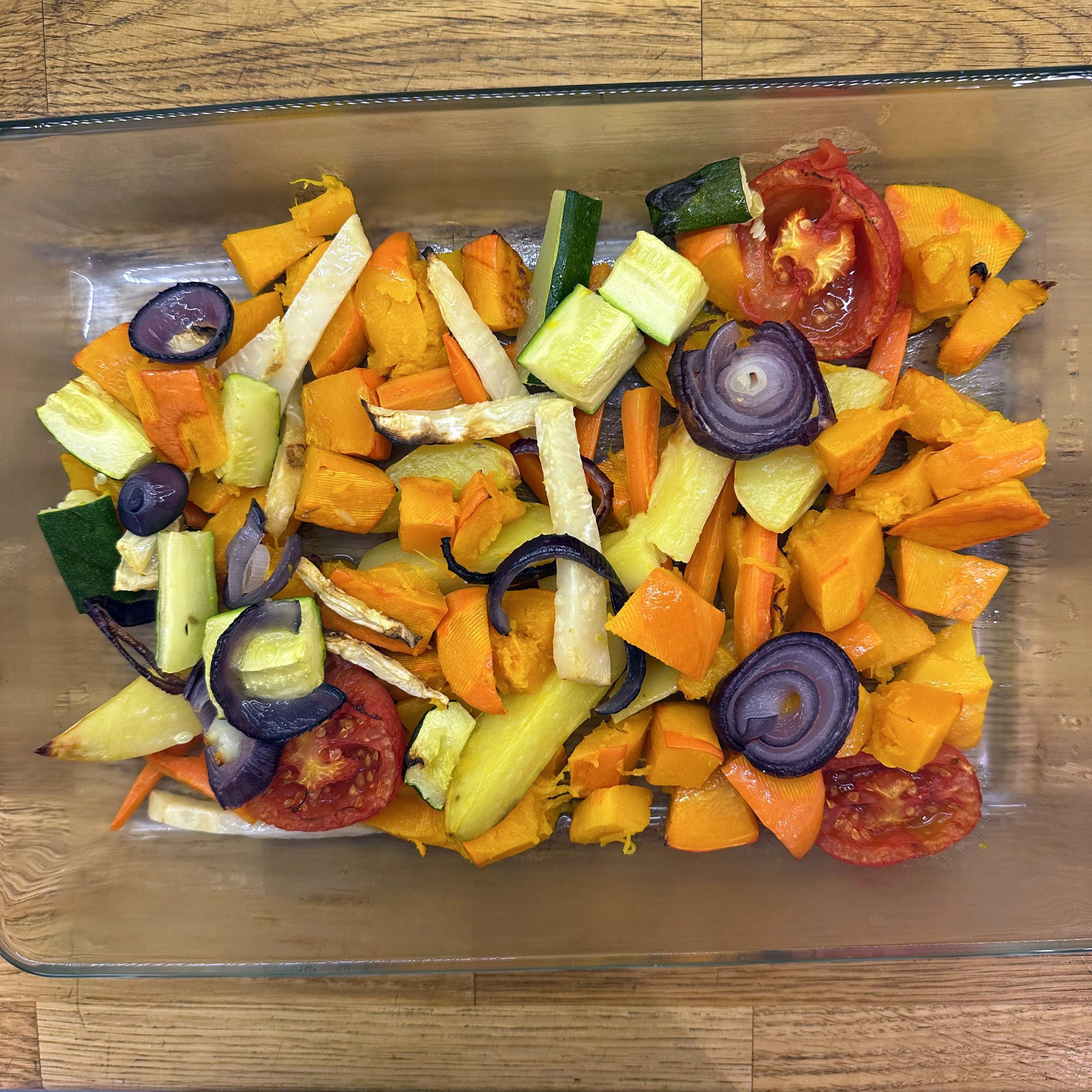 6 Kartoffeln, 5 Möhren, 0,5 Sellerieknolle, 1 Kürbis, 1 Zucchini und 3 Zwiebeln schälen bzw. putzen und in mundgerechte Stücke schneiden, 5 Tomaten mit kochendem Wasser übergießen, häuten und grob schneiden, alles mit etwas Öl, Salz und Pfeffer mischen und auf 3 Bleche verteilen. Bei 210° Umluft garen und dabei die Blechpositionen zwischendurch wechseln, bis das Gemüse weich und gut gebräunt ist. 1 Paprika halbieren, entkernen und unter dem Grill rösten, Haut abziehen, in Streifen schneiden, salzen und in Öl und Balsamico marinieren. Ofengemüse gemischt in eine große Auflaufform schichten, auf die Hälfte 150gr Schafskäse zerbröseln, den Rest Gemüse daraufgeben und die marinierten Paprikastreifen darauf verteilen. 140gr Butter, 50gr Paniermehl, 120gr Dinkelmehl und 100gr geriebenen Parmesan zu Streuseln verkneten und als Crumble-Topping auf der Form verteilen. Gemüsecrumble bei 200° Umluft 18min backen, bis die Streusel goldbraun sind. In Schalen servieren.