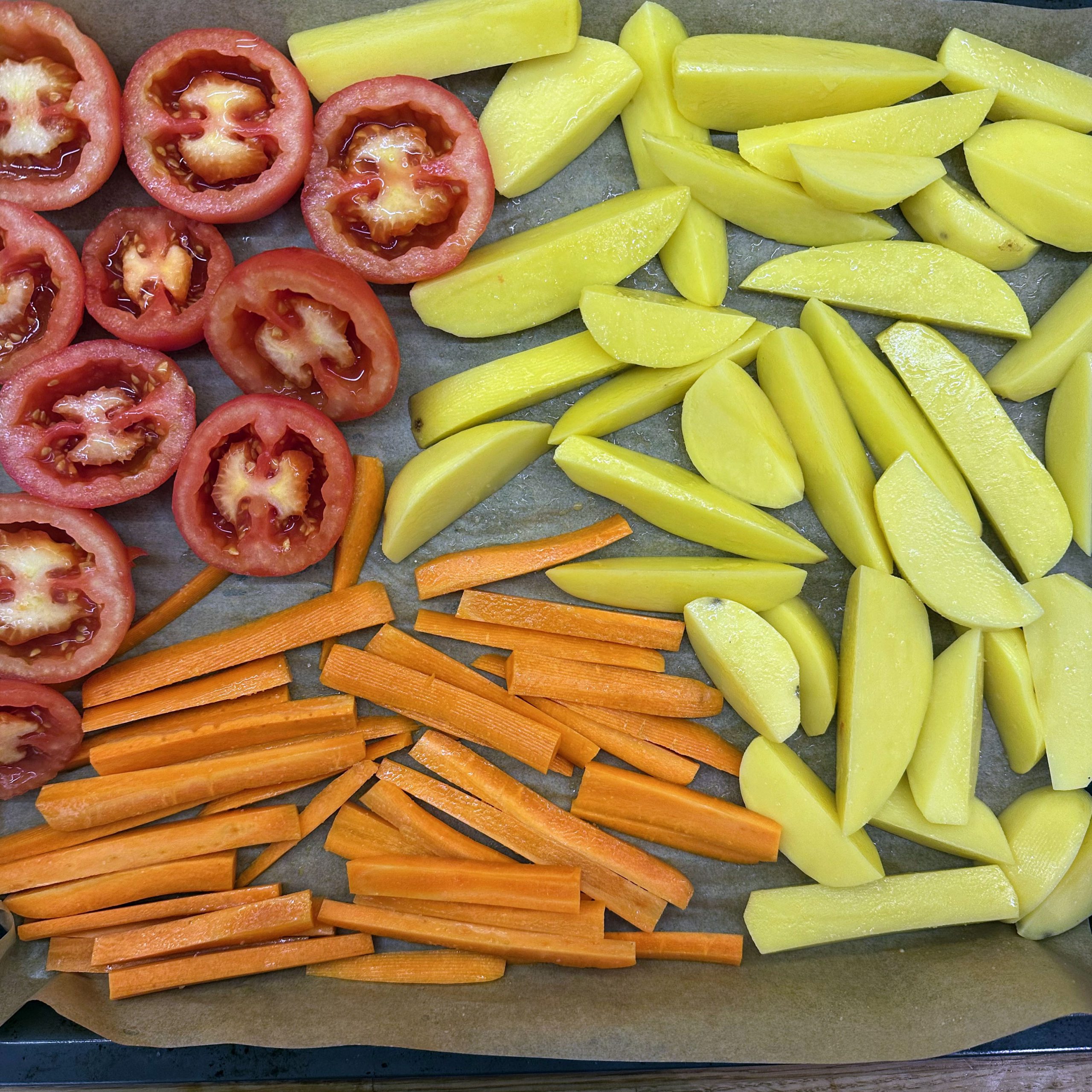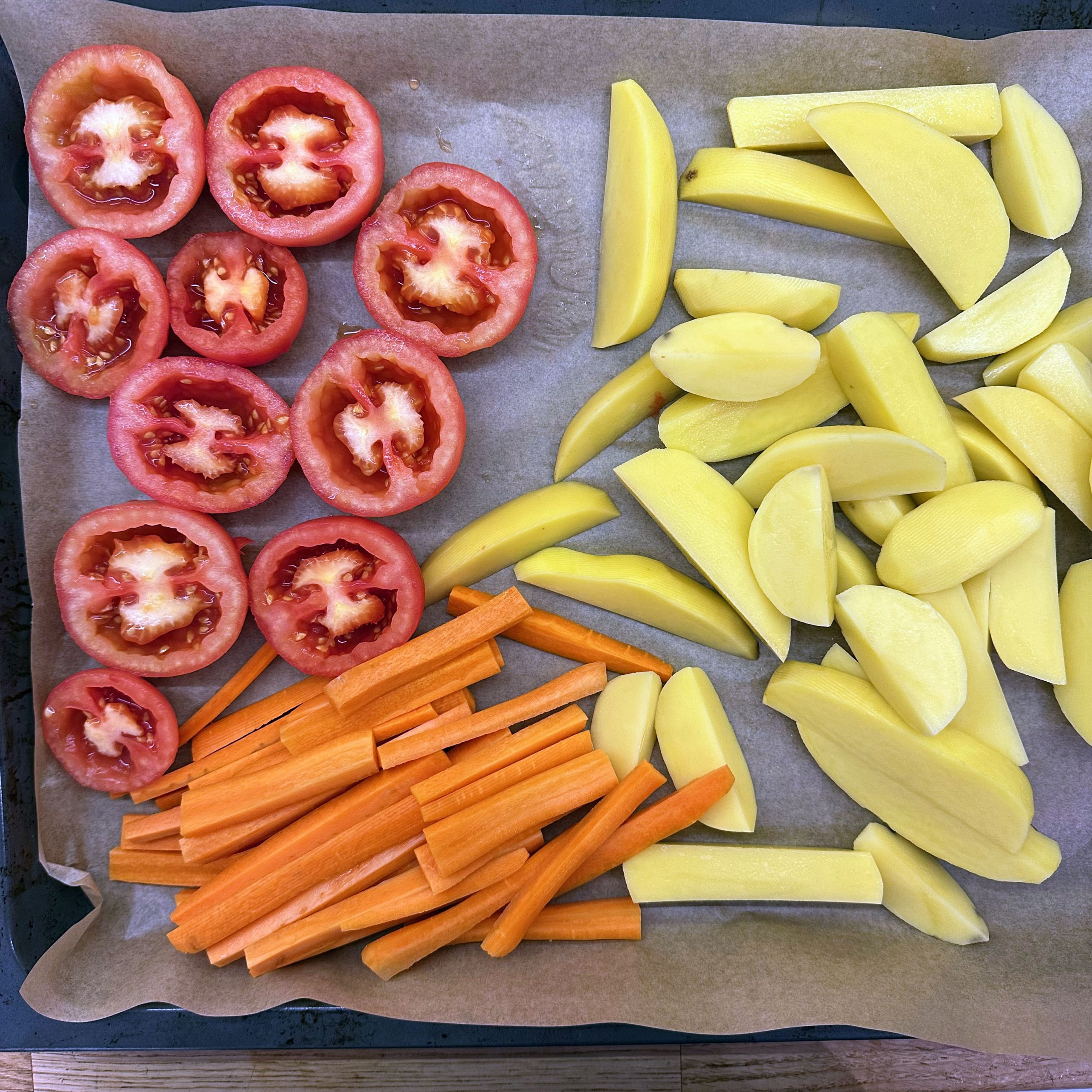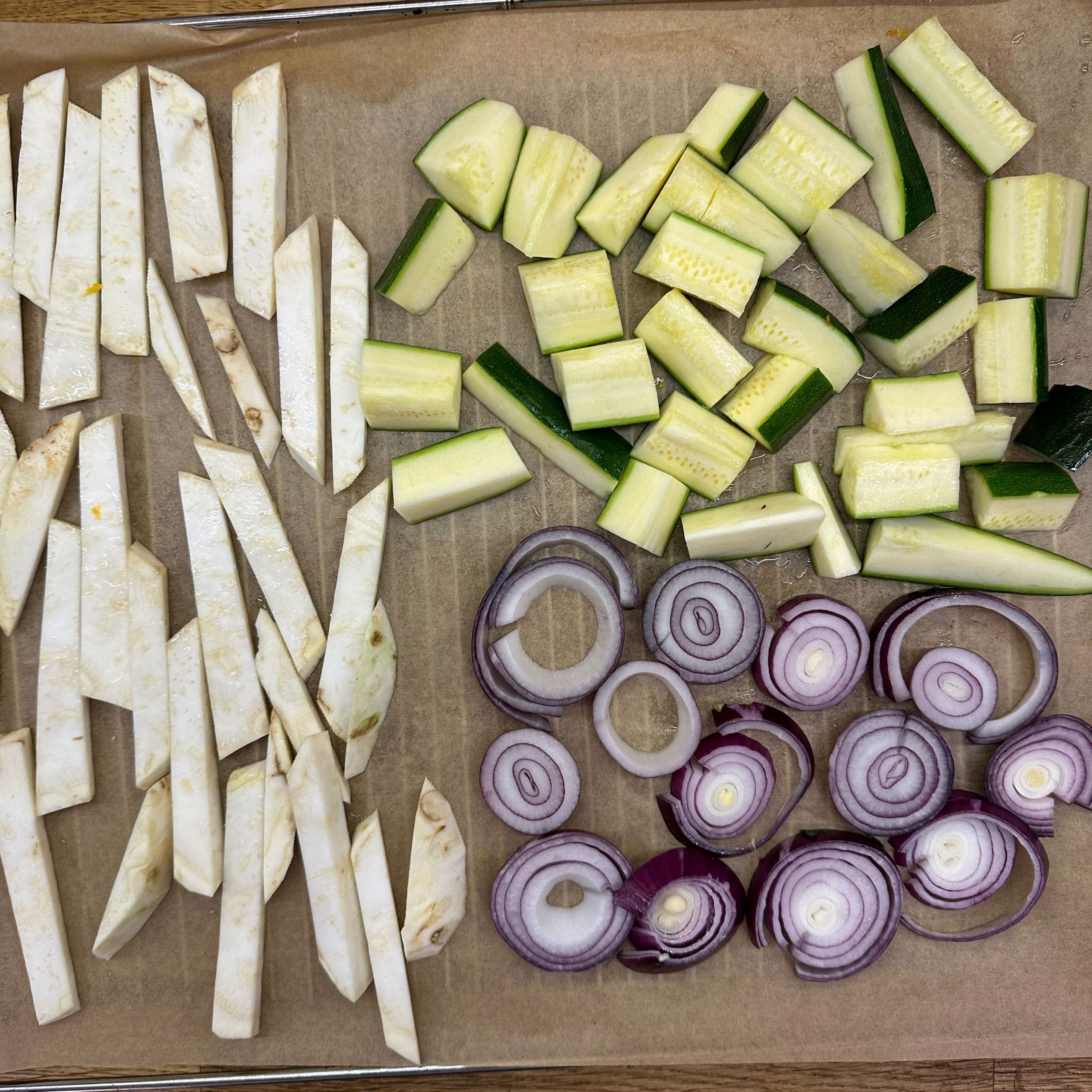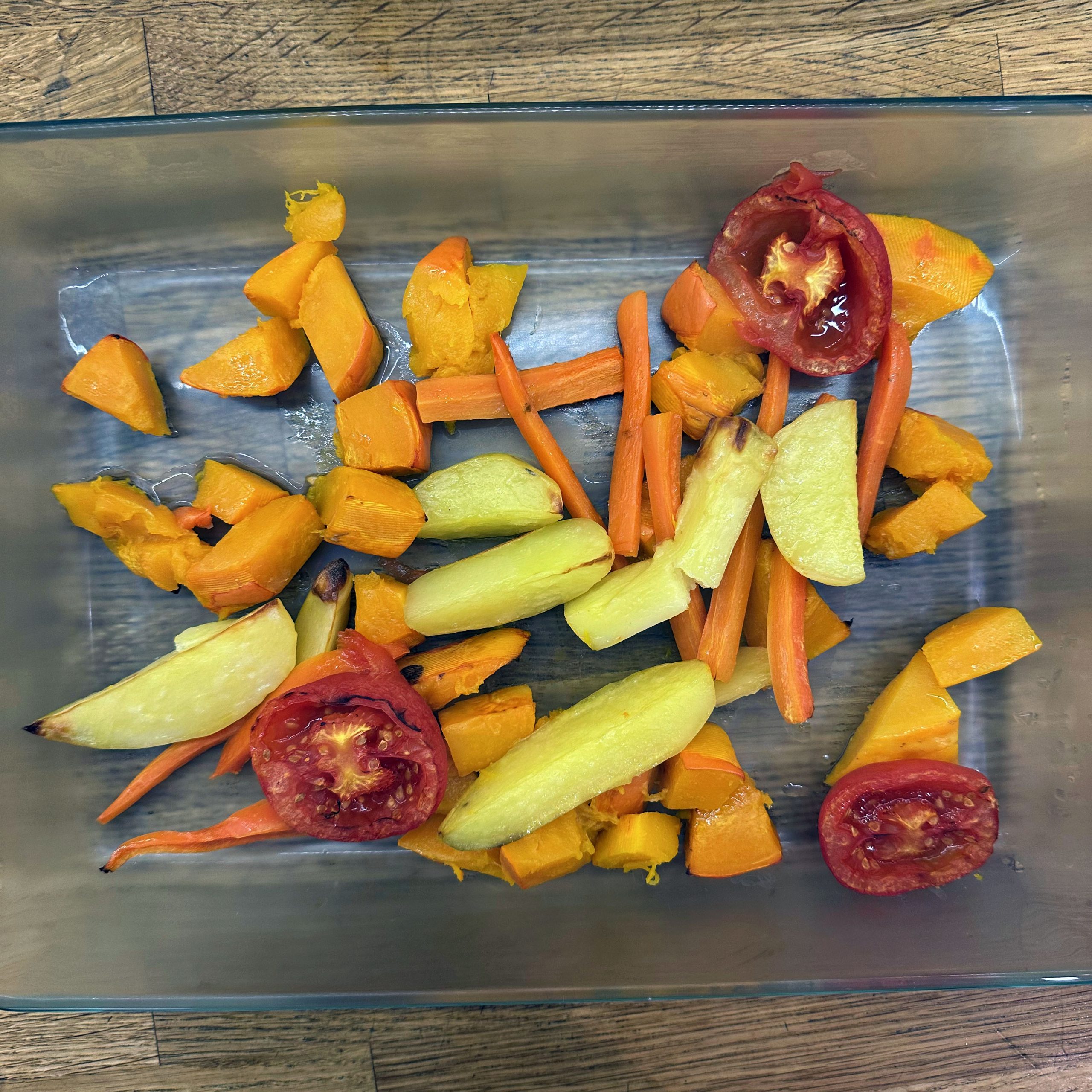 6 Kartoffeln, 5 Möhren, 0,5 Sellerieknolle, 1 Kürbis, 1 Zucchini und 3 Zwiebeln schälen bzw. putzen und in mundgerechte Stücke schneiden, 5 Tomaten mit kochendem Wasser übergießen, häuten und grob schneiden, alles mit etwas Öl, Salz und Pfeffer mischen und auf 3 Bleche verteilen. Bei 210° Umluft garen und dabei die Blechpositionen zwischendurch wechseln, bis das Gemüse weich und gut gebräunt ist. 1 Paprika halbieren, entkernen und unter dem Grill rösten, Haut abziehen, in Streifen schneiden, salzen und in Öl und Balsamico marinieren. Ofengemüse gemischt in eine große Auflaufform schichten, auf die Hälfte 150gr Schafskäse zerbröseln, den Rest Gemüse daraufgeben und die marinierten Paprikastreifen darauf verteilen. 140gr Butter, 50gr Paniermehl, 120gr Dinkelmehl und 100gr geriebenen Parmesan zu Streuseln verkneten und als Crumble-Topping auf der Form verteilen. Gemüsecrumble bei 200° Umluft 18min backen, bis die Streusel goldbraun sind. In Schalen servieren.