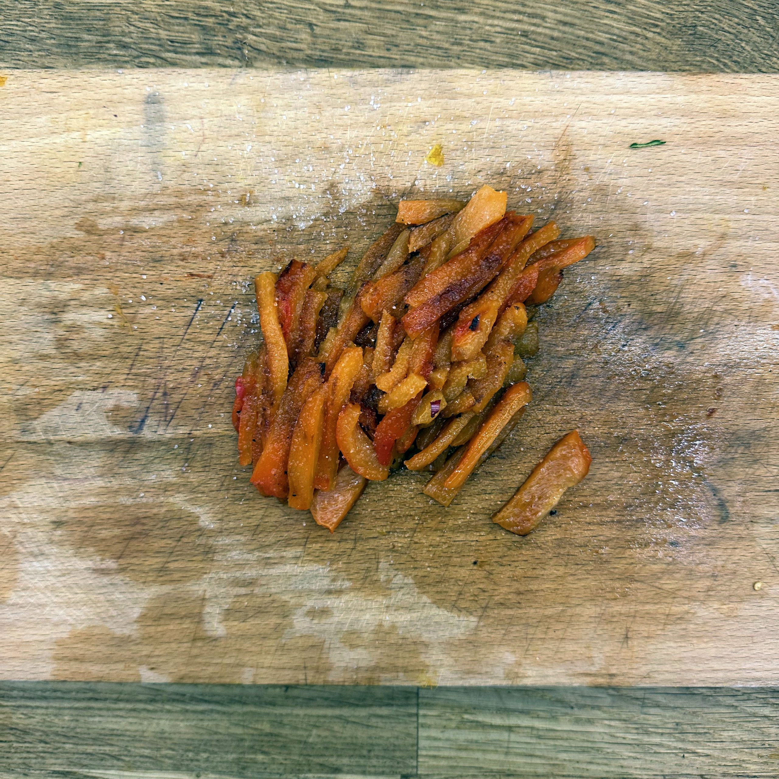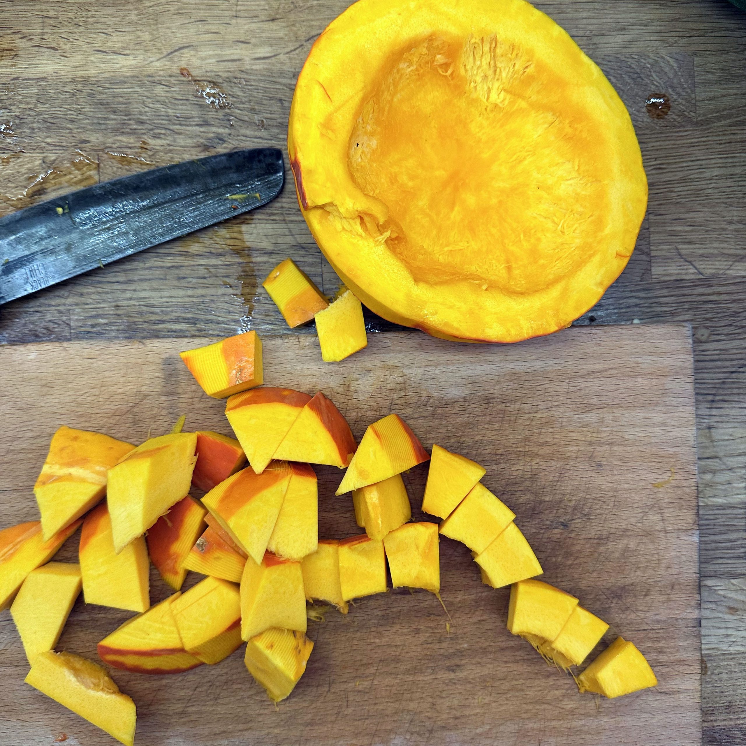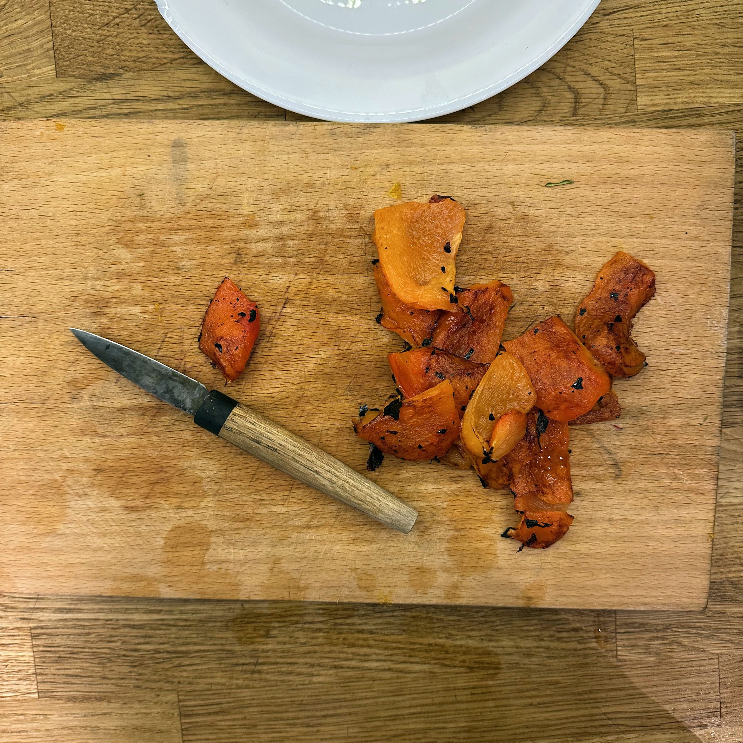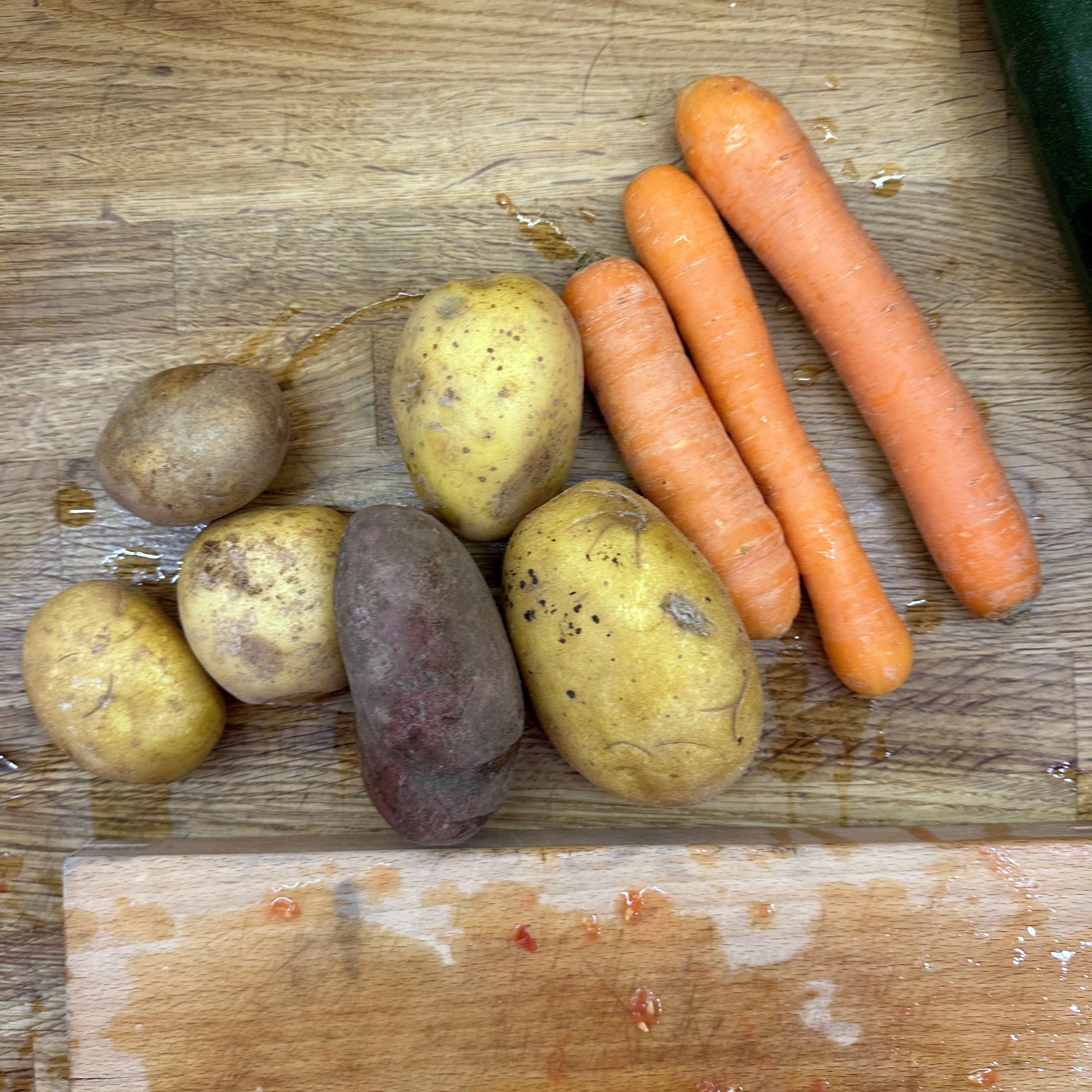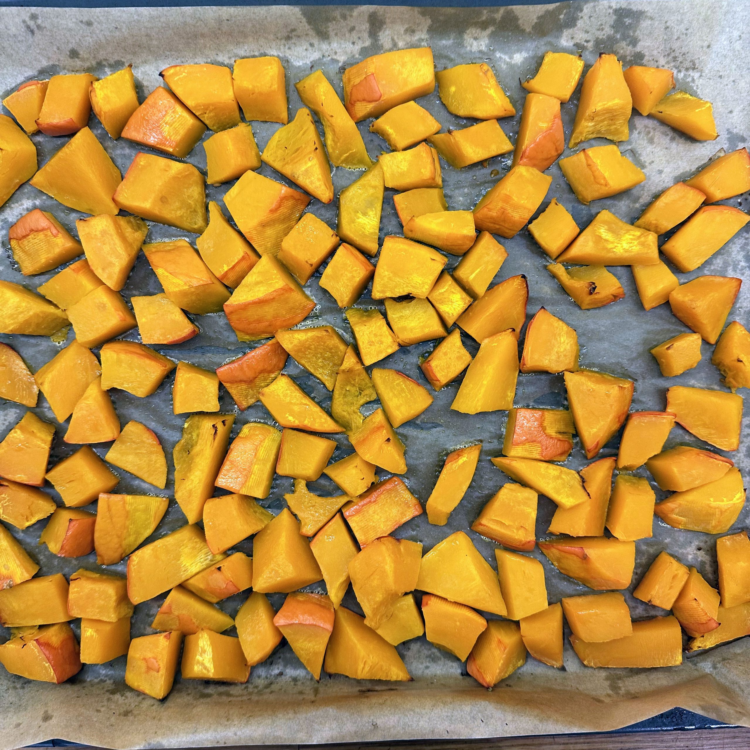 6 Kartoffeln, 5 Möhren, 0,5 Sellerieknolle, 1 Kürbis, 1 Zucchini und 3 Zwiebeln schälen bzw. putzen und in mundgerechte Stücke schneiden, 5 Tomaten mit kochendem Wasser übergießen, häuten und grob schneiden, alles mit etwas Öl, Salz und Pfeffer mischen und auf 3 Bleche verteilen. Bei 210° Umluft garen und dabei die Blechpositionen zwischendurch wechseln, bis das Gemüse weich und gut gebräunt ist. 1 Paprika halbieren, entkernen und unter dem Grill rösten, Haut abziehen, in Streifen schneiden, salzen und in Öl und Balsamico marinieren. Ofengemüse gemischt in eine große Auflaufform schichten, auf die Hälfte 150gr Schafskäse zerbröseln, den Rest Gemüse daraufgeben und die marinierten Paprikastreifen darauf verteilen. 140gr Butter, 50gr Paniermehl, 120gr Dinkelmehl und 100gr geriebenen Parmesan zu Streuseln verkneten und als Crumble-Topping auf der Form verteilen. Gemüsecrumble bei 200° Umluft 18min backen, bis die Streusel goldbraun sind. In Schalen servieren.