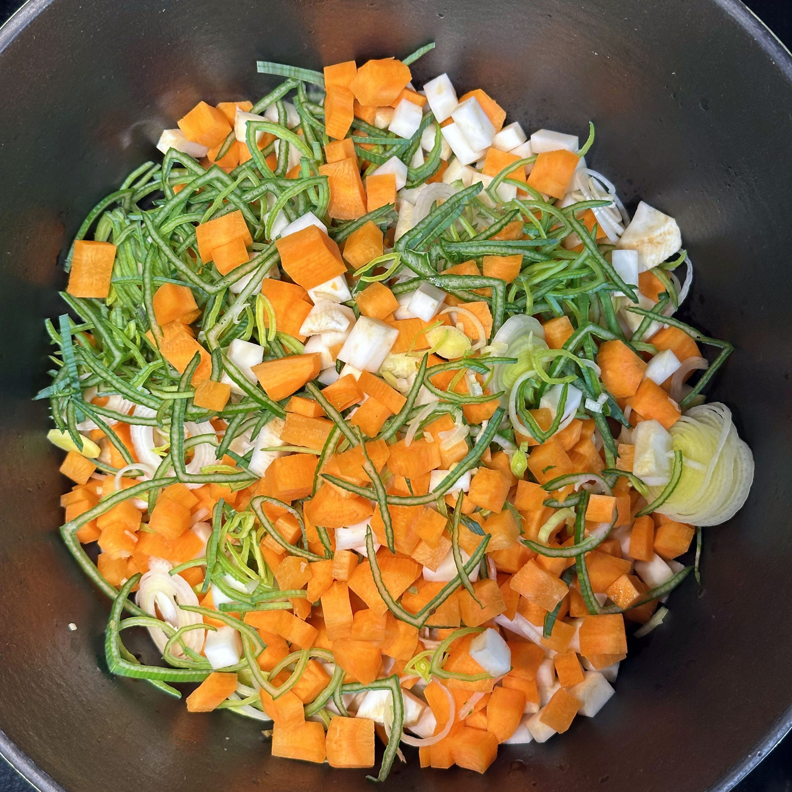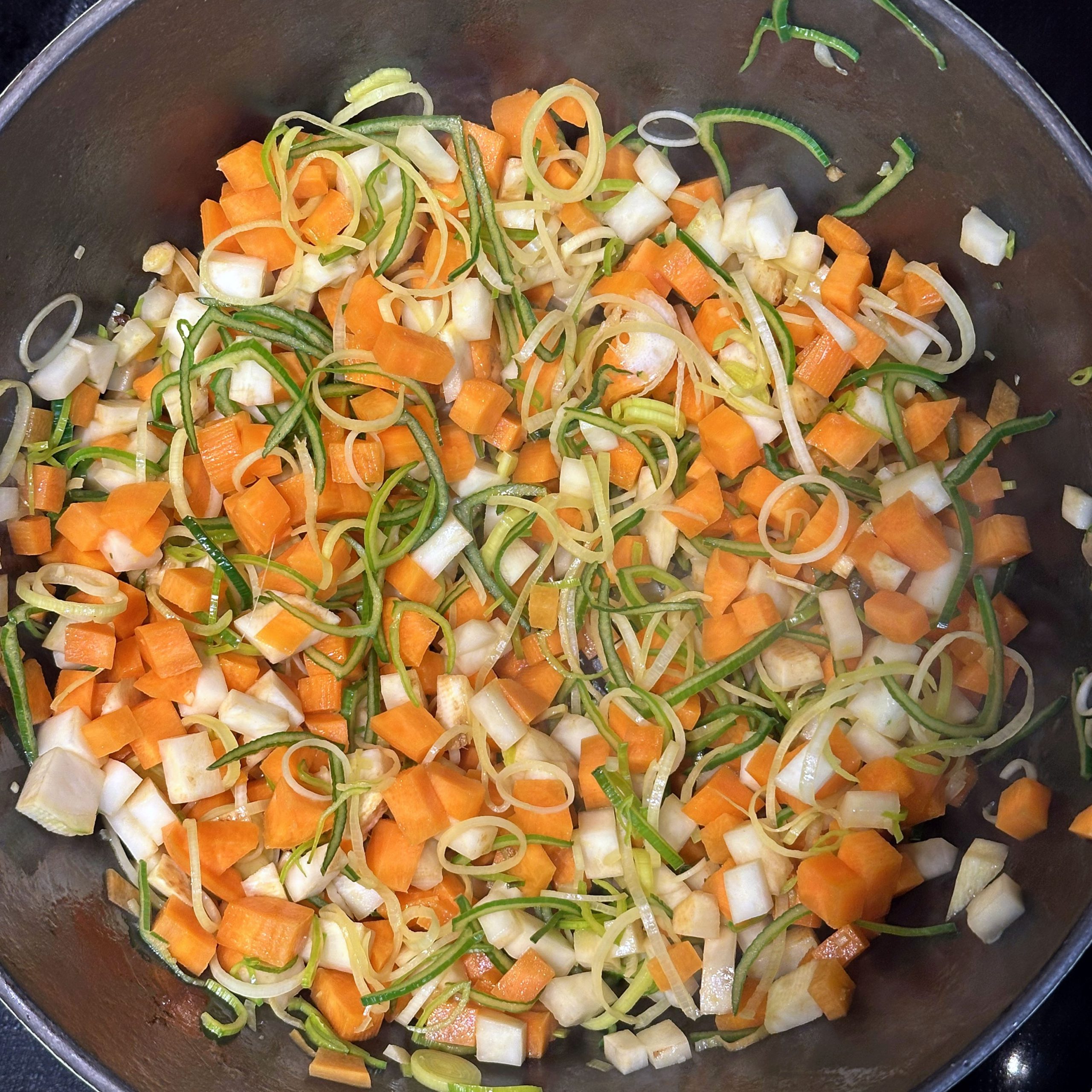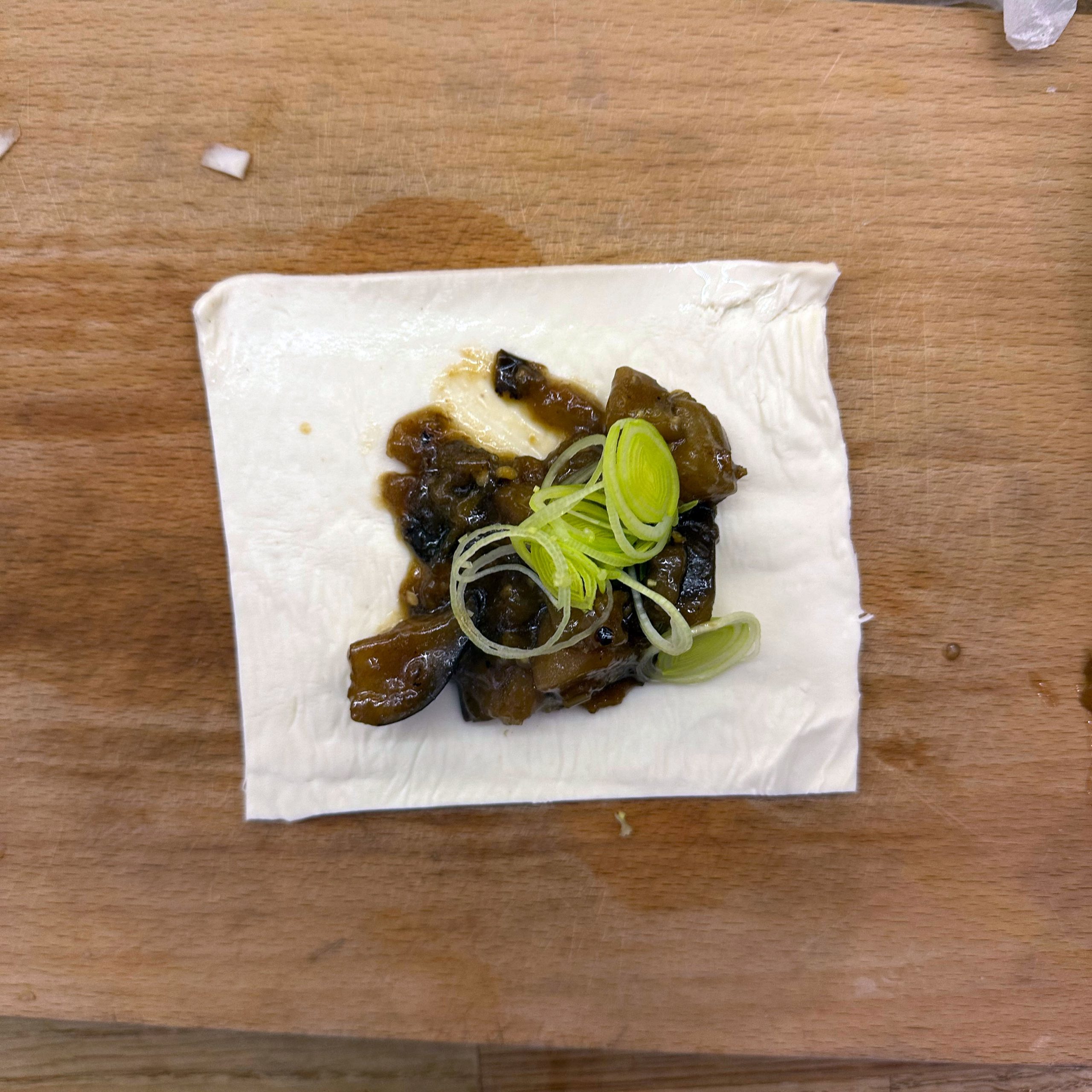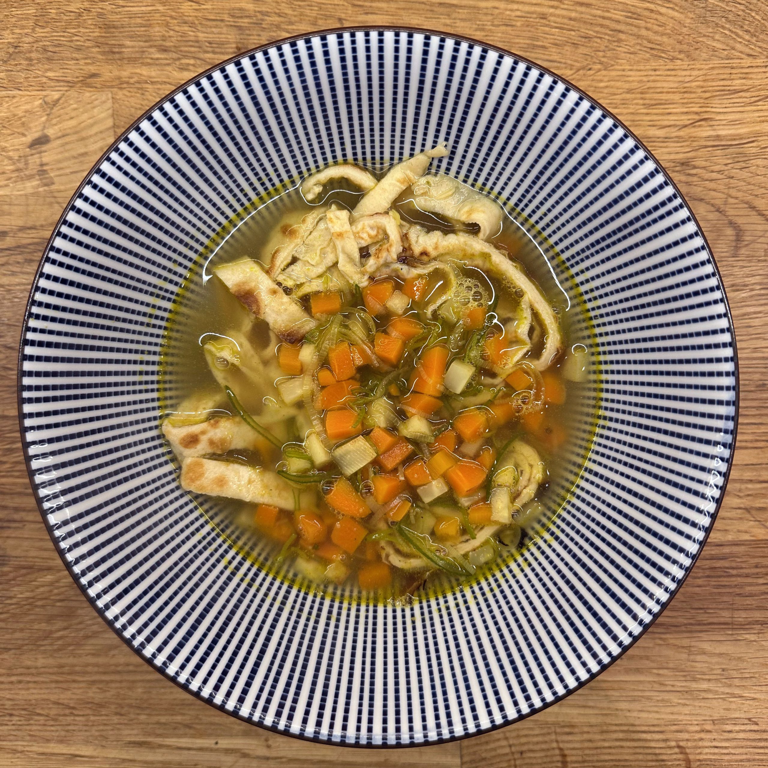 1 Ei mit 150ml Mandelmilch verquirlen, 100g Mehl, 1 Prise Salz unterrühren und zu einem glatten Teig verrühren, etwa 30 Minuten ruhen lassen. Dann in einer beschichteten Pfanne mit etwas Öl 4-5 dünne Pfannkuchen ausbacken, abkühlen lassen, aufrollen und in feine Streifen schneiden. Für die Gemüsesuppe 2 Möhren, 100g Knollensellerie und 1 Lauchstange putzen, schälen und in kleine Würfel schneiden. In einem großen Topf 2 EL Olivenöl erhitzen, das Gemüse hinzufügen und etwa 5 Minuten anschwitzen. Mit 1,5 Liter Gemüsebrühe aufgießen und etwa 10 Minuten köcheln lassen. Die Flädle-Streifen kurz vor dem Servieren in die Schalen geben. Für die chinesischen Auberginen in Blätterteig 2 Auberginen in Scheiben 20 Minuten in Salzwasser einweichen, dann in Würfel schneiden und in einer Pfanne mit 2 EL Öl scharf anbraten. Deckel auf die Pfanne legen und die Auberginenwürfel 20 Minuten dünsten, dabei gelegentlich umrühren. 5 Minuten vor Ende 1 EL geriebenen Ingwer und 1 gewürfelte Schalotte unterrühren. Eine Sauce aus 2 EL Essig, 3 EL Sojasoße, 1 EL Reissirup und 1 EL Stärke (mit etwas Wasser angerührt) mischen, zu den Auberginen geben und 5 Minuten köcheln lassen, bis die Sauce eingedickt ist. 1 Packung Blätterteig ausrollen und in Quadrate schneiden, je 2-3 EL Auberginenmischung in die Mitte legen, den Teig zu Päckchen falten und die Ränder gut verschließen. Die Päckchen auf ein mit Backpapier ausgelegtes Blech legen und bei 200°C 30 Minuten backen, dabei 2x wenden und mit einer Mischung aus Öl und Pflanzenmilch einpinseln. Beim letzten Wenden mit Sesam bestreuen. Die Auberginen-Blätterteig-Päckchen mit der Gemüsesuppe servieren.
