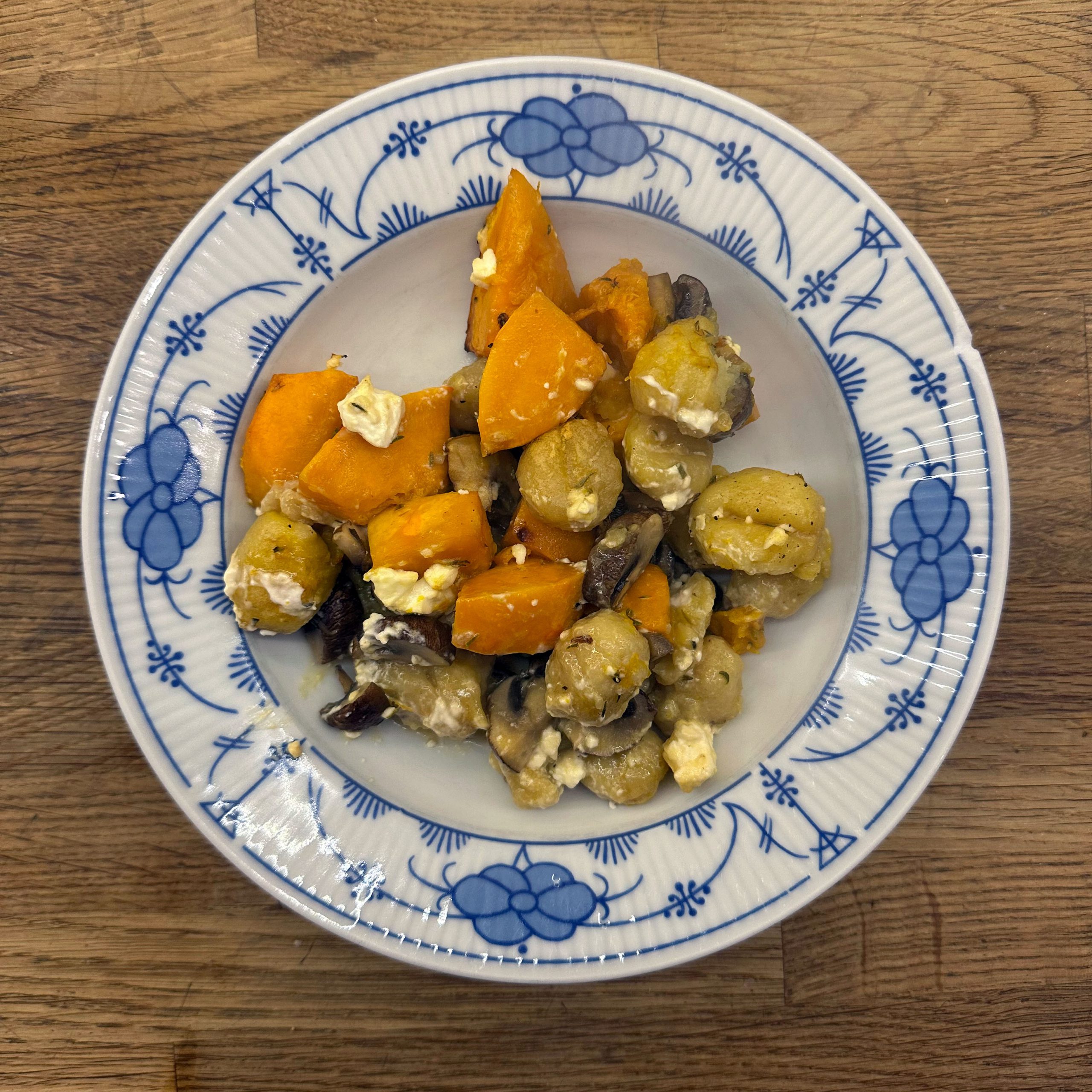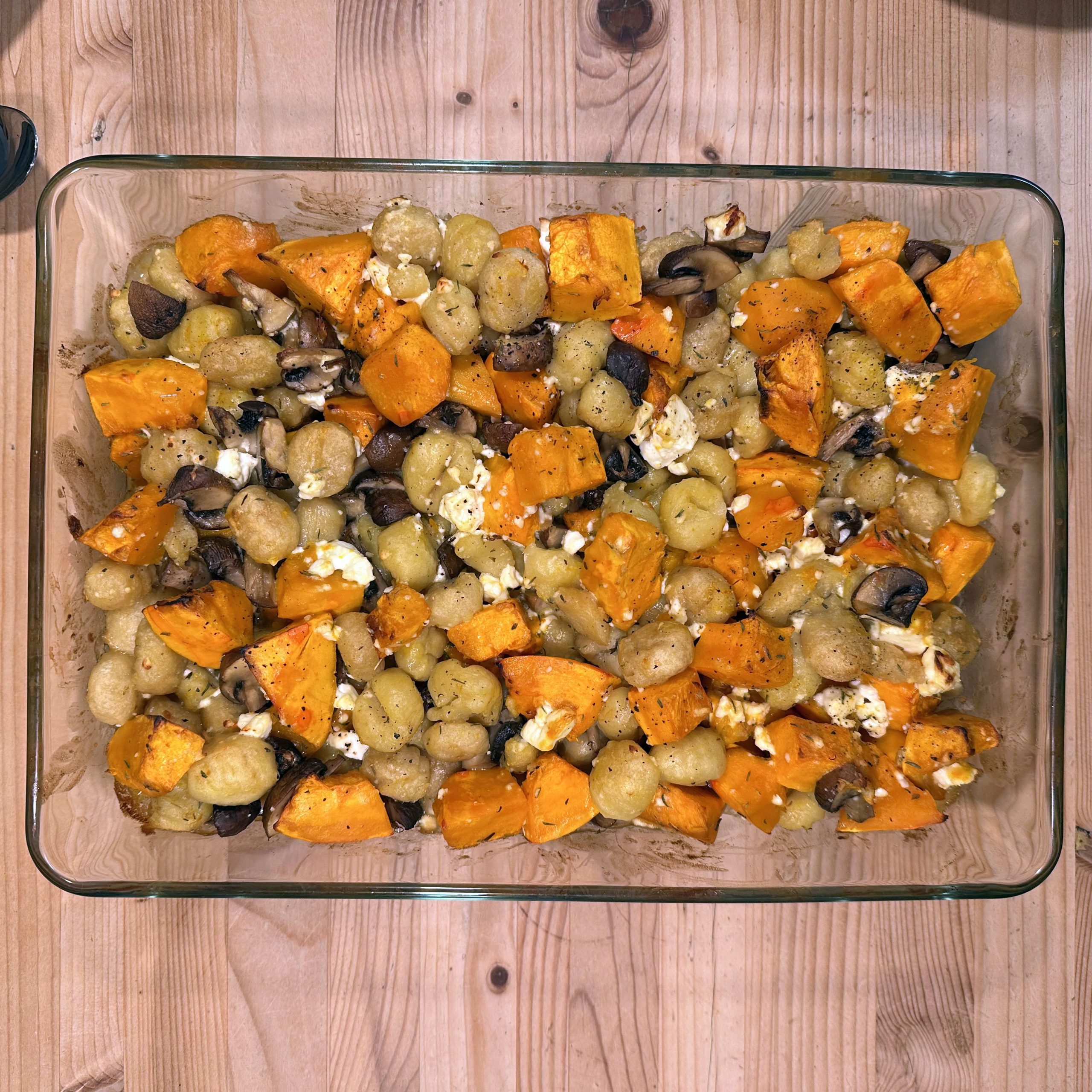 Karine kocht: Kürbis schälen, entkernen und in mundgerechte Stücke schneiden, 300 g Champignons ganz lassen, beides mit etwas Öl, Salz und Pfeffer mischen und bei 200 °C Umluft 30 min im Ofen backen, bis der Kürbis weich ist. Champignons etwas abkühlen lassen, in Scheiben schneiden. 2 Packungen Gnocchi à 400 g in eine Auflaufform geben, mit etwas Öl vermengen und bei Umluft 12 min backen. Vorgebackene Gnocchi mit Ofenkürbis und den Champignons mischen, 200 g Feta darüberbröseln und bei 200 °C Umluft 15 min überbacken, bis der Feta leicht gebräunt ist.