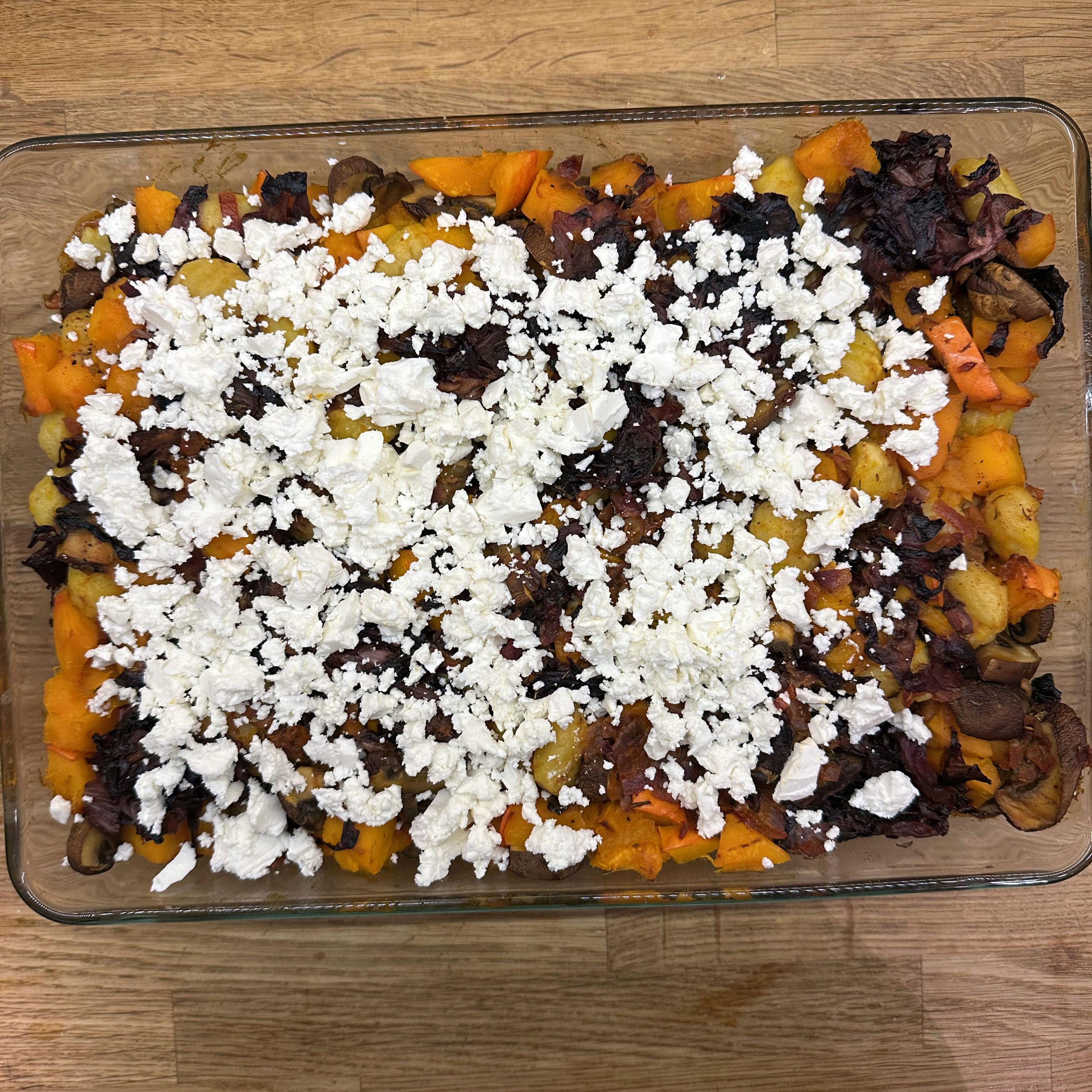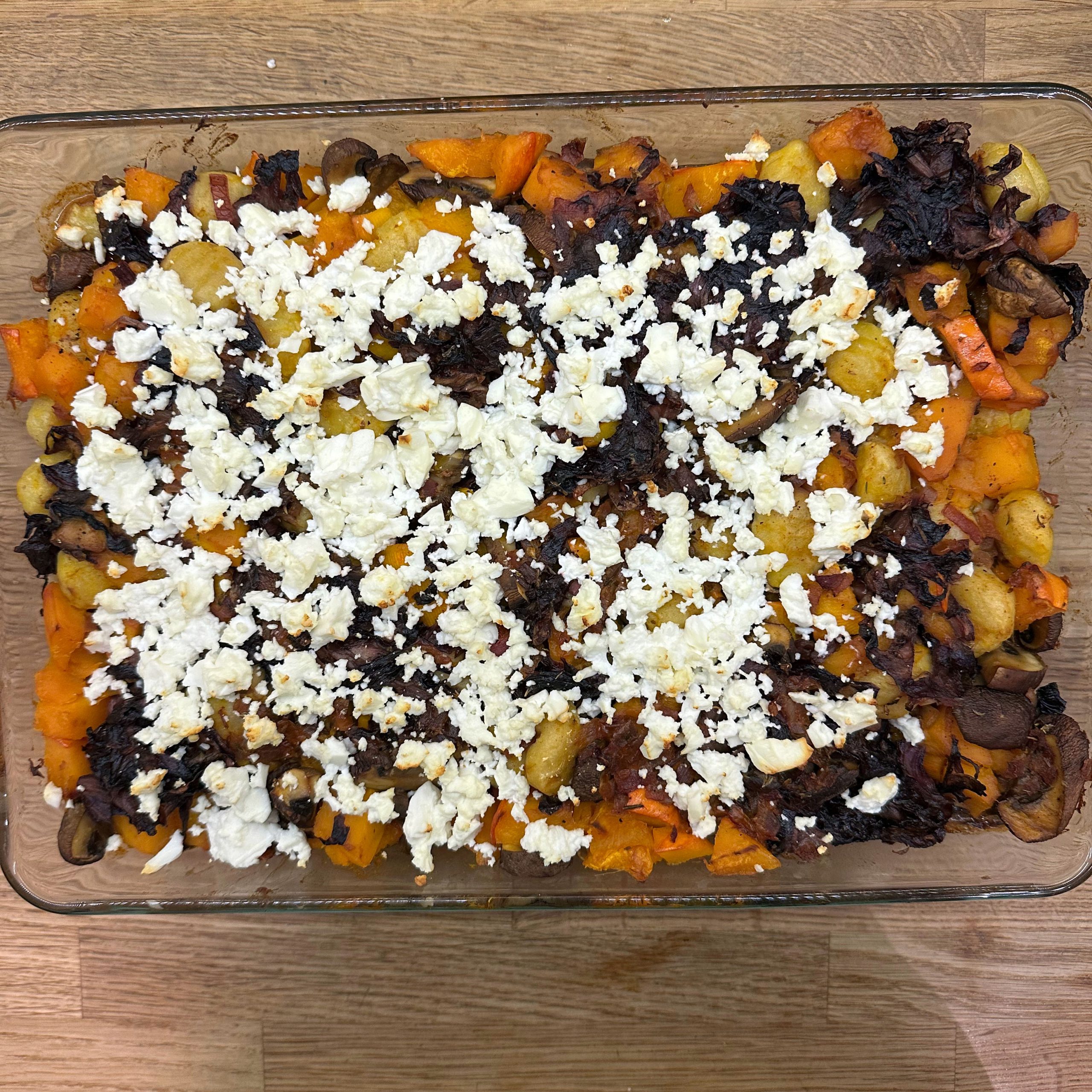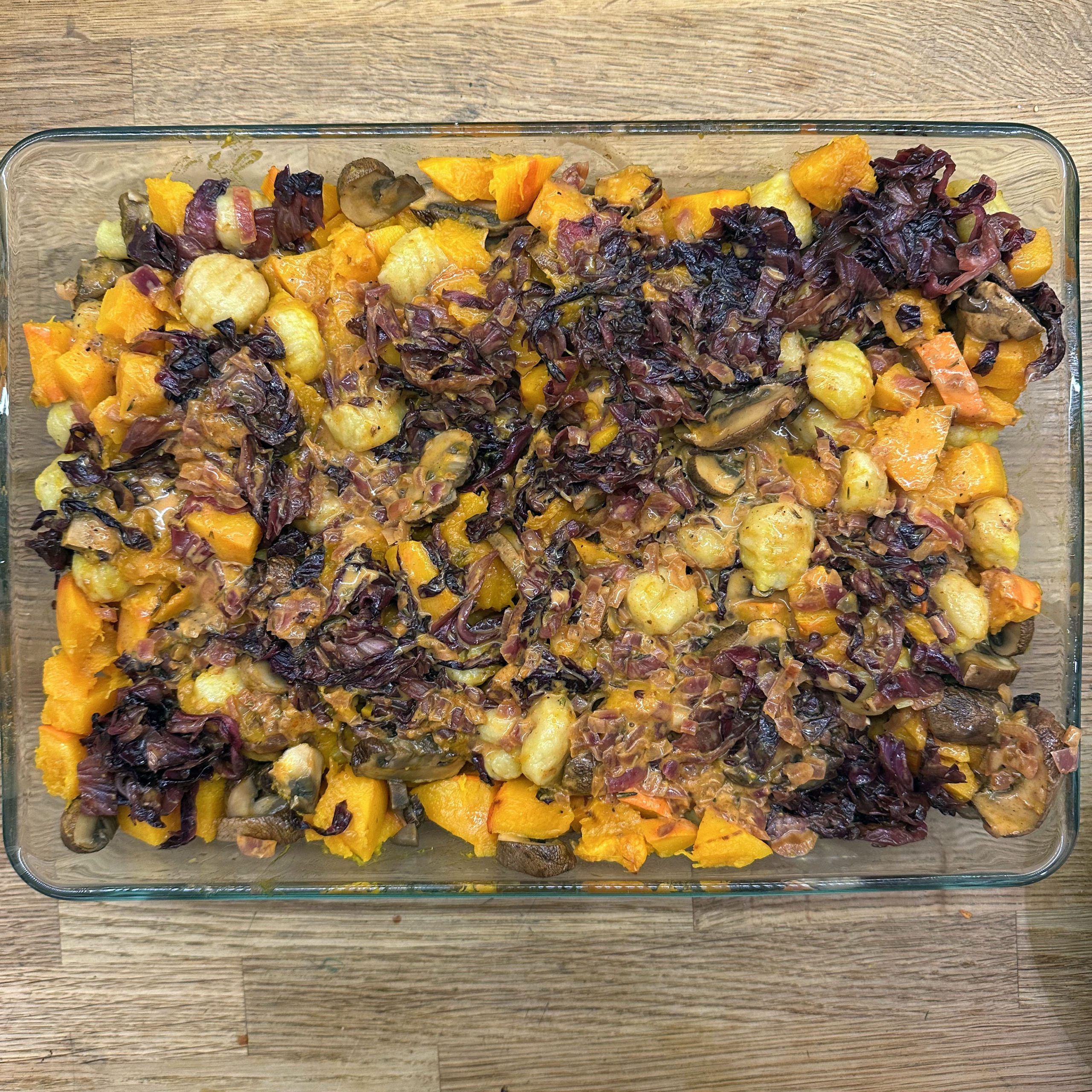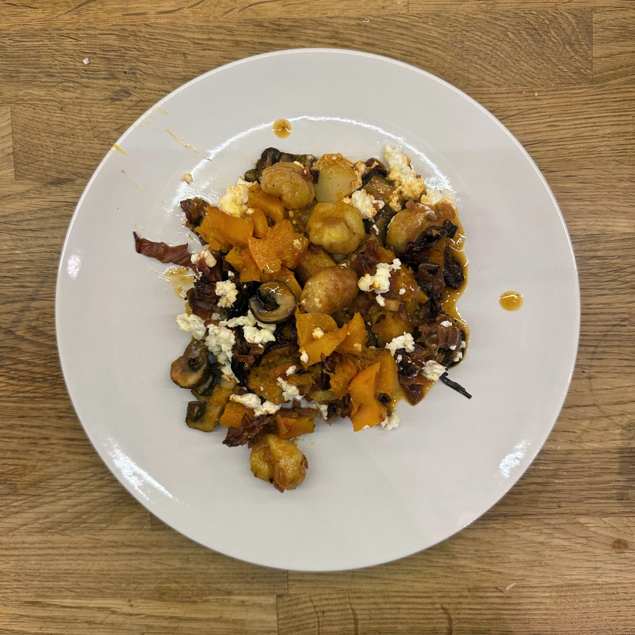 Kürbis schälen, entkernen und in mundgerechte Stücke schneiden, 300gr Champignons ganz lassen, Kürbis und Champignons mit etwas Öl, Salz und Pfeffer mischen und bei 200° Umluft 25-30min im Ofen backen, bis der Kürbis weich ist. Champignons etwas abkühlen lassen, in Scheiben schneiden und mit Balsamico, Sojasoße und Ahornsirup marinieren. 2 Packungen Gnocchi à 400gr in eine Auflaufform geben, mit etwas Öl vermengen und bei Umluft 12min backen. 1 Zwiebel würfeln und in etwas Öl anbraten, 300ml Hafersahne und etwas Wasser zugeben und mit Salz, Pfeffer, getrockneten Kräutern und Paprika würzen. Radicchio in Streifen schneiden und in einer Pfanne in etwas Öl kräftig anbraten, bis er leicht bräunt. Vorgebackene Gnocchi mit Ofenkürbis, Radicchio und den marinierten Champignons mischen, die Zwiebel-Hafersahne-Soße darübergeben, 200gr Feta darüberbröseln und bei 200° Umluft 15-20min überbacken, bis der Feta leicht gebräunt ist.