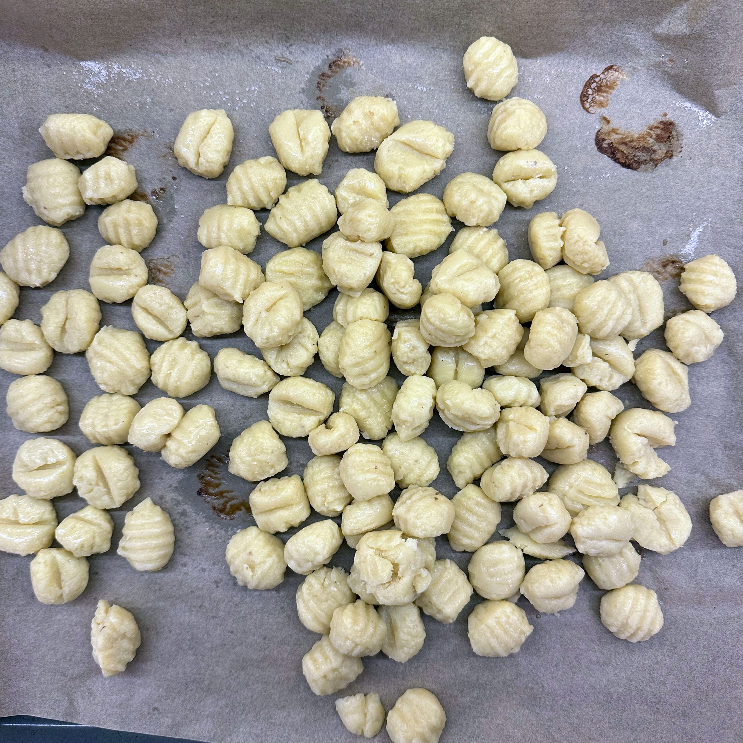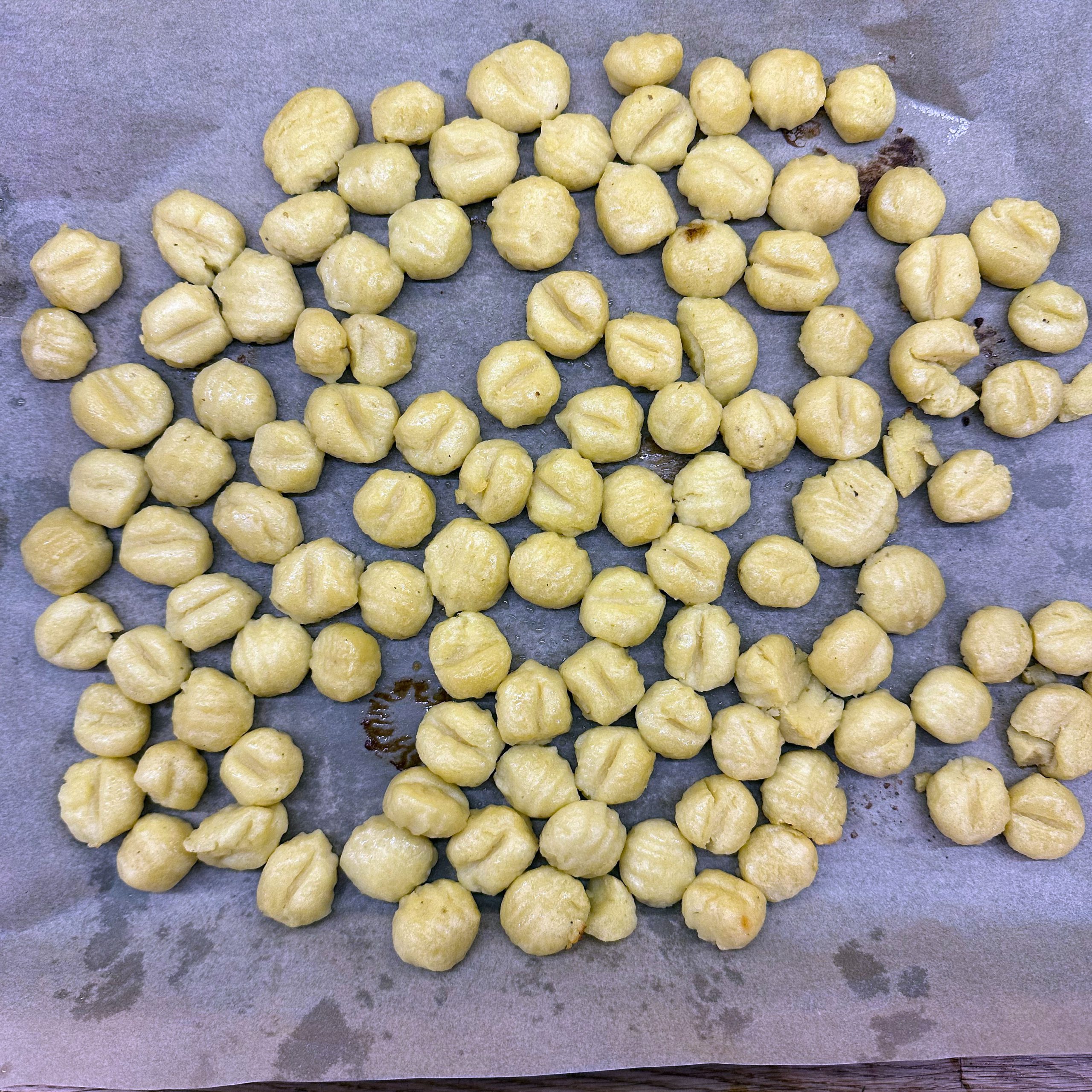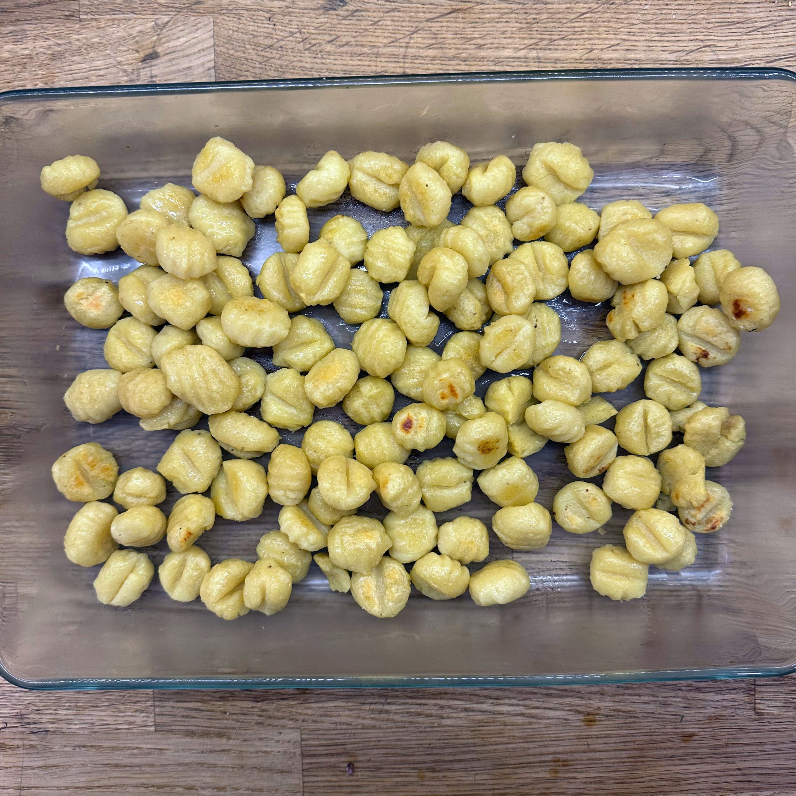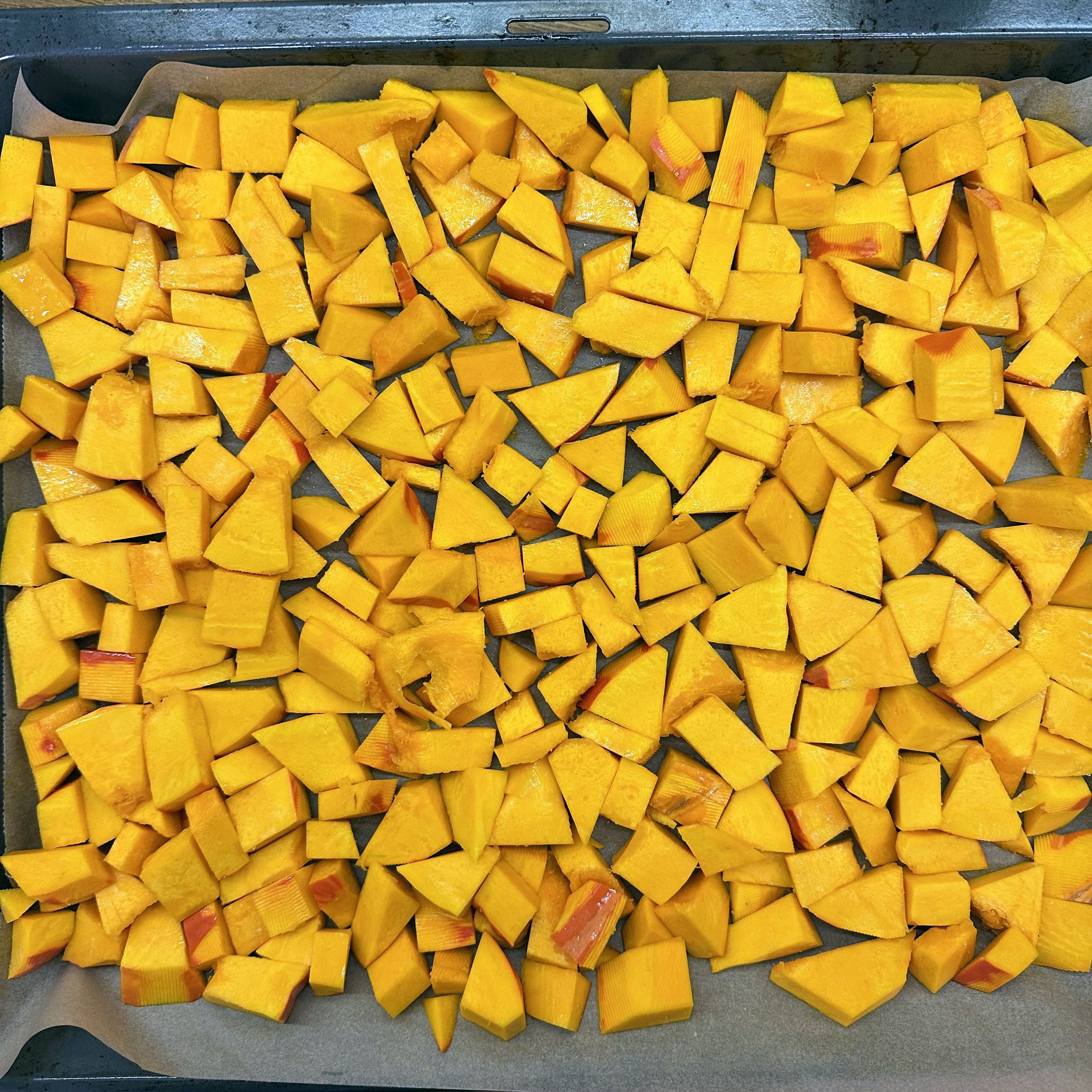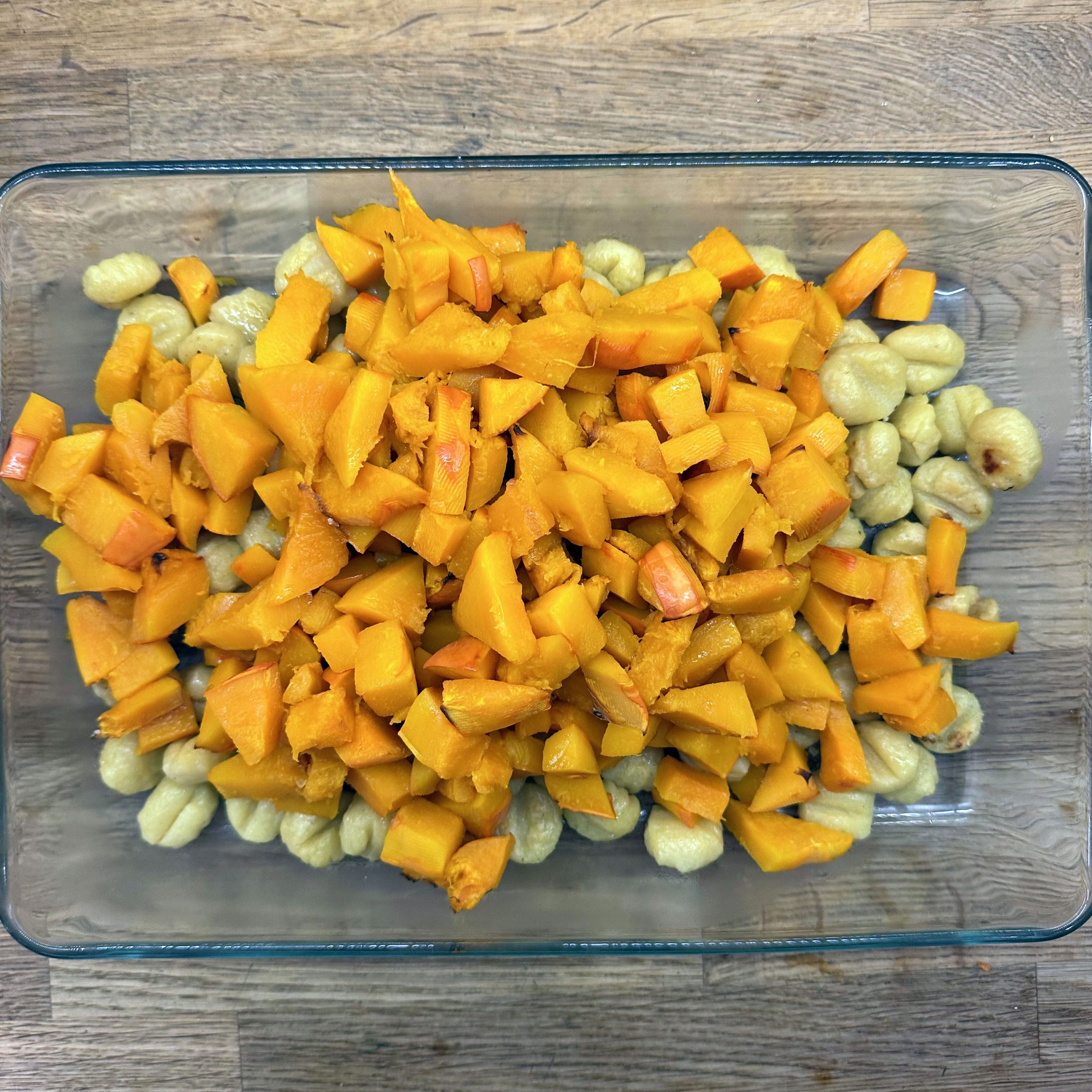 Kürbis schälen, entkernen und in mundgerechte Stücke schneiden, 300gr Champignons ganz lassen, Kürbis und Champignons mit etwas Öl, Salz und Pfeffer mischen und bei 200° Umluft 25-30min im Ofen backen, bis der Kürbis weich ist. Champignons etwas abkühlen lassen, in Scheiben schneiden und mit Balsamico, Sojasoße und Ahornsirup marinieren. 2 Packungen Gnocchi à 400gr in eine Auflaufform geben, mit etwas Öl vermengen und bei Umluft 12min backen. 1 Zwiebel würfeln und in etwas Öl anbraten, 300ml Hafersahne und etwas Wasser zugeben und mit Salz, Pfeffer, getrockneten Kräutern und Paprika würzen. Radicchio in Streifen schneiden und in einer Pfanne in etwas Öl kräftig anbraten, bis er leicht bräunt. Vorgebackene Gnocchi mit Ofenkürbis, Radicchio und den marinierten Champignons mischen, die Zwiebel-Hafersahne-Soße darübergeben, 200gr Feta darüberbröseln und bei 200° Umluft 15-20min überbacken, bis der Feta leicht gebräunt ist.