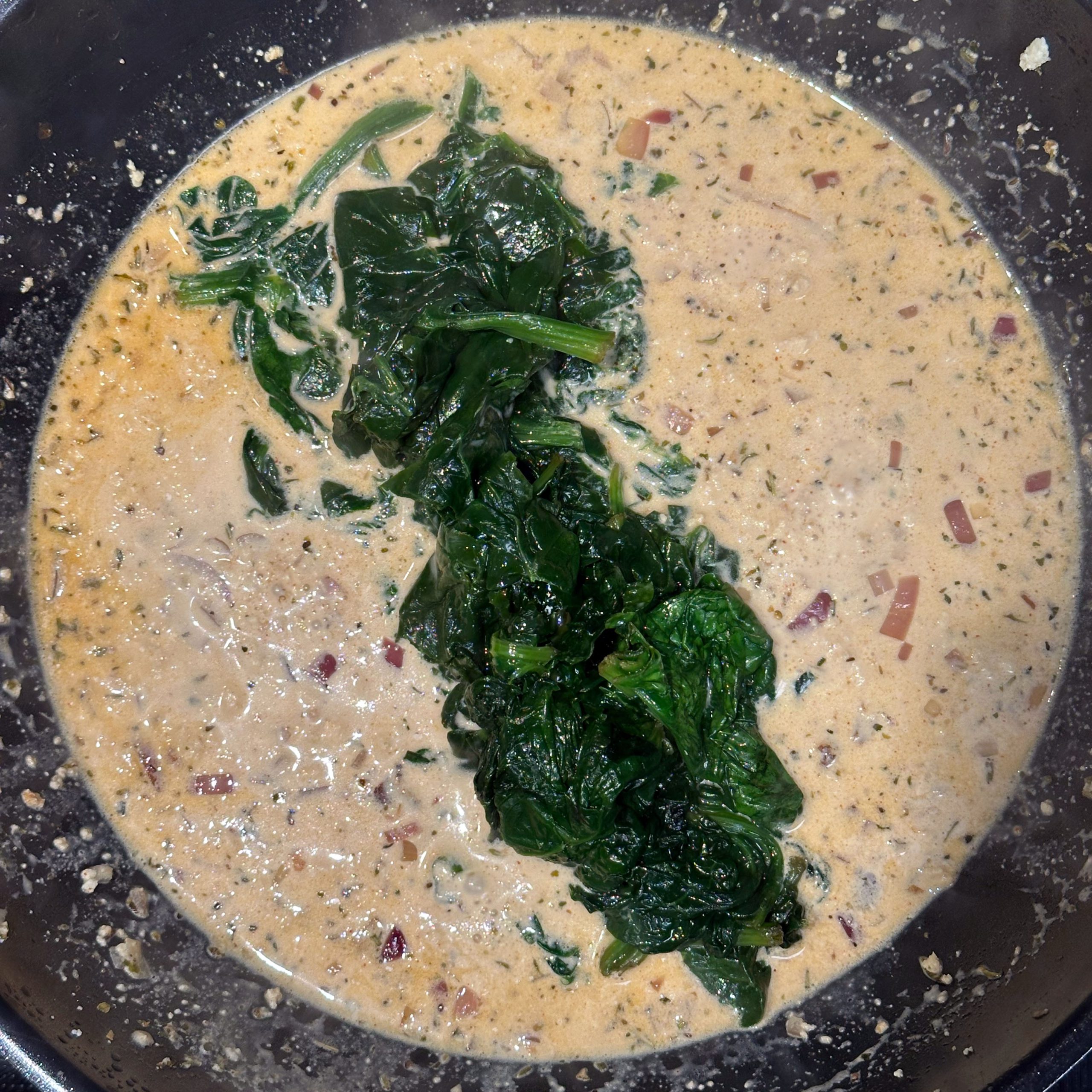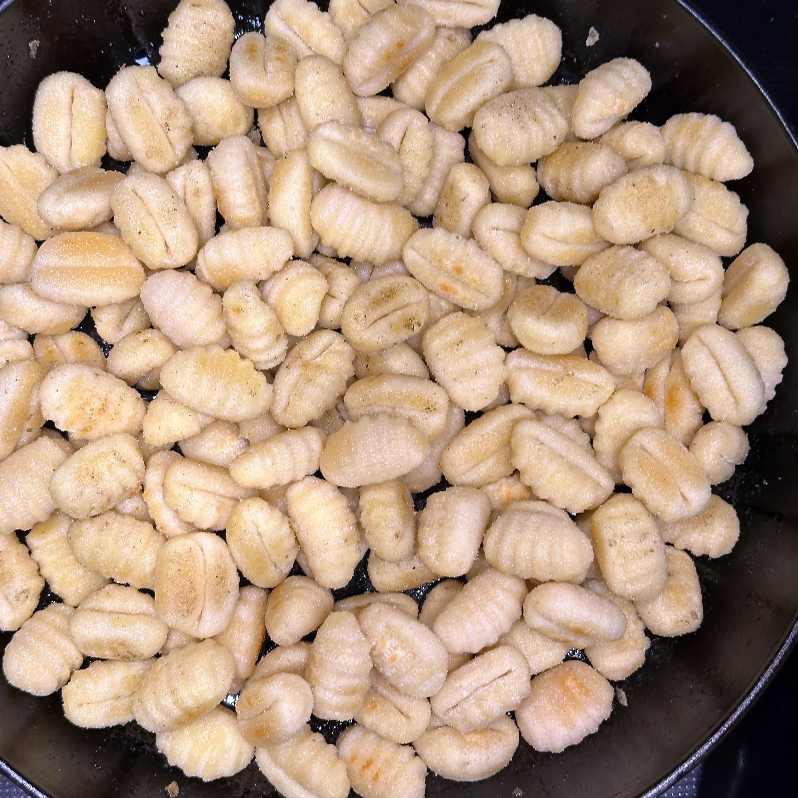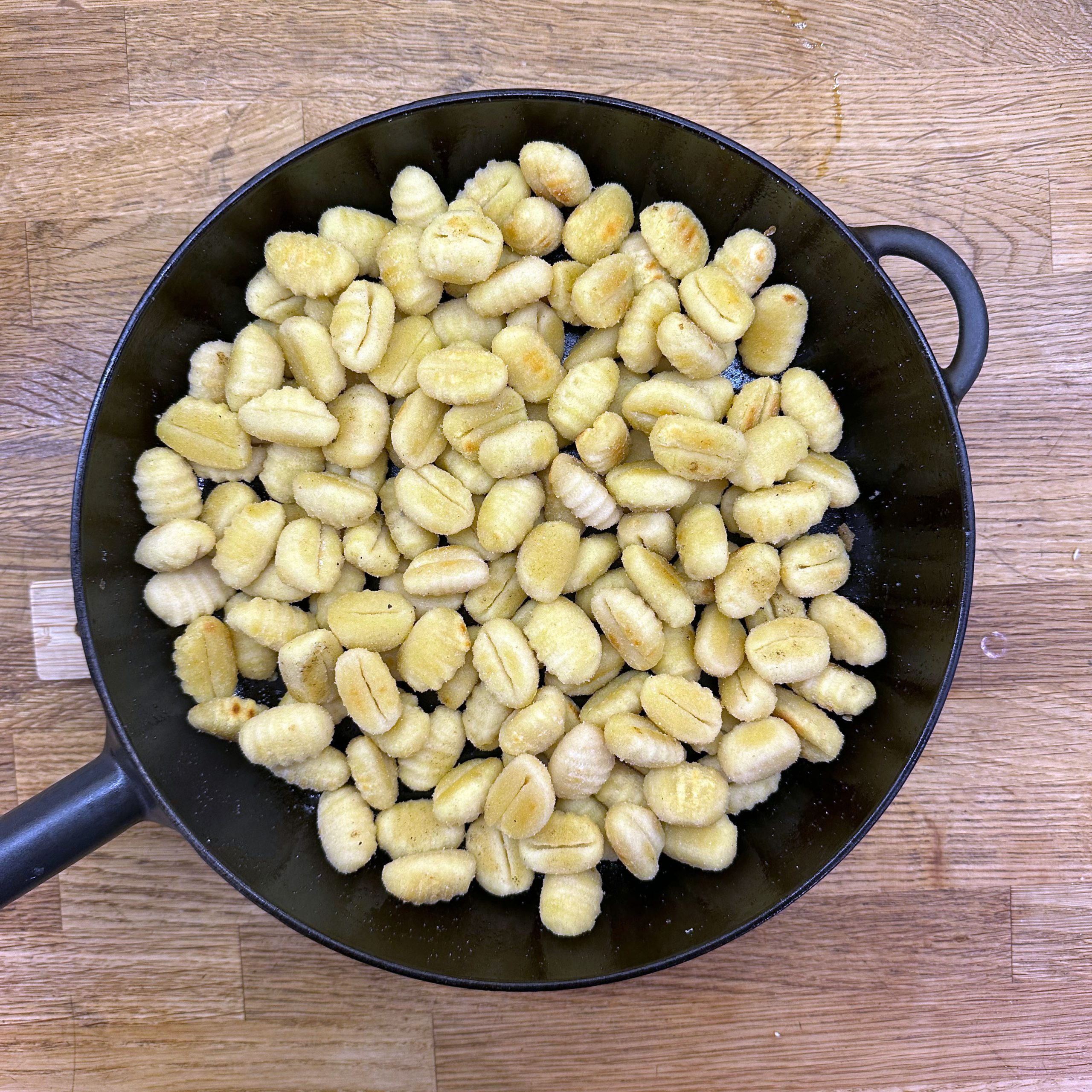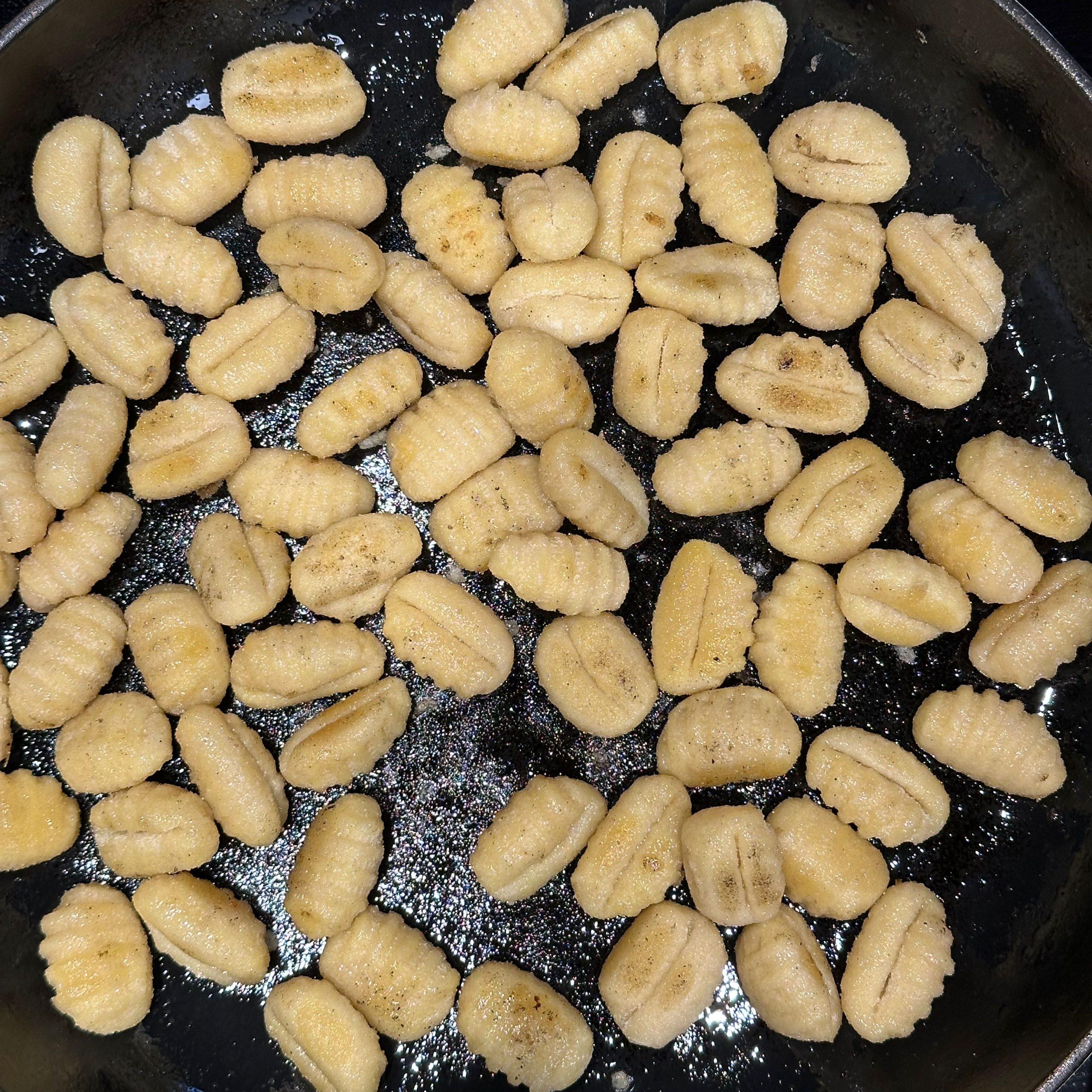 2 Packungen Gnocchi in zwei Pfannen bei geringer Hitze mit etwas Öl 20 min braten, dabei immer wieder umrühren. 400 g frischen Spinat im Wok mit etwas Öl braten, bis alles zusammengefallen ist. 1 Tofu zerbröseln und im Wok scharf anbraten, 2 gewürfelte Zwiebeln hinzufügen, mit 300 ml Brühe und 20 ml Sojasoße ablöschen, Paprika und getrocknete Kräuter einrühren und einkochen lassen. 200 ml Mandelsahne und den Spinat unterrühren, kurz aufkochen und mit Salz und Pfeffer abschmecken. Gebratene Gnocchi mit der Spinat-Tofu-Soße in Schüsseln servieren.