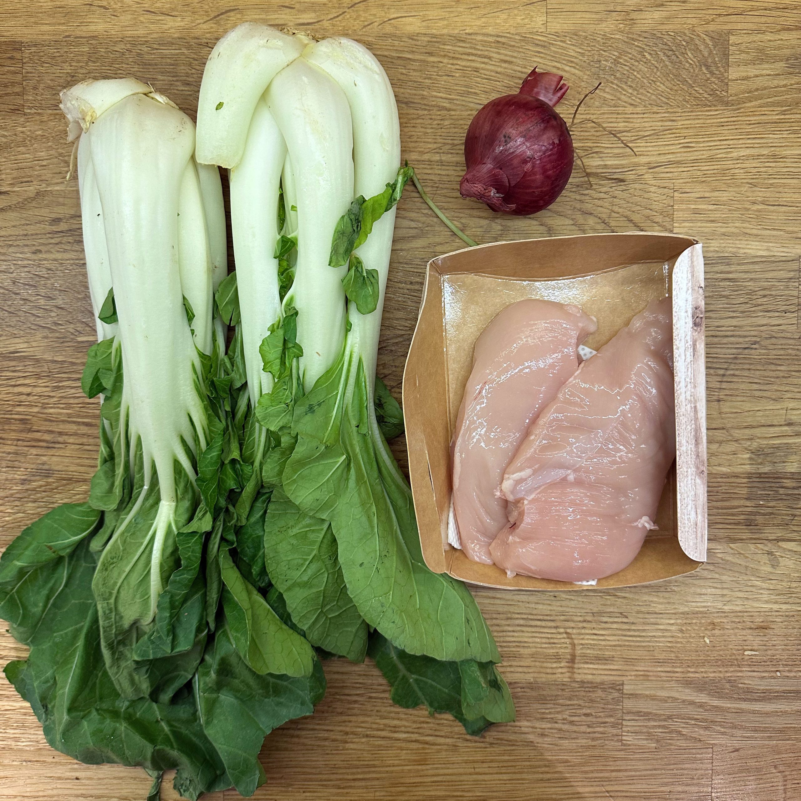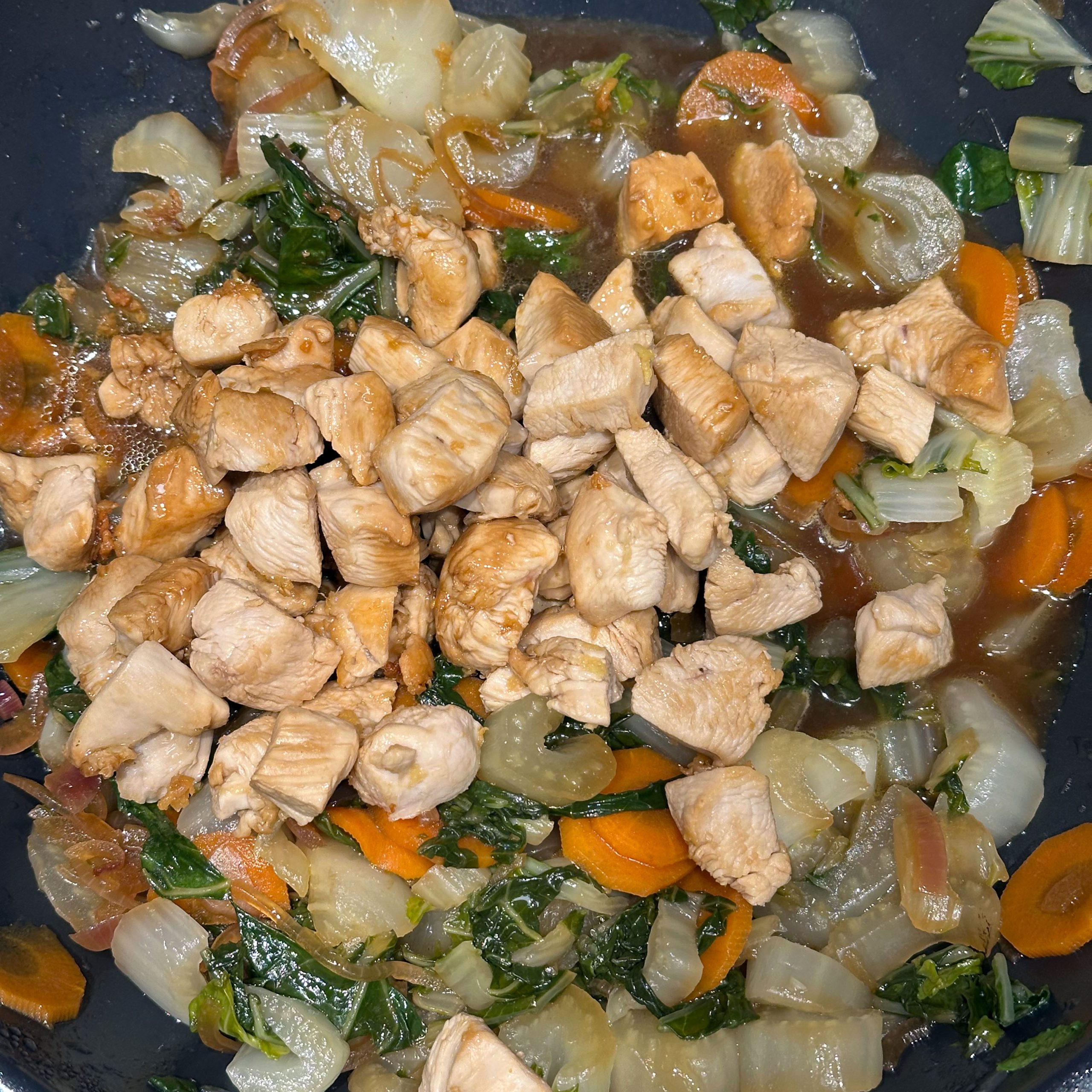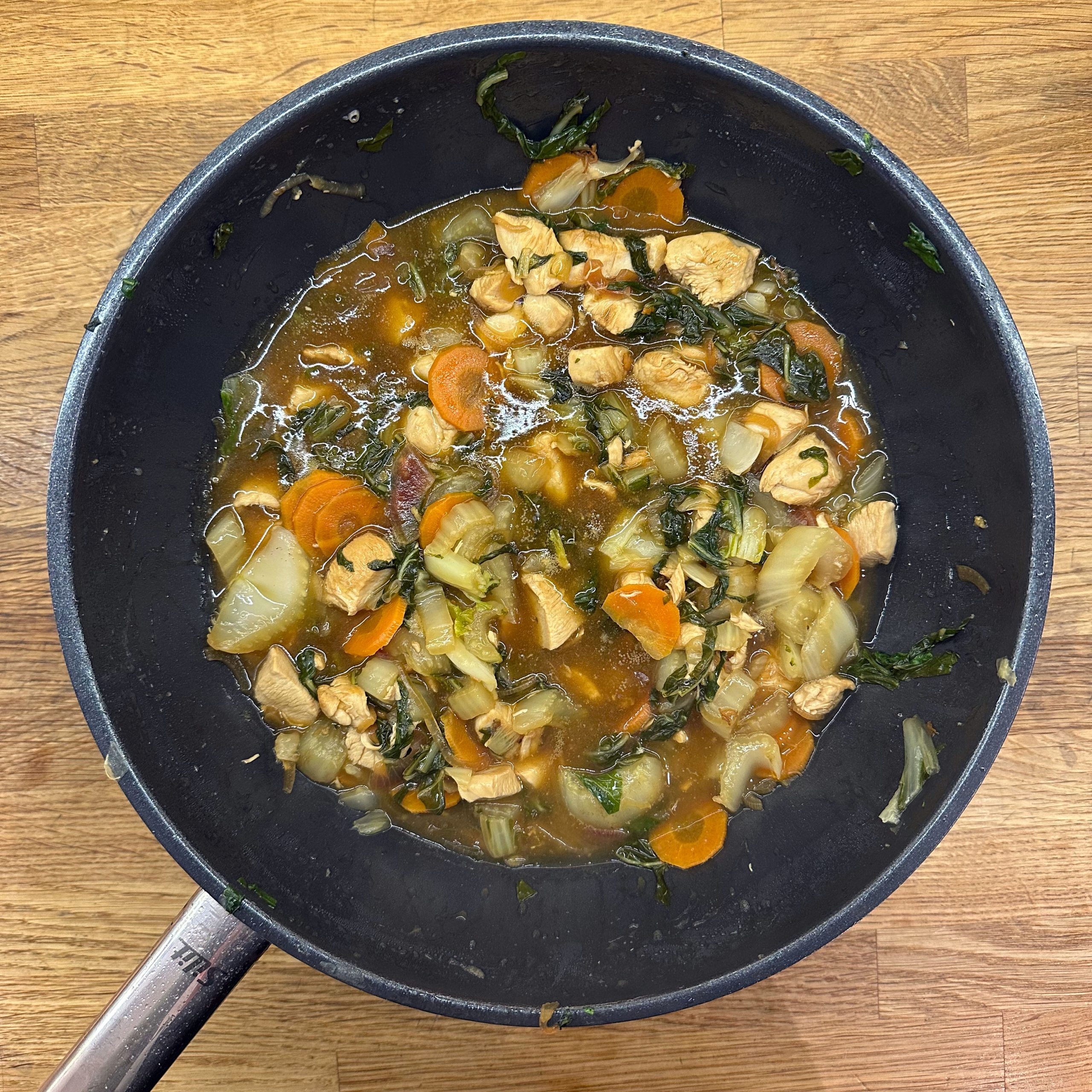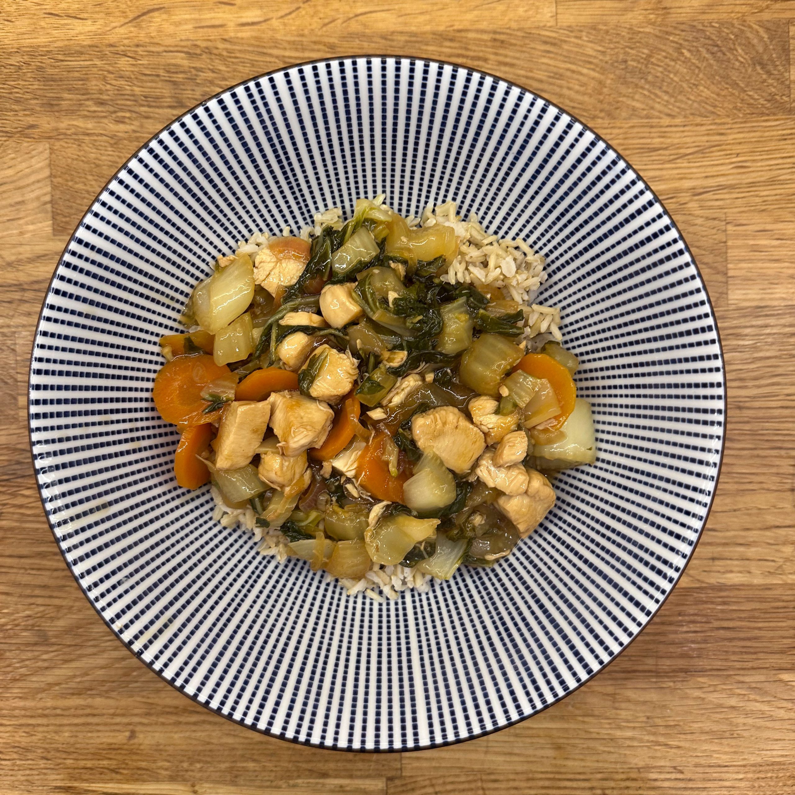 0,75 Tasse Vollkornreis gut waschen und mit der 1,25-fachen Menge Wasser aufkochen, dann 40 Minuten bei niedriger Hitze garen. 400g Hähnchenbrust waschen, trocken tupfen, in mundgerechte Stücke schneiden und in einem Wok in 2 Chargen 4min scharf anbraten, dann in einer Marinade aus Sojasoße, geriebenem Ingwer und Zitronensaft ziehen lassen. 1 Zwiebel würfeln und in dem Wok braten, 1 geraspelte Möhre hinzufügen und mit 100ml Gemüsebrühe 4min köcheln lassen, mit Zitronensaft und Sojasoße abschmecken. 700g Pak Choi waschen, die Blätter vom Strunk schneiden, die Stiele in Streifen schneiden und im Wok bei hoher Hitze mit geschlossenem Deckel braten, dabei ab und zu umrühren, nach 8 Minuten die Blätter hinzugeben, Deckel drauf, bis alles zusammengefallen ist. Die Zwiebelbrühe mit Möhren hinzufügen, 1 EL Stärke in etwas Wasser angerührt unterrühren und aufkochen lassen, die marinierte Hähnchenbrust hinzufügen und kurz erwärmen. Das Gericht mit dem gekochten Vollkornreis servieren.