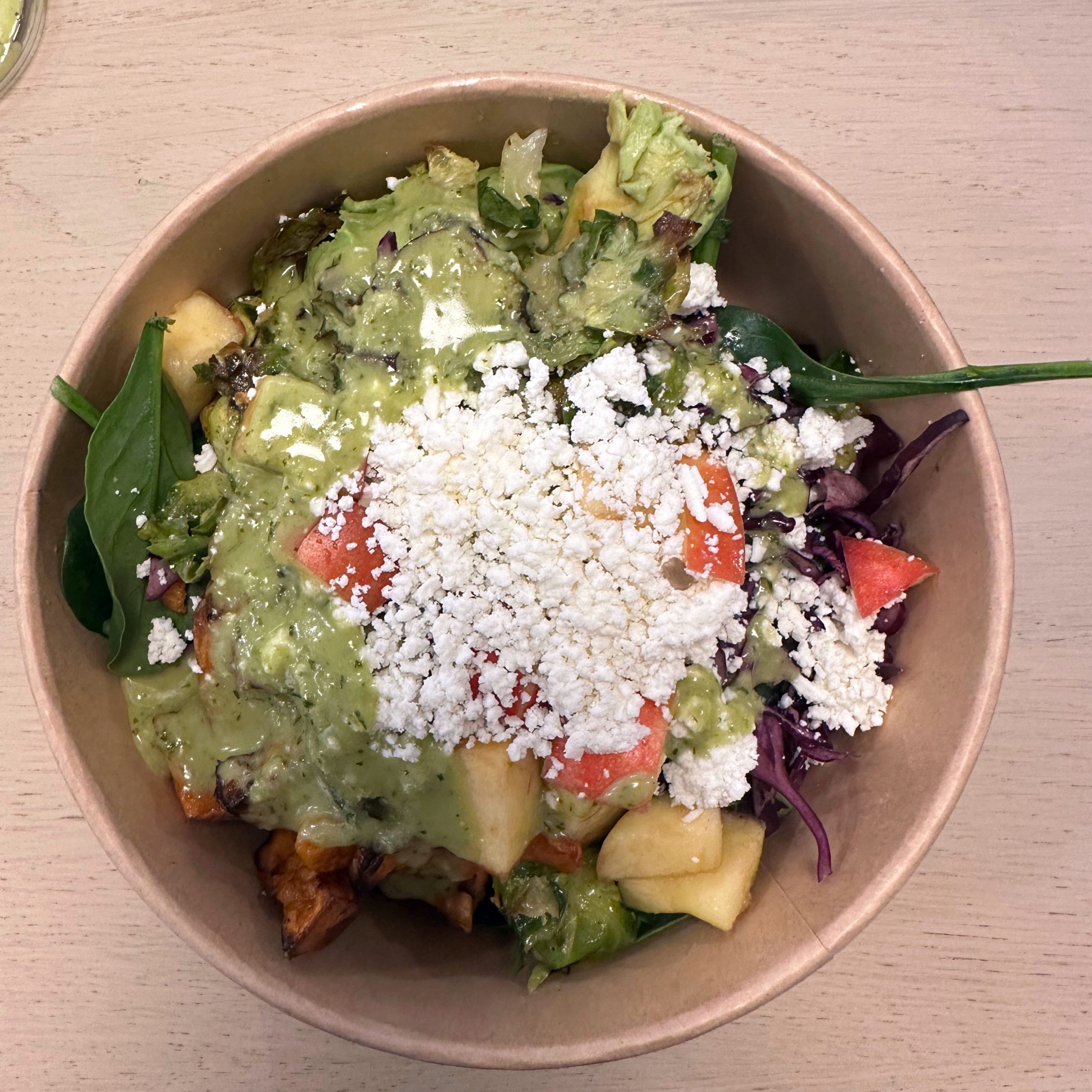 Bowl mit Reis, planted Chicken, Rosenkohl, Süßkartoffel, Rotkohl, Apfel, Avocado, Bio-Feta, Spinat. War ok, alles bio, aber etwas teuer.