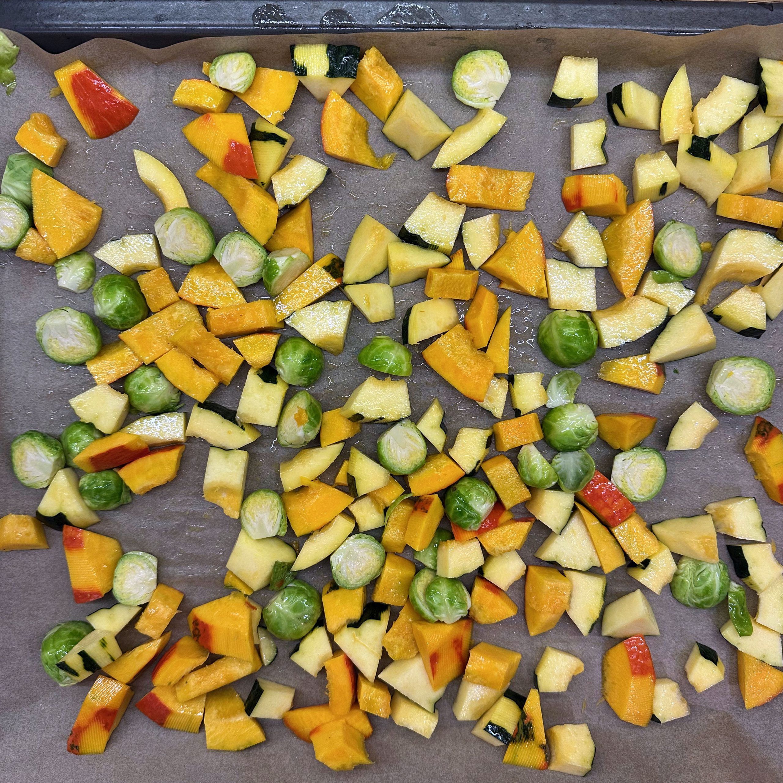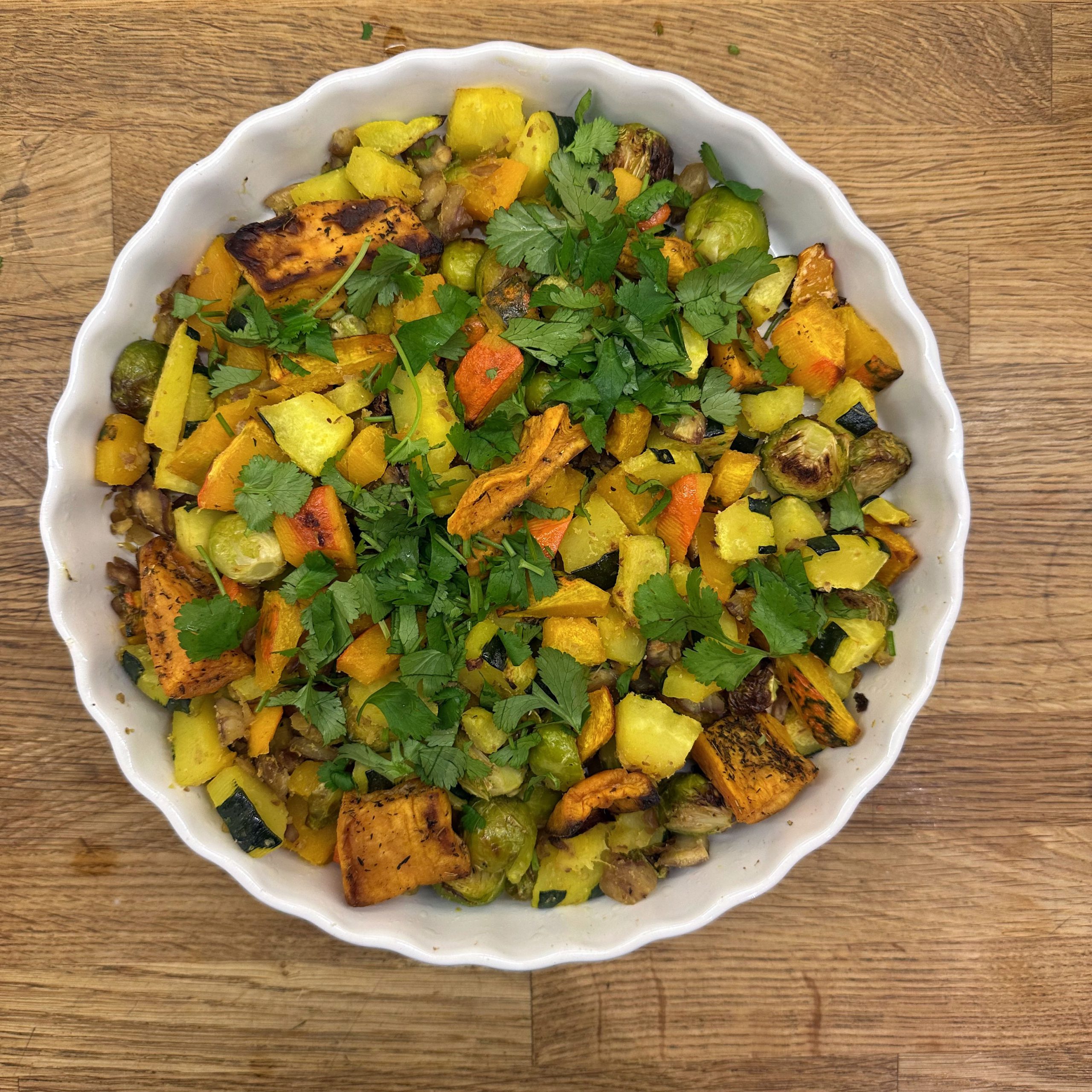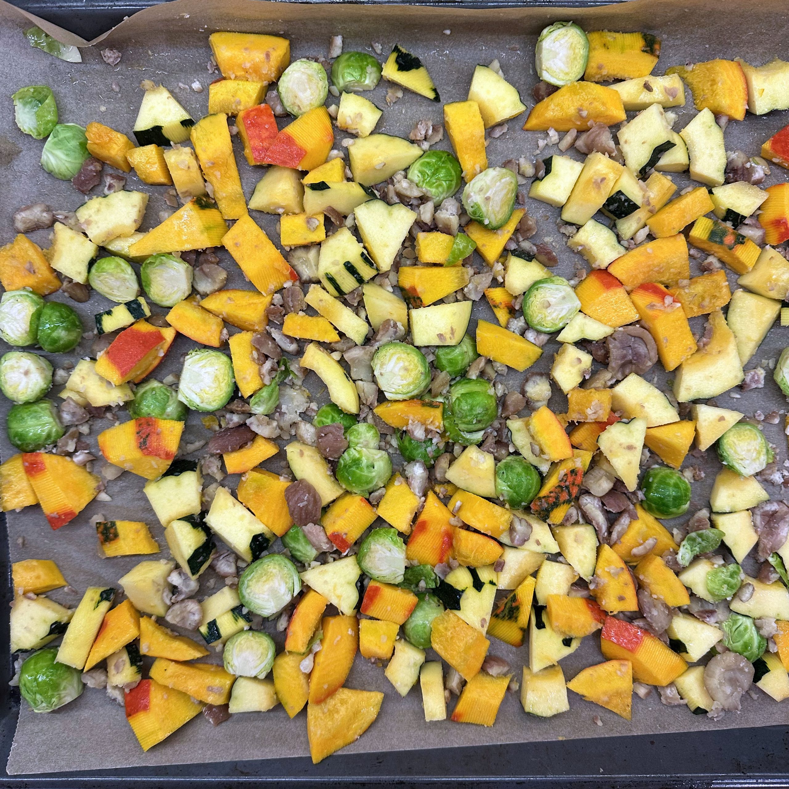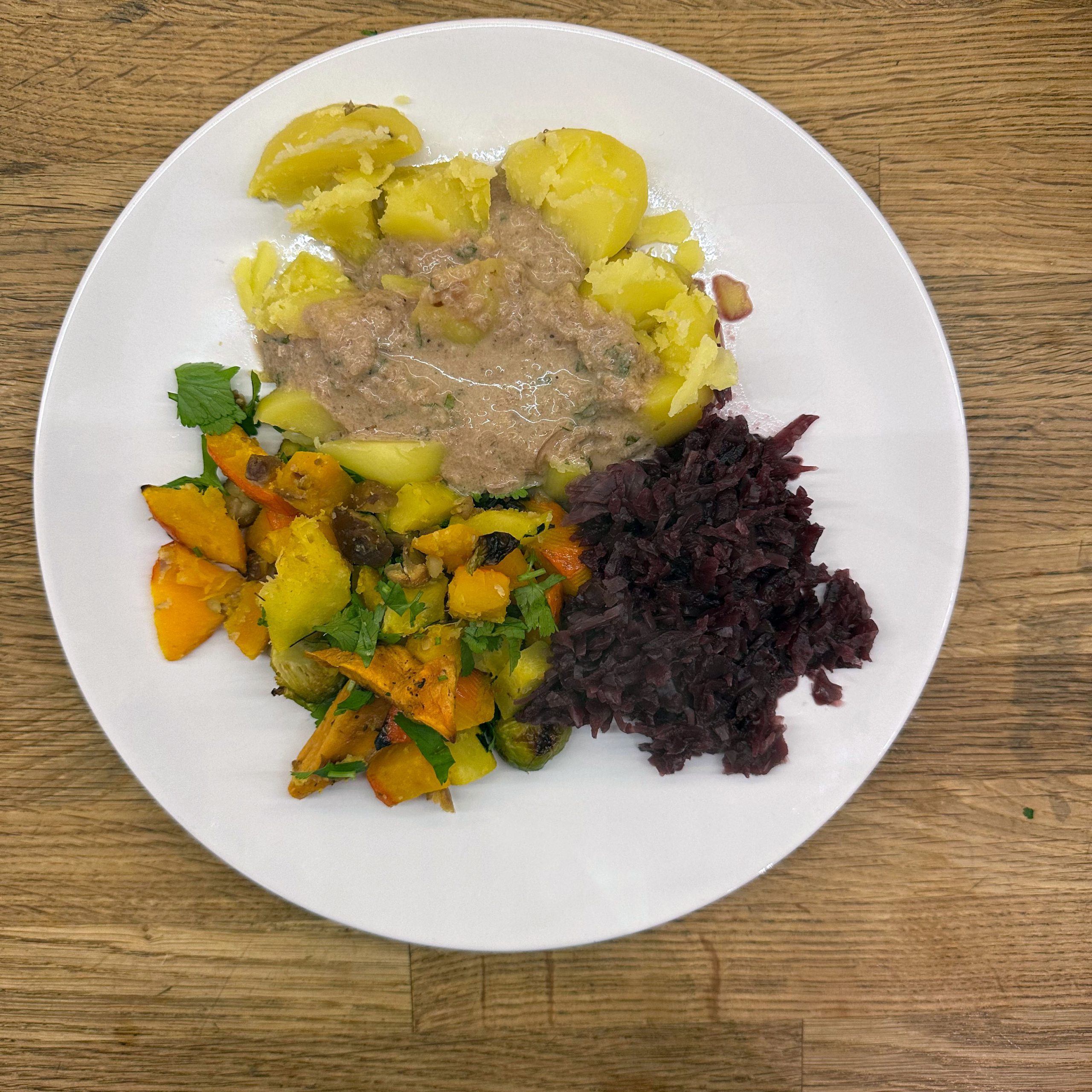 1 kleiner Hokkaido und 1 kleiner Muskatkürbis in Stücke schneiden, Rosenkohl putzen und halbieren, Maronen zerbröselt dazugeben, mit Salz und 3EL Öl vermischen und alles bei 200° Umluft 20 min backen. Kartoffeln schälen, in Hälften schneiden und in Salzwasser weich kochen. Rotkohl aus dem Glas erwärmen und bei milder Hitze köcheln lassen. 2 große rote Zwiebeln in Ringe schneiden und 20 min braten, dann mit Kokosmilch pürieren und mit Zitrone und Sojasoße abschmecken. Ofengemüse, Kartoffeln und Rotkohl auf Tellern anrichten, mit frischem Koriander bestreuen und mit der Kokos-Zwiebelsoße übergießen.