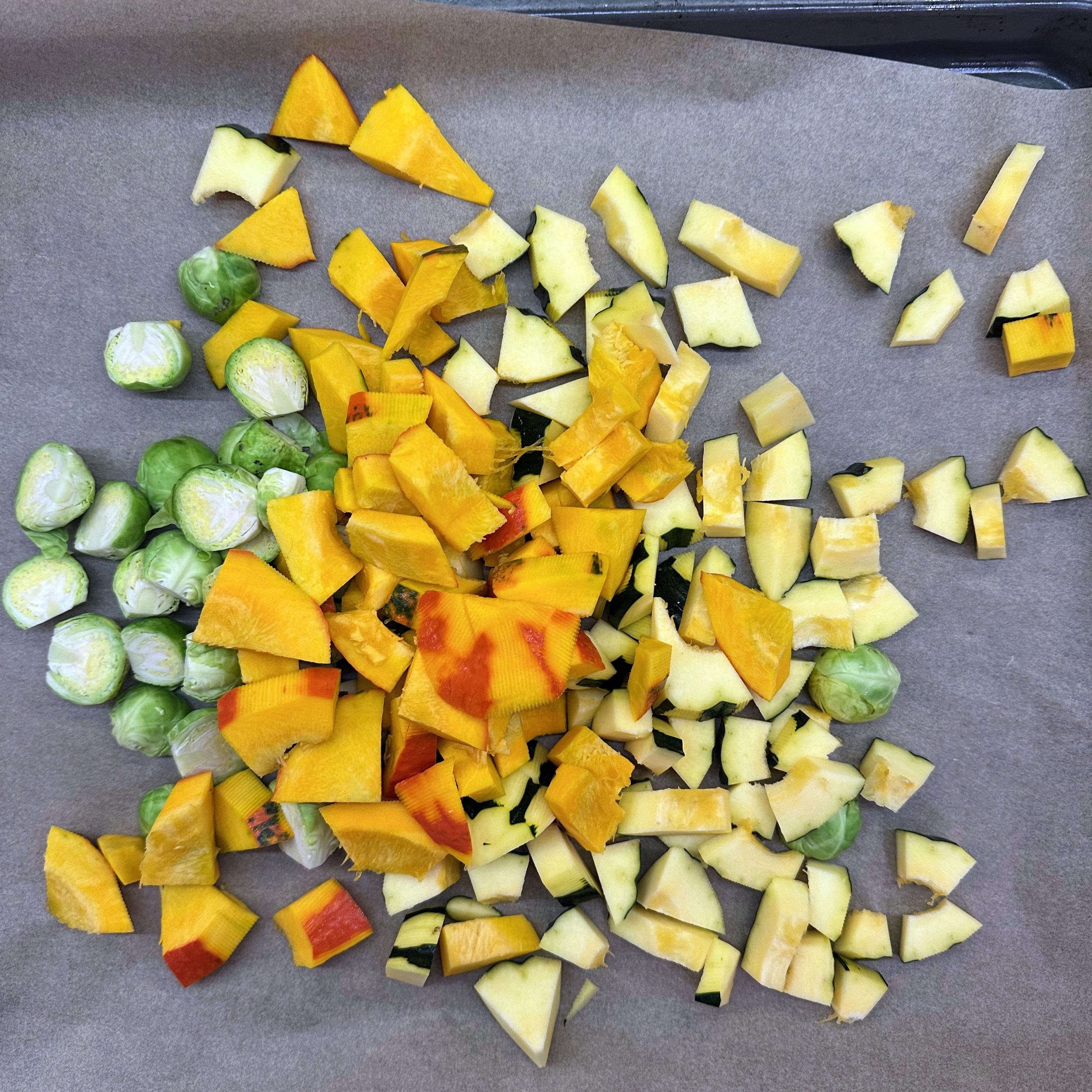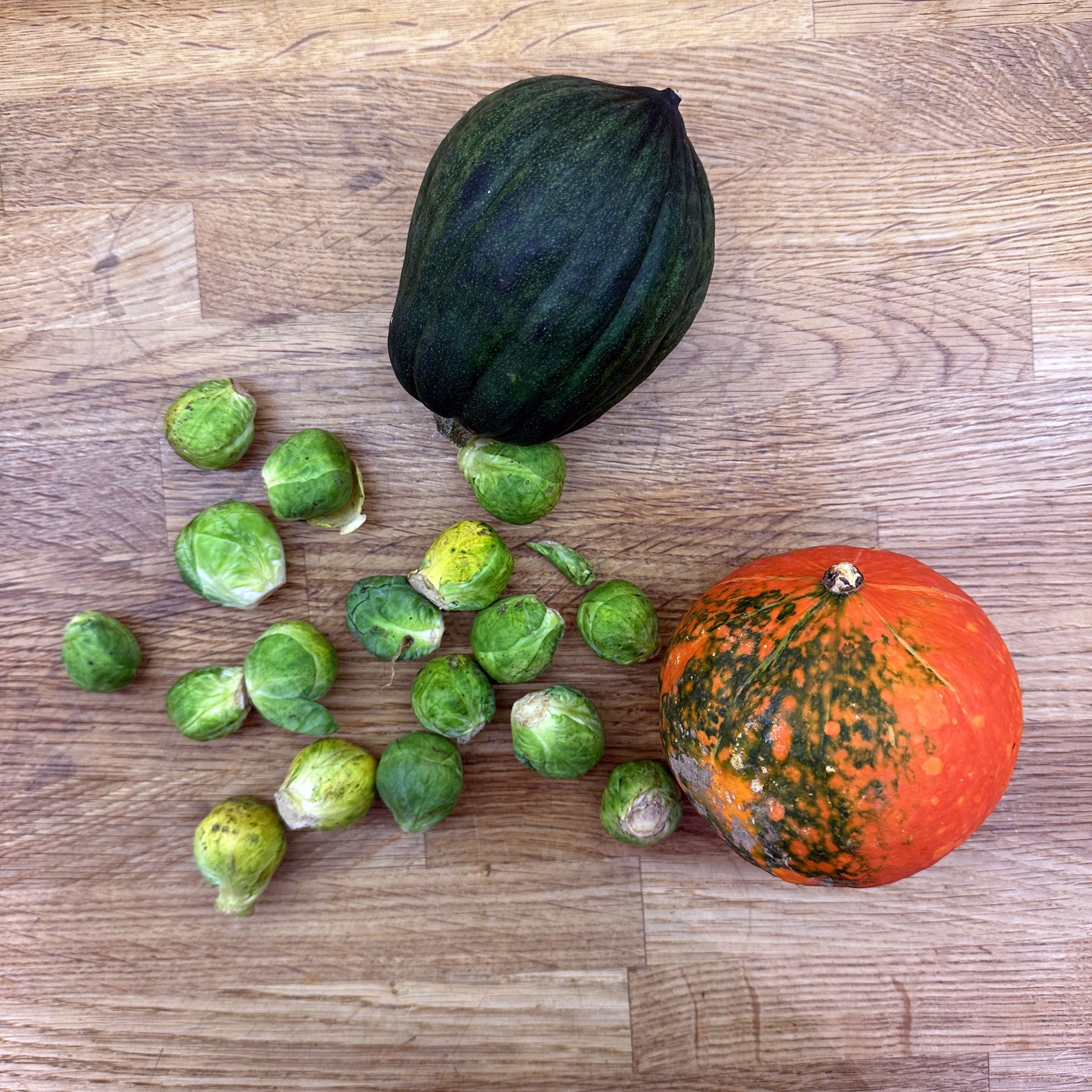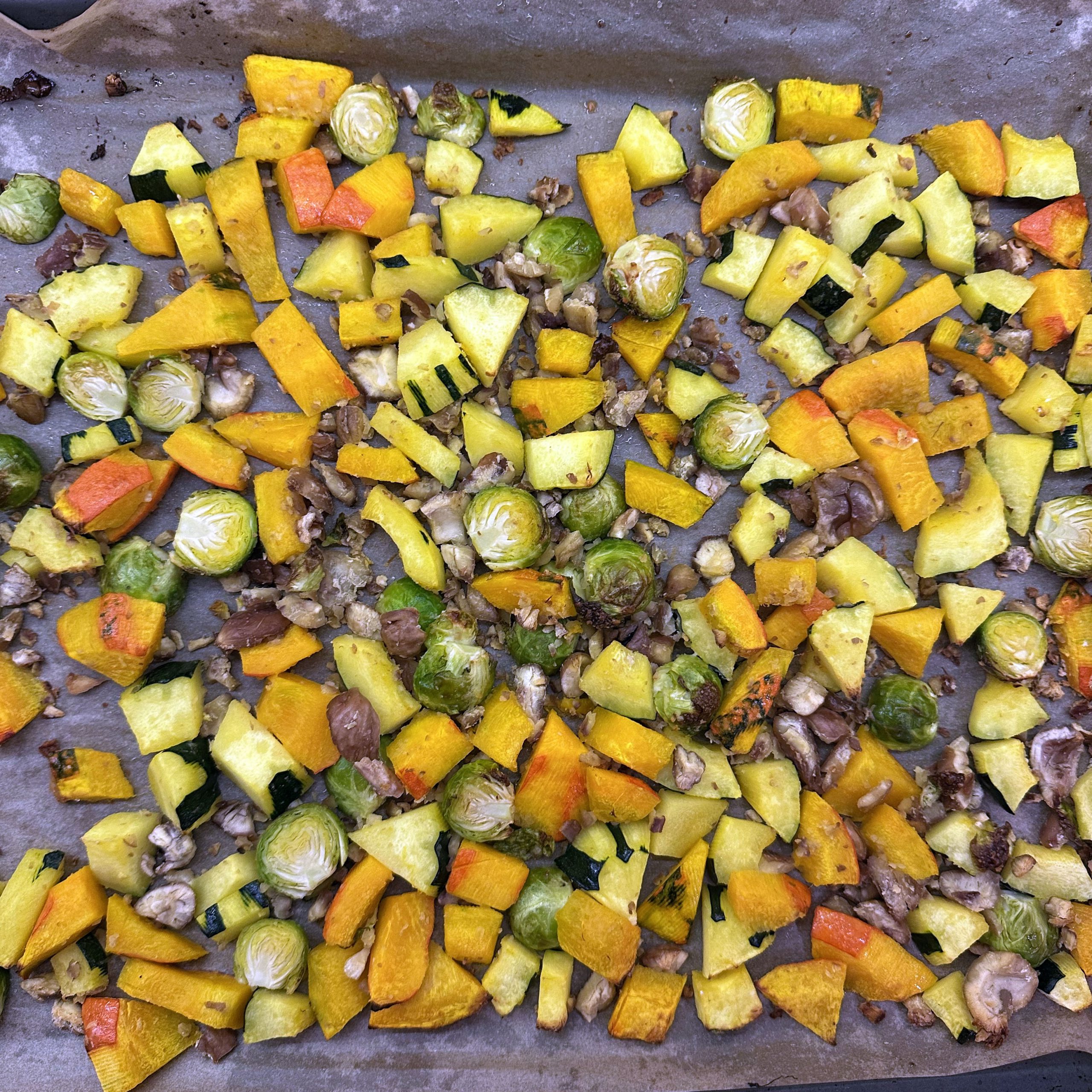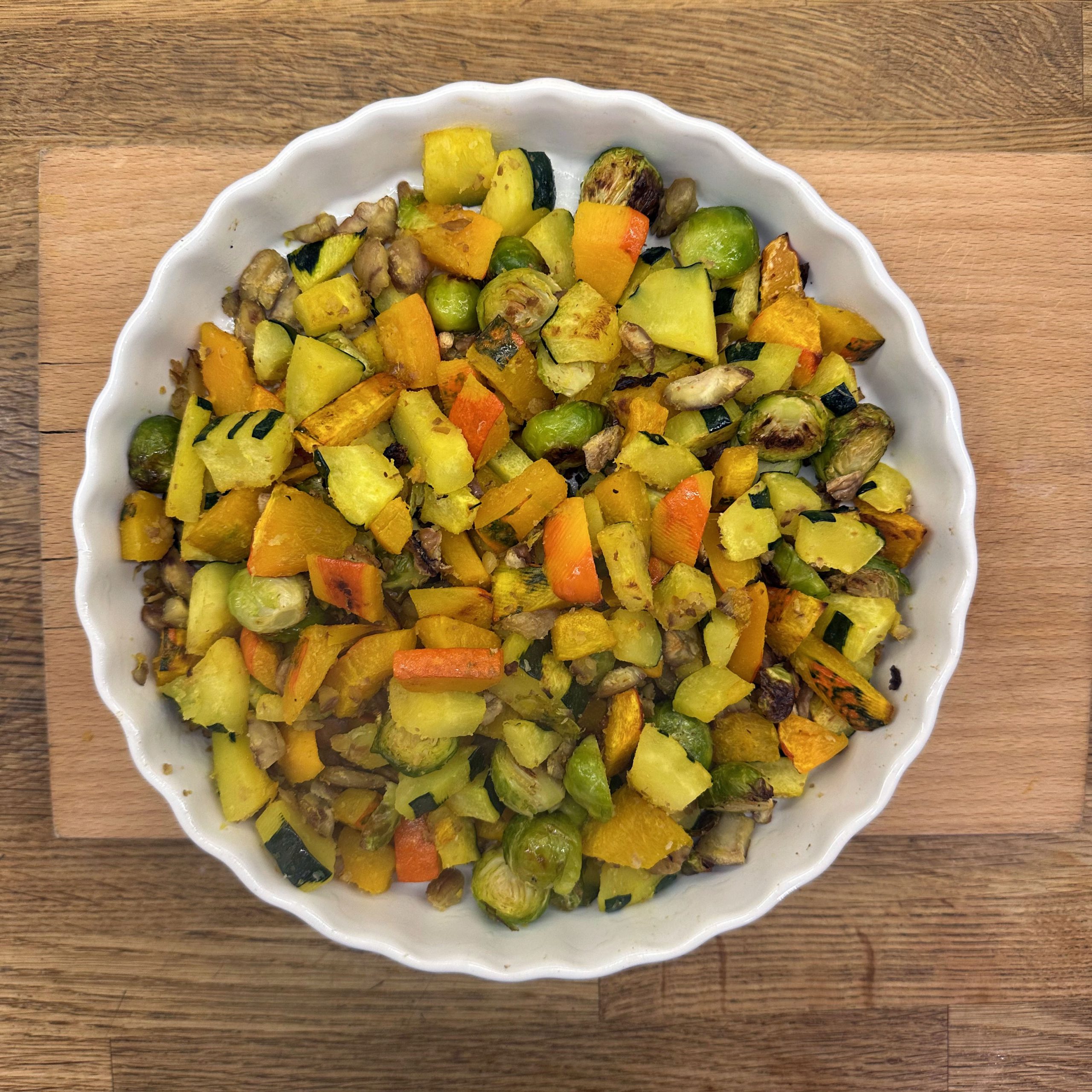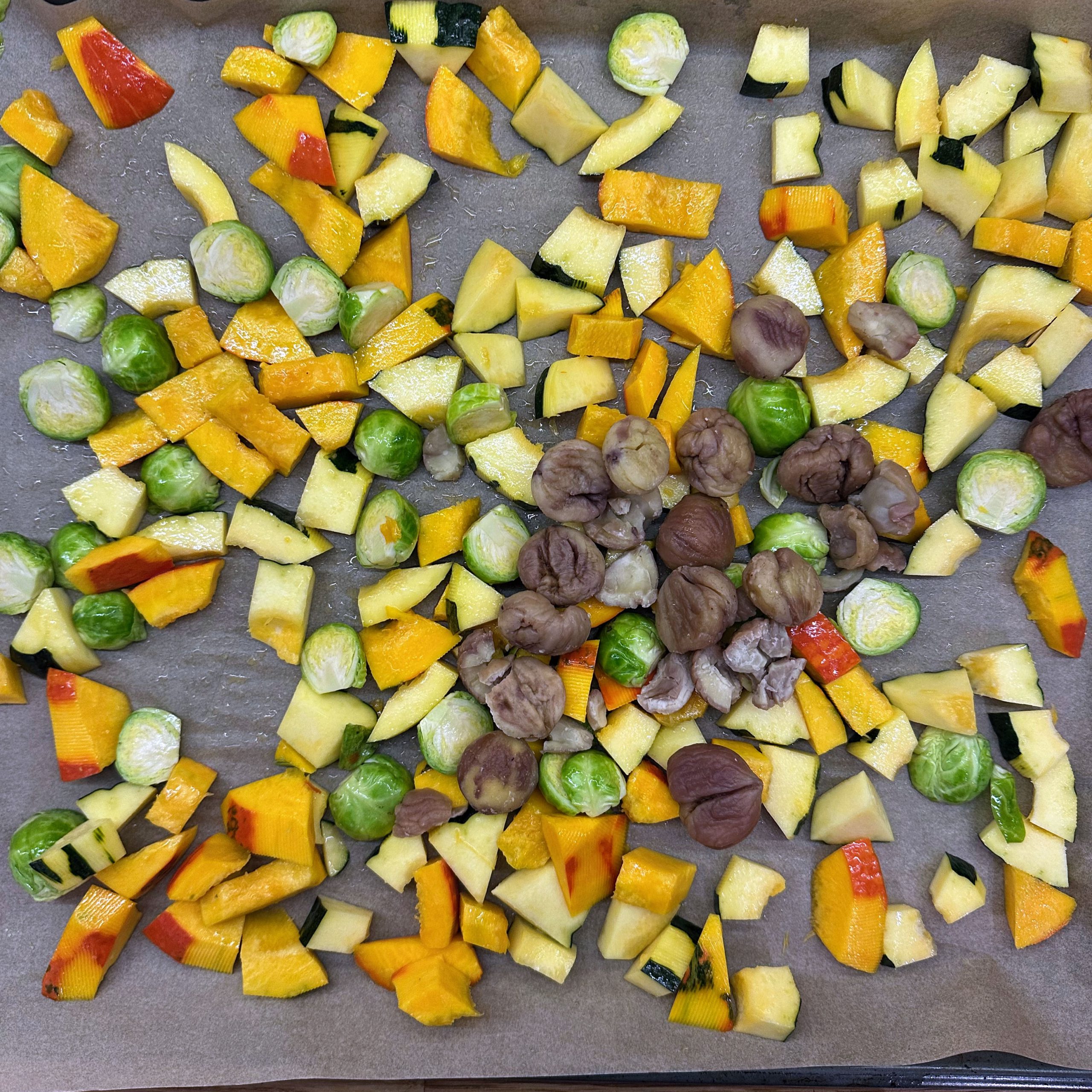 1 kleiner Hokkaido und 1 kleiner Muskatkürbis in Stücke schneiden, Rosenkohl putzen und halbieren, Maronen zerbröselt dazugeben, mit Salz und 3EL Öl vermischen und alles bei 200° Umluft 20 min backen. Kartoffeln schälen, in Hälften schneiden und in Salzwasser weich kochen. Rotkohl aus dem Glas erwärmen und bei milder Hitze köcheln lassen. 2 große rote Zwiebeln in Ringe schneiden und 20 min braten, dann mit Kokosmilch pürieren und mit Zitrone und Sojasoße abschmecken. Ofengemüse, Kartoffeln und Rotkohl auf Tellern anrichten, mit frischem Koriander bestreuen und mit der Kokos-Zwiebelsoße übergießen.