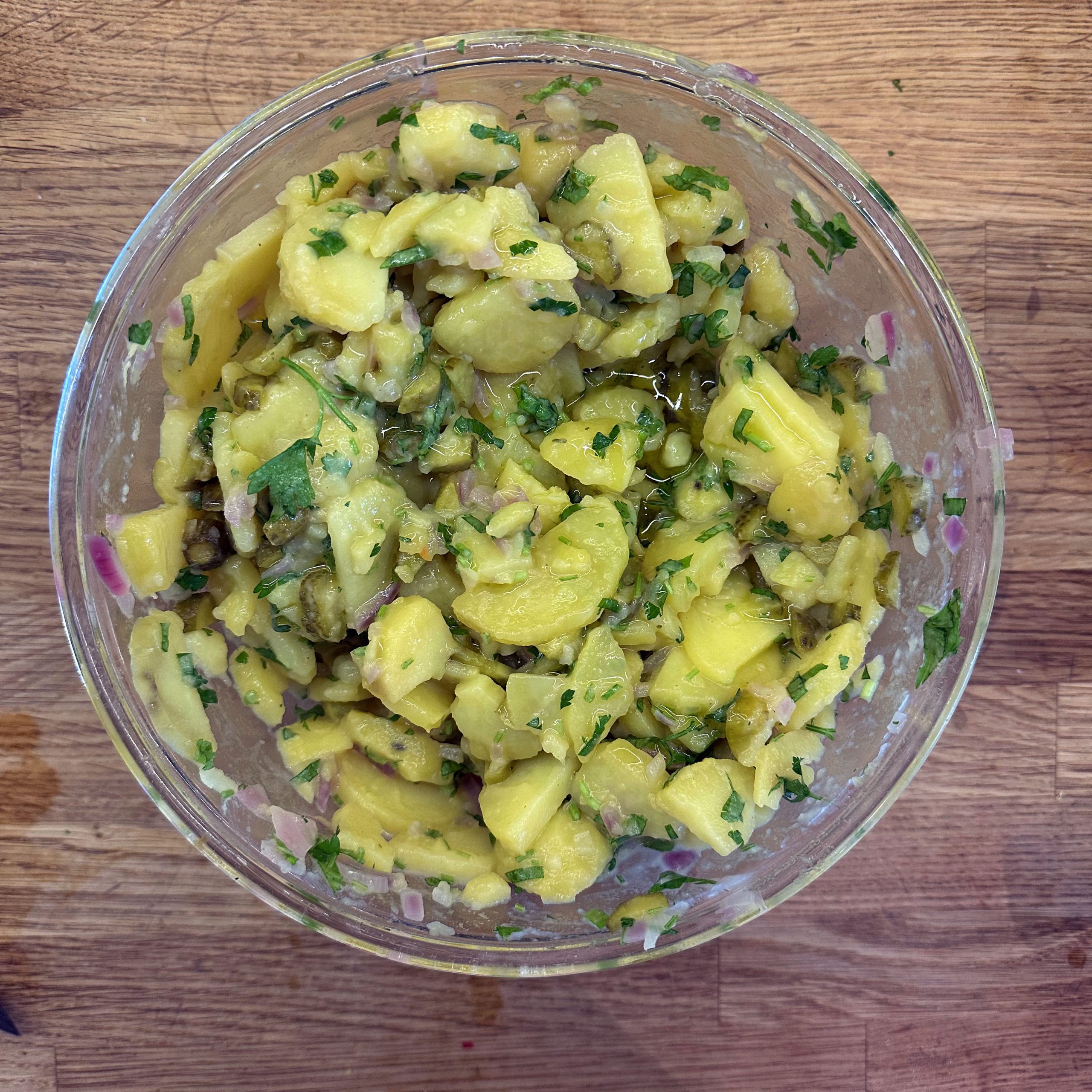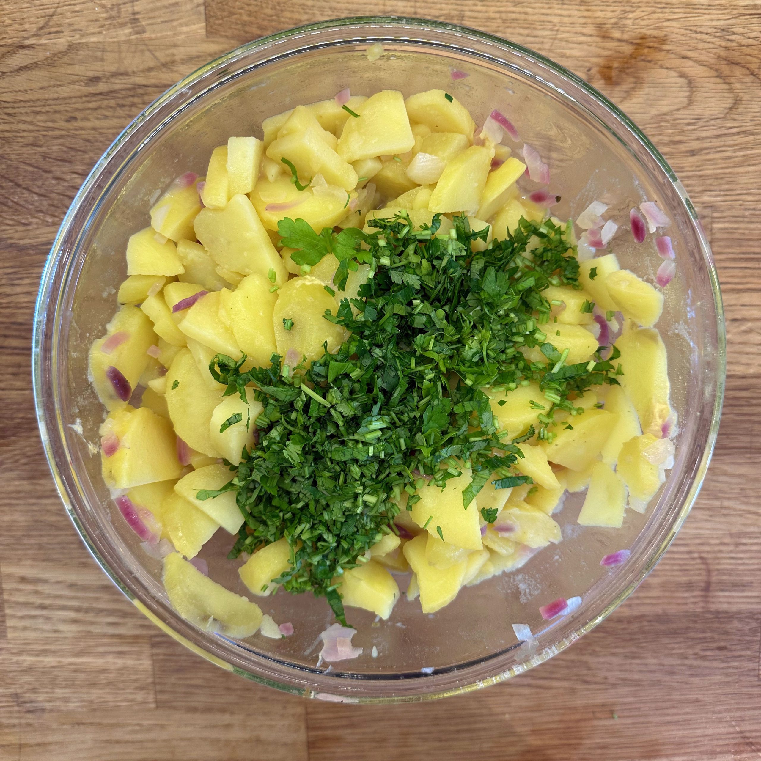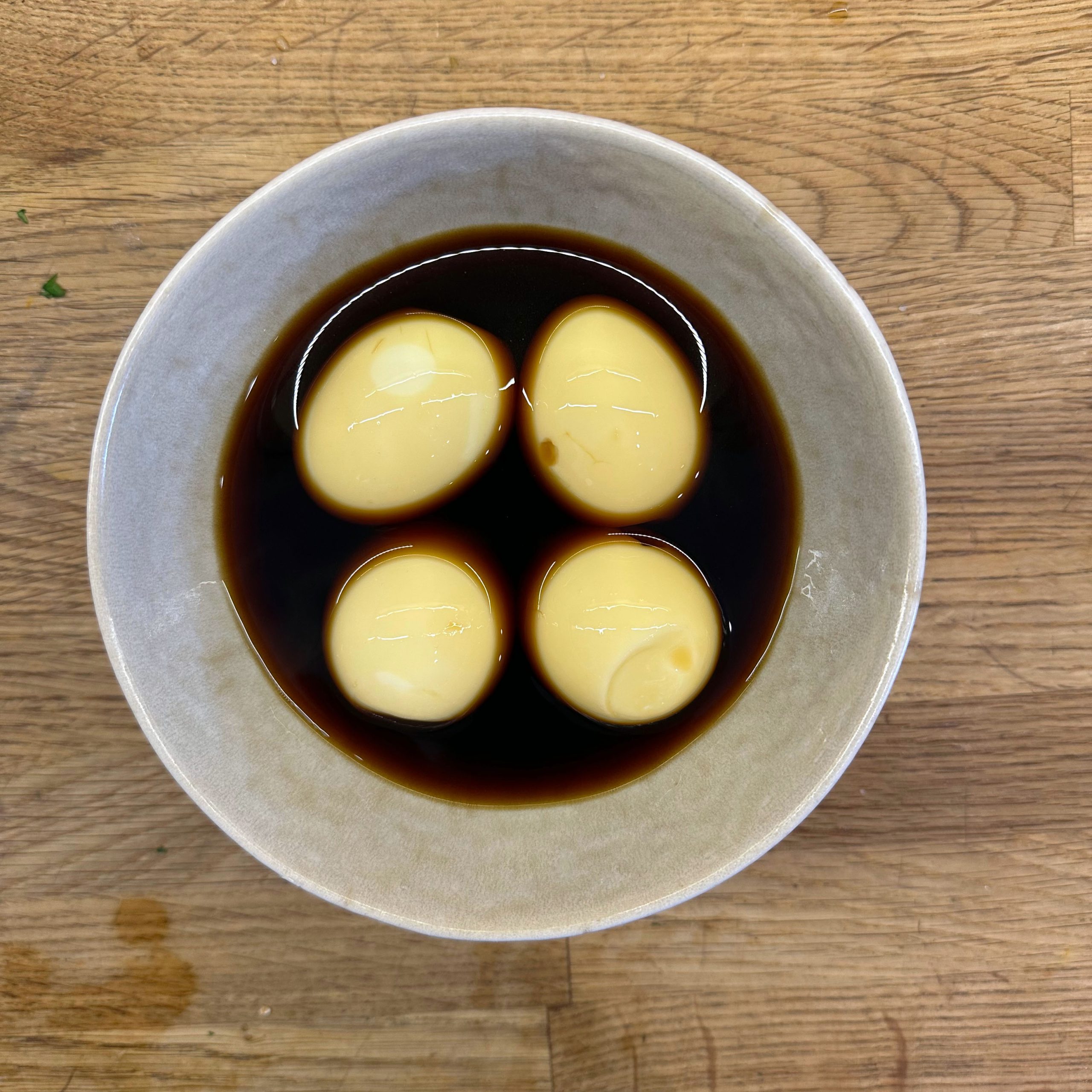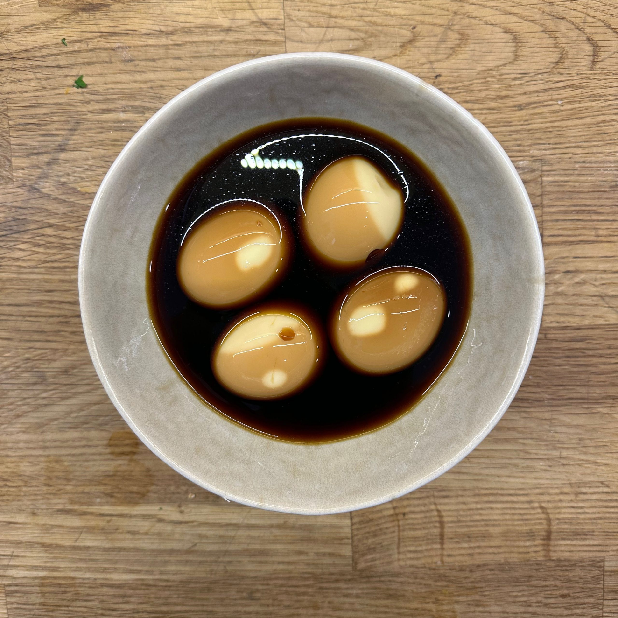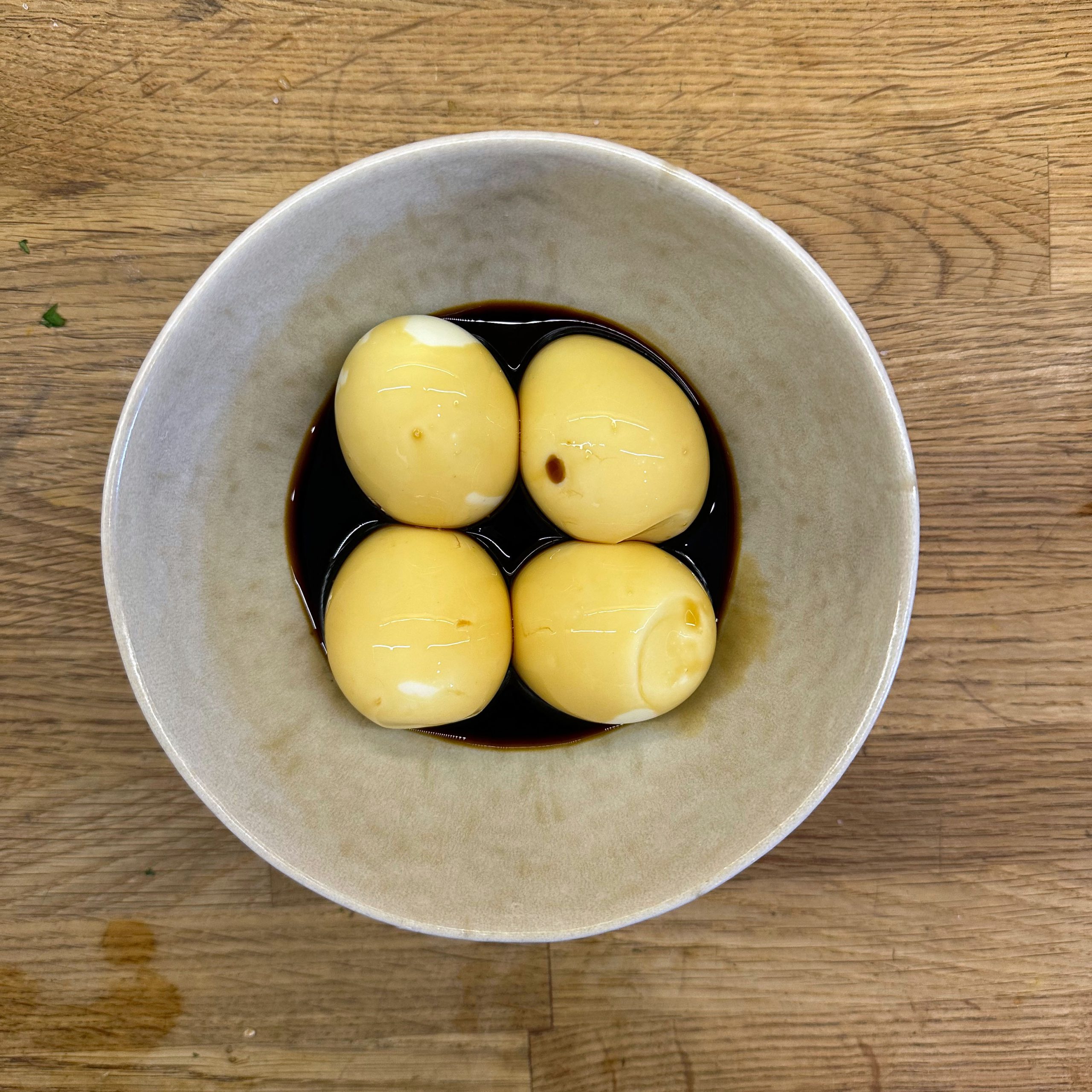 1 kg Kartoffeln mit Schale in Salzwasser weich kochen, abgießen, ausdampfen lassen, pellen und in Scheiben schneiden. 2 gewürfelte Zwiebeln in etwas Öl anbraten, mit 250 ml Brühe ablöschen und kurz köcheln lassen, 1 EL Senf, 4 EL Essig und 1 TL Salz unterrühren. Kartoffeln mit dem warmen Dressing übergießen und mindestens 2 h ziehen lassen, dann 4 EL Öl und 0,5 Bund gehackte Petersilie unterrühren. 4 Eier in kaltem Wasser aufsetzen, aufkochen und 9 min kochen, herausnehmen, kalt abschrecken, pellen und in einer Mischung aus gleichen Teilen Sojasoße und Wasser mindestens 2 h einlegen, dabei gelegentlich wenden. 500 g frischen Spinat in etwas Olivenöl kurz anbraten, bis er zusammengefallen ist, leicht salzen. Eingelegte Eier aus der Marinade nehmen, halbieren und mit dem Kartoffelsalat und dem Spinat auf einem Teller anrichten.