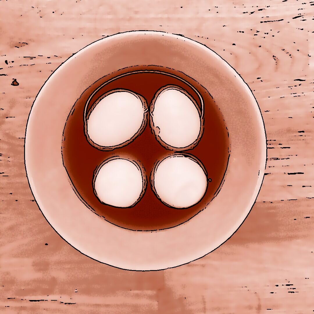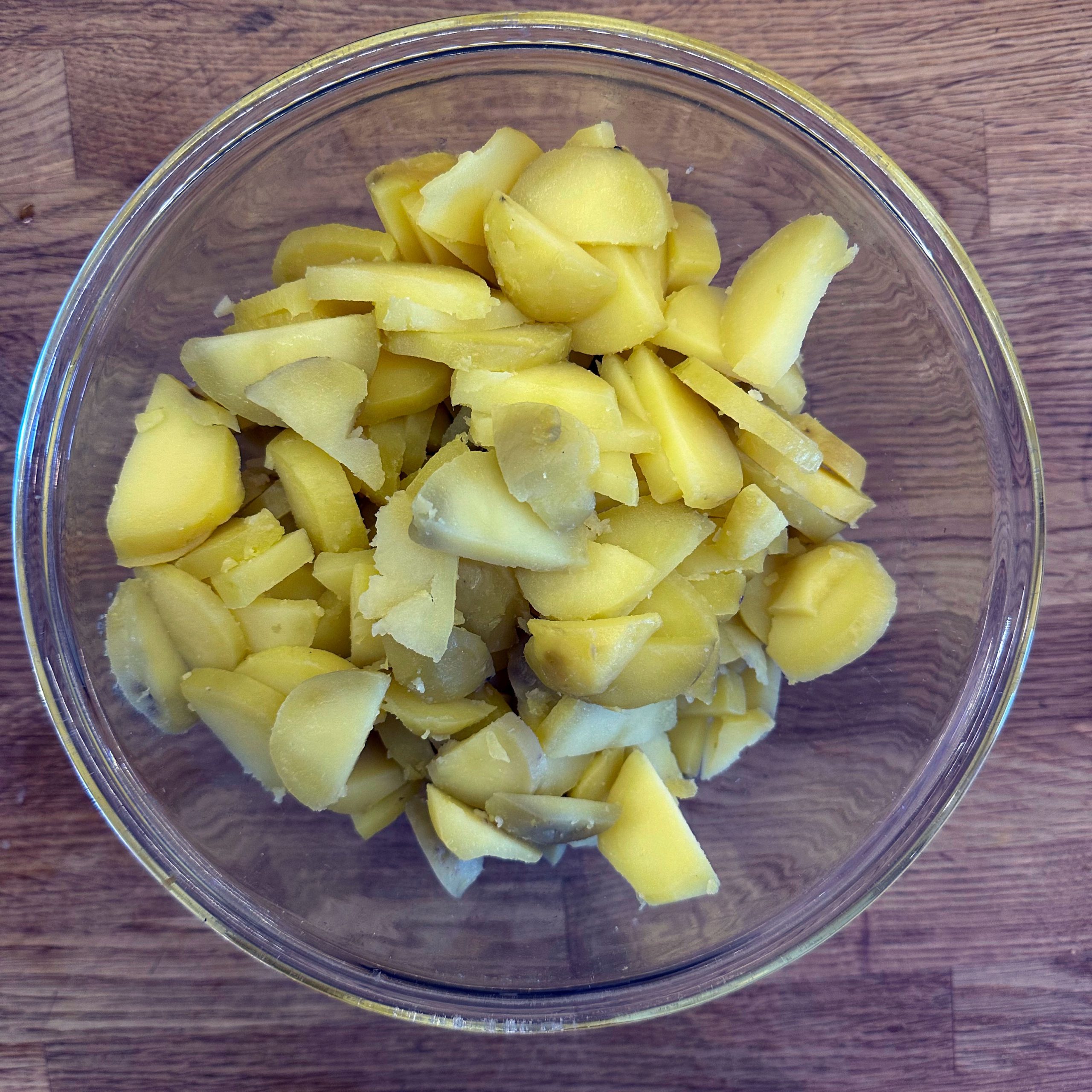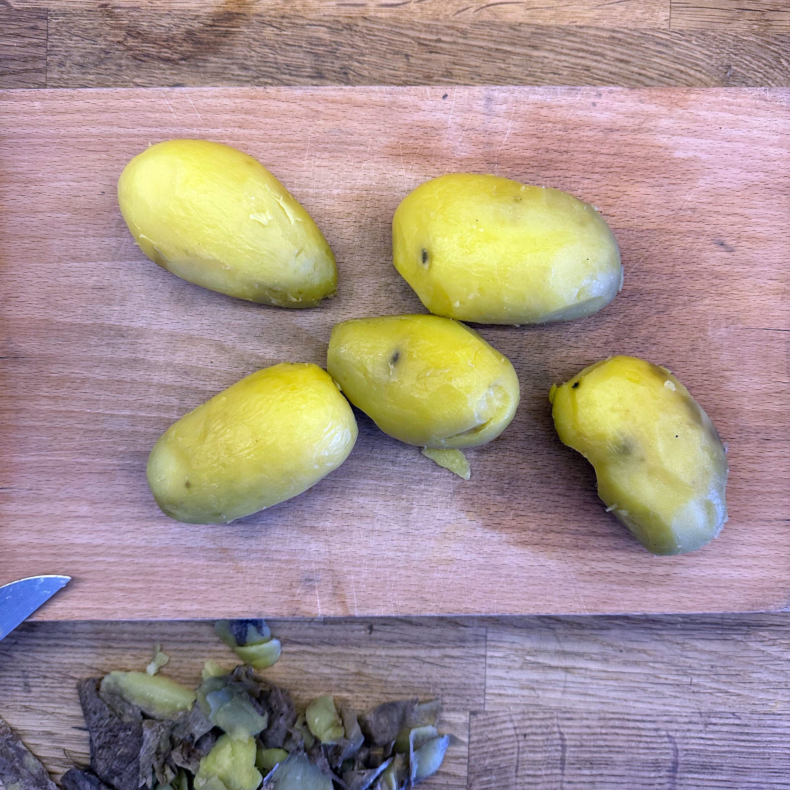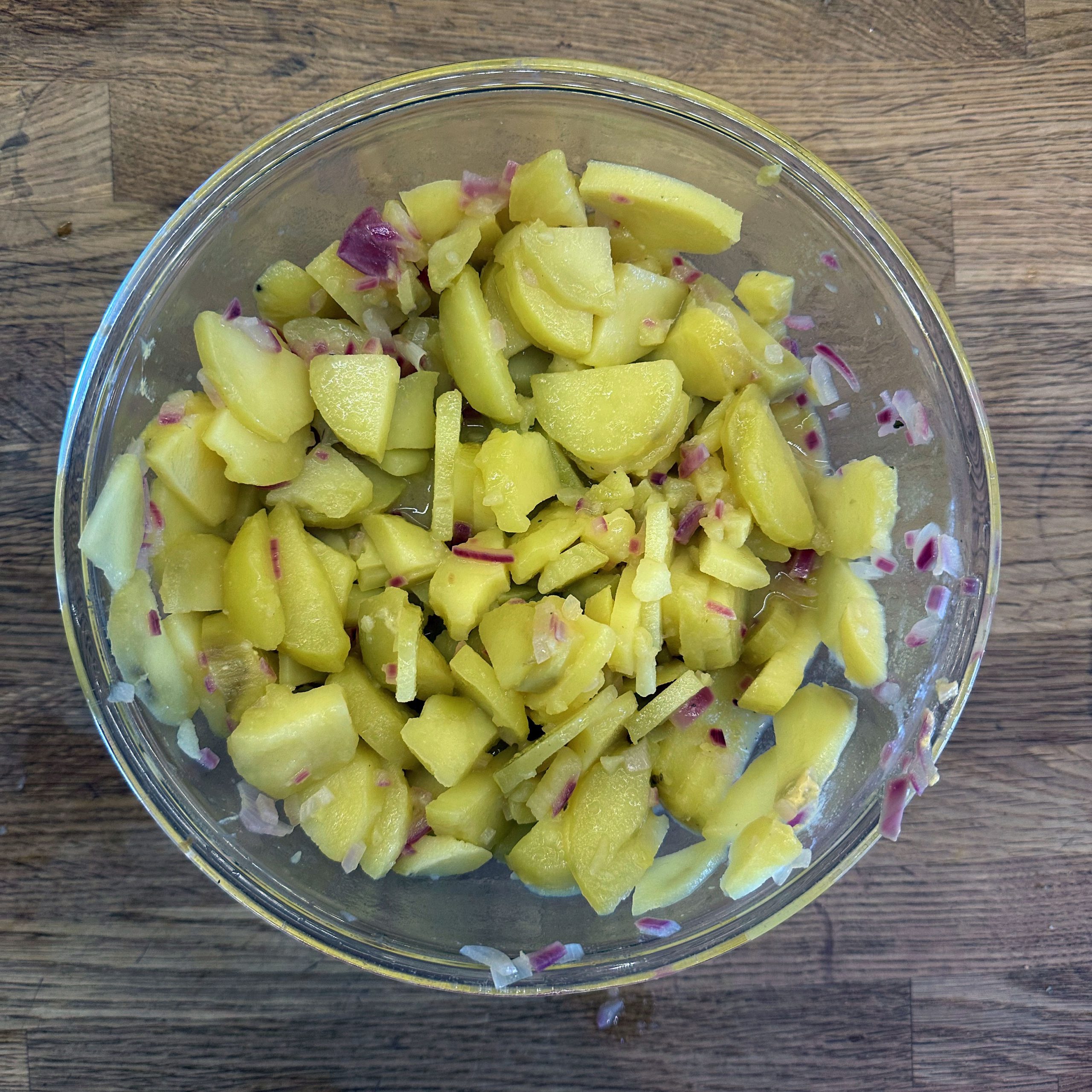 1 kg Kartoffeln mit Schale in Salzwasser weich kochen, abgießen, ausdampfen lassen, pellen und in Scheiben schneiden. 2 gewürfelte Zwiebeln in etwas Öl anbraten, mit 250 ml Brühe ablöschen und kurz köcheln lassen, 1 EL Senf, 4 EL Essig und 1 TL Salz unterrühren. Kartoffeln mit dem warmen Dressing übergießen und mindestens 2 h ziehen lassen, dann 4 EL Öl und 0,5 Bund gehackte Petersilie unterrühren. 4 Eier in kaltem Wasser aufsetzen, aufkochen und 9 min kochen, herausnehmen, kalt abschrecken, pellen und in einer Mischung aus gleichen Teilen Sojasoße und Wasser mindestens 2 h einlegen, dabei gelegentlich wenden. 500 g frischen Spinat in etwas Olivenöl kurz anbraten, bis er zusammengefallen ist, leicht salzen. Eingelegte Eier aus der Marinade nehmen, halbieren und mit dem Kartoffelsalat und dem Spinat auf einem Teller anrichten.