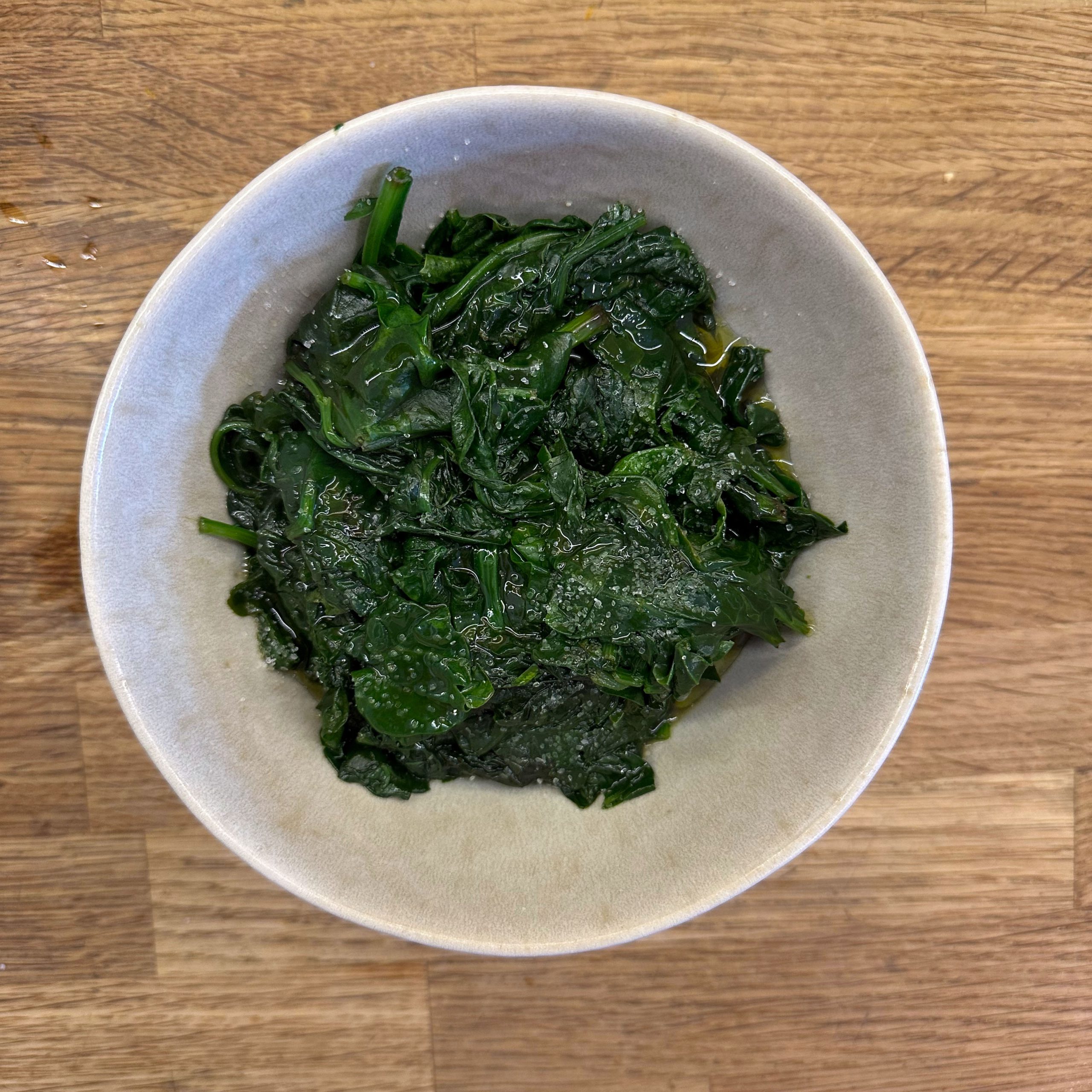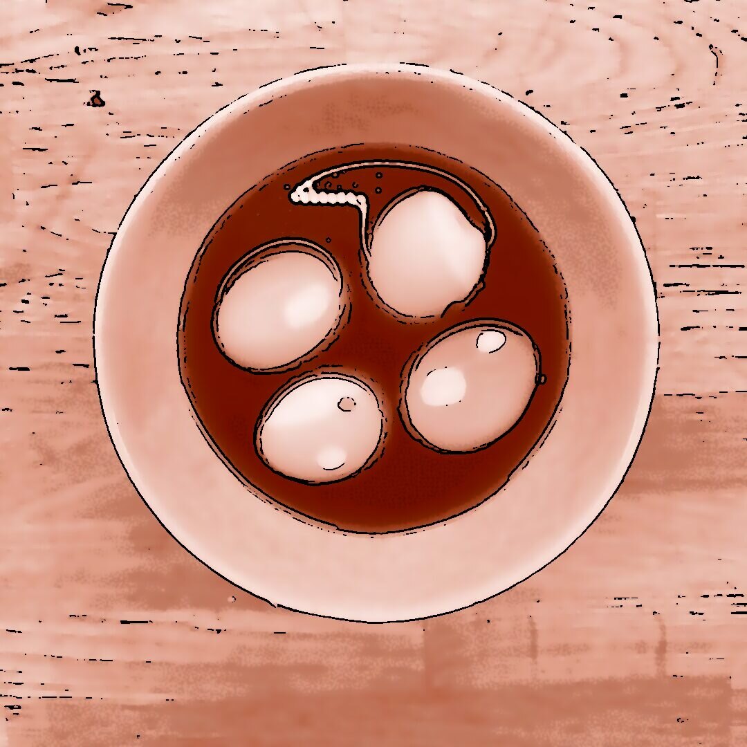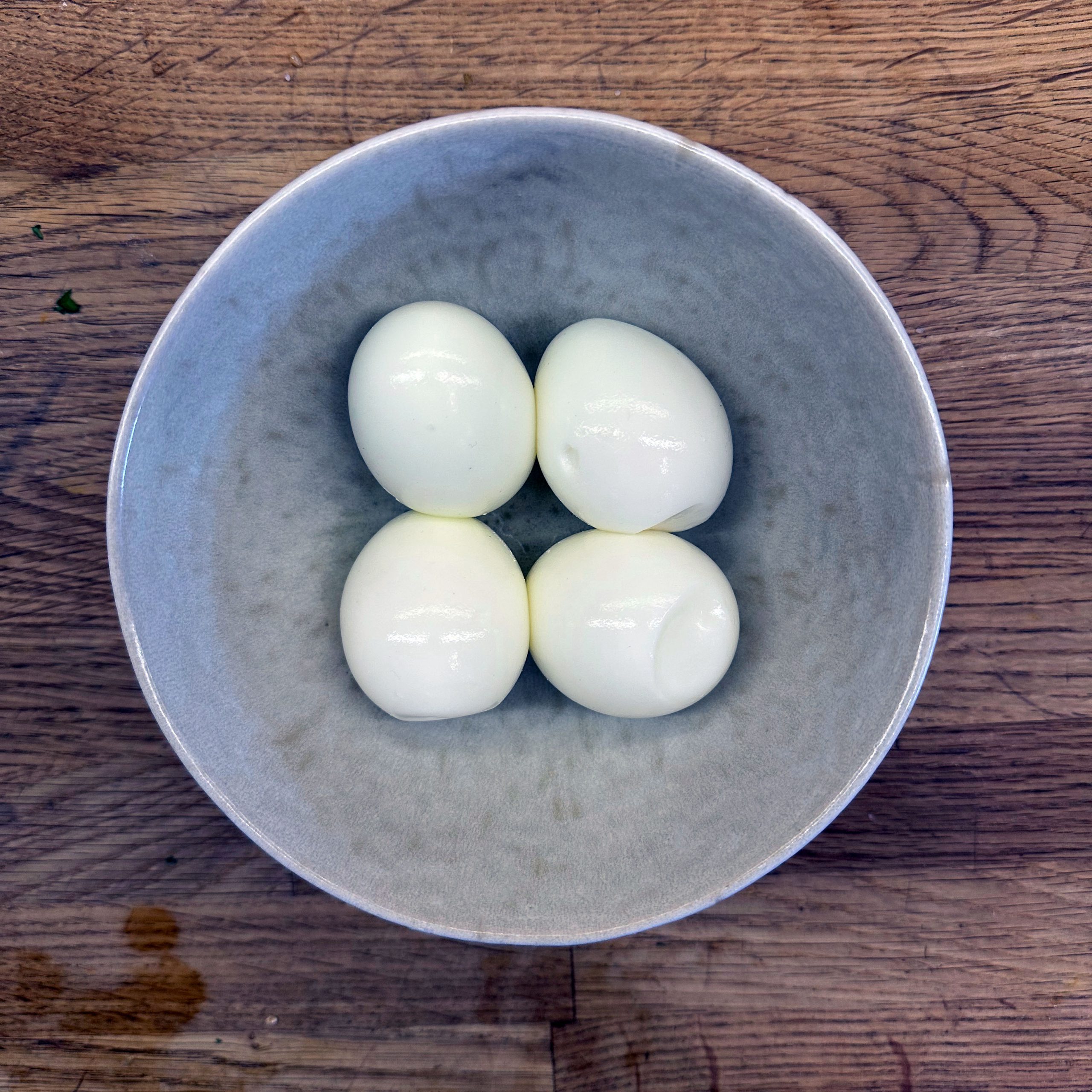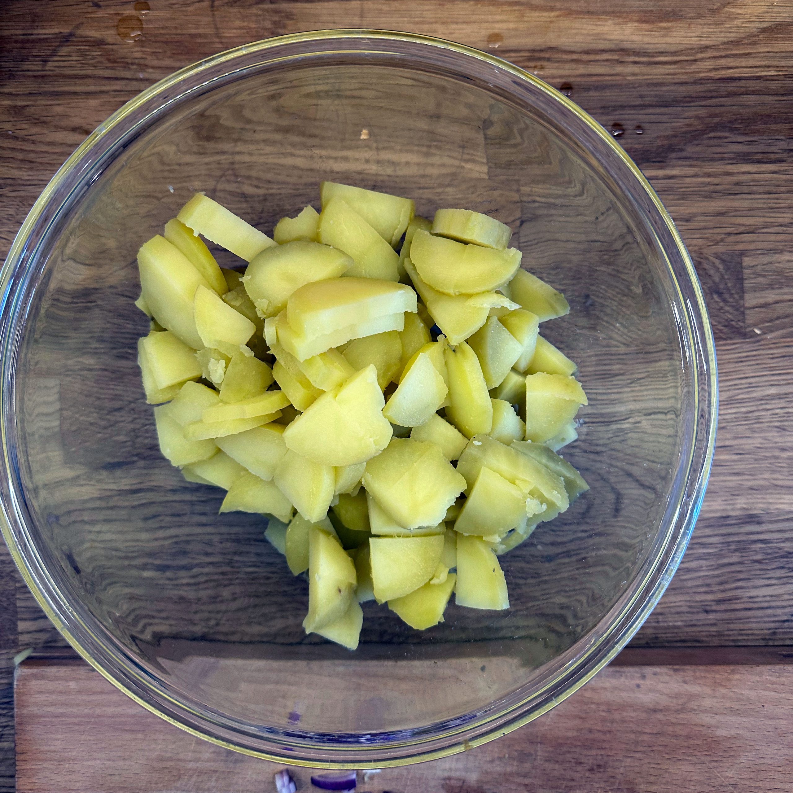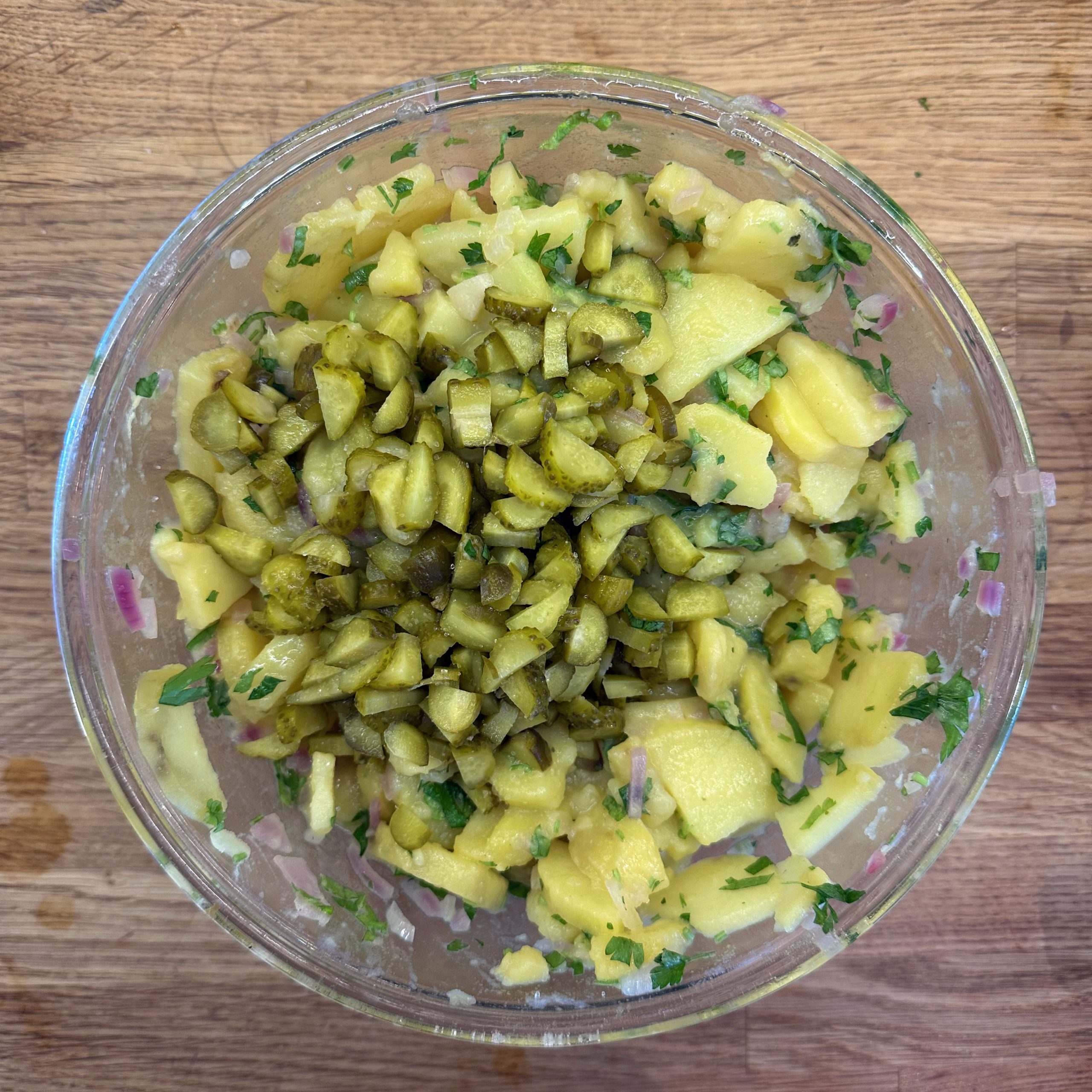 1 kg Kartoffeln mit Schale in Salzwasser weich kochen, abgießen, ausdampfen lassen, pellen und in Scheiben schneiden. 2 gewürfelte Zwiebeln in etwas Öl anbraten, mit 250 ml Brühe ablöschen und kurz köcheln lassen, 1 EL Senf, 4 EL Essig und 1 TL Salz unterrühren. Kartoffeln mit dem warmen Dressing übergießen und mindestens 2 h ziehen lassen, dann 4 EL Öl und 0,5 Bund gehackte Petersilie unterrühren. 4 Eier in kaltem Wasser aufsetzen, aufkochen und 9 min kochen, herausnehmen, kalt abschrecken, pellen und in einer Mischung aus gleichen Teilen Sojasoße und Wasser mindestens 2 h einlegen, dabei gelegentlich wenden. 500 g frischen Spinat in etwas Olivenöl kurz anbraten, bis er zusammengefallen ist, leicht salzen. Eingelegte Eier aus der Marinade nehmen, halbieren und mit dem Kartoffelsalat und dem Spinat auf einem Teller anrichten.