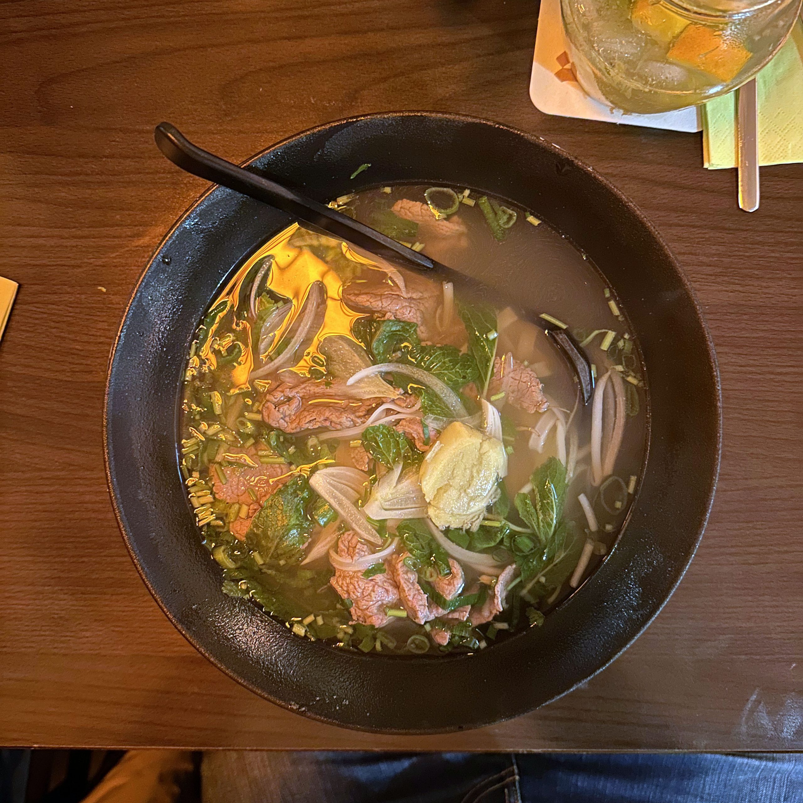 Traditionelle Reisbandnudelsuppe aus Rinderbrühe mit Minze, Ingwer, Sojasprossen und Frühlingszwiebeln. Pho ist mein Standardessen beim Vietnamesen. Diesmal Pho Bo, also mit Rindfleisch gegessen. War ok, ich hab’s schon besser gegessen.