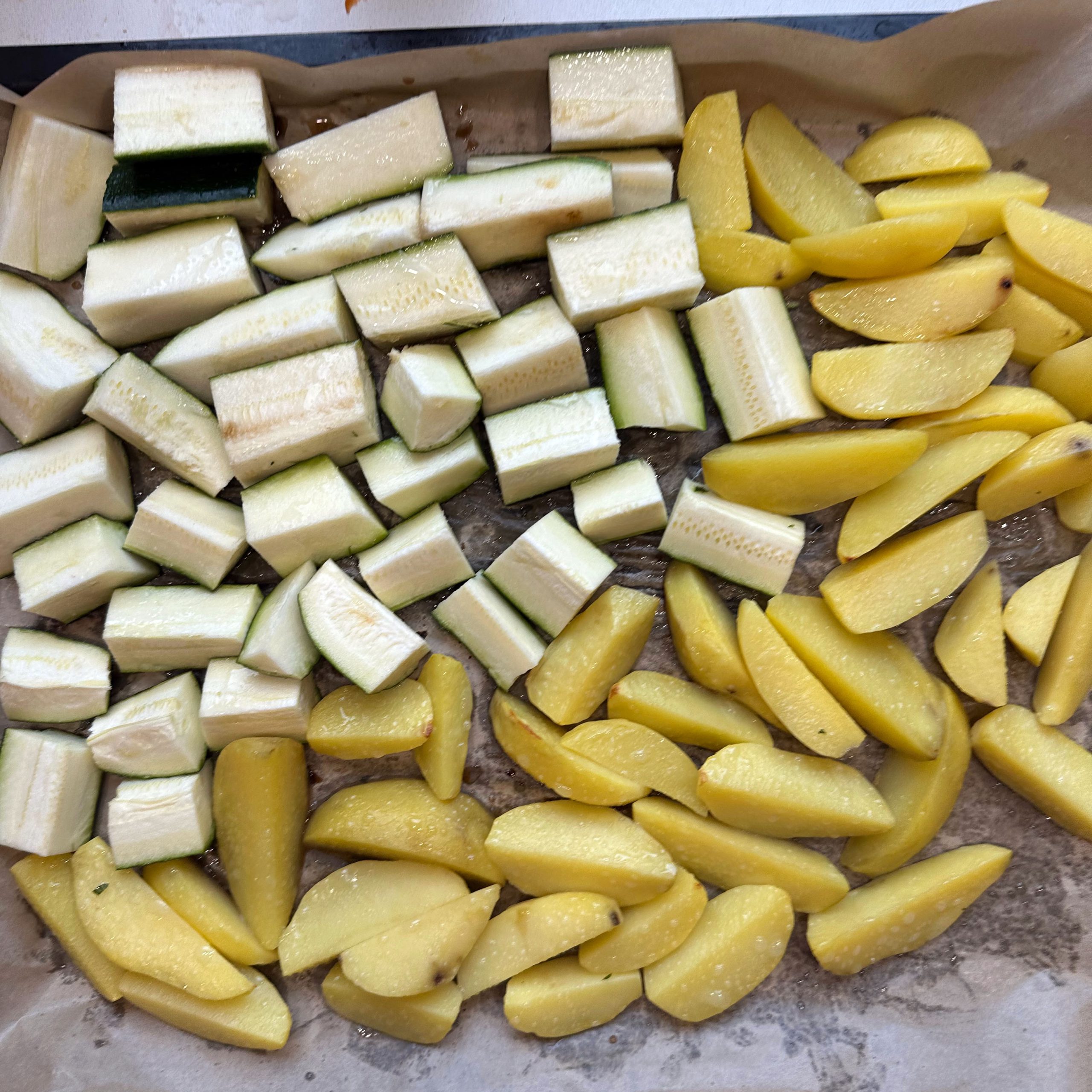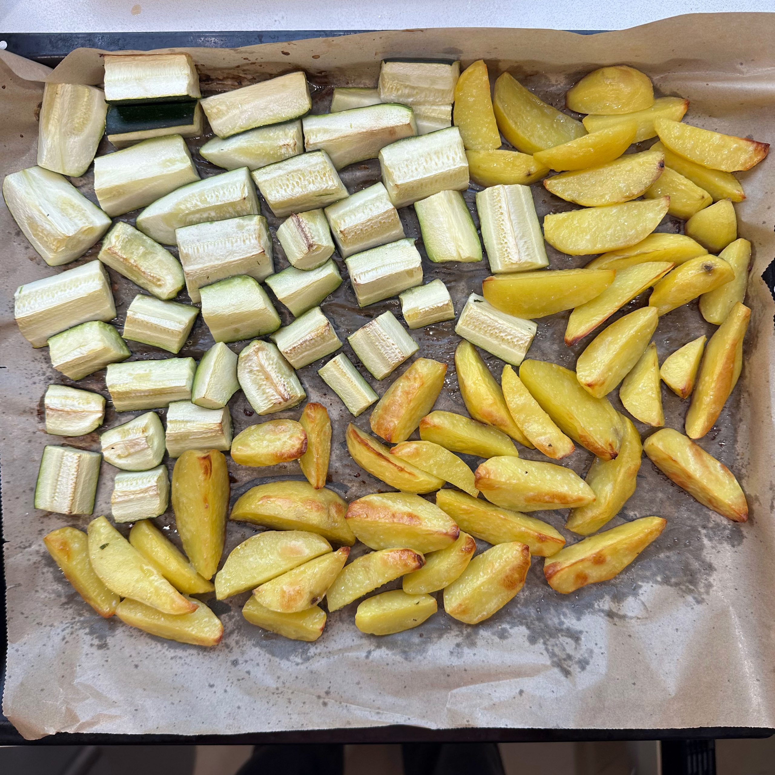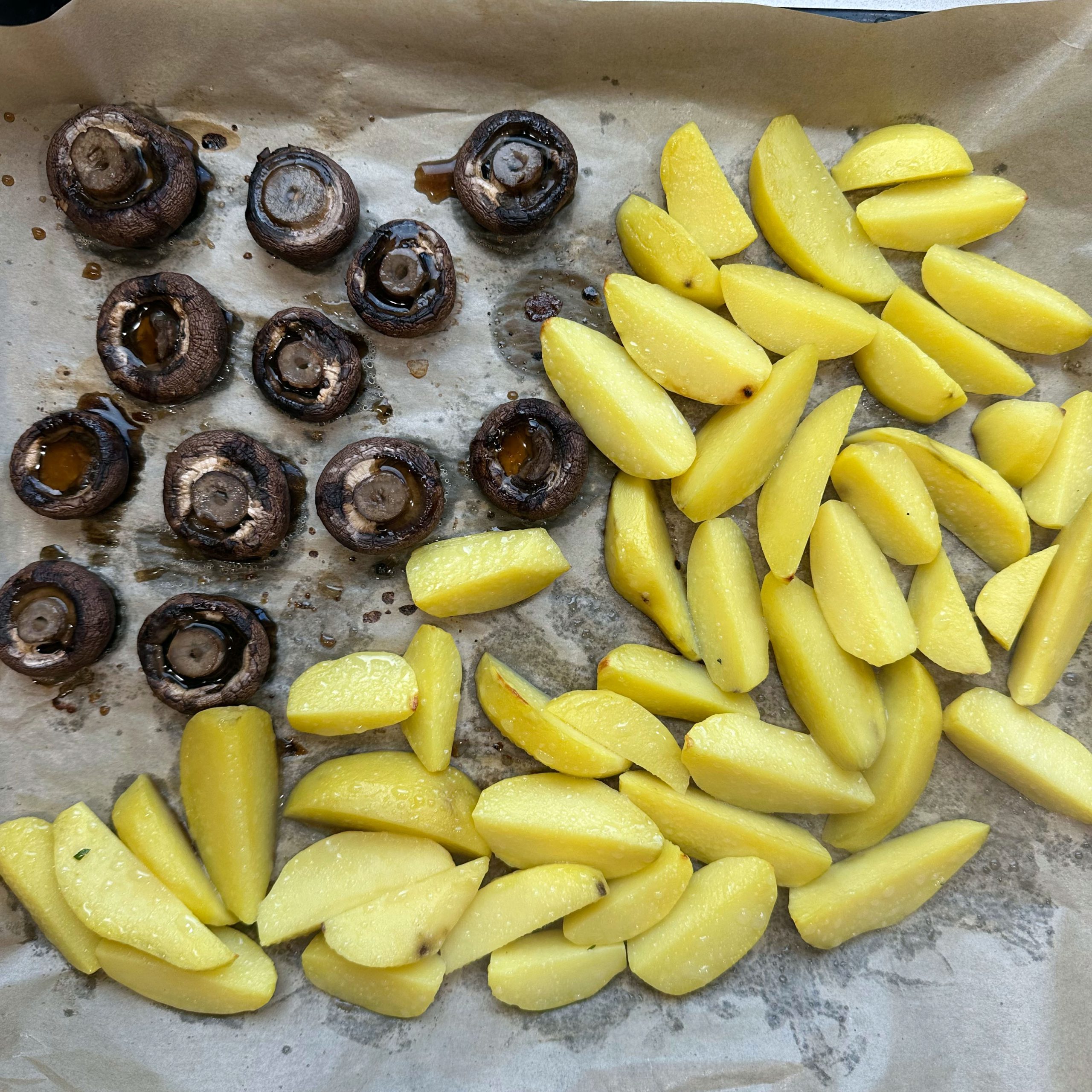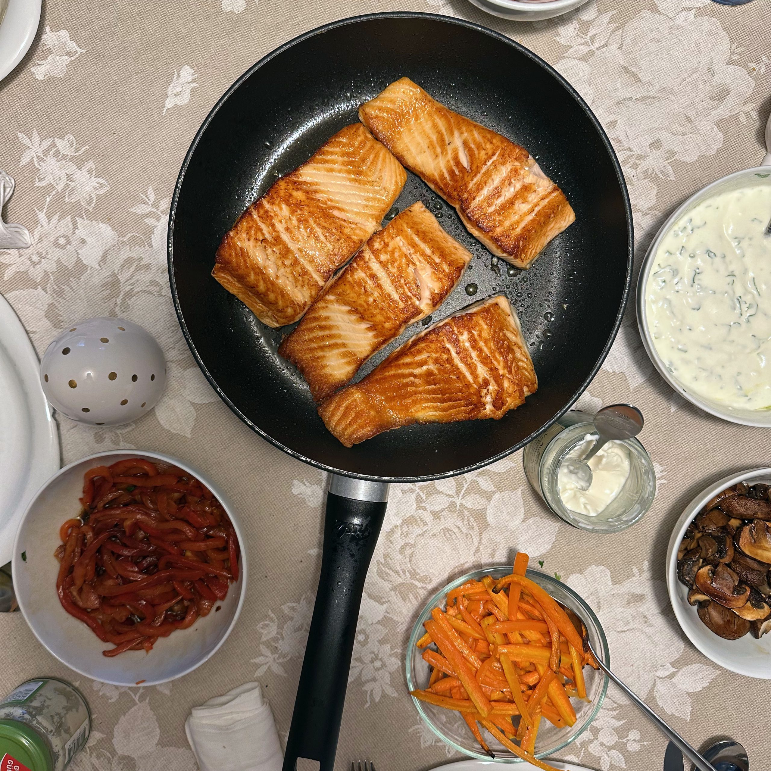 800 g Kartoffeln schälen und in mundgerechte Stücke schneiden, 1 Knollensellerie schälen und würfeln, 7 Möhren schälen und in Stücke schneiden, 2 Zucchini in Scheiben schneiden. Alles mit etwas Öl, Salz und Pfeffer mischen und auf 2 mit Backpapier belegte Bleche verteilen, bei 200 °C Umluft 35–40 Min. backen. 300 g Champignons ganz mit dem Kopf nach unten auf ein Blech setzen, mit etwas Öl beträufeln und salzen, bei 200 °C Umluft 30 Min. mitbacken, etwas abkühlen lassen, in Scheiben schneiden und mit Sojasoße, Balsamico und Ahornsirup marinieren. 2 Paprika halbieren, entkernen und unter dem Grill rösten, bis die Haut schwarz ist, abkühlen lassen, häuten, in Streifen schneiden, salzen und in Essig, Öl und Balsamico marinieren. 4 Lachsfilets in einer heißen Pfanne in etwas Öl auf der hautfreien Seite 5 Min. braten, dann wenden und auf der Hautseite bei mittlerer Hitze 7–8 Min. weiterbraten. Dip aus Joghurt, Mayonnaise, Zitrone, Petersilie, Olivenöl anrühren. Ofengemüse mit marinierten Champignons, Paprikasalat und gebratenem Lachs auf Tellern mit Dip anrichten.