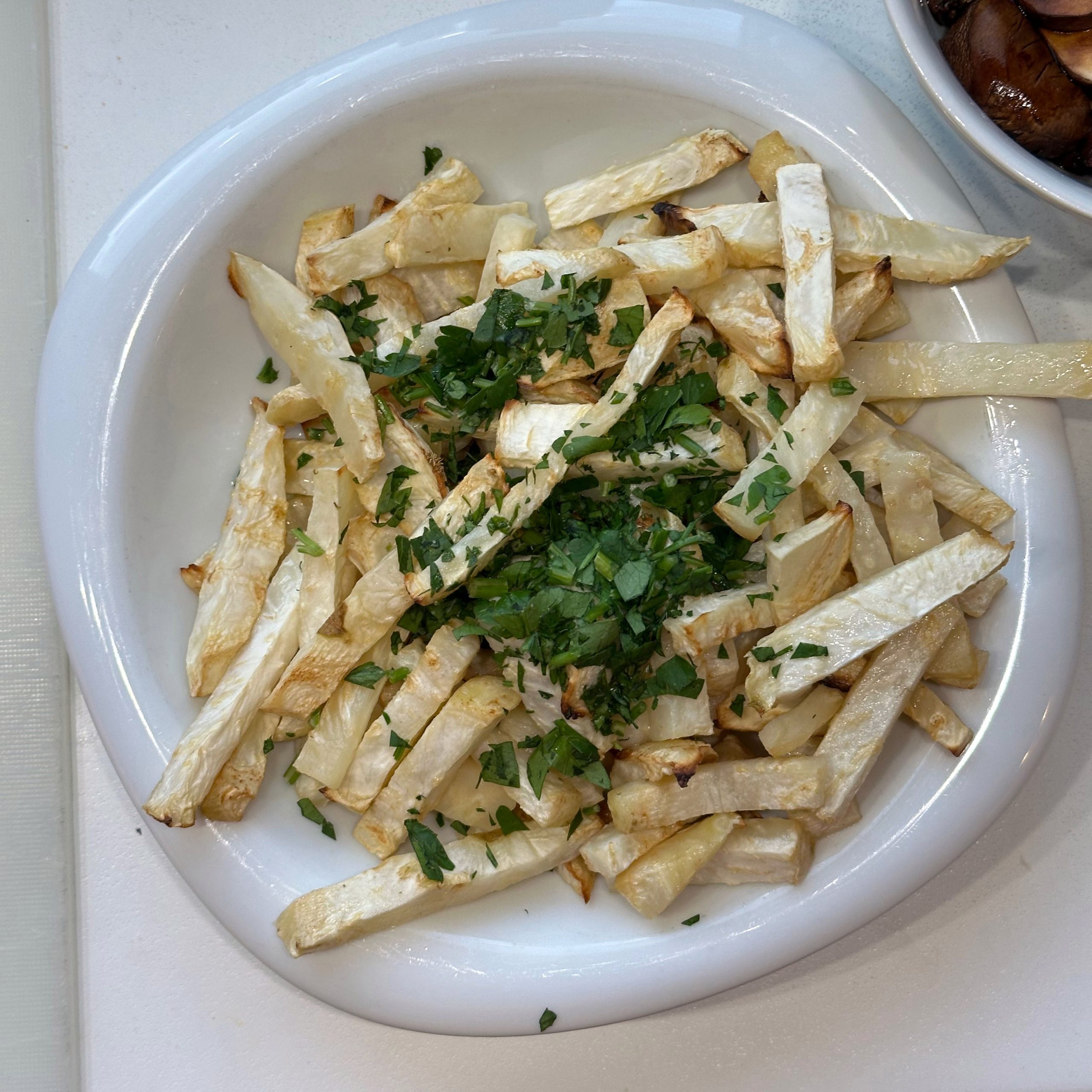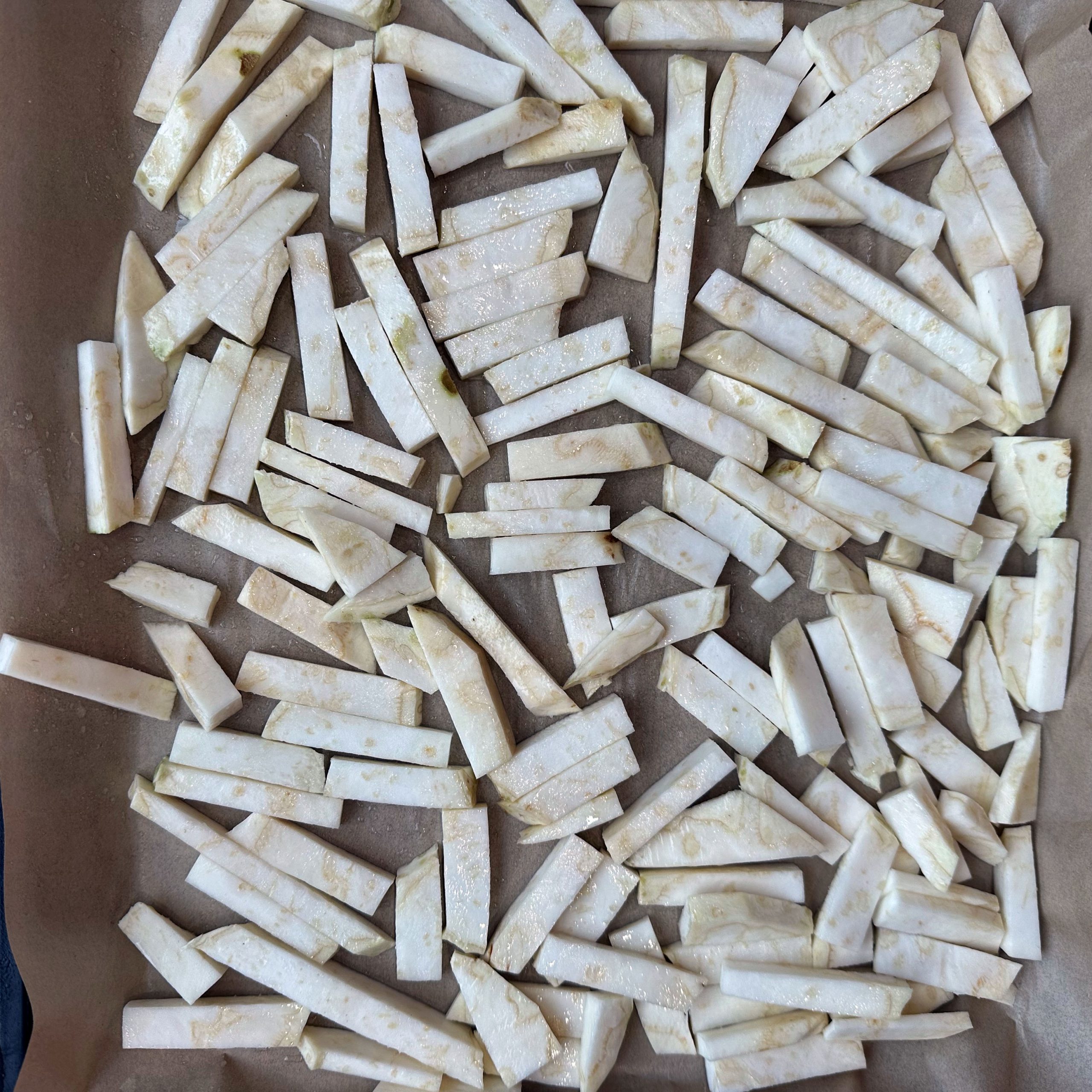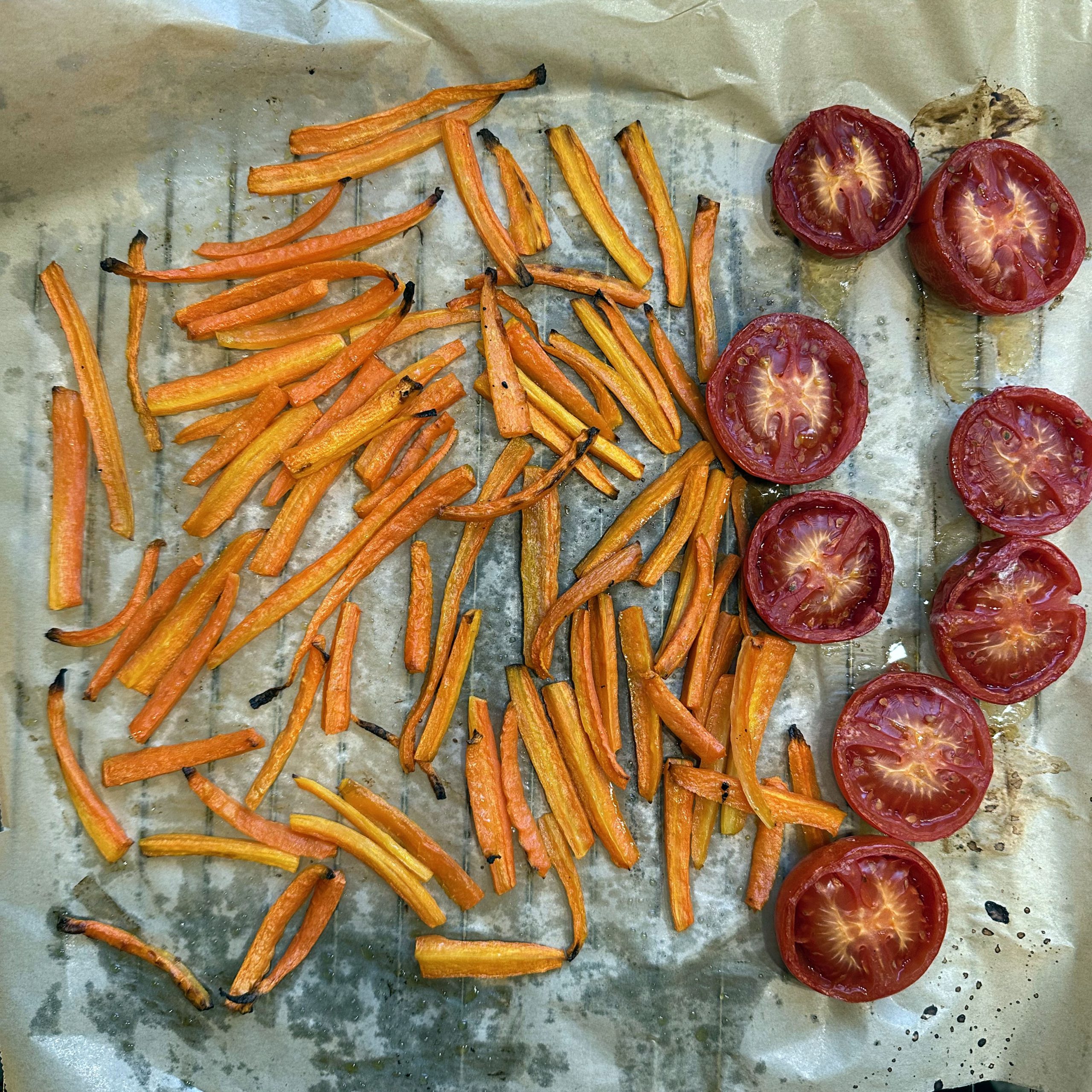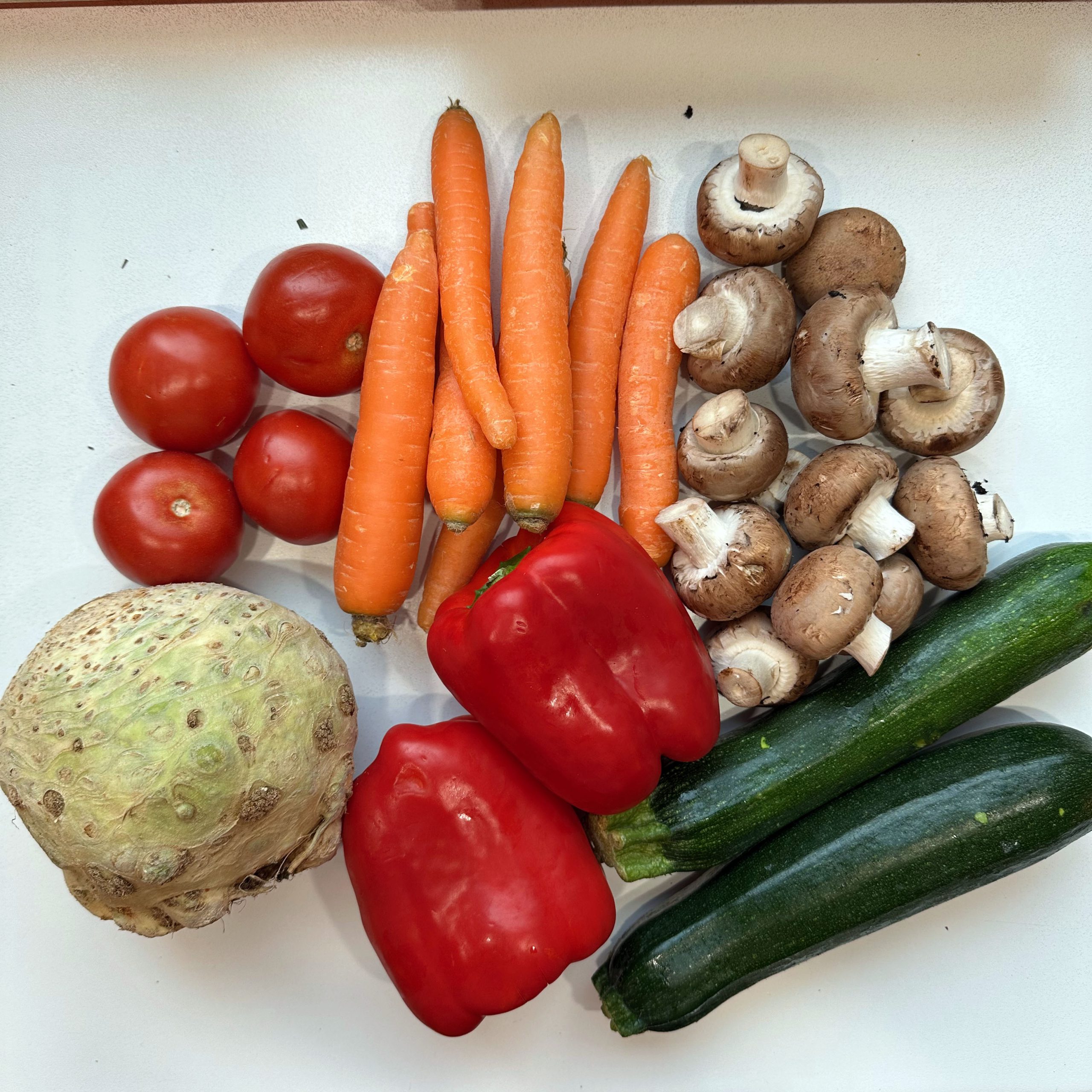 800 g Kartoffeln schälen und in mundgerechte Stücke schneiden, 1 Knollensellerie schälen und würfeln, 7 Möhren schälen und in Stücke schneiden, 2 Zucchini in Scheiben schneiden. Alles mit etwas Öl, Salz und Pfeffer mischen und auf 2 mit Backpapier belegte Bleche verteilen, bei 200 °C Umluft 35–40 Min. backen. 300 g Champignons ganz mit dem Kopf nach unten auf ein Blech setzen, mit etwas Öl beträufeln und salzen, bei 200 °C Umluft 30 Min. mitbacken, etwas abkühlen lassen, in Scheiben schneiden und mit Sojasoße, Balsamico und Ahornsirup marinieren. 2 Paprika halbieren, entkernen und unter dem Grill rösten, bis die Haut schwarz ist, abkühlen lassen, häuten, in Streifen schneiden, salzen und in Essig, Öl und Balsamico marinieren. 4 Lachsfilets in einer heißen Pfanne in etwas Öl auf der hautfreien Seite 5 Min. braten, dann wenden und auf der Hautseite bei mittlerer Hitze 7–8 Min. weiterbraten. Dip aus Joghurt, Mayonnaise, Zitrone, Petersilie, Olivenöl anrühren. Ofengemüse mit marinierten Champignons, Paprikasalat und gebratenem Lachs auf Tellern mit Dip anrichten.