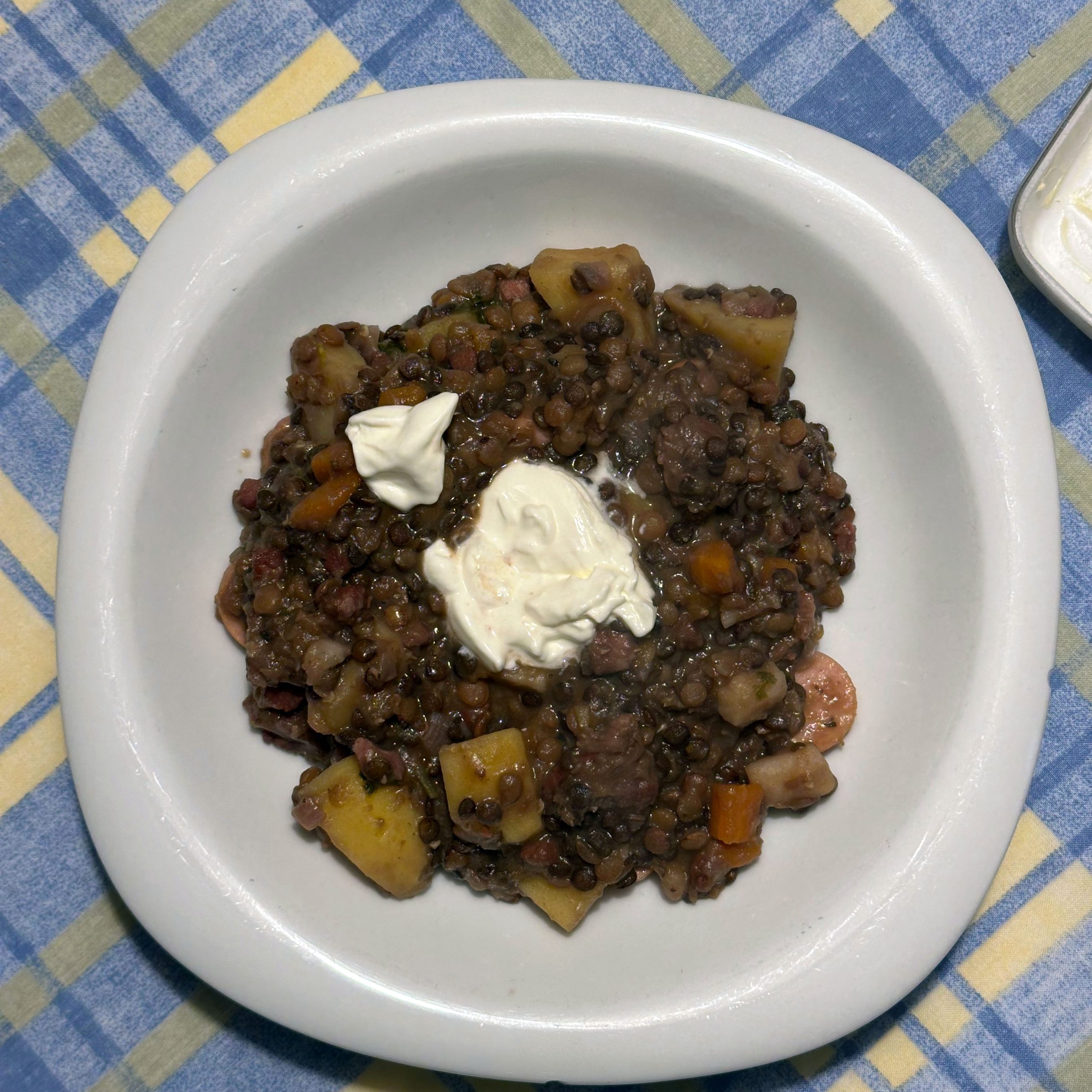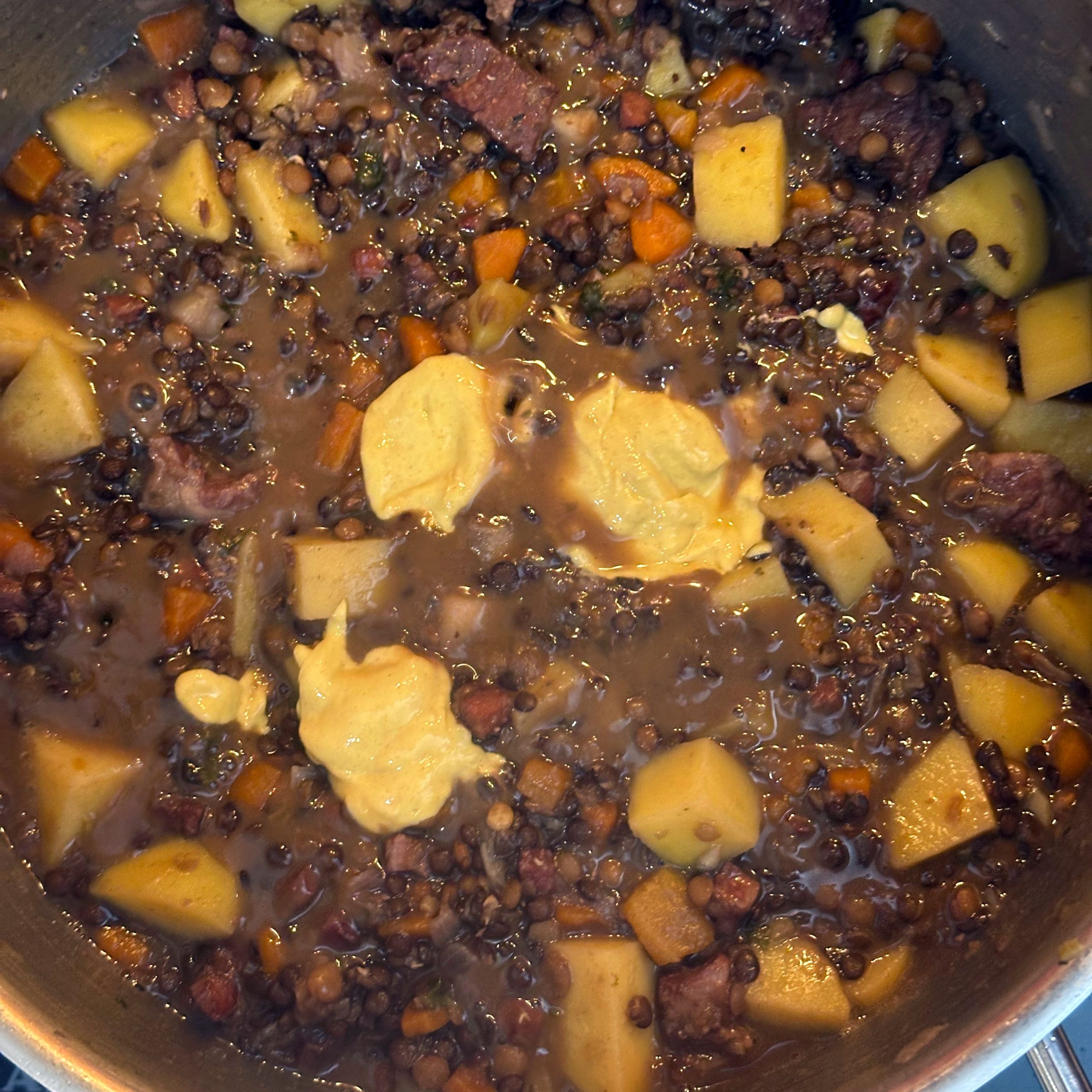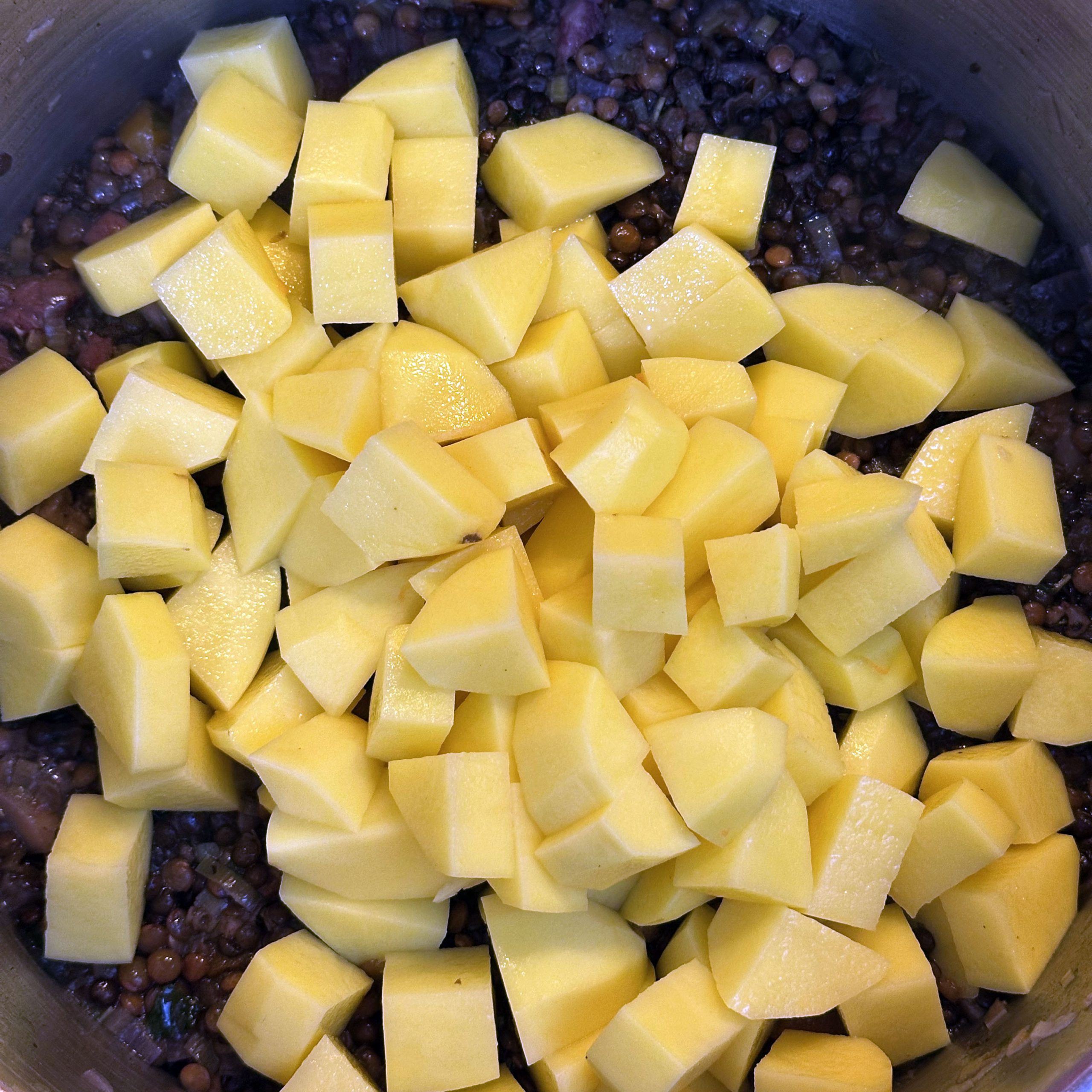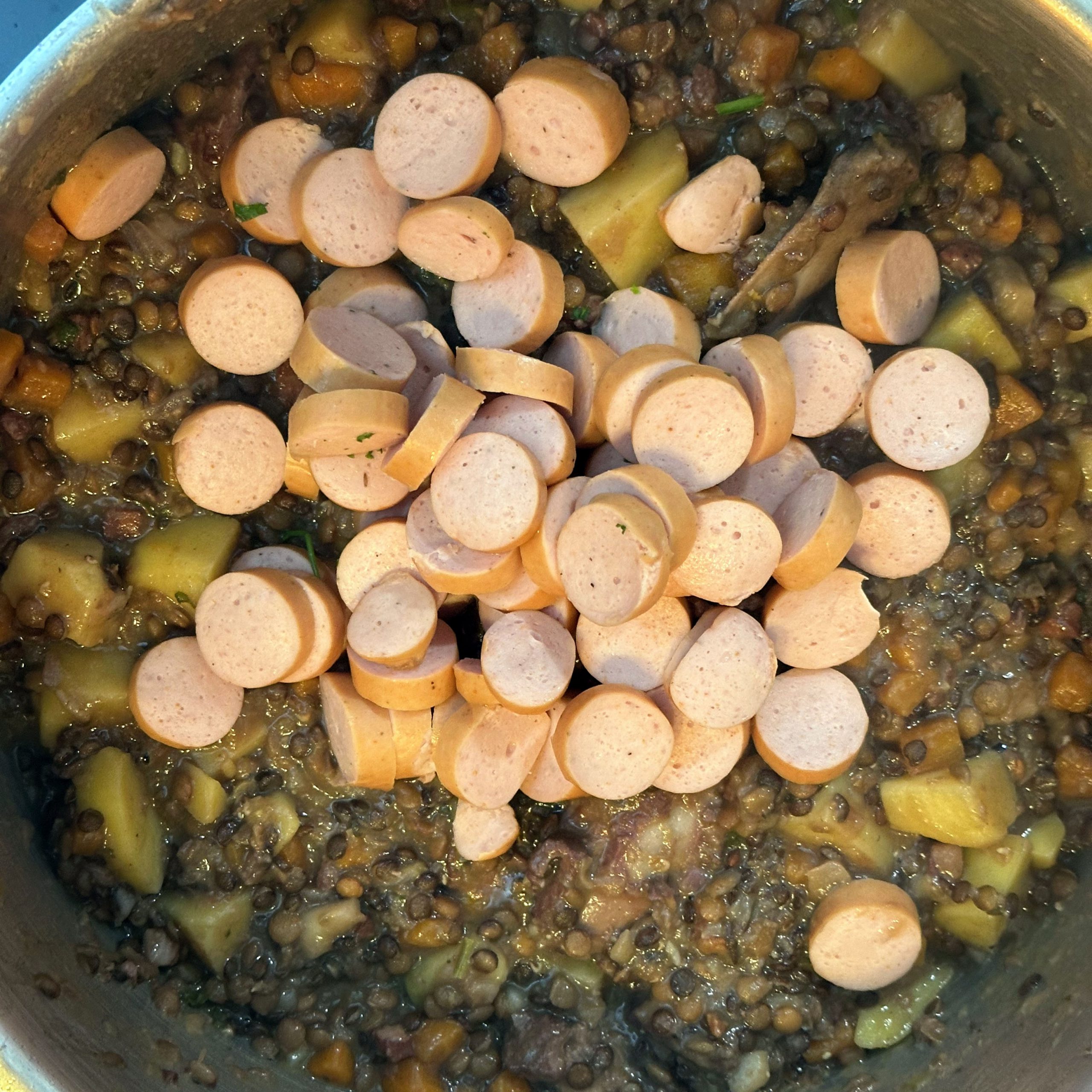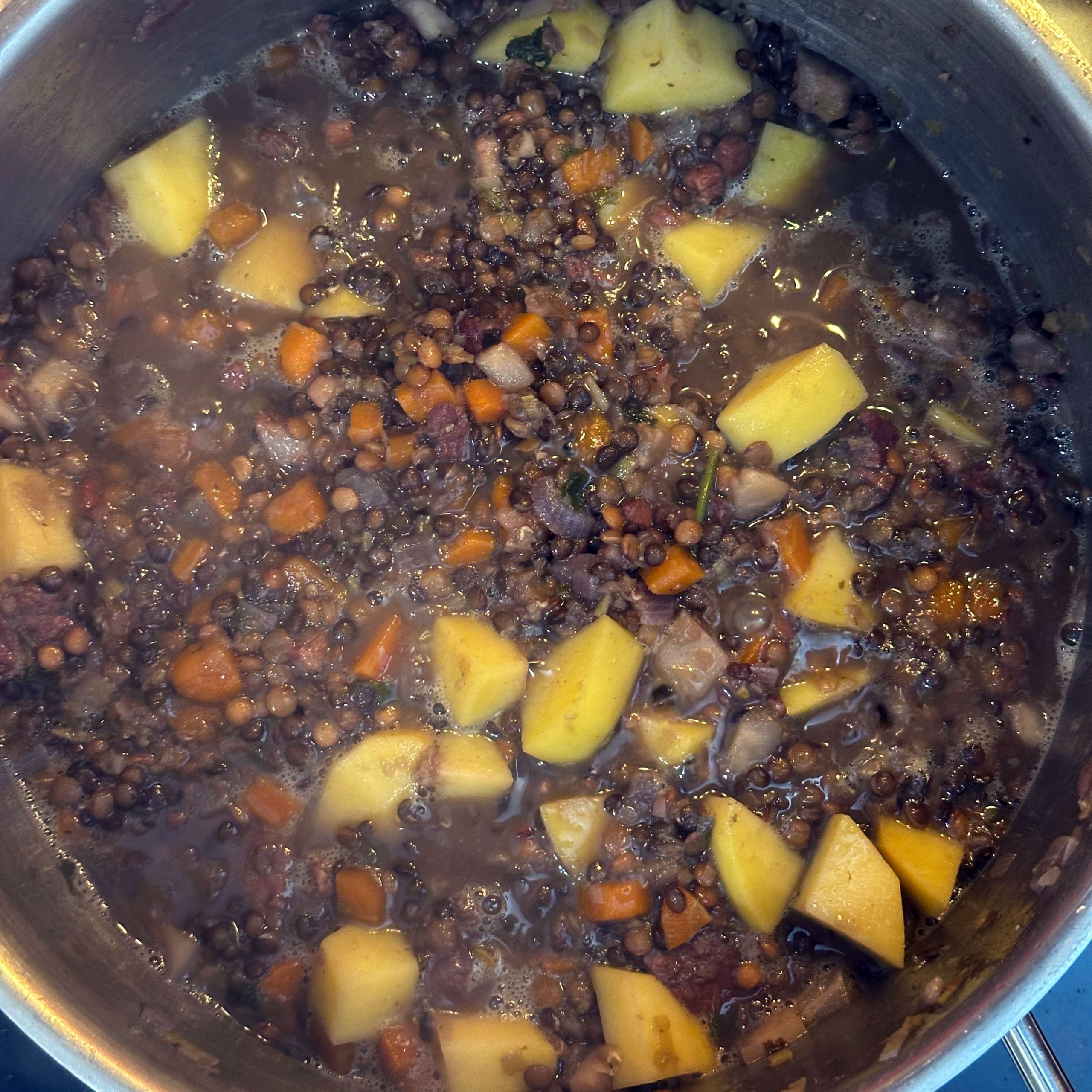 300g braune Linsen in einem Sieb abspülen. 400g Kassler in etwa 2 cm große Würfel schneiden. 1 Bund Suppengrün (Möhren, Sellerie, Lauch, Petersilienwurzel) putzen, schälen und in kleine Würfel schneiden. 700g festkochende Kartoffeln schälen und in Würfel schneiden. In einem großen Topf 2 EL Öl erhitzen, das Kassler darin anbraten und herausnehmen. Im selben Topf 3 gewürfelte Zwiebeln glasig dünsten, das Suppengrün hinzufügen und etwa 5 Minuten anschwitzen. Die Linsen und Kartoffelwürfel dazugeben, mit 1,5 Liter Gemüsebrühe aufgießen und 2 Lorbeerblätter, 3 Wacholderbeeren, 1 TL Thymian, Salz und Pfeffer hinzufügen. Das angebratene Kassler wieder in den Topf geben und alles aufkochen lassen. Bei niedriger Hitze etwa 30-35 Minuten köcheln lassen, bis die Linsen und Kartoffeln weich sind. Mit Salz, Pfeffer und einem Spritzer Essig und 2 TL Senf abschmecken. Den Eintopf mit frisch gehackter Petersilie bestreuen und mit Brot servieren.