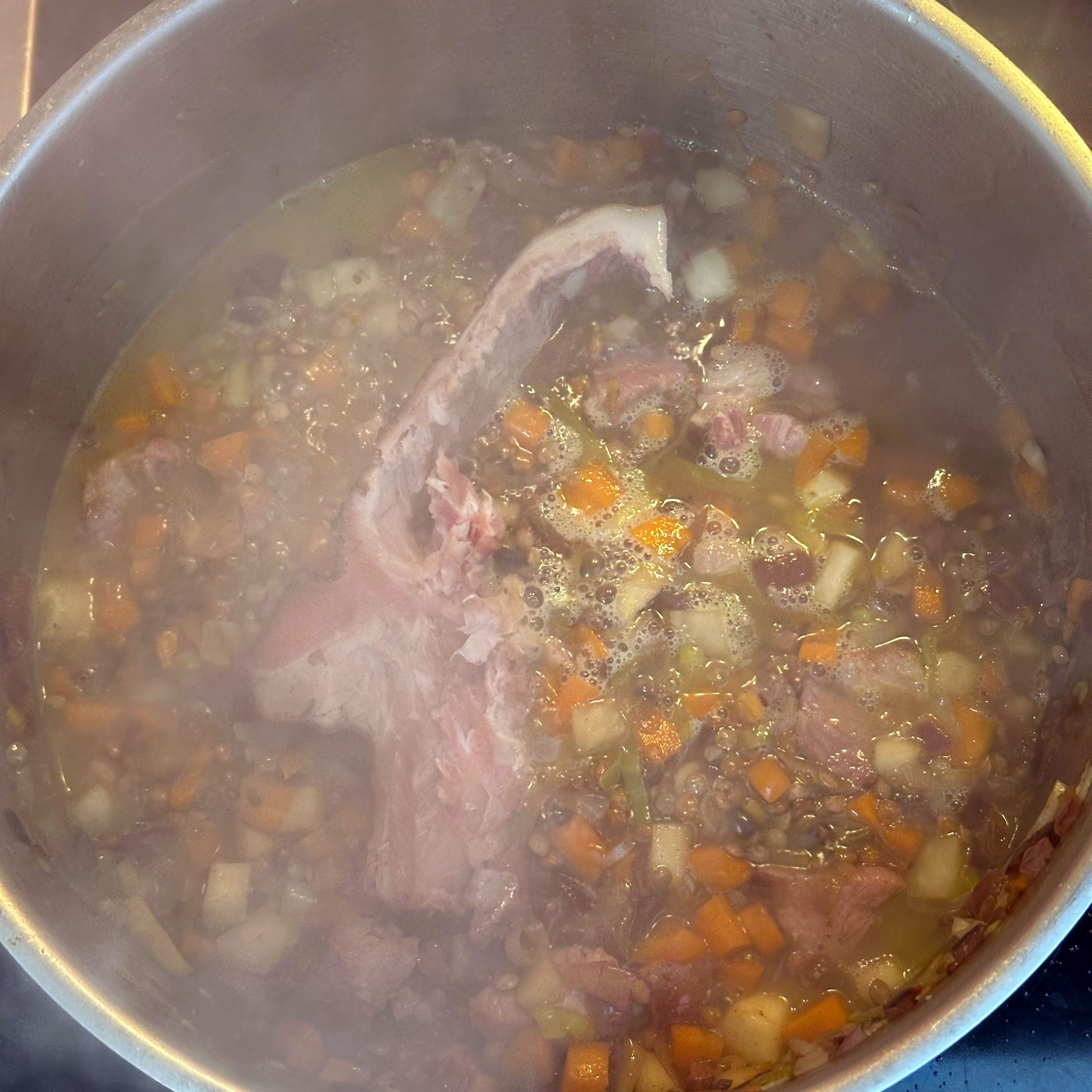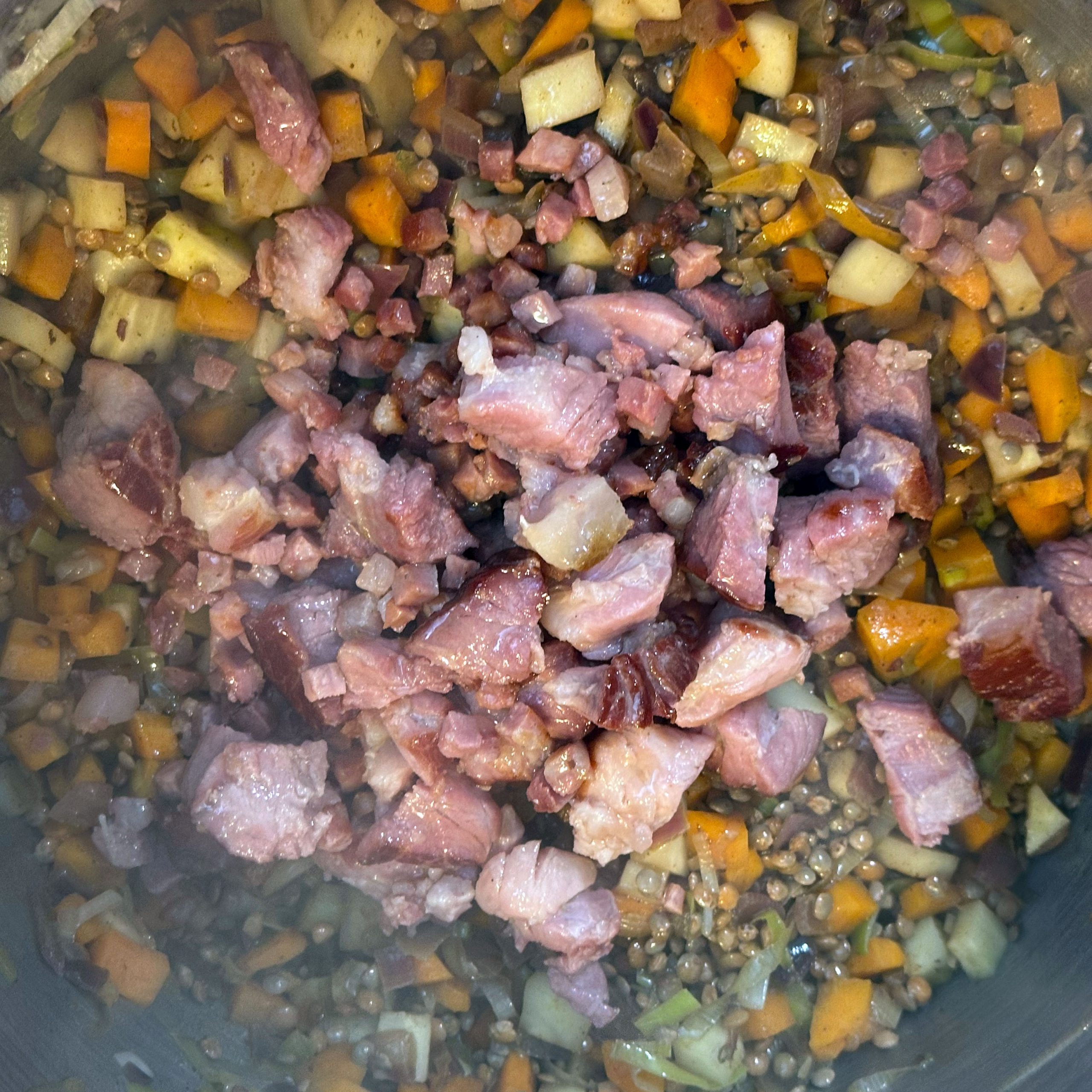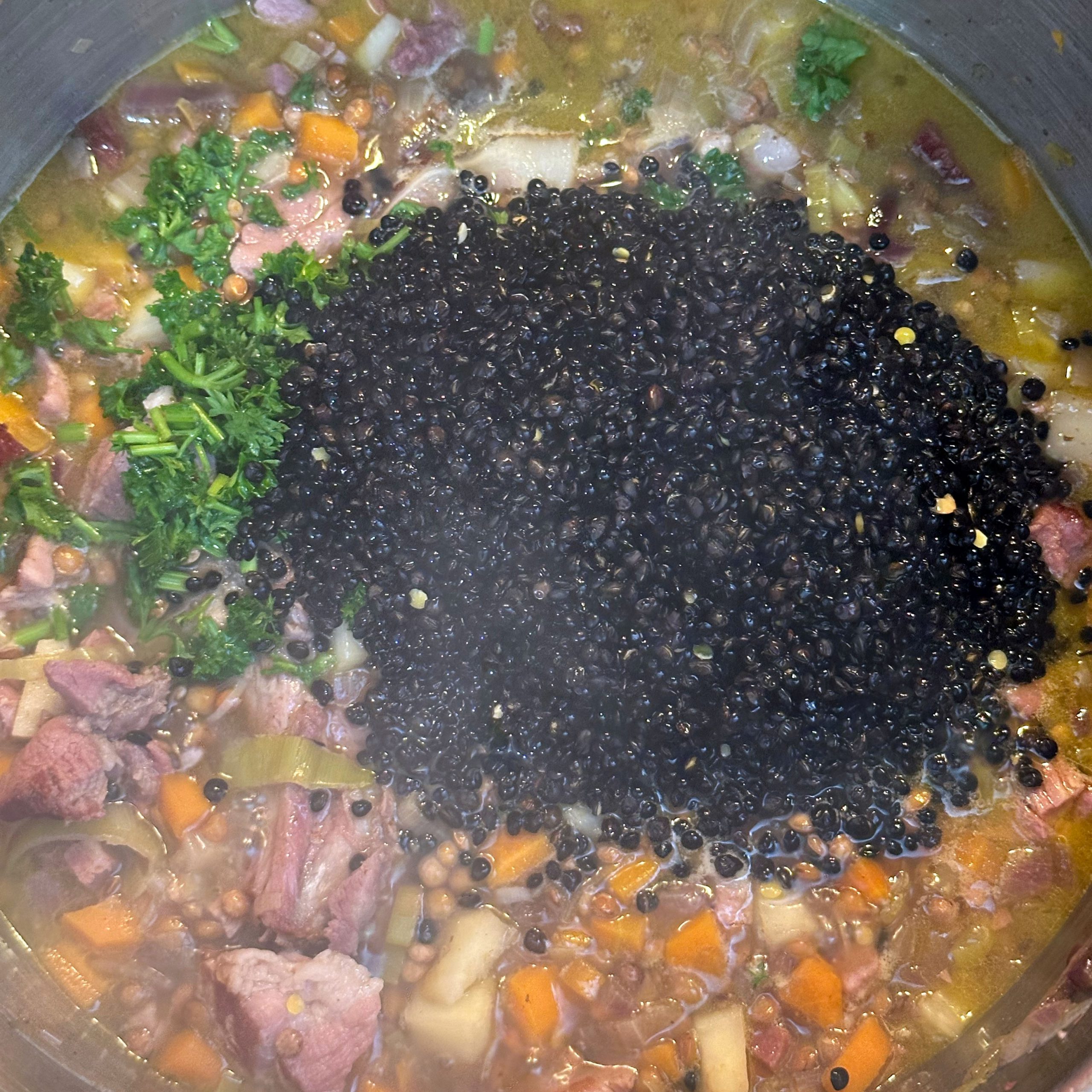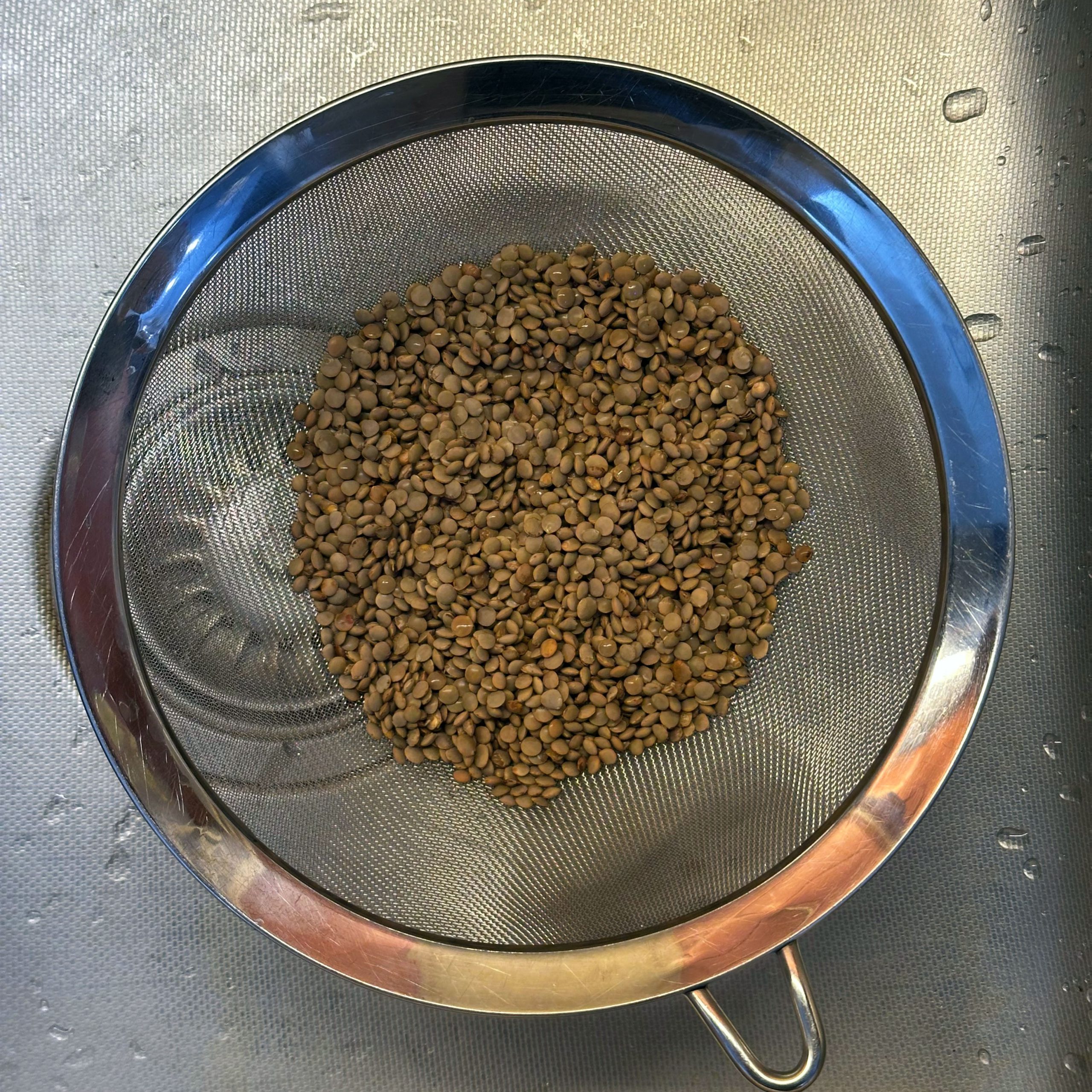 300g braune Linsen in einem Sieb abspülen. 400g Kassler in etwa 2 cm große Würfel schneiden. 1 Bund Suppengrün (Möhren, Sellerie, Lauch, Petersilienwurzel) putzen, schälen und in kleine Würfel schneiden. 700g festkochende Kartoffeln schälen und in Würfel schneiden. In einem großen Topf 2 EL Öl erhitzen, das Kassler darin anbraten und herausnehmen. Im selben Topf 3 gewürfelte Zwiebeln glasig dünsten, das Suppengrün hinzufügen und etwa 5 Minuten anschwitzen. Die Linsen und Kartoffelwürfel dazugeben, mit 1,5 Liter Gemüsebrühe aufgießen und 2 Lorbeerblätter, 3 Wacholderbeeren, 1 TL Thymian, Salz und Pfeffer hinzufügen. Das angebratene Kassler wieder in den Topf geben und alles aufkochen lassen. Bei niedriger Hitze etwa 30-35 Minuten köcheln lassen, bis die Linsen und Kartoffeln weich sind. Mit Salz, Pfeffer und einem Spritzer Essig und 2 TL Senf abschmecken. Den Eintopf mit frisch gehackter Petersilie bestreuen und mit Brot servieren.