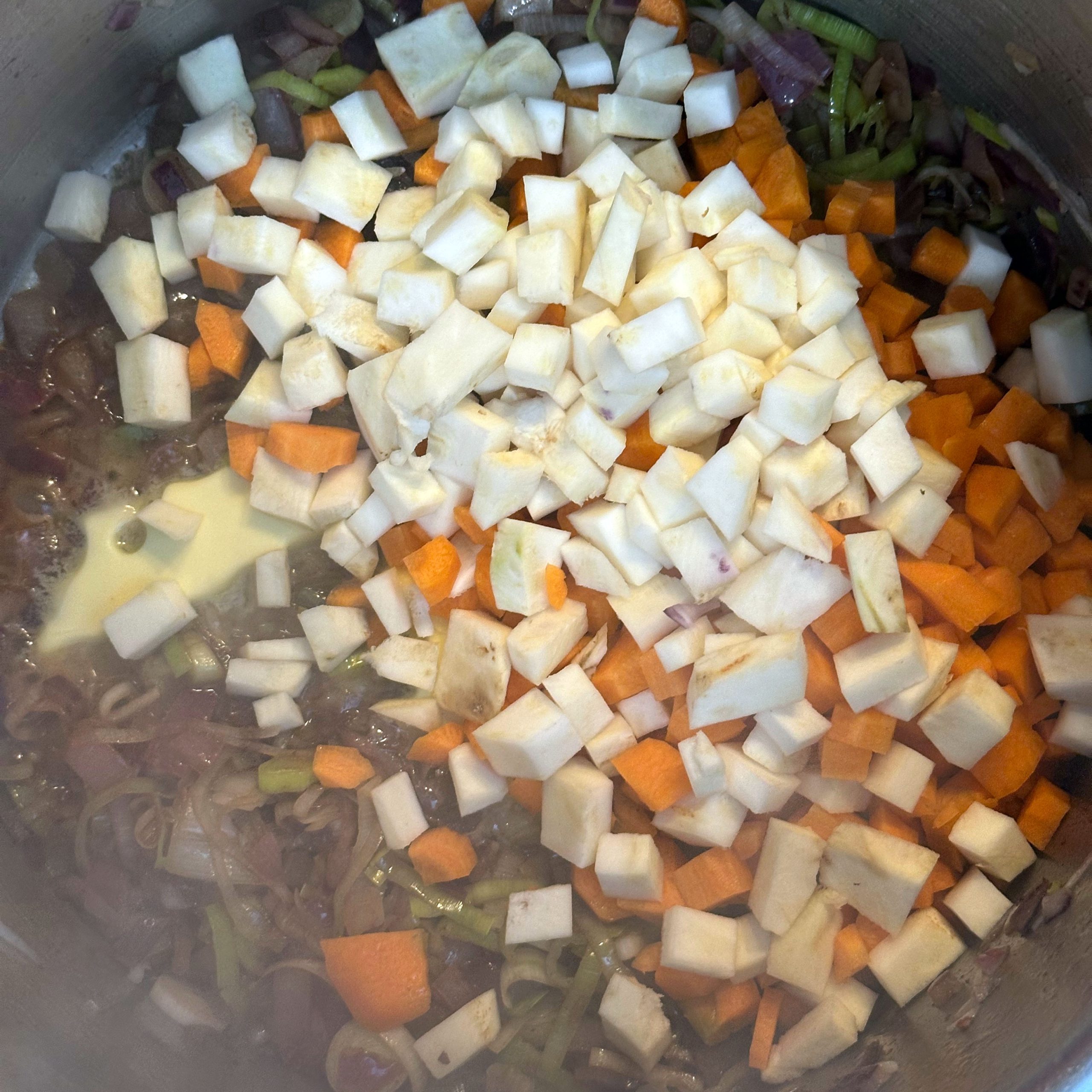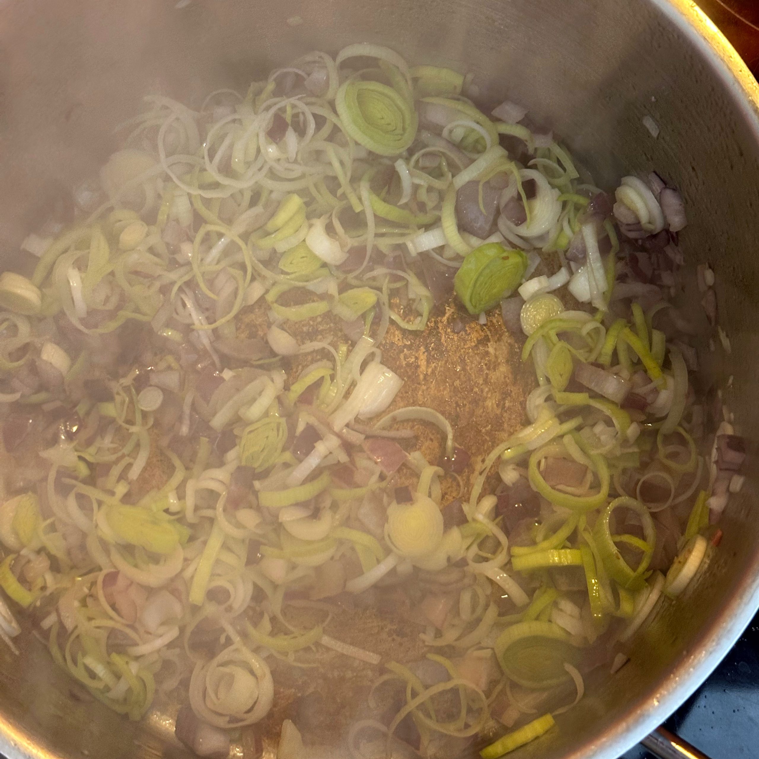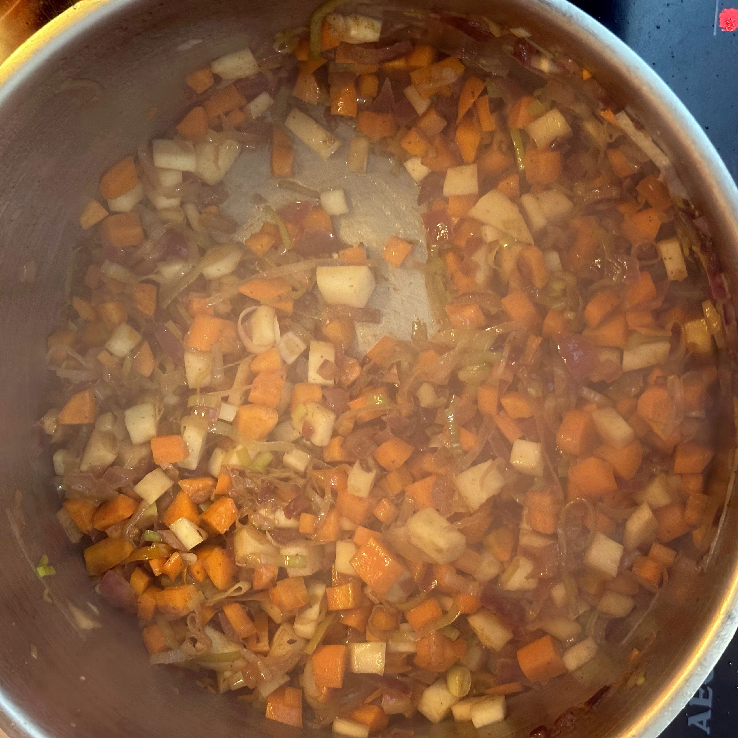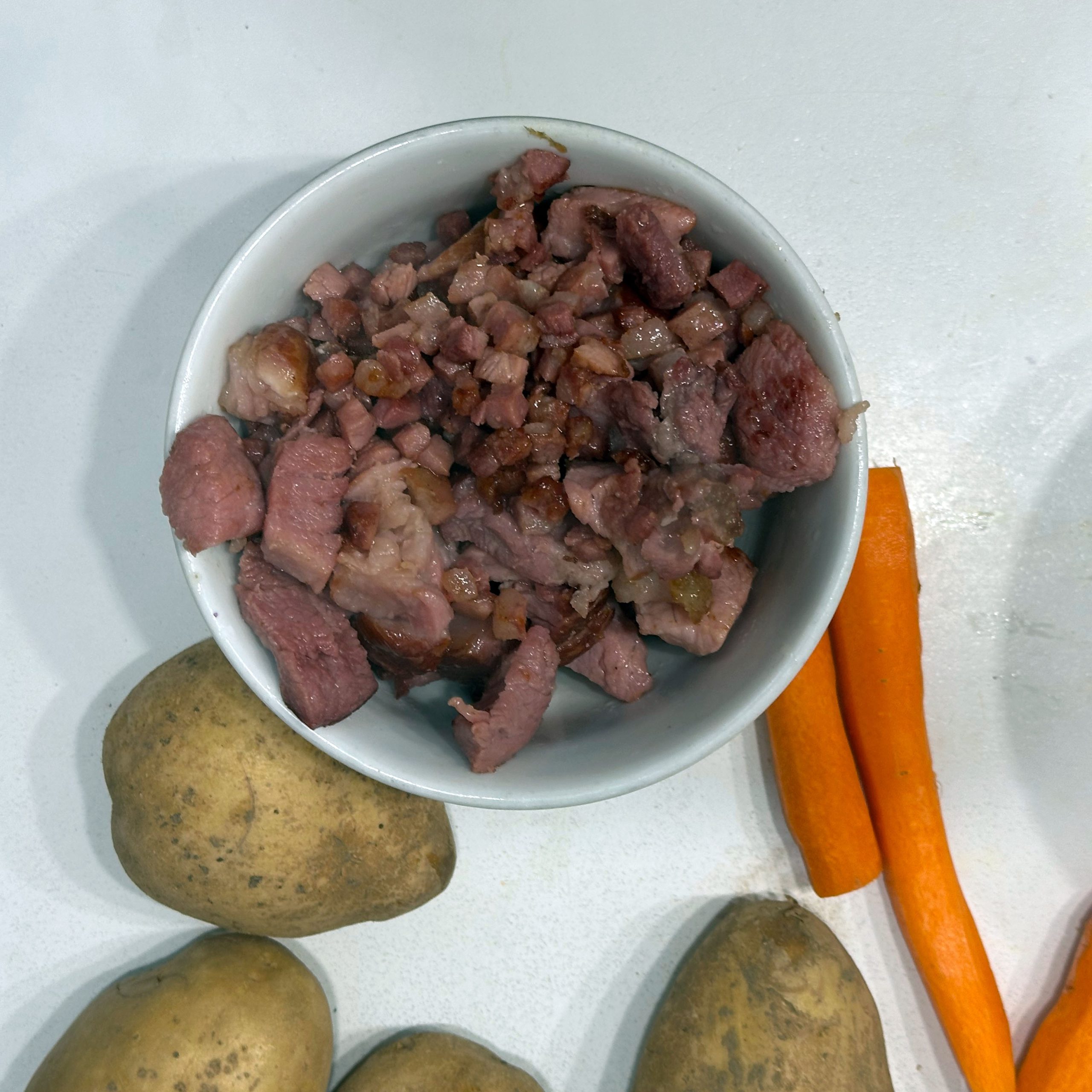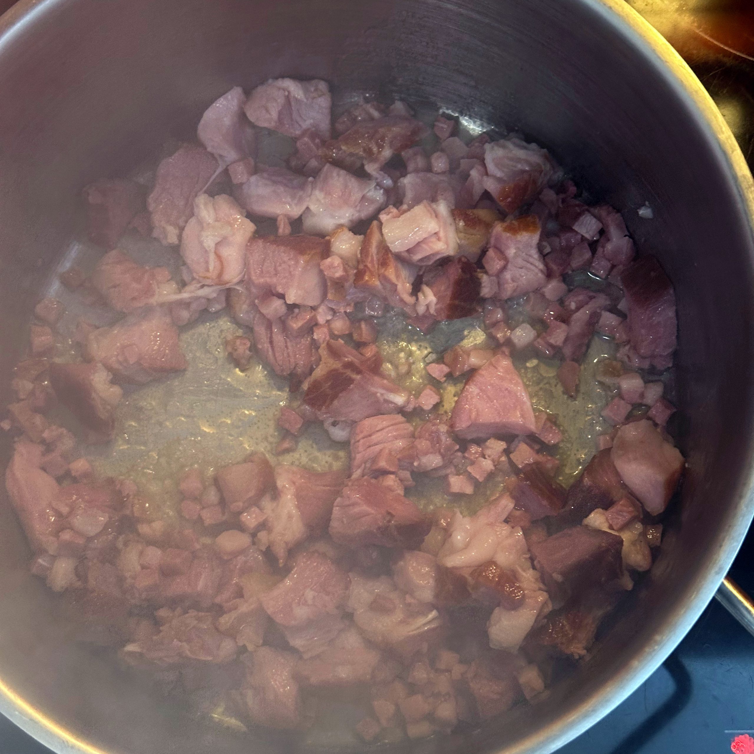 300g braune Linsen in einem Sieb abspülen. 400g Kassler in etwa 2 cm große Würfel schneiden. 1 Bund Suppengrün (Möhren, Sellerie, Lauch, Petersilienwurzel) putzen, schälen und in kleine Würfel schneiden. 700g festkochende Kartoffeln schälen und in Würfel schneiden. In einem großen Topf 2 EL Öl erhitzen, das Kassler darin anbraten und herausnehmen. Im selben Topf 3 gewürfelte Zwiebeln glasig dünsten, das Suppengrün hinzufügen und etwa 5 Minuten anschwitzen. Die Linsen und Kartoffelwürfel dazugeben, mit 1,5 Liter Gemüsebrühe aufgießen und 2 Lorbeerblätter, 3 Wacholderbeeren, 1 TL Thymian, Salz und Pfeffer hinzufügen. Das angebratene Kassler wieder in den Topf geben und alles aufkochen lassen. Bei niedriger Hitze etwa 30-35 Minuten köcheln lassen, bis die Linsen und Kartoffeln weich sind. Mit Salz, Pfeffer und einem Spritzer Essig und 2 TL Senf abschmecken. Den Eintopf mit frisch gehackter Petersilie bestreuen und mit Brot servieren.