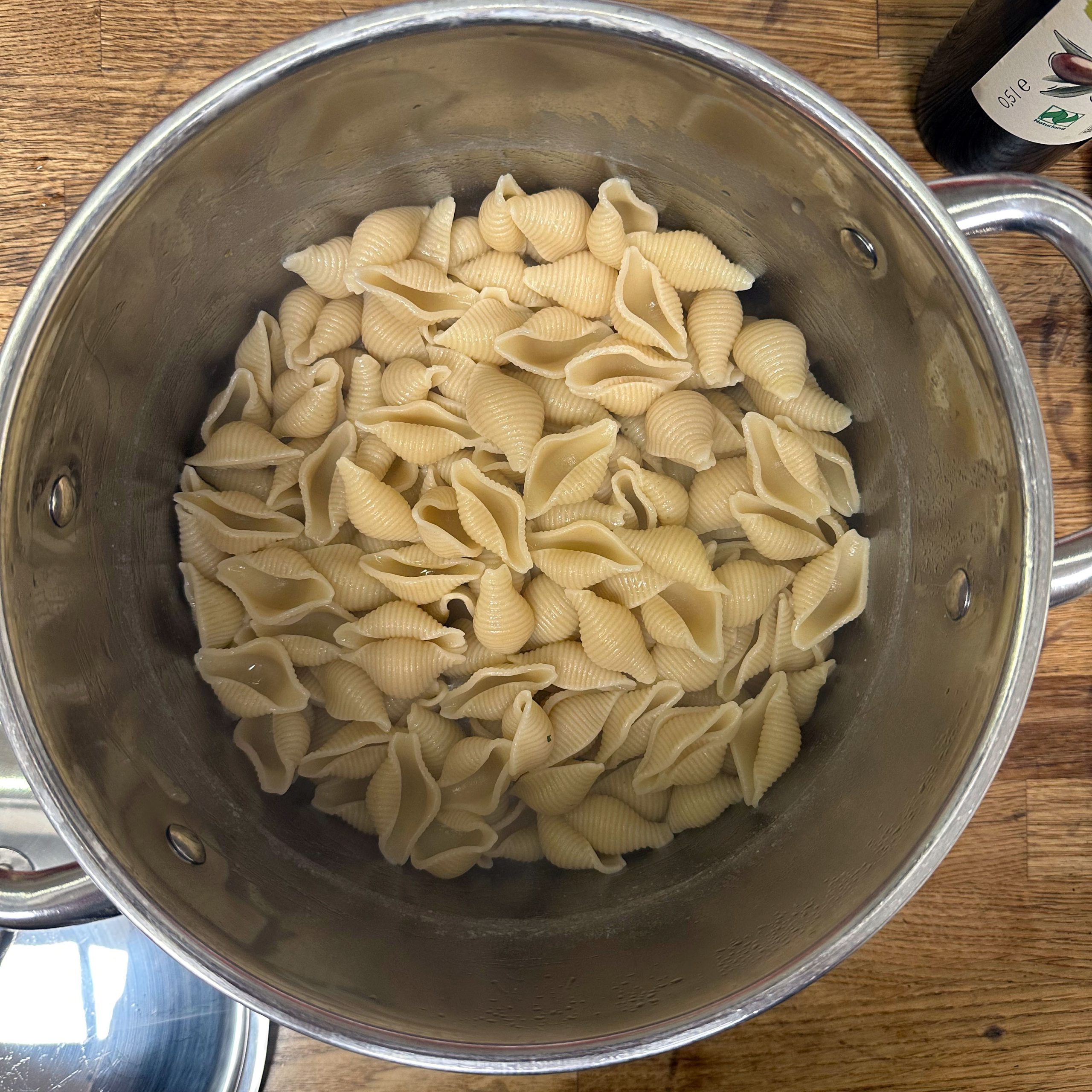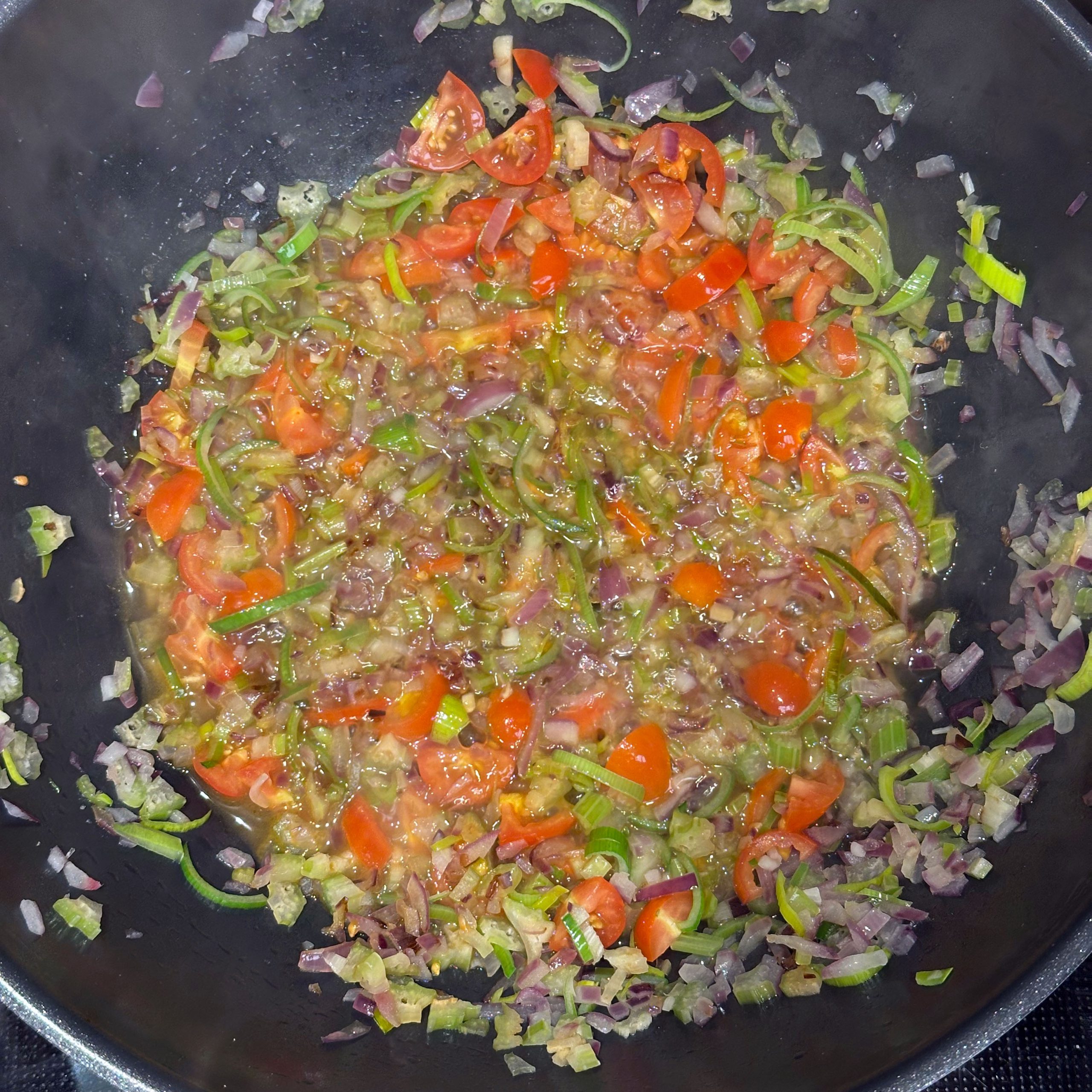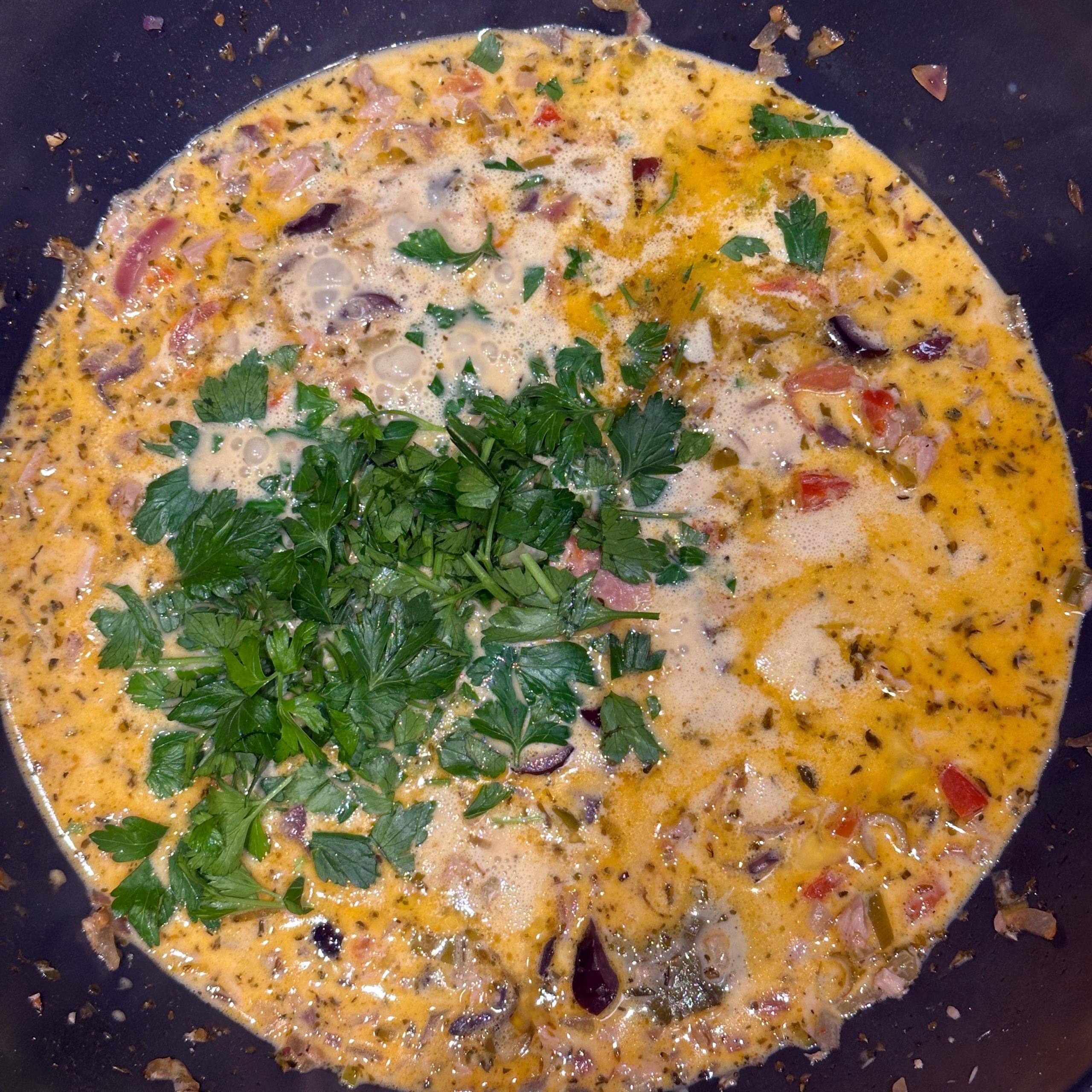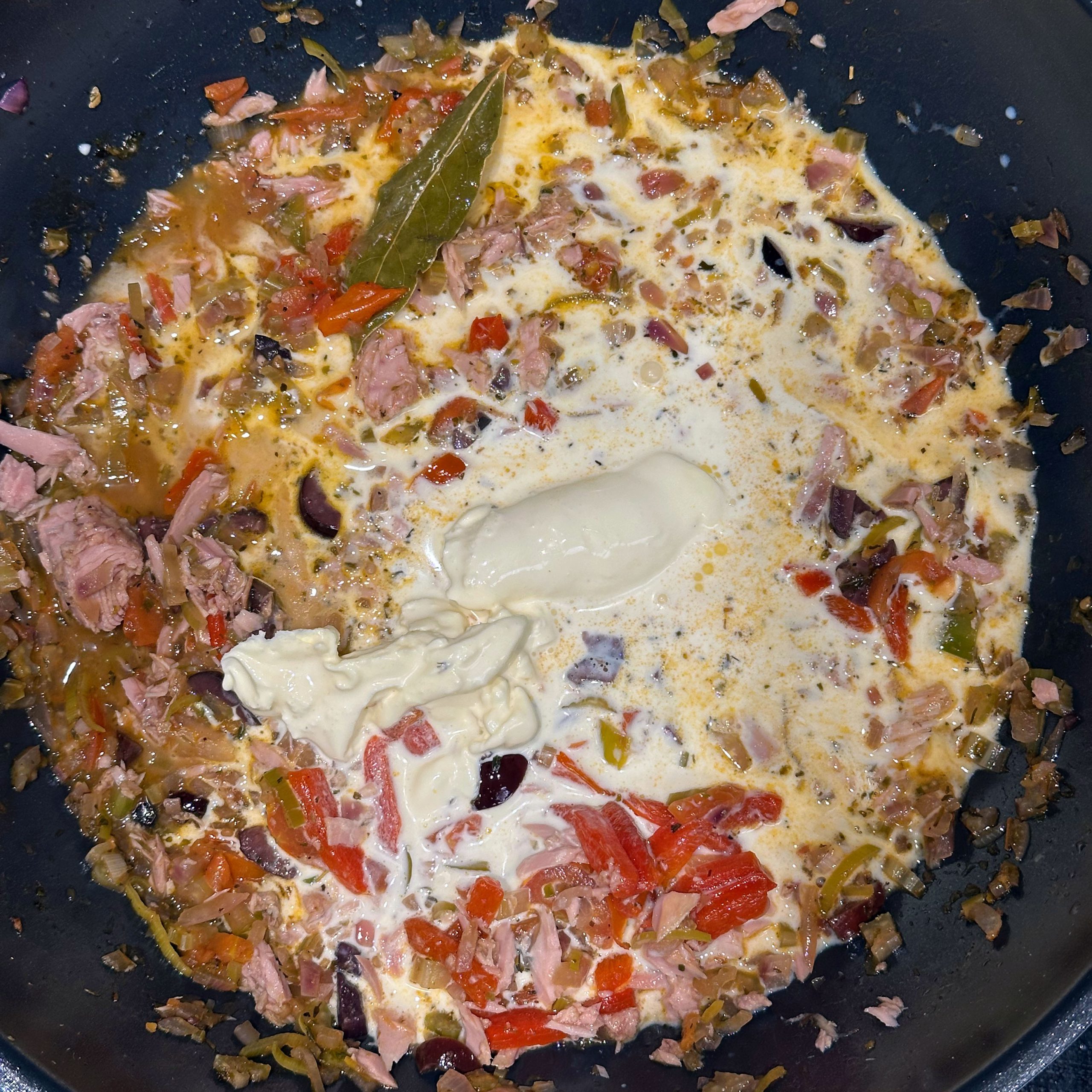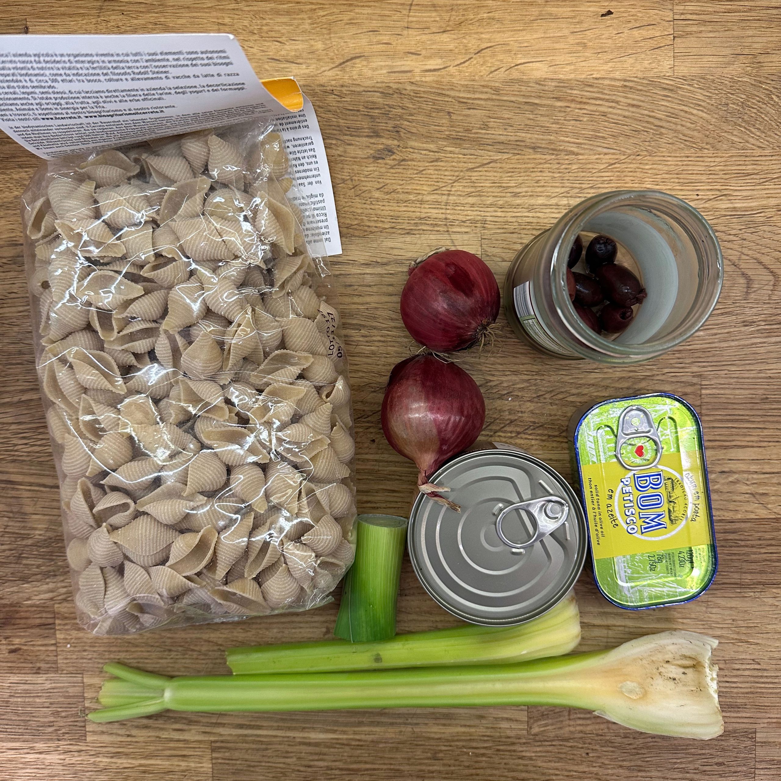 2 Zwiebeln würfeln, 2 Stangen Sellerie in kleine Würfel schneiden, ¼ Stange Lauch putzen und in feine Ringe schneiden und 8 Kirschtomaten vierteln. In einer großen Pfanne 3 EL Olivenöl erhitzen, die Zwiebeln glasig dünsten, dann Lauch und Sellerie hinzufügen und etwa 5 Minuten anbraten. Etwas Paprikasalat vom Vortag und die halbierten Kirschtomaten unterrühren. Mit 150ml Gemüsebrühe ablöschen und etwa 10 Minuten köcheln lassen. 300g Conchiglioni 12 Minuten in reichlich Salzwasser al dente kochen. 1 Dose Thunfisch abtropfen lassen und in groben Stücken zur Soße geben, nur kurz erwärmen. 150ml Sahne einrühren und die Soße kurz aufkochen lassen. Mit Salz, Pfeffer, 1 TL Oregano und 1 EL Zitronensaft abschmecken. Die abgegossenen Conchiglioni auf Tellern anrichten, die Thunfischsoße darüber geben und mit frisch gehackter Petersilie bestreuen. Sofort servieren.