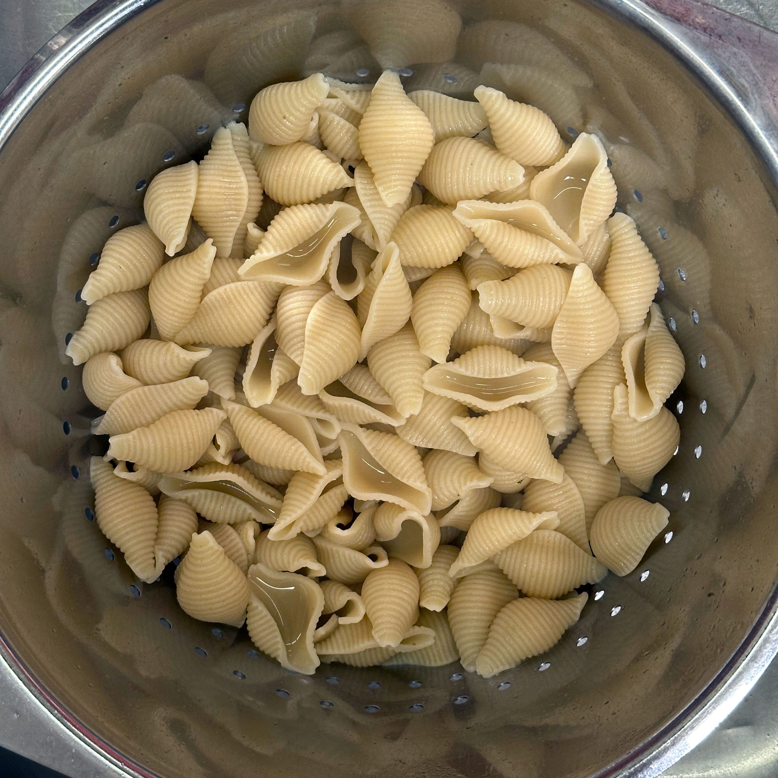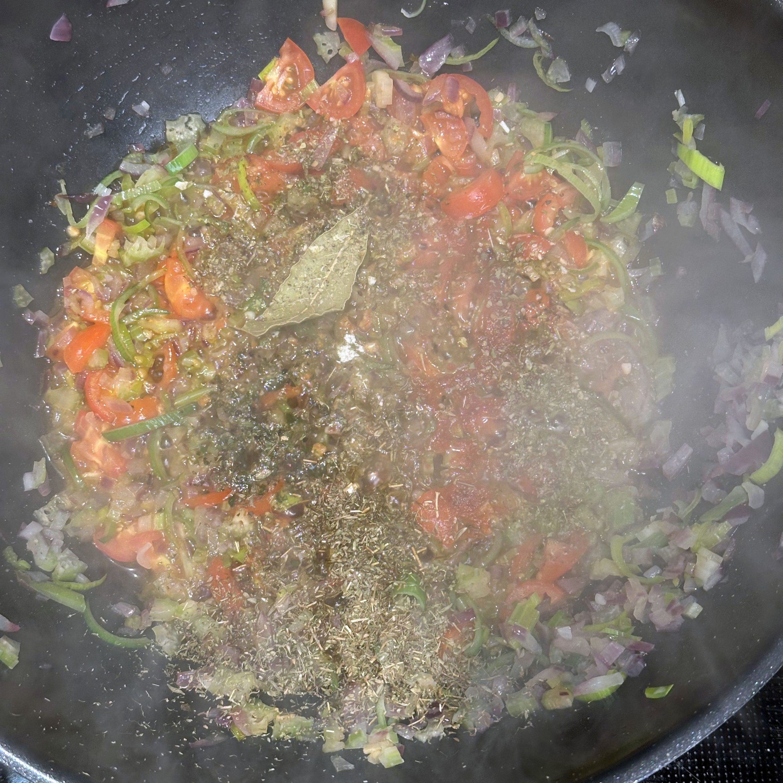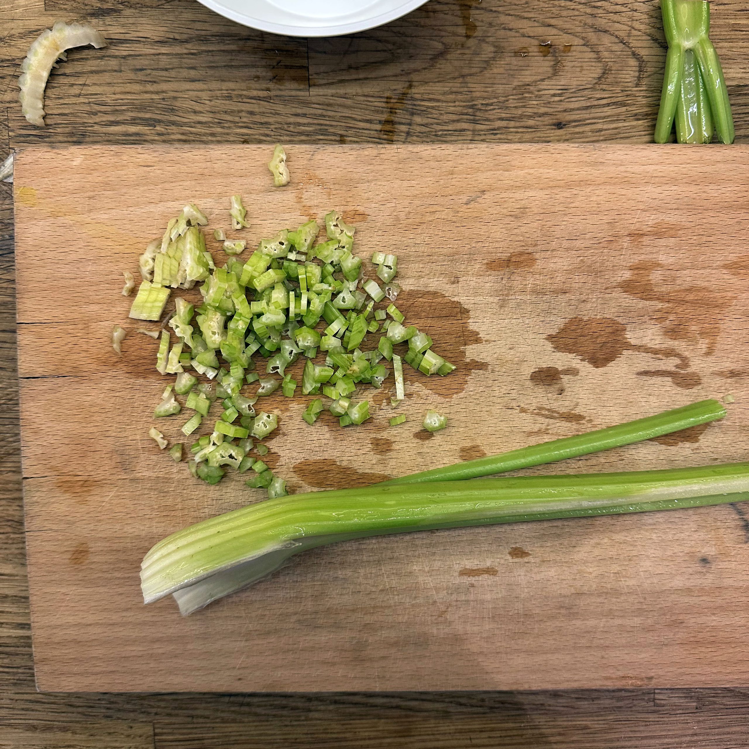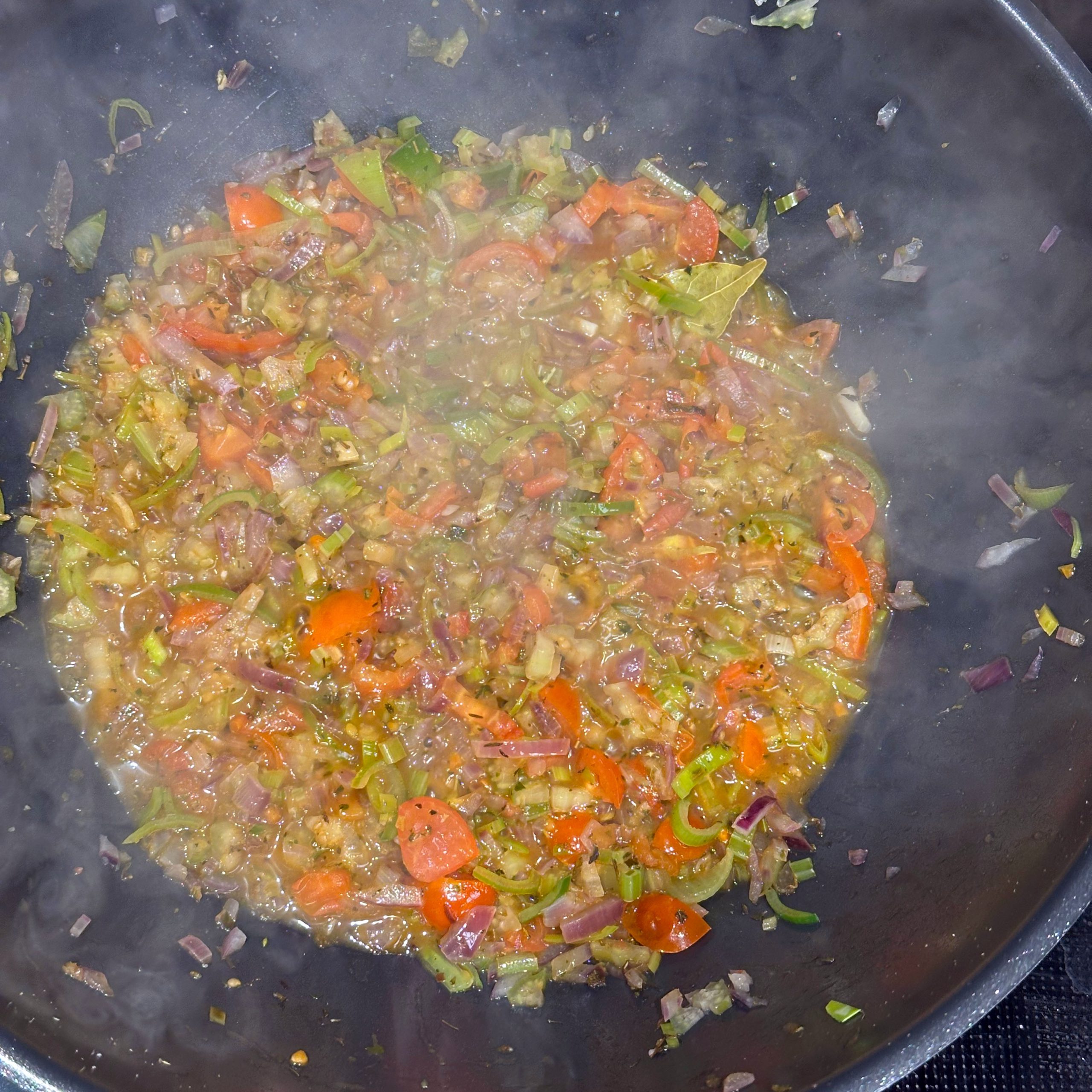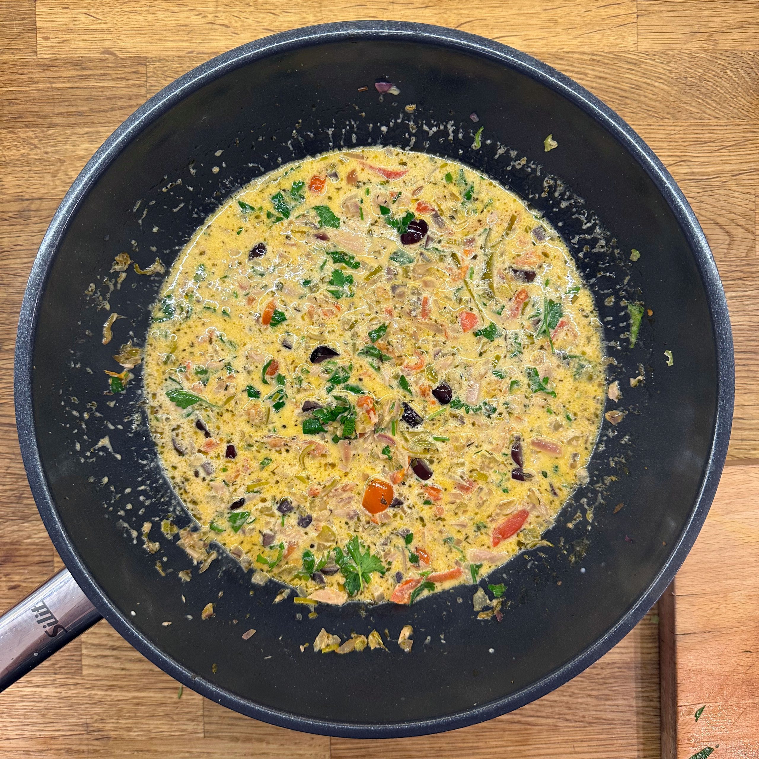 2 Zwiebeln würfeln, 2 Stangen Sellerie in kleine Würfel schneiden, ¼ Stange Lauch putzen und in feine Ringe schneiden und 8 Kirschtomaten vierteln. In einer großen Pfanne 3 EL Olivenöl erhitzen, die Zwiebeln glasig dünsten, dann Lauch und Sellerie hinzufügen und etwa 5 Minuten anbraten. Etwas Paprikasalat vom Vortag und die halbierten Kirschtomaten unterrühren. Mit 150ml Gemüsebrühe ablöschen und etwa 10 Minuten köcheln lassen. 300g Conchiglioni 12 Minuten in reichlich Salzwasser al dente kochen. 1 Dose Thunfisch abtropfen lassen und in groben Stücken zur Soße geben, nur kurz erwärmen. 150ml Sahne einrühren und die Soße kurz aufkochen lassen. Mit Salz, Pfeffer, 1 TL Oregano und 1 EL Zitronensaft abschmecken. Die abgegossenen Conchiglioni auf Tellern anrichten, die Thunfischsoße darüber geben und mit frisch gehackter Petersilie bestreuen. Sofort servieren.