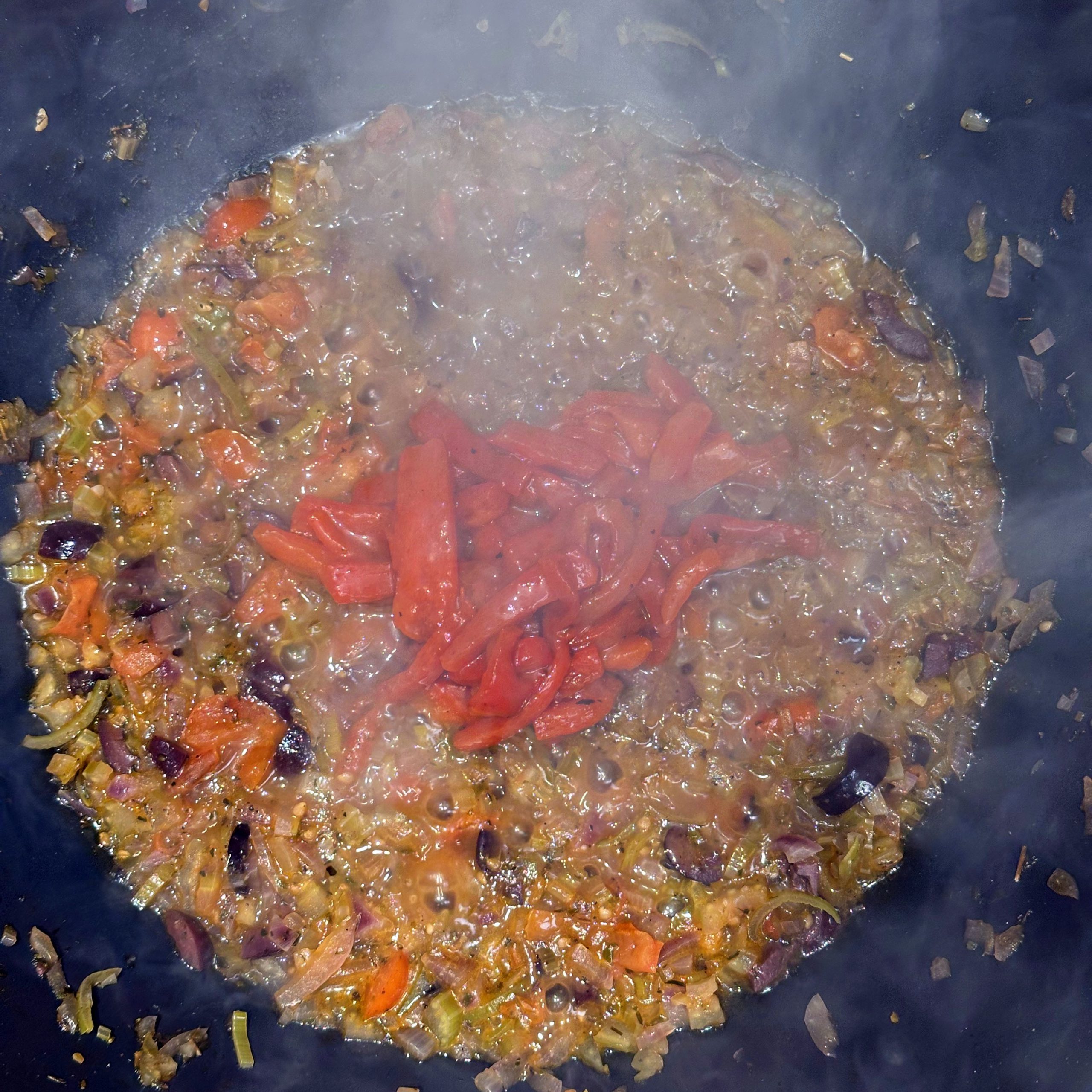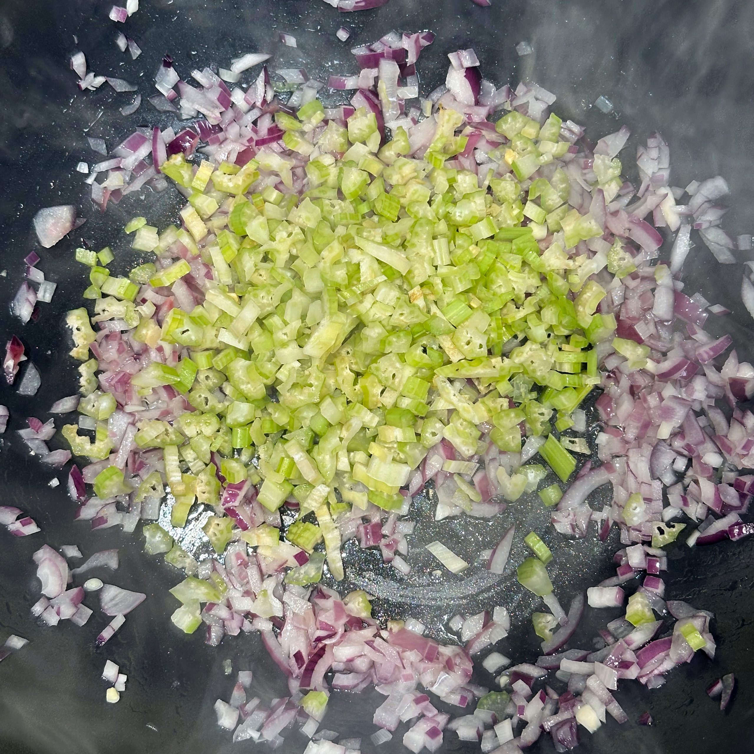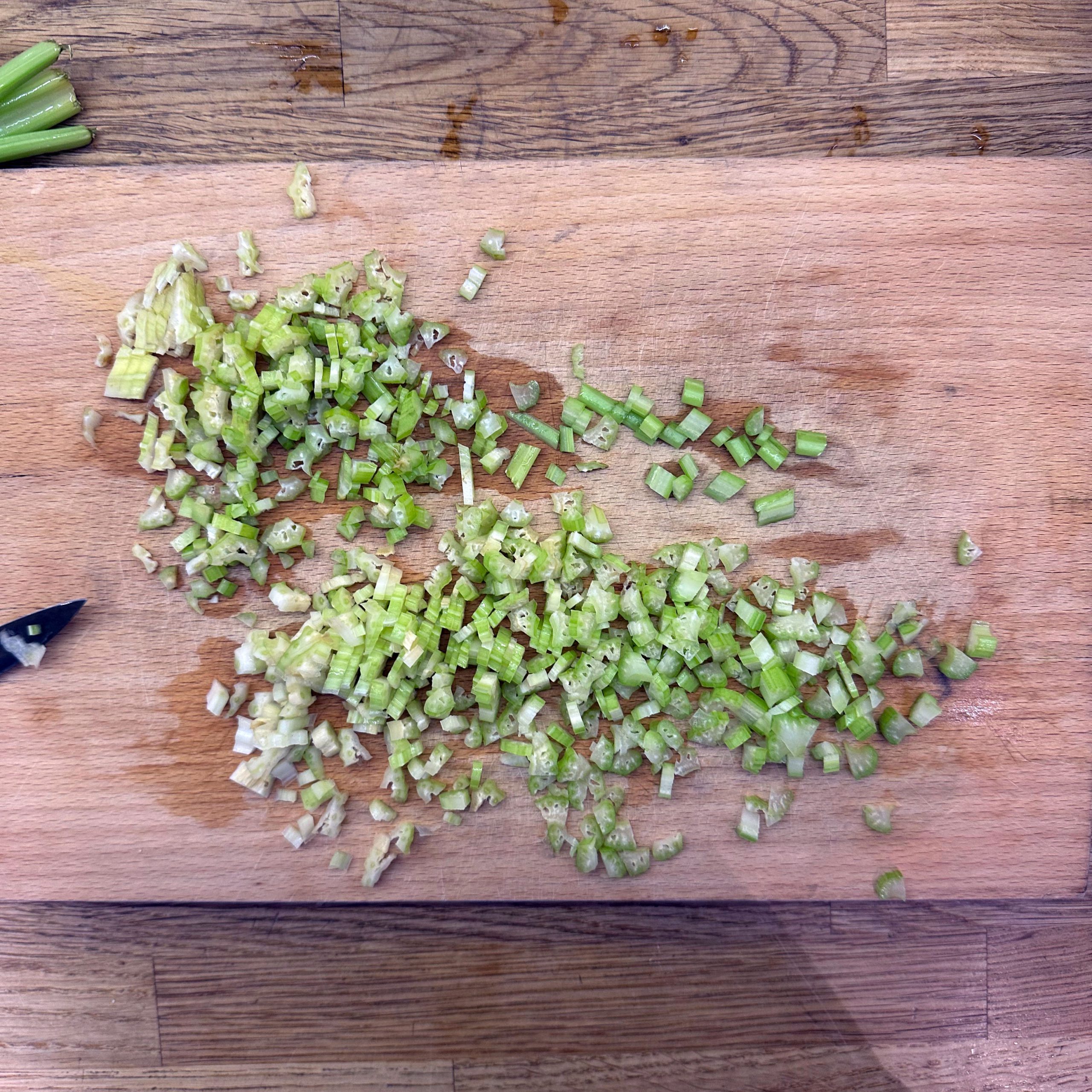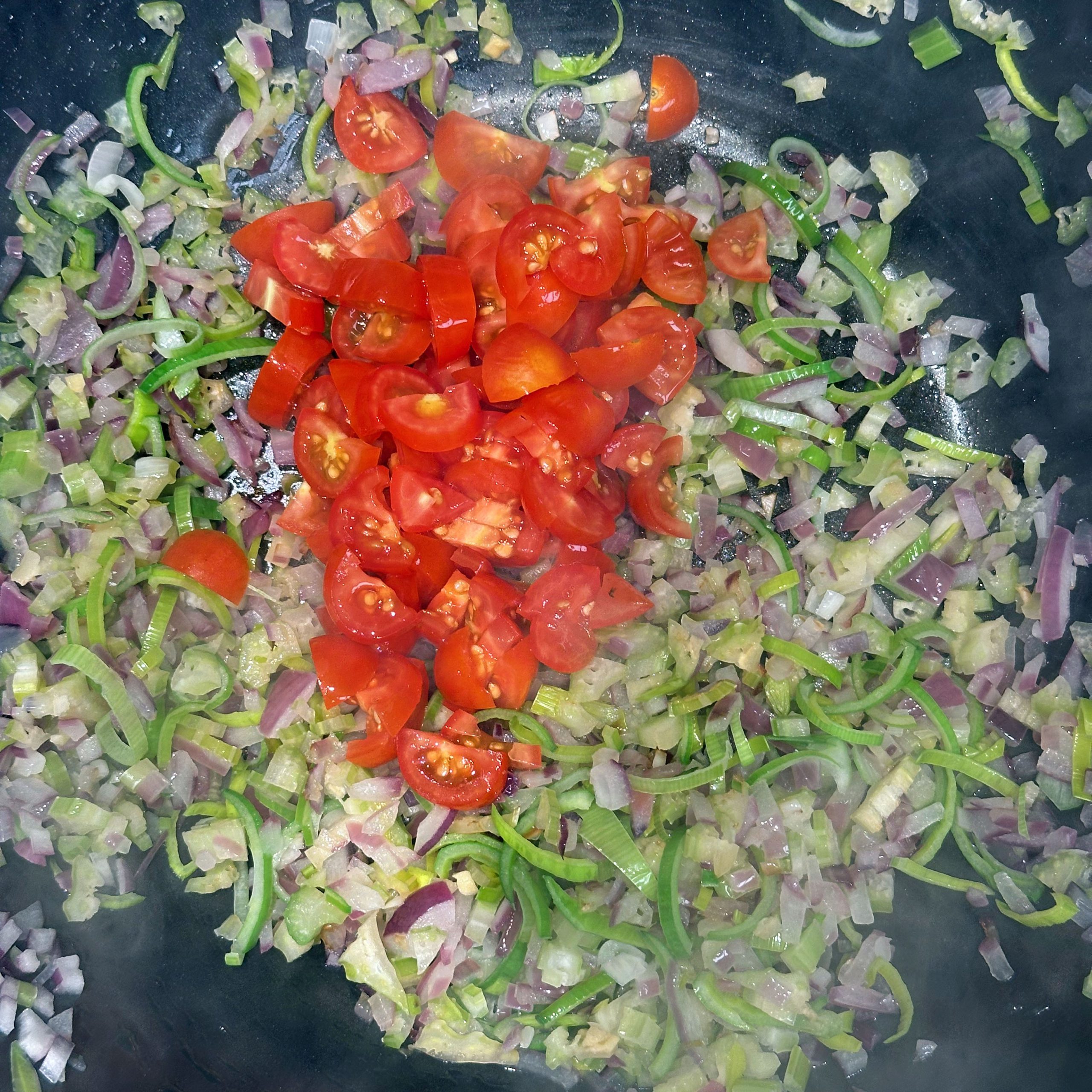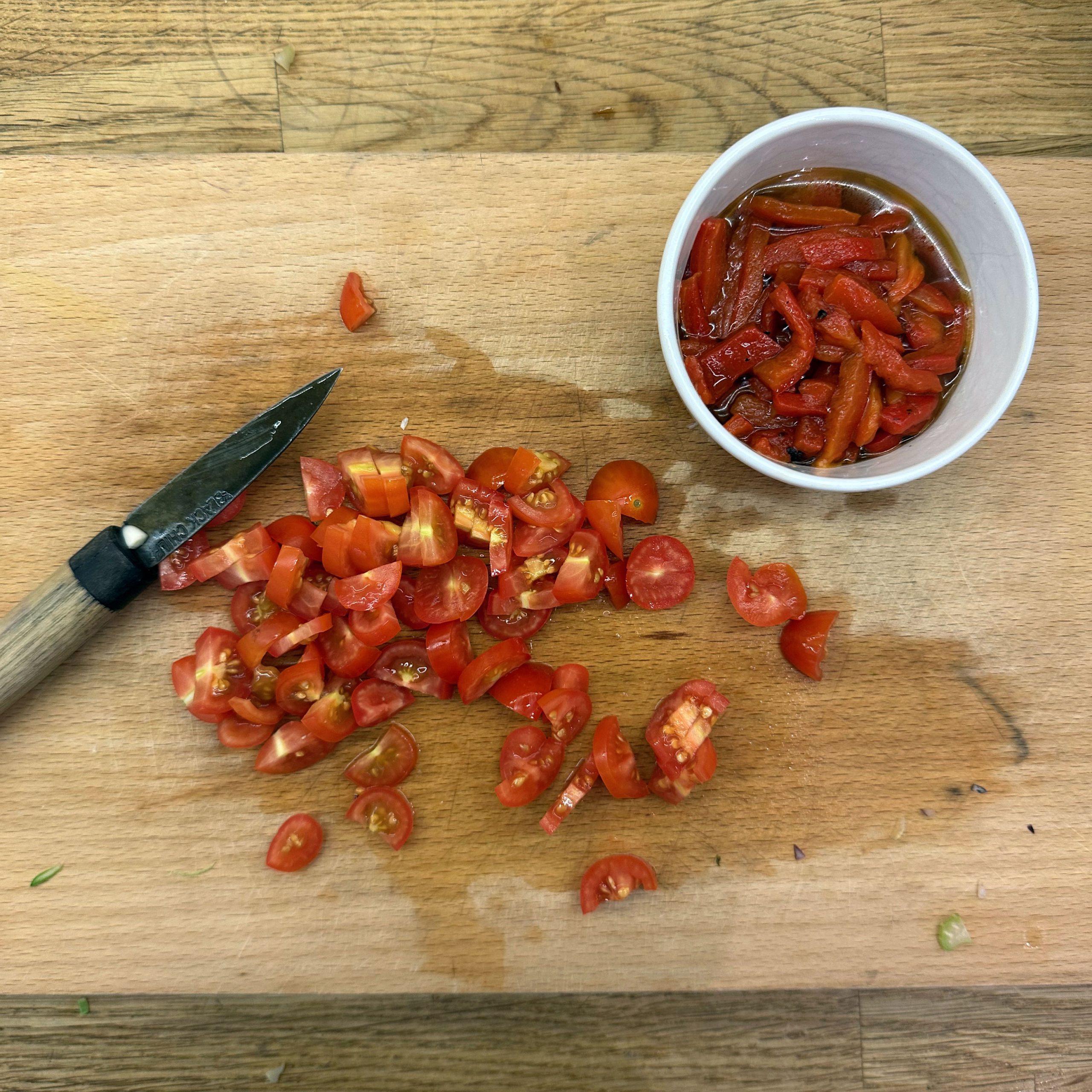 2 Zwiebeln würfeln, 2 Stangen Sellerie in kleine Würfel schneiden, ¼ Stange Lauch putzen und in feine Ringe schneiden und 8 Kirschtomaten vierteln. In einer großen Pfanne 3 EL Olivenöl erhitzen, die Zwiebeln glasig dünsten, dann Lauch und Sellerie hinzufügen und etwa 5 Minuten anbraten. Etwas Paprikasalat vom Vortag und die halbierten Kirschtomaten unterrühren. Mit 150ml Gemüsebrühe ablöschen und etwa 10 Minuten köcheln lassen. 300g Conchiglioni 12 Minuten in reichlich Salzwasser al dente kochen. 1 Dose Thunfisch abtropfen lassen und in groben Stücken zur Soße geben, nur kurz erwärmen. 150ml Sahne einrühren und die Soße kurz aufkochen lassen. Mit Salz, Pfeffer, 1 TL Oregano und 1 EL Zitronensaft abschmecken. Die abgegossenen Conchiglioni auf Tellern anrichten, die Thunfischsoße darüber geben und mit frisch gehackter Petersilie bestreuen. Sofort servieren.