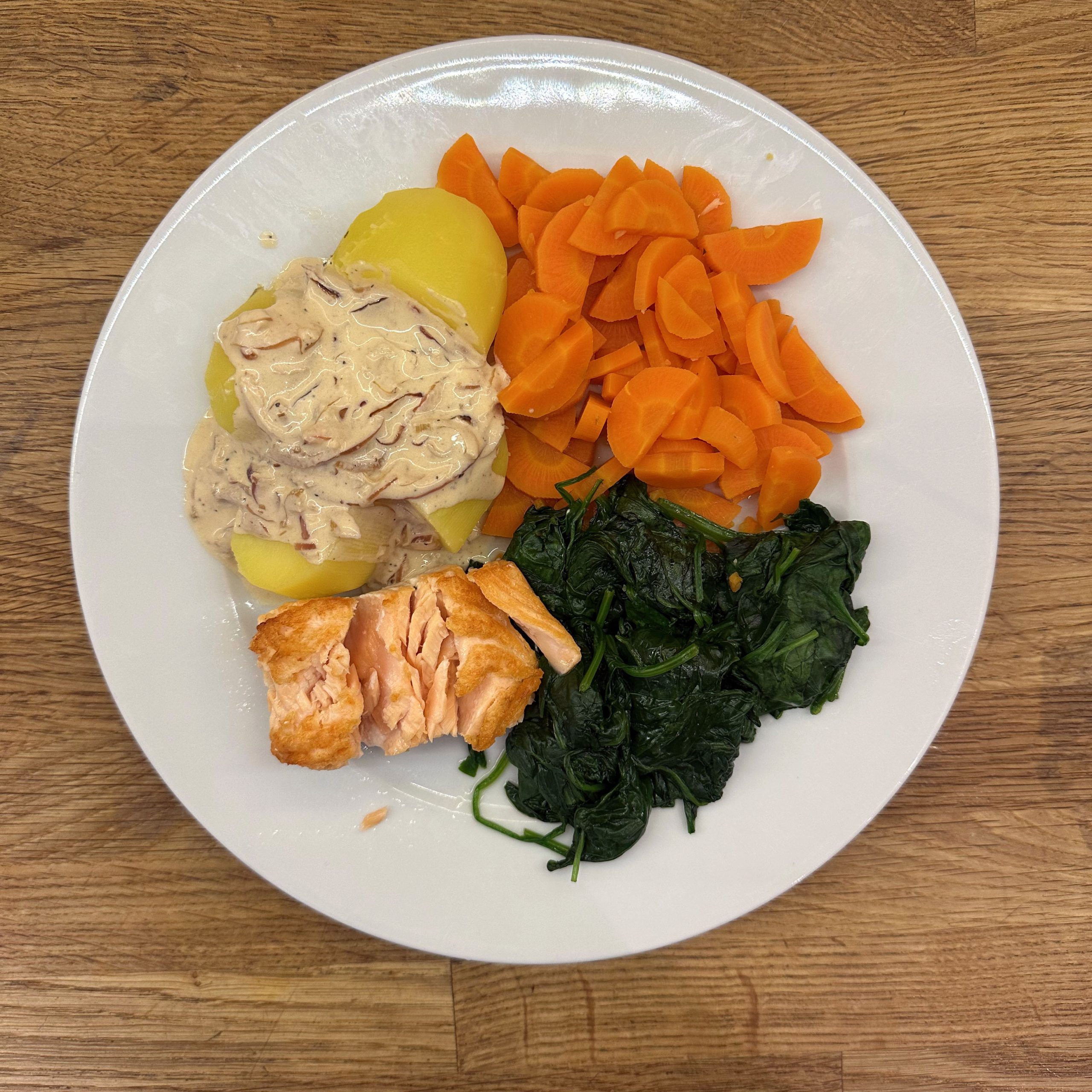 Schnelles Welcome-Back-Essen: 250g Babyspinat in einer Pfanne mit etwas Öl dünsten, bis er zusammenfällt. In der gleichen Pfanne das Lachsfilet scharf anbraten und im Ofen in Alufolie gewickelt bei 120° 10min nachgaren lassen. 6 Kartoffeln schälen, waschen, halbieren und weich kochen. 2 Möhren schälen, in halbe Scheiben schneiden, mit ein paar Ingwerstückchen in Brühe dünsten. 1 Zwiebel im Sud vom Lachs anbraten, 2 EL Crème fraîche dazugeben und mit etwas Zitrone, Sojasoße abschmecken. Alles schön auf einem Teller arrangieren.
