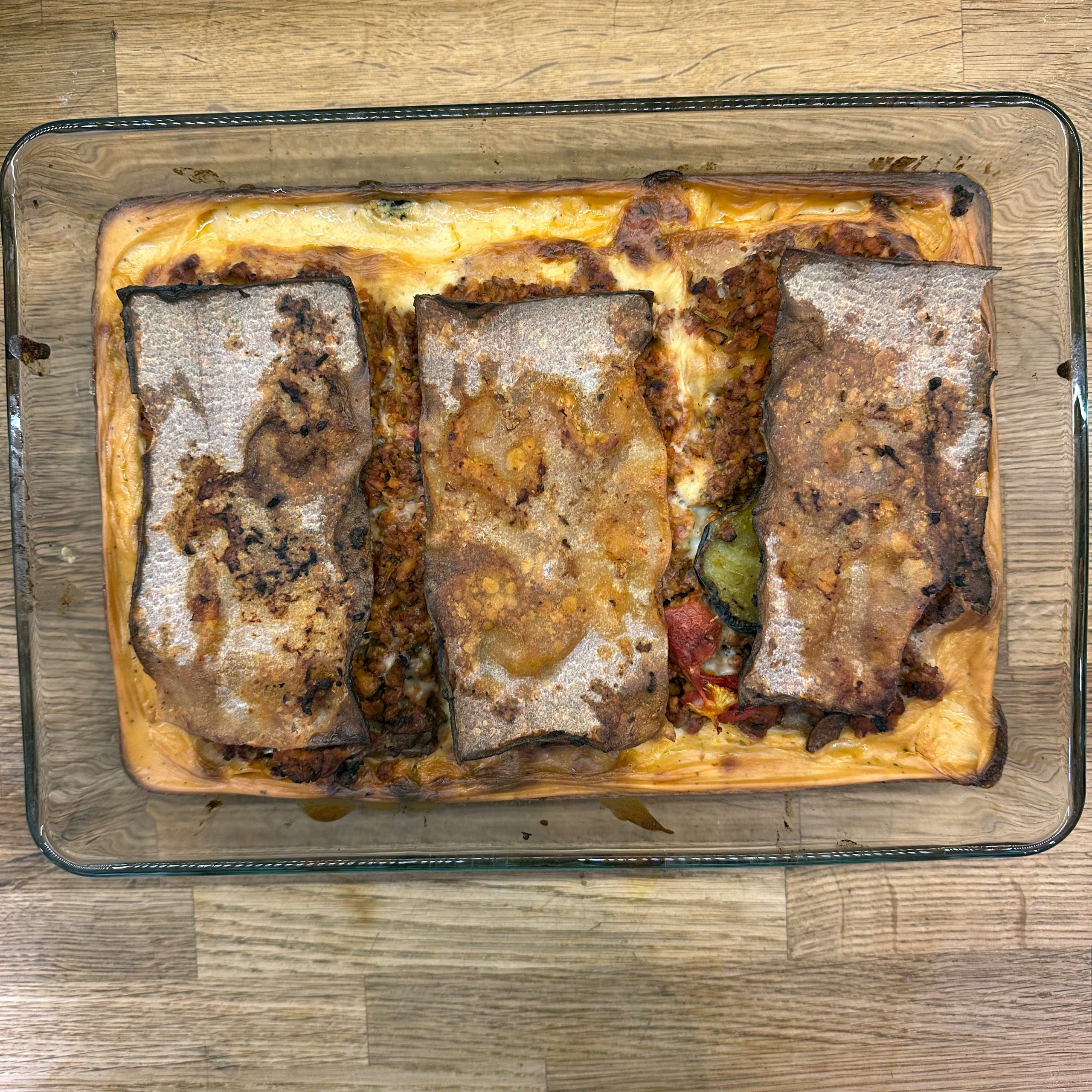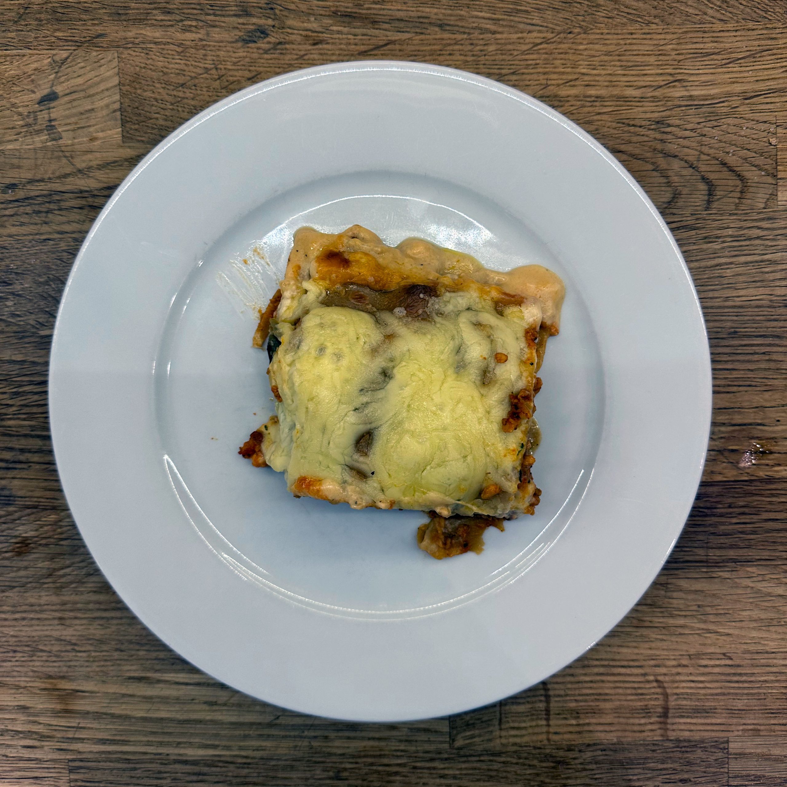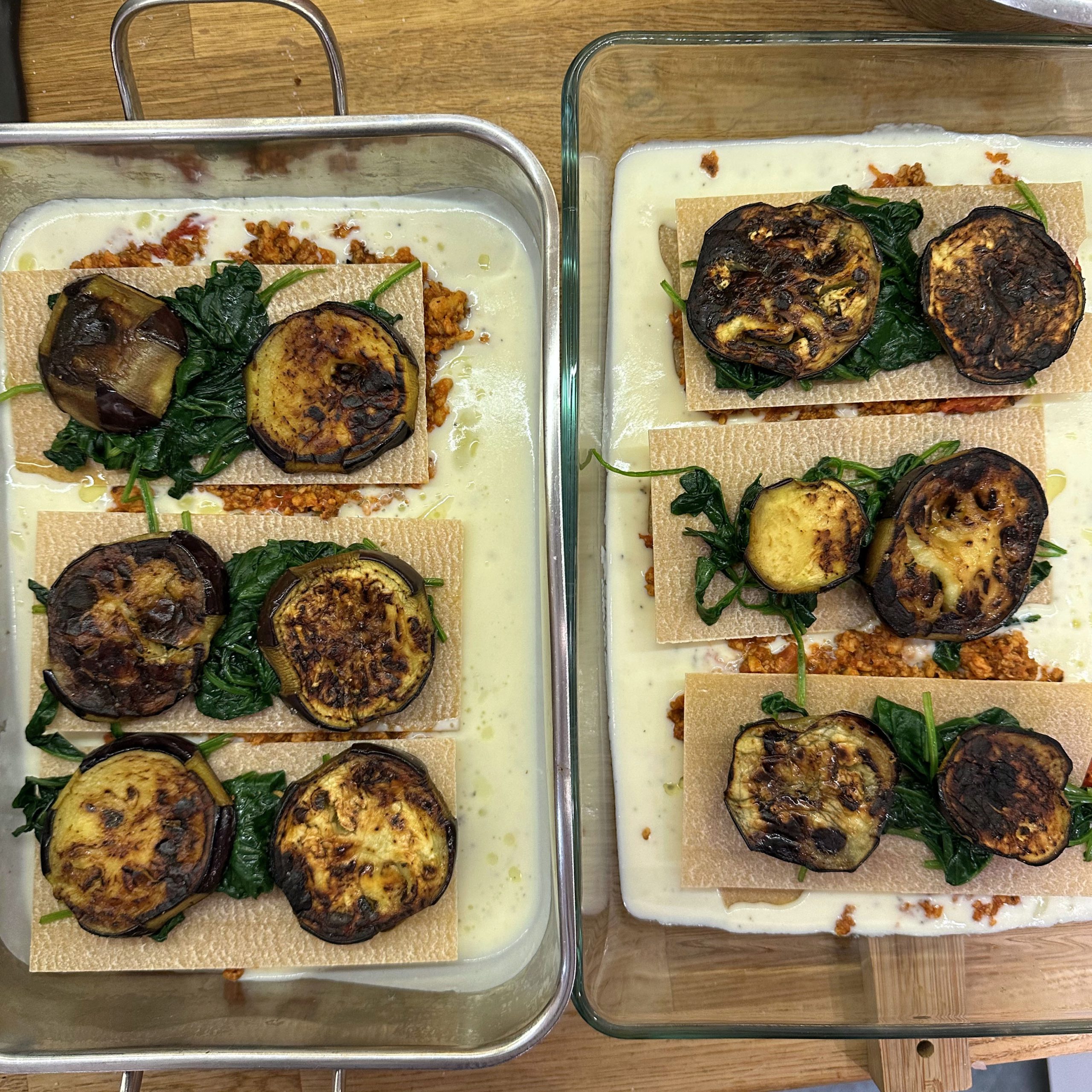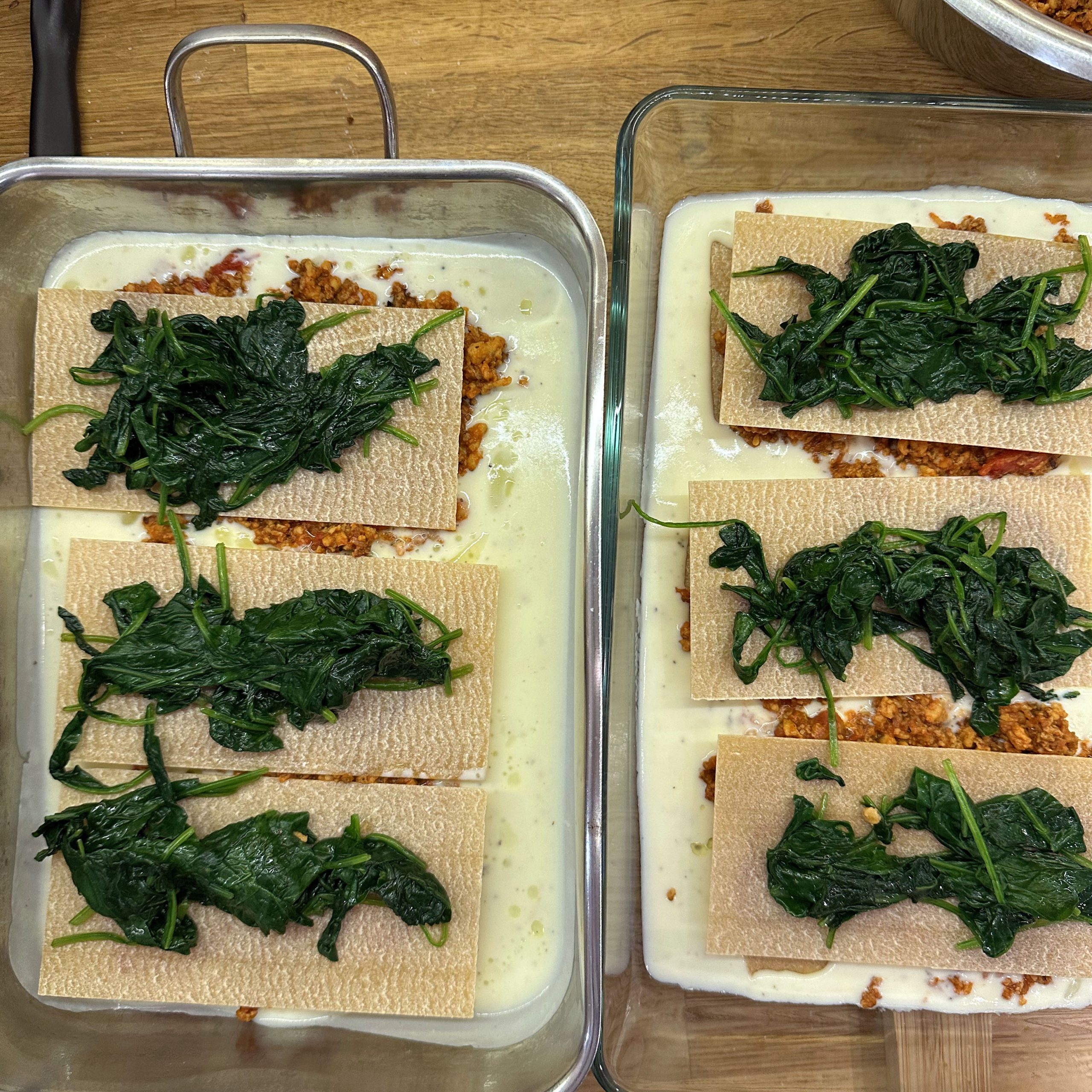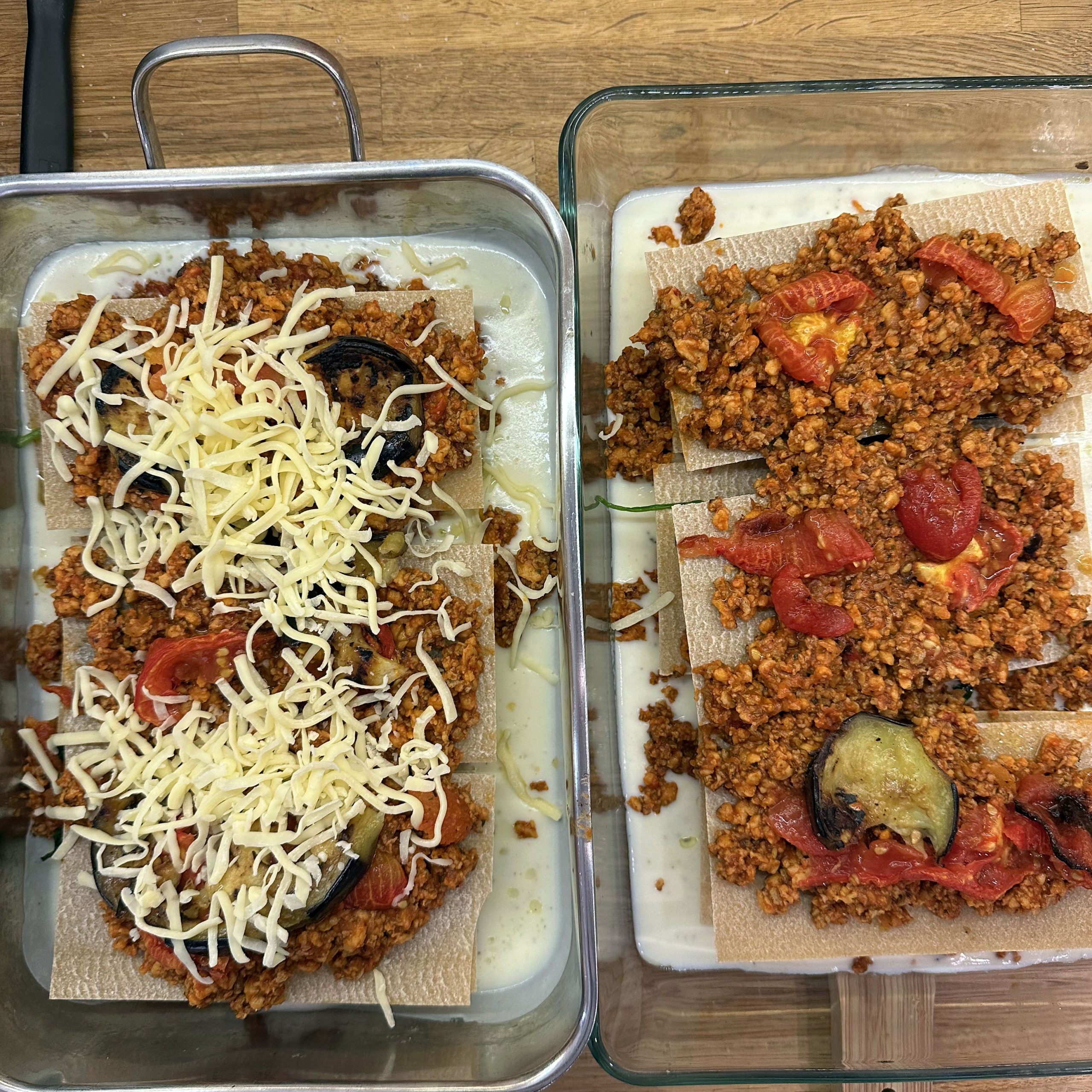 8 Tomaten blanchieren, enthäuten, halbieren, entkernen und mit Olivenöl und Salz bei 180°C etwa 40 Minuten im Ofen rösten, bis sie eingefallen sind. 2 mittelgroße Auberginen in Scheiben schneiden, salzen, 30 Minuten entwässern lassen, trocken tupfen und in Olivenöl von beiden Seiten goldbraun braten. 500g frischen Spinat waschen und in einer Pfanne kurz zusammenfallen lassen, gut ausdrücken. Für die Tofubolognese 400g Tofuhack mit kochendem Wasser übergießen, 10min ziehen lassen, auswringen und in einer Pfanne mit 2 EL Olivenöl goldbraun braten, 1 gewürfelte Zwiebel hinzufügen und glasig dünsten, 2 EL Tomatenmark einrühren, mit 1 Dose gehackten Tomaten (400g) und 100ml Gemüsebrühe ablöschen, mit 1 TL Oregano, 1 TL Thymian, Salz und Pfeffer würzen und 15 Minuten köcheln lassen. Eine Bechamelsoße aus 80g Butter, 80g Mehl und 1l Milch zubereiten, mit Salz und Pfeffer würzen. Eine Auflaufform einfetten und schichtweise aufbauen: etwas Bechamelsoße auf den Boden, 3 Lasagneblätter, Tofubolognese, Spinat, Auberginenscheiben, Ofentomaten, wieder Lasagneblätter und diese Schichtung wiederholen. Als oberste Schicht Lasagneblätter auflegen, mit der restlichen Bechamelsoße bedecken und mit 100g geriebenem Käse bestreuen. Die Lasagne bei 180°C etwa 40-45 Minuten backen, bis sie goldbraun ist, 10 Minuten ruhen lassen und in Stücke geschnitten servieren.