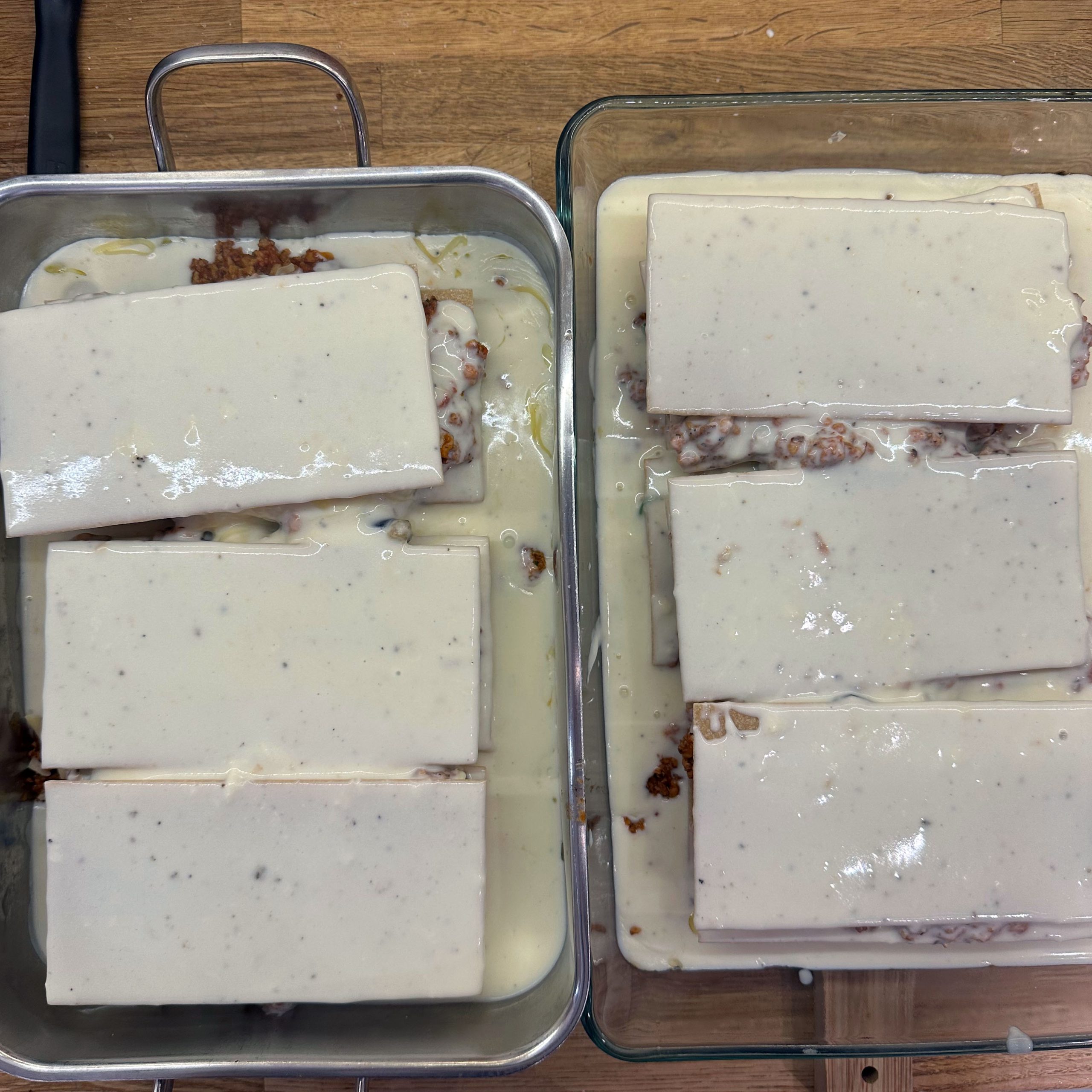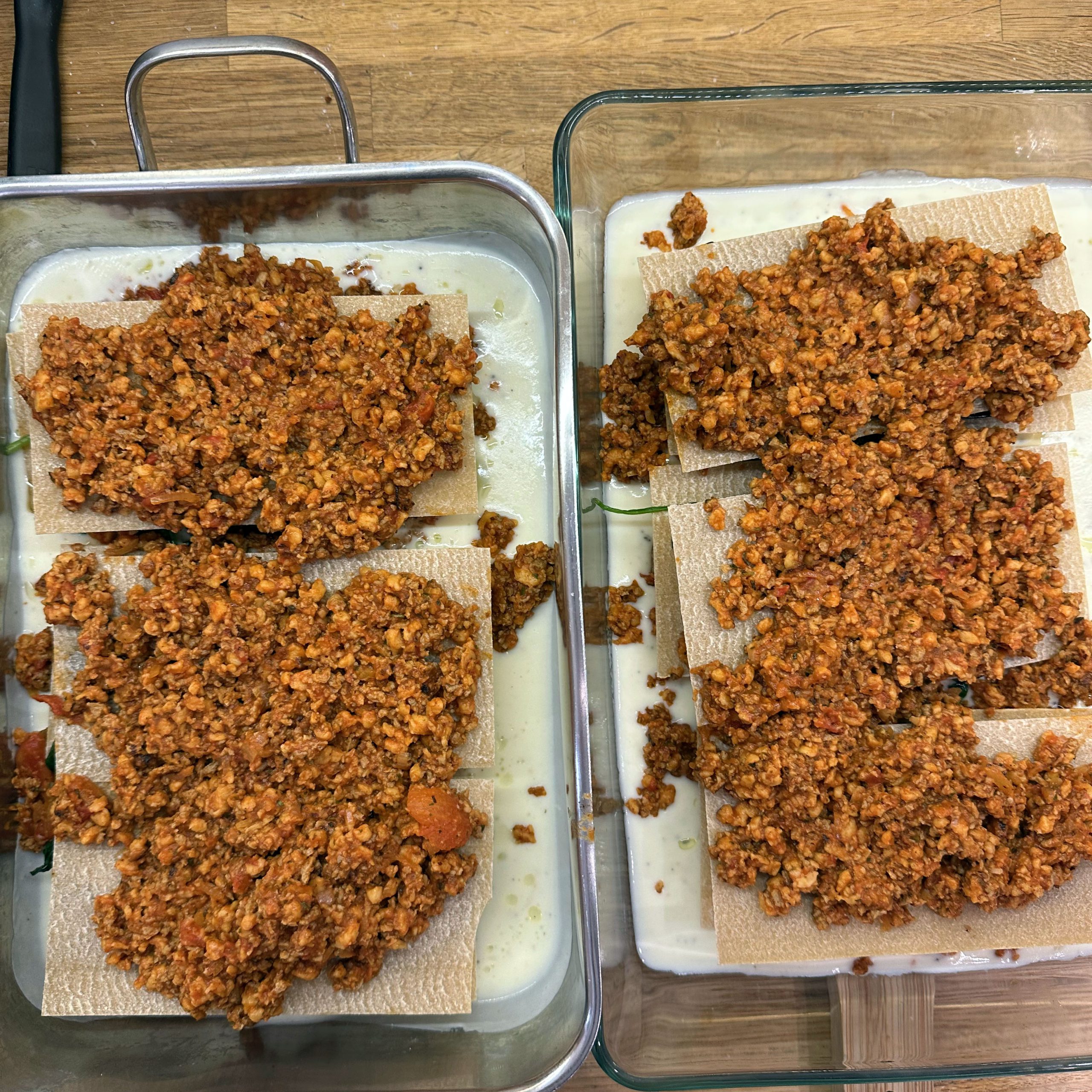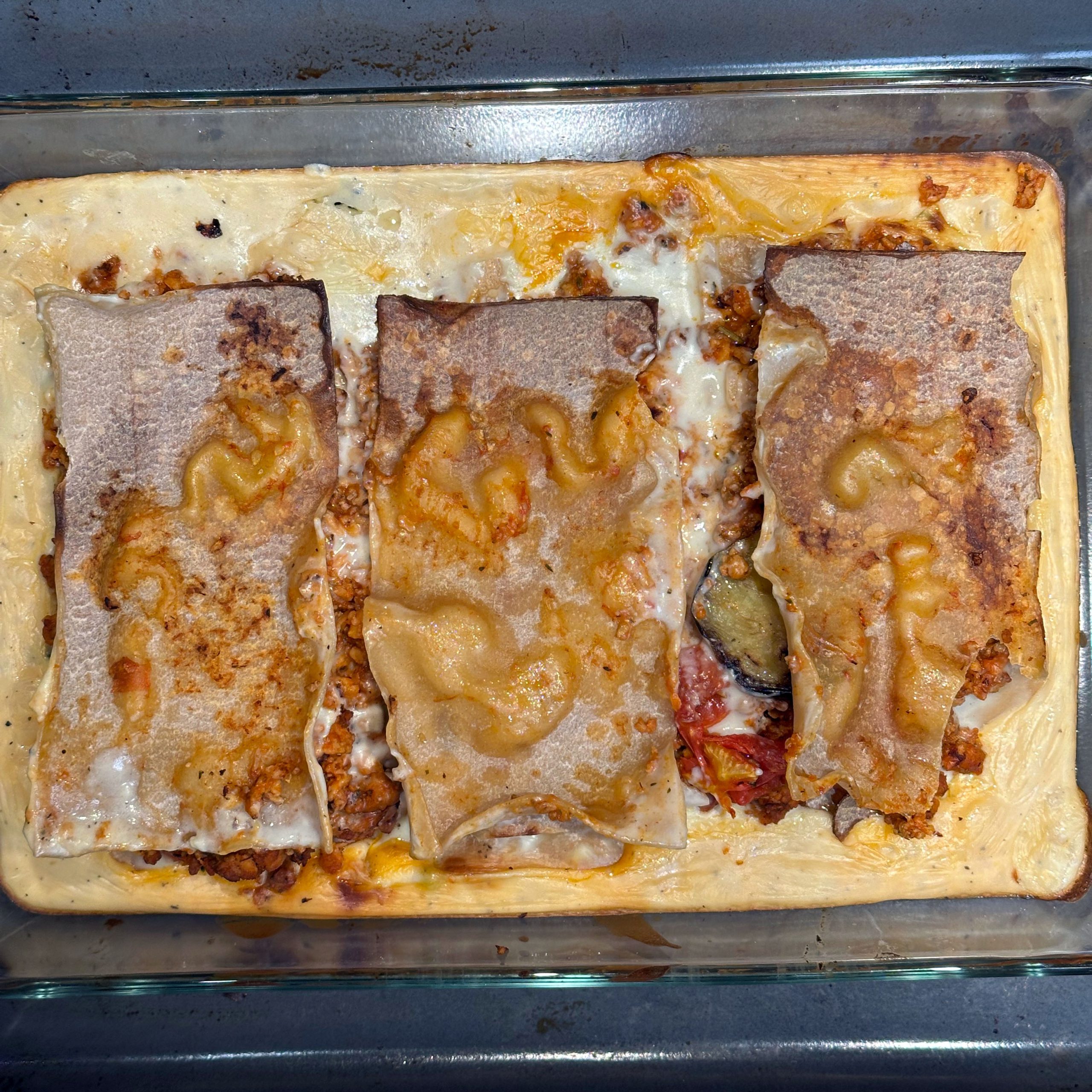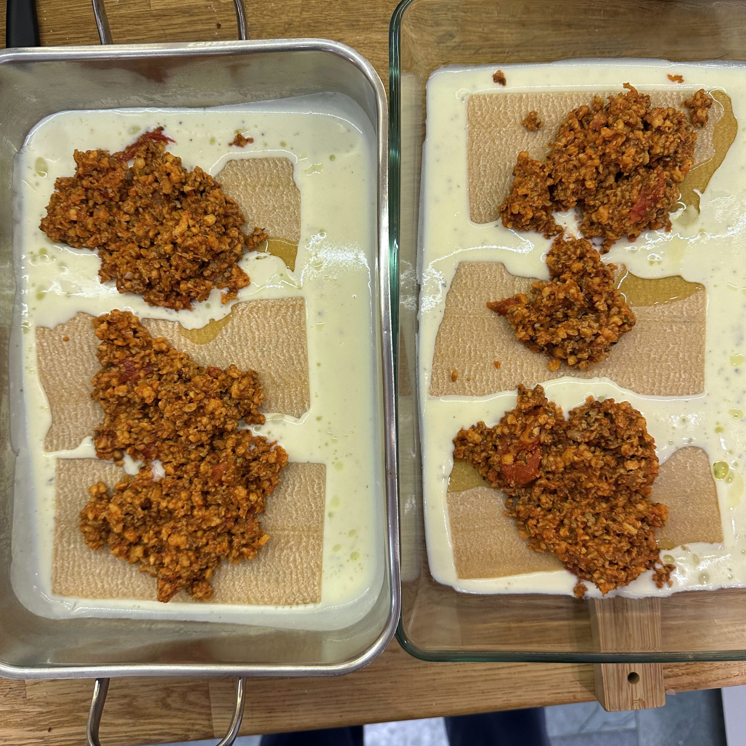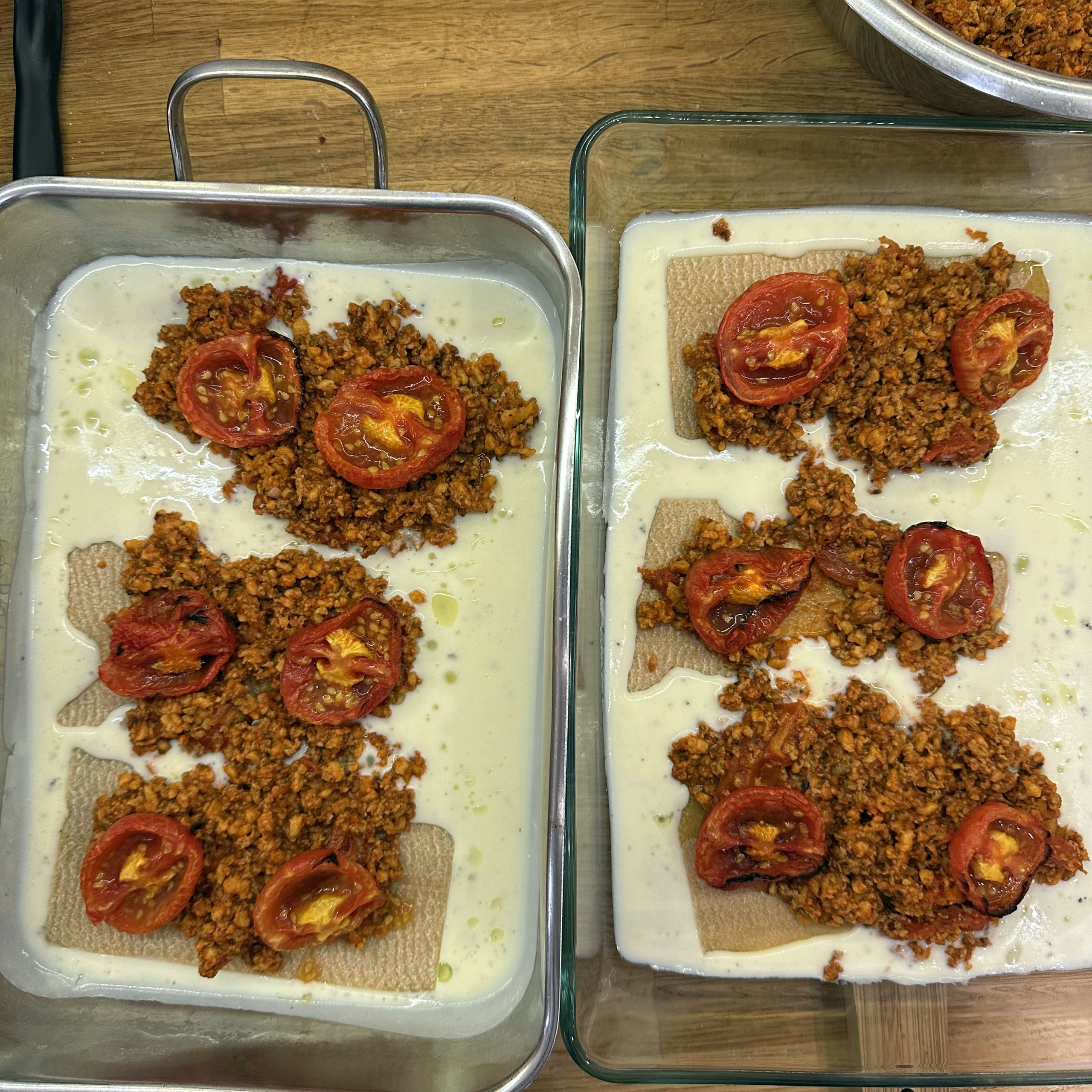8 Tomaten blanchieren, enthäuten, halbieren, entkernen und mit Olivenöl und Salz bei 180°C etwa 40 Minuten im Ofen rösten, bis sie eingefallen sind. 2 mittelgroße Auberginen in Scheiben schneiden, salzen, 30 Minuten entwässern lassen, trocken tupfen und in Olivenöl von beiden Seiten goldbraun braten. 500g frischen Spinat waschen und in einer Pfanne kurz zusammenfallen lassen, gut ausdrücken. Für die Tofubolognese 400g Tofuhack mit kochendem Wasser übergießen, 10min ziehen lassen, auswringen und in einer Pfanne mit 2 EL Olivenöl goldbraun braten, 1 gewürfelte Zwiebel hinzufügen und glasig dünsten, 2 EL Tomatenmark einrühren, mit 1 Dose gehackten Tomaten (400g) und 100ml Gemüsebrühe ablöschen, mit 1 TL Oregano, 1 TL Thymian, Salz und Pfeffer würzen und 15 Minuten köcheln lassen. Eine Bechamelsoße aus 80g Butter, 80g Mehl und 1l Milch zubereiten, mit Salz und Pfeffer würzen. Eine Auflaufform einfetten und schichtweise aufbauen: etwas Bechamelsoße auf den Boden, 3 Lasagneblätter, Tofubolognese, Spinat, Auberginenscheiben, Ofentomaten, wieder Lasagneblätter und diese Schichtung wiederholen. Als oberste Schicht Lasagneblätter auflegen, mit der restlichen Bechamelsoße bedecken und mit 100g geriebenem Käse bestreuen. Die Lasagne bei 180°C etwa 40-45 Minuten backen, bis sie goldbraun ist, 10 Minuten ruhen lassen und in Stücke geschnitten servieren.