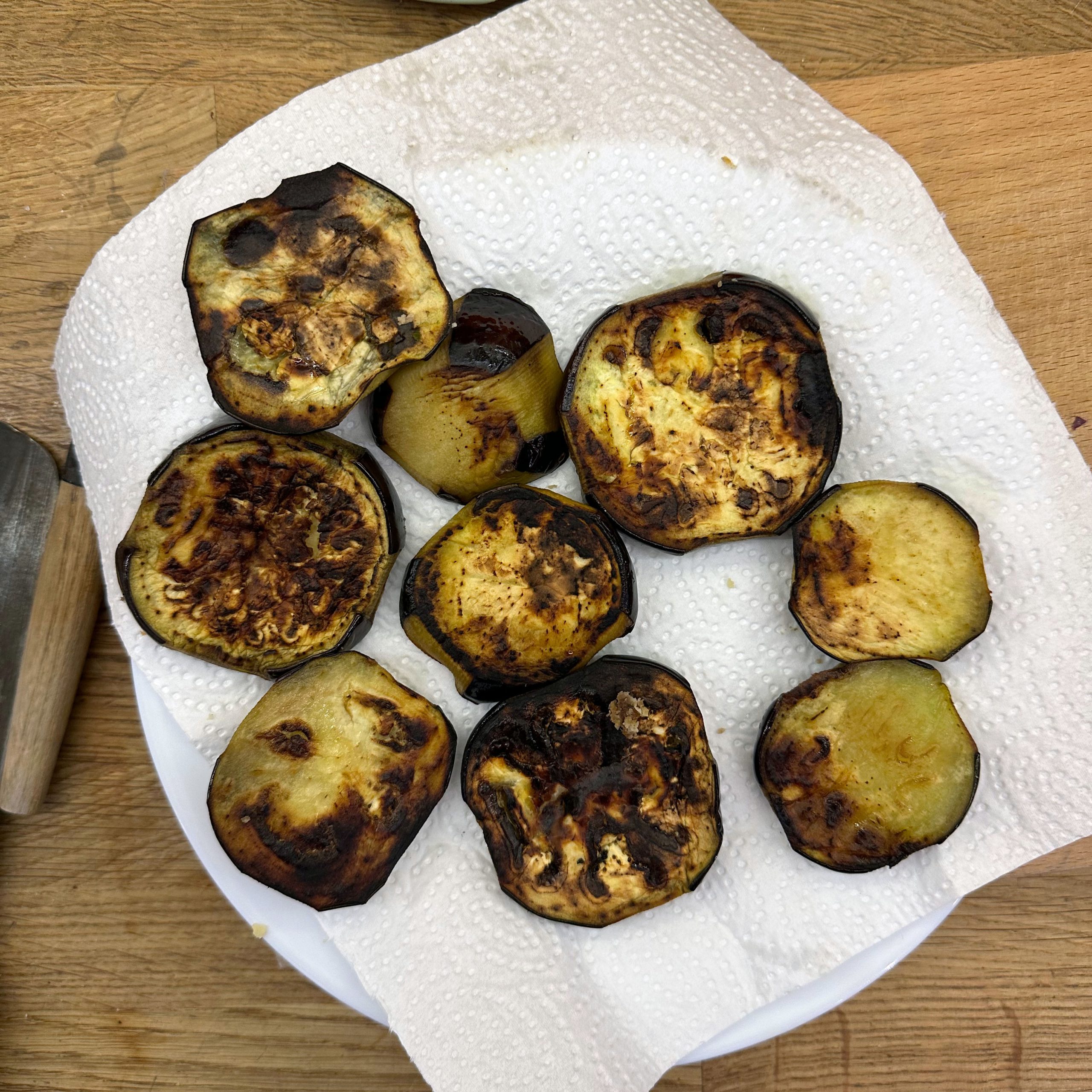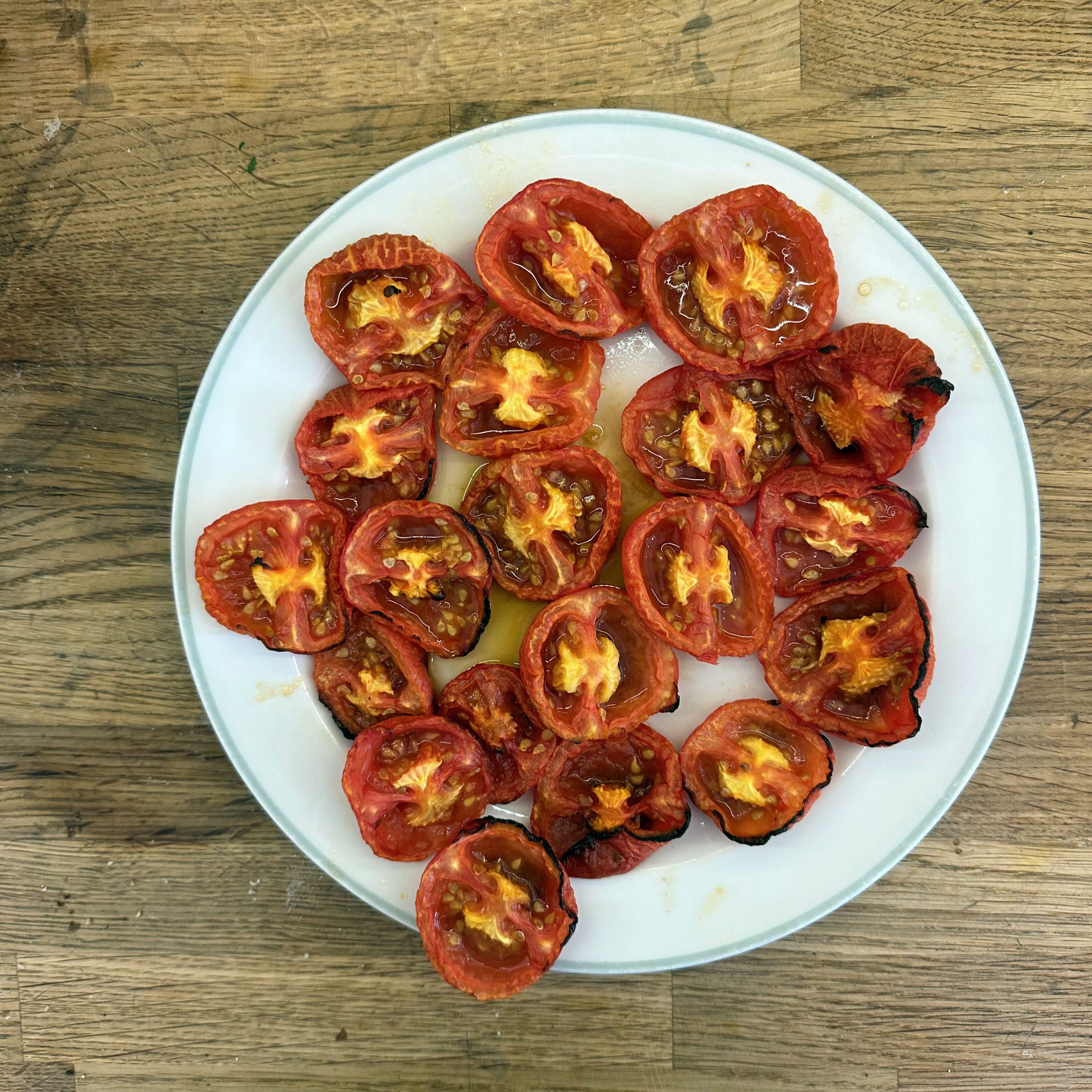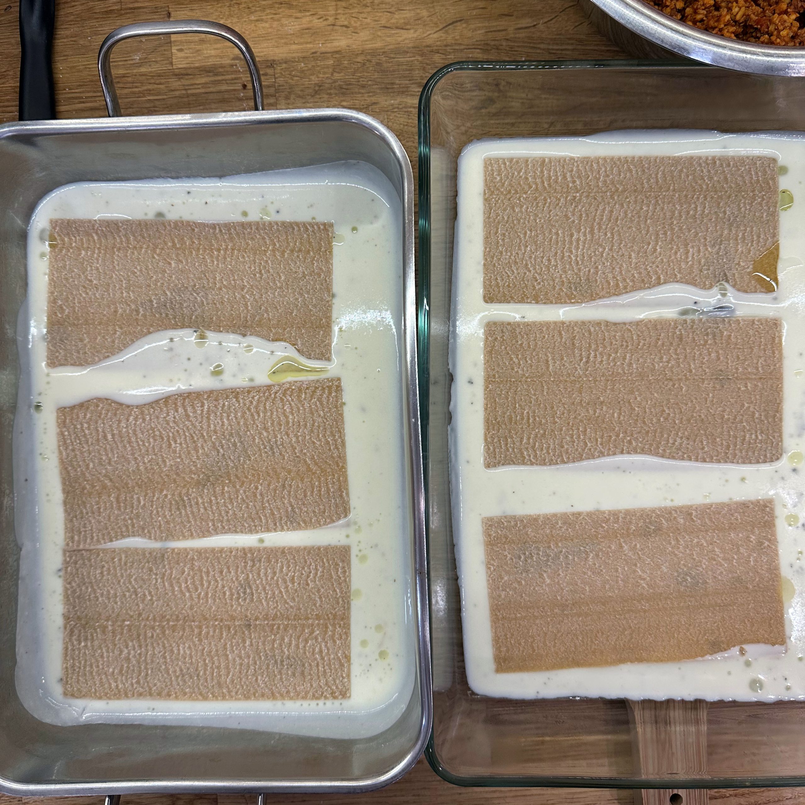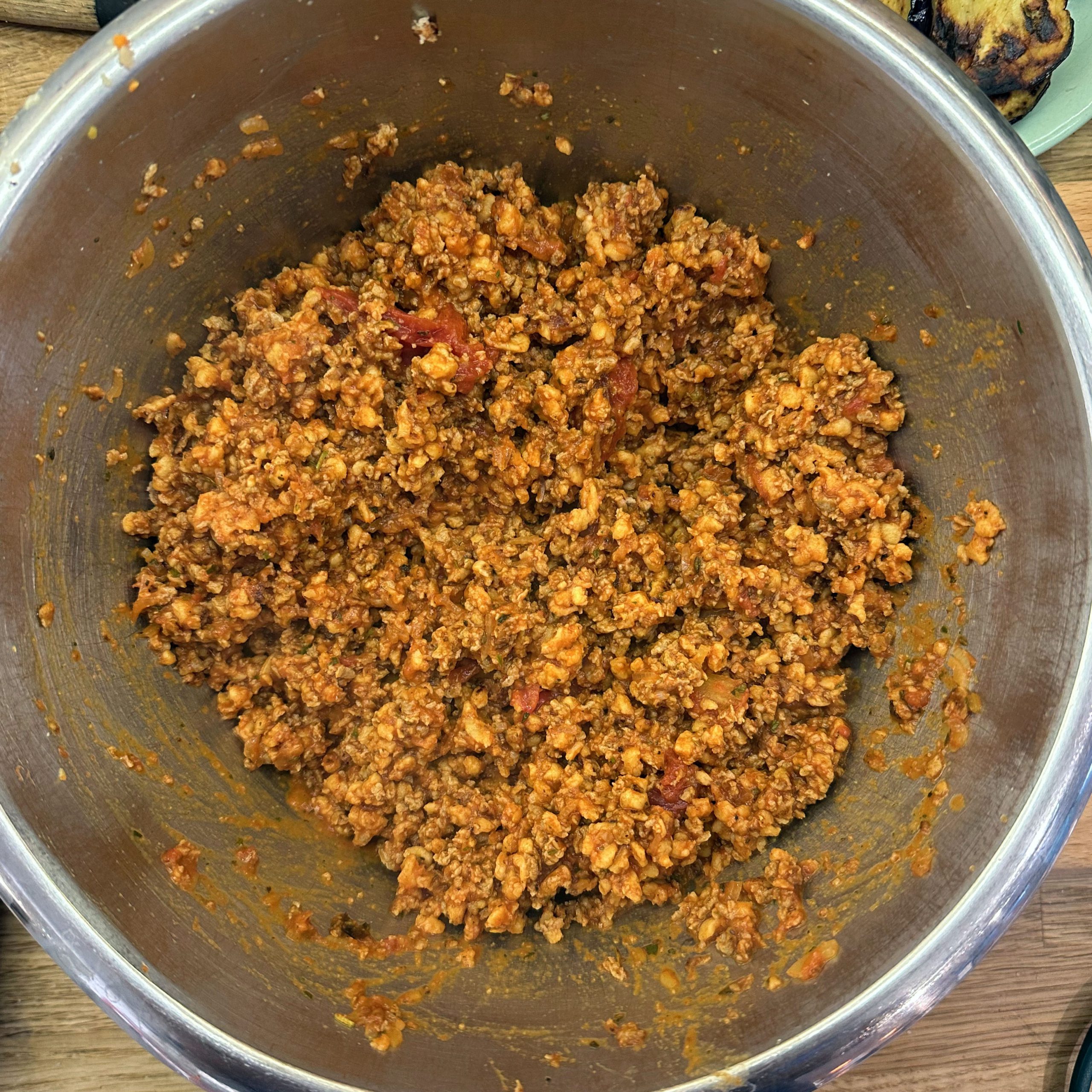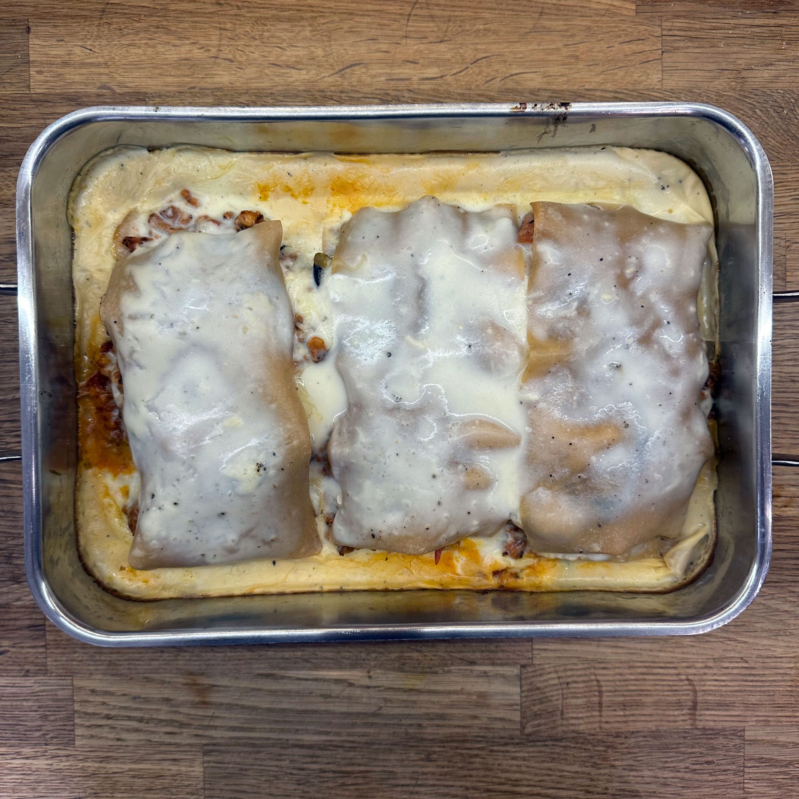 8 Tomaten blanchieren, enthäuten, halbieren, entkernen und mit Olivenöl und Salz bei 180°C etwa 40 Minuten im Ofen rösten, bis sie eingefallen sind. 2 mittelgroße Auberginen in Scheiben schneiden, salzen, 30 Minuten entwässern lassen, trocken tupfen und in Olivenöl von beiden Seiten goldbraun braten. 500g frischen Spinat waschen und in einer Pfanne kurz zusammenfallen lassen, gut ausdrücken. Für die Tofubolognese 400g Tofuhack mit kochendem Wasser übergießen, 10min ziehen lassen, auswringen und in einer Pfanne mit 2 EL Olivenöl goldbraun braten, 1 gewürfelte Zwiebel hinzufügen und glasig dünsten, 2 EL Tomatenmark einrühren, mit 1 Dose gehackten Tomaten (400g) und 100ml Gemüsebrühe ablöschen, mit 1 TL Oregano, 1 TL Thymian, Salz und Pfeffer würzen und 15 Minuten köcheln lassen. Eine Bechamelsoße aus 80g Butter, 80g Mehl und 1l Milch zubereiten, mit Salz und Pfeffer würzen. Eine Auflaufform einfetten und schichtweise aufbauen: etwas Bechamelsoße auf den Boden, 3 Lasagneblätter, Tofubolognese, Spinat, Auberginenscheiben, Ofentomaten, wieder Lasagneblätter und diese Schichtung wiederholen. Als oberste Schicht Lasagneblätter auflegen, mit der restlichen Bechamelsoße bedecken und mit 100g geriebenem Käse bestreuen. Die Lasagne bei 180°C etwa 40-45 Minuten backen, bis sie goldbraun ist, 10 Minuten ruhen lassen und in Stücke geschnitten servieren.