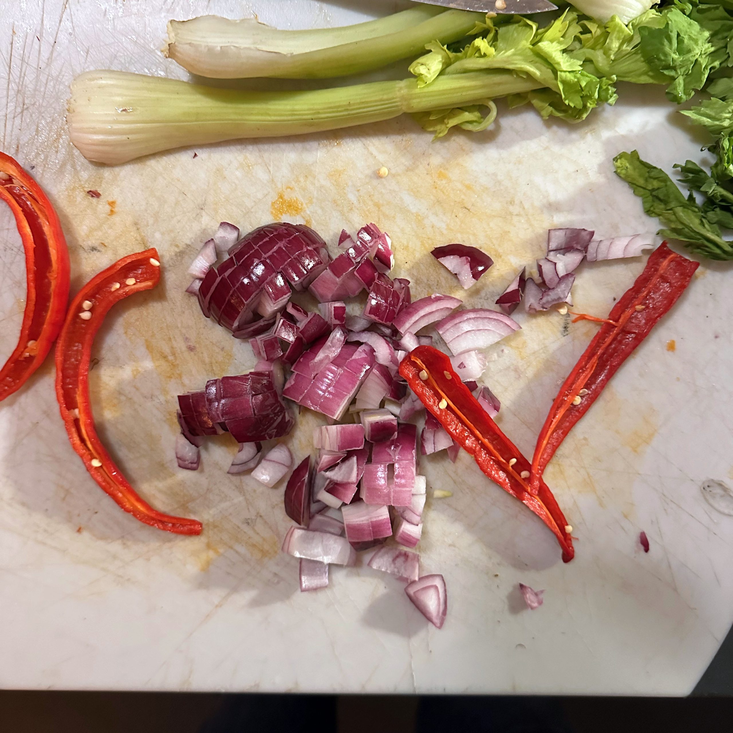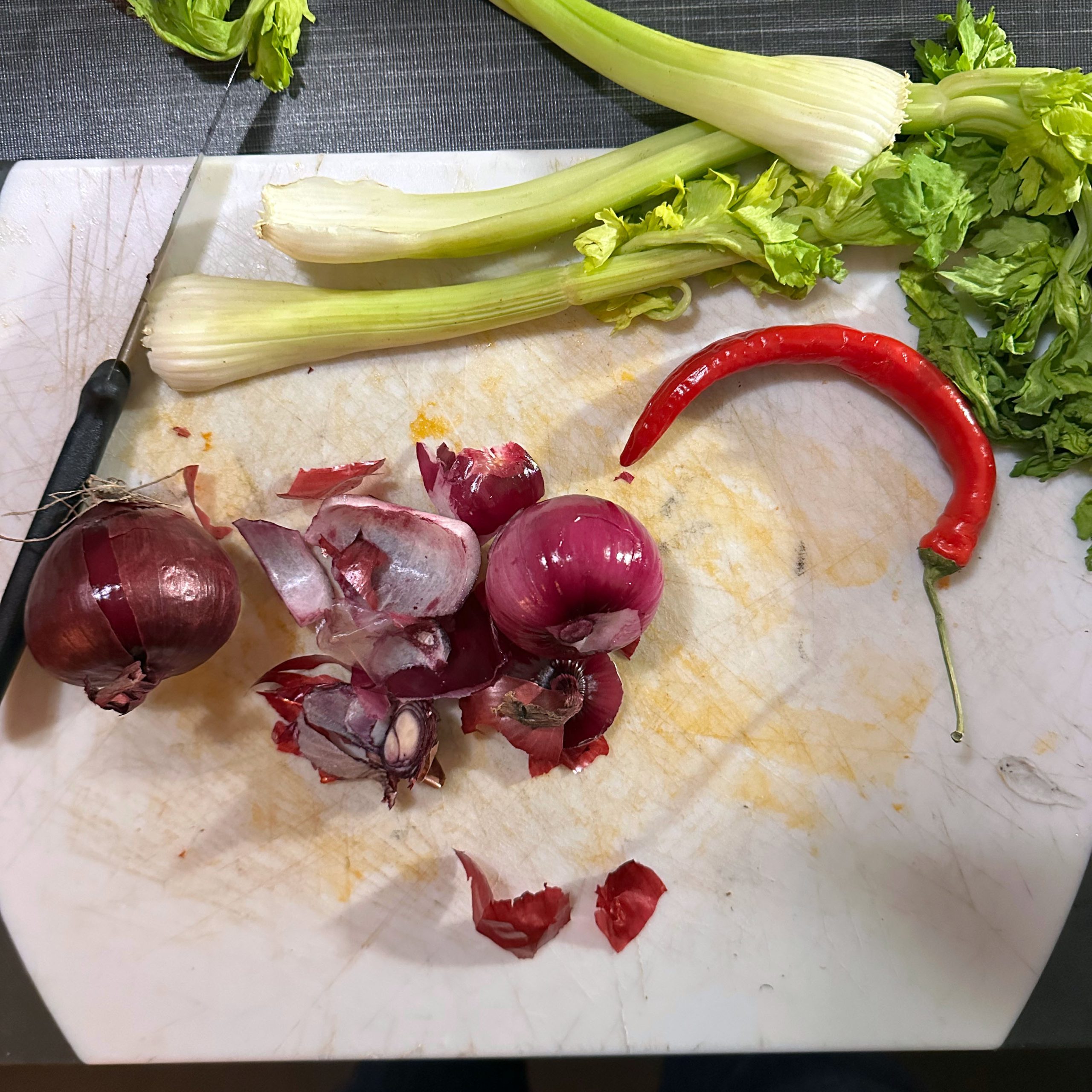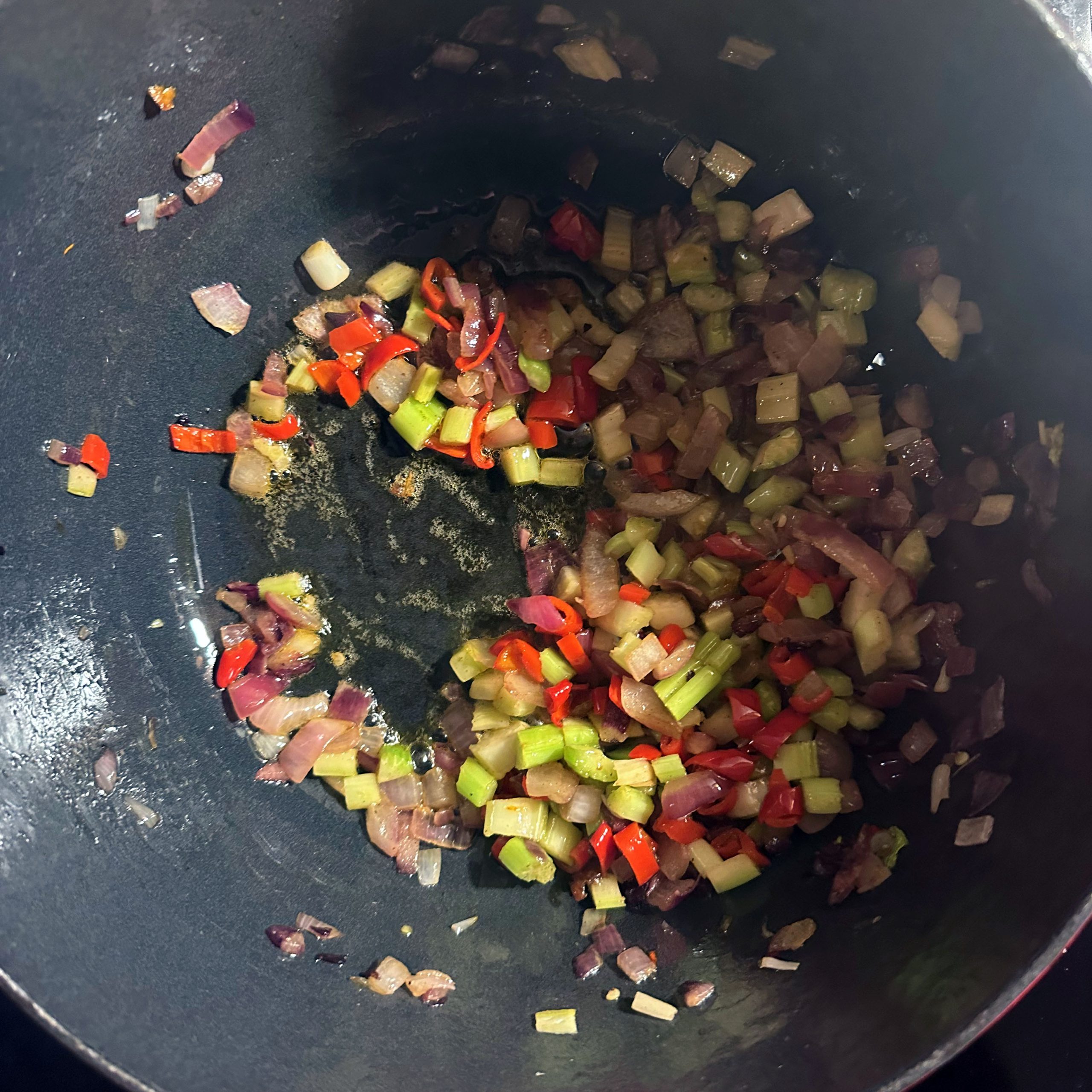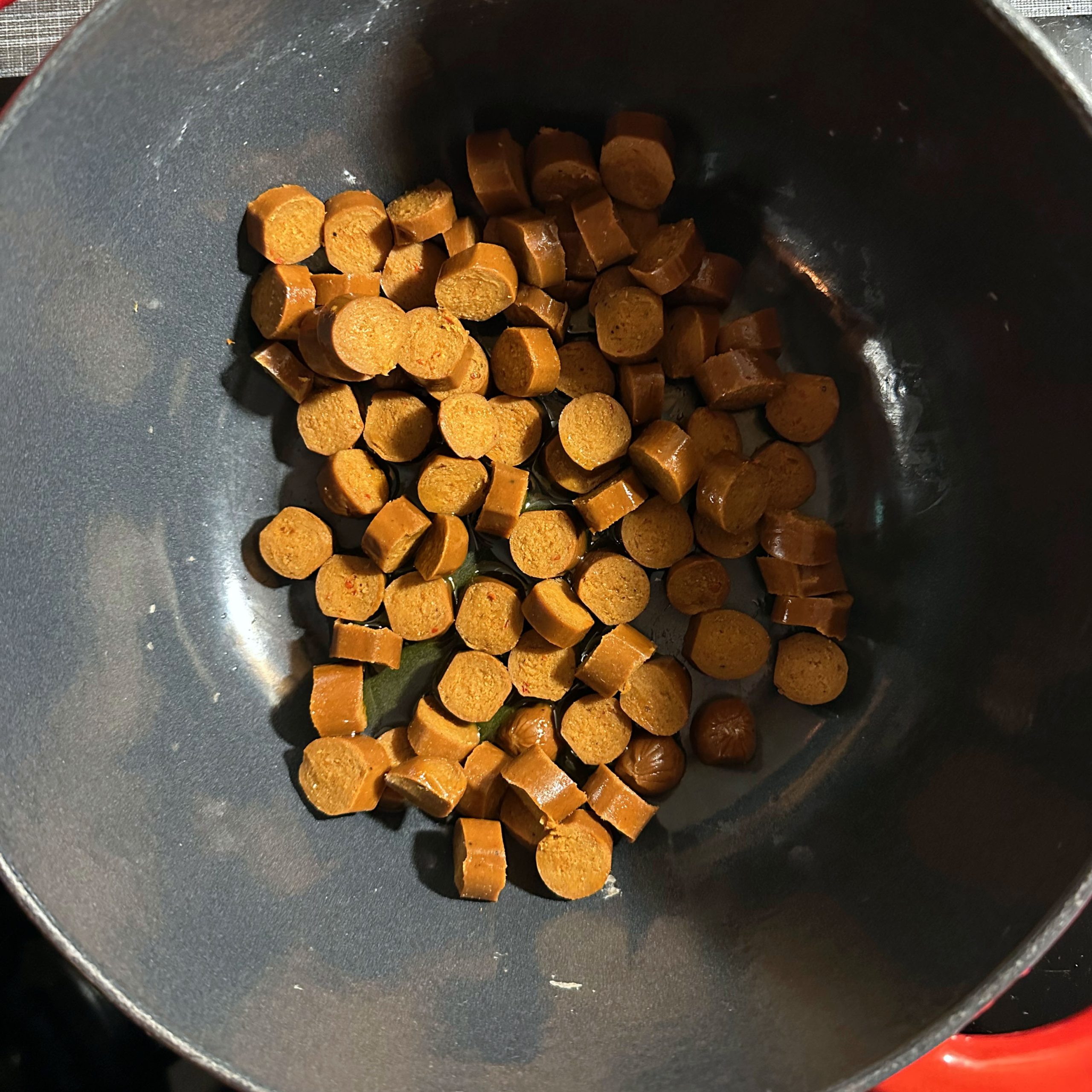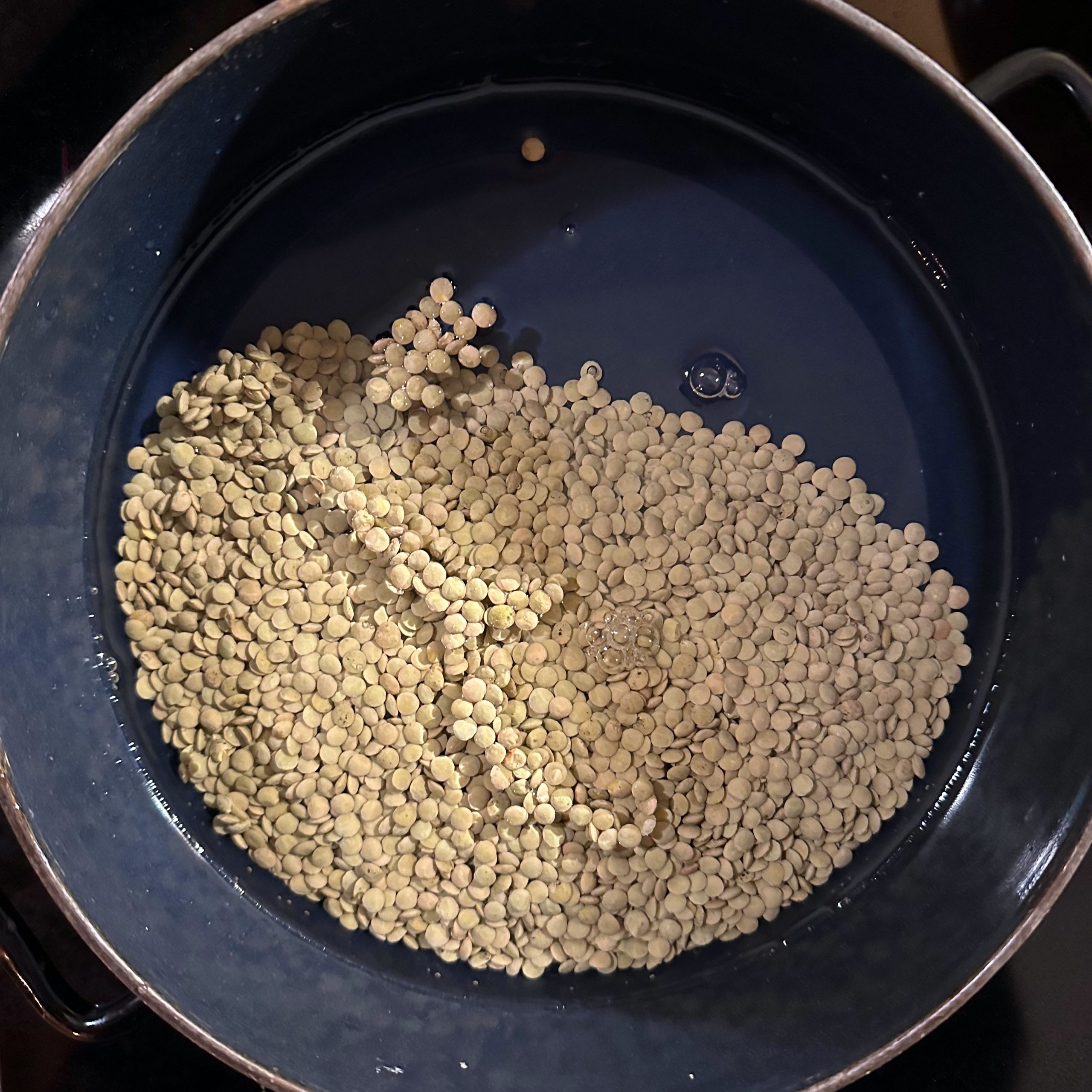 250gr grüne Linsen in 600ml Wasser oder Brühe 25–30min weich kochen, abgießen und beiseitestellen. 2 gewürfelte Zwiebeln und 2 Knoblauchzehen fein gehackt in etwas Öl in einem großen Topf glasig anbraten, 1 Chilischote entkernt und fein gehackt hinzufügen und kurz mitbraten. 3 Möhren und 3 Stangen Sellerie in Würfeln dazugeben und 5min mitbraten. 5 Kartoffeln schälen, würfeln und unterrühren, 2EL Tomatenmark kurz mitrösten, mit 1l Gemüsebrühe auffüllen, 2 Lorbeerblätter und 1TL Thymian hinzufügen und mit Salz und Pfeffer würzen. Mit geschlossenem Deckel 25–30min köcheln lassen, bis die Kartoffeln weich sind. Gekochte Linsen unterrühren, 2EL Balsamico und 1EL Senf hinzufügen und mit Salz und Pfeffer abschmecken. Vegane Merguez in Scheiben schneiden und in etwas Öl in einer Pfanne von beiden Seiten knusprig anbraten. Linseneintopf in Schüsseln füllen, mit den gebratenen Merguez-Scheiben belegen und mit gehackter Petersilie bestreut servieren.